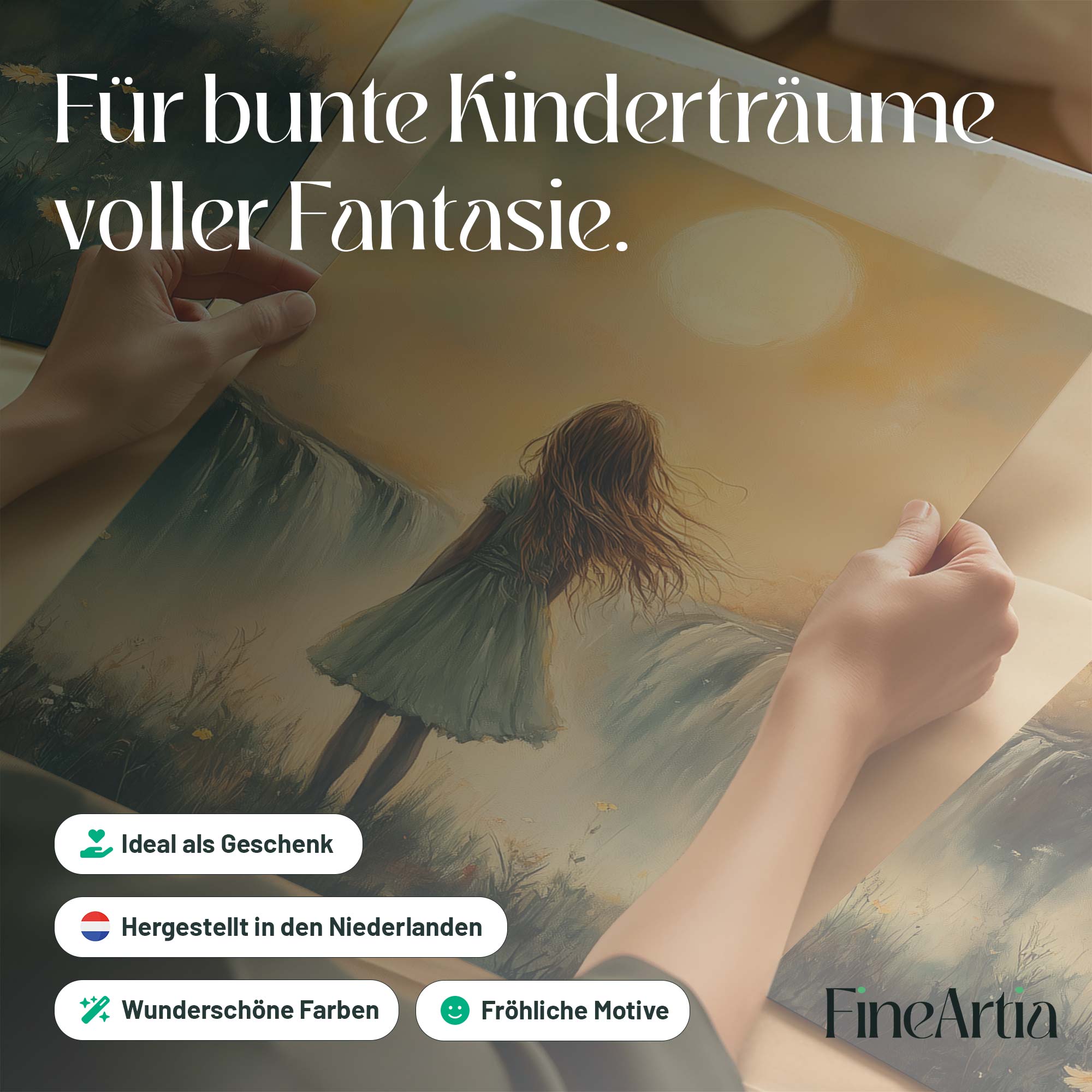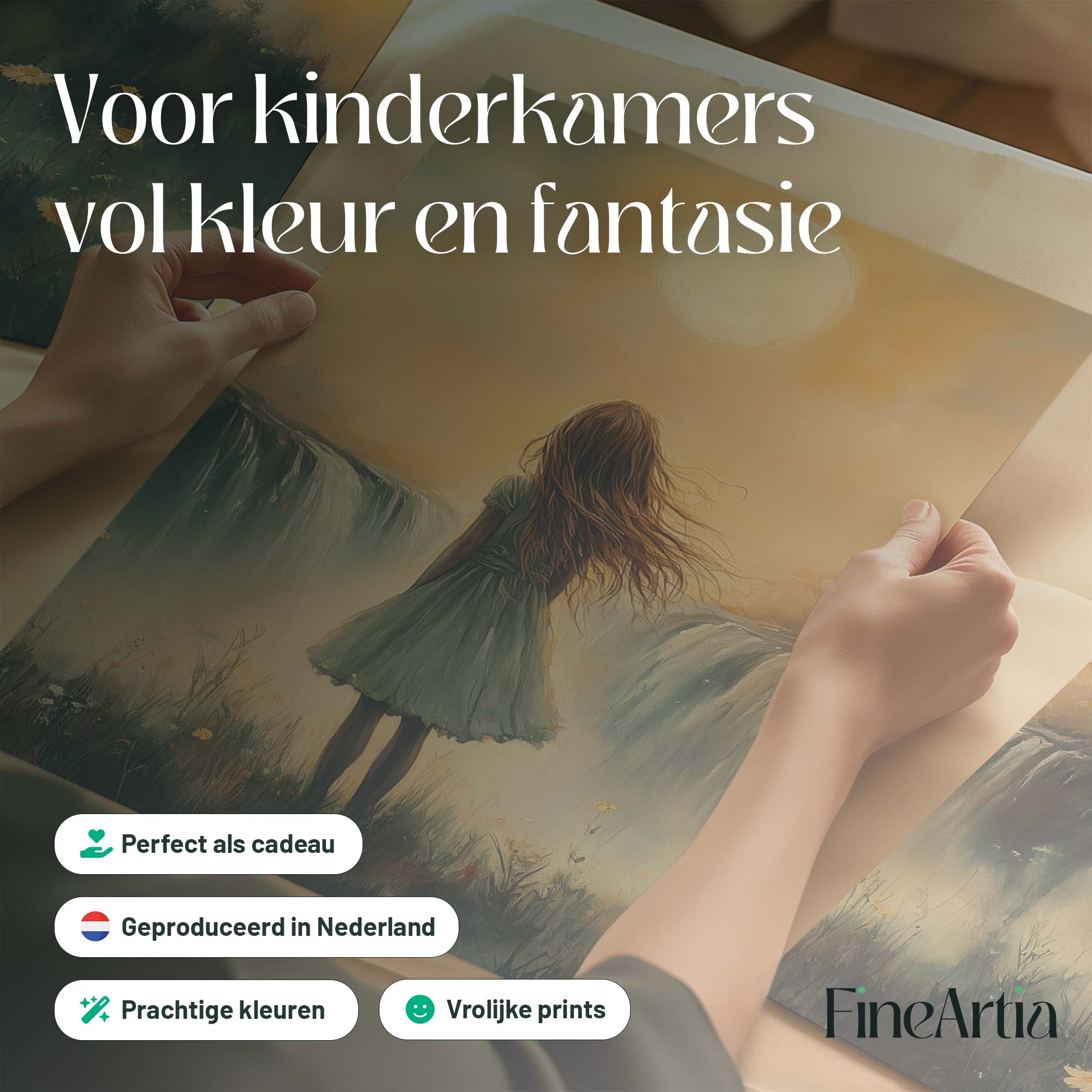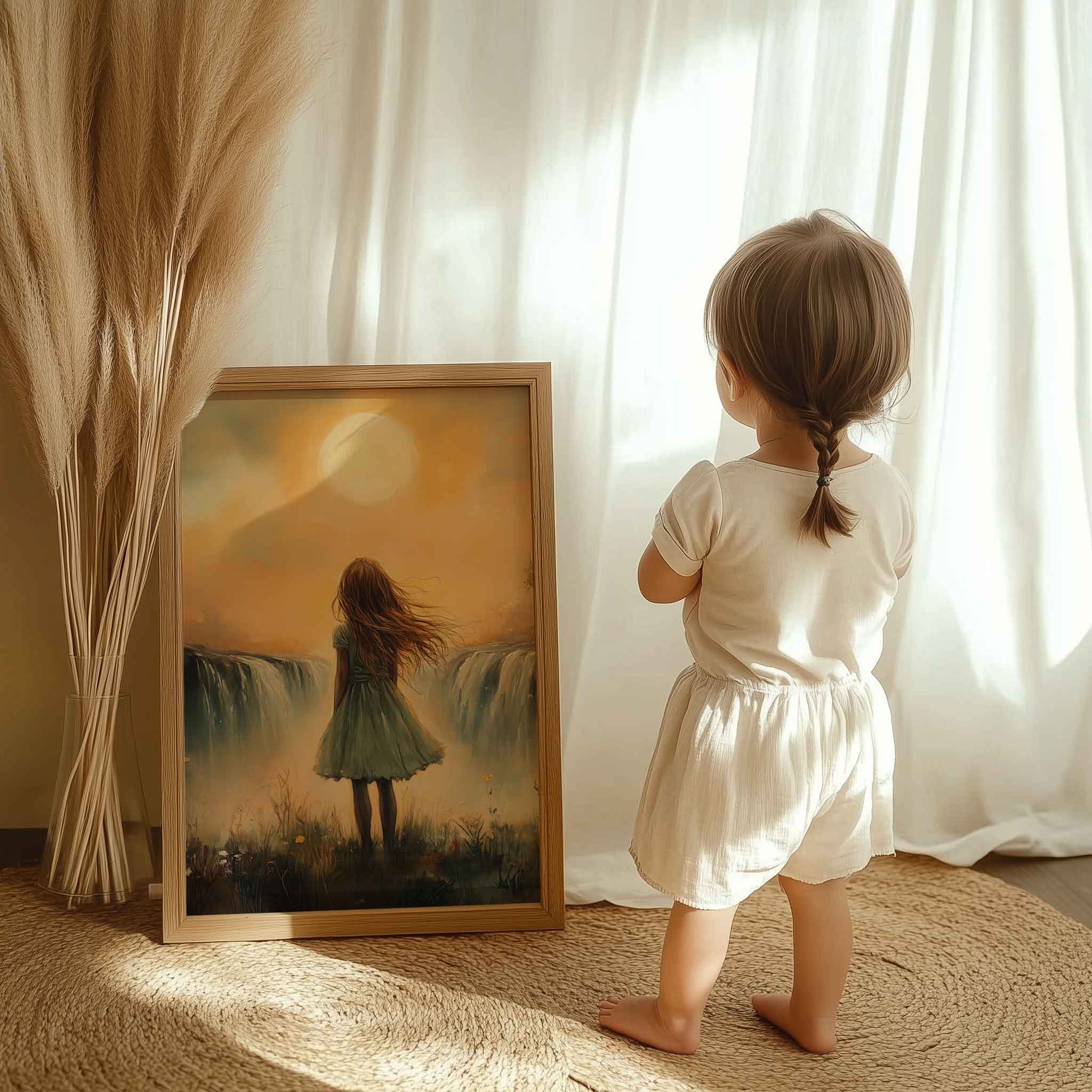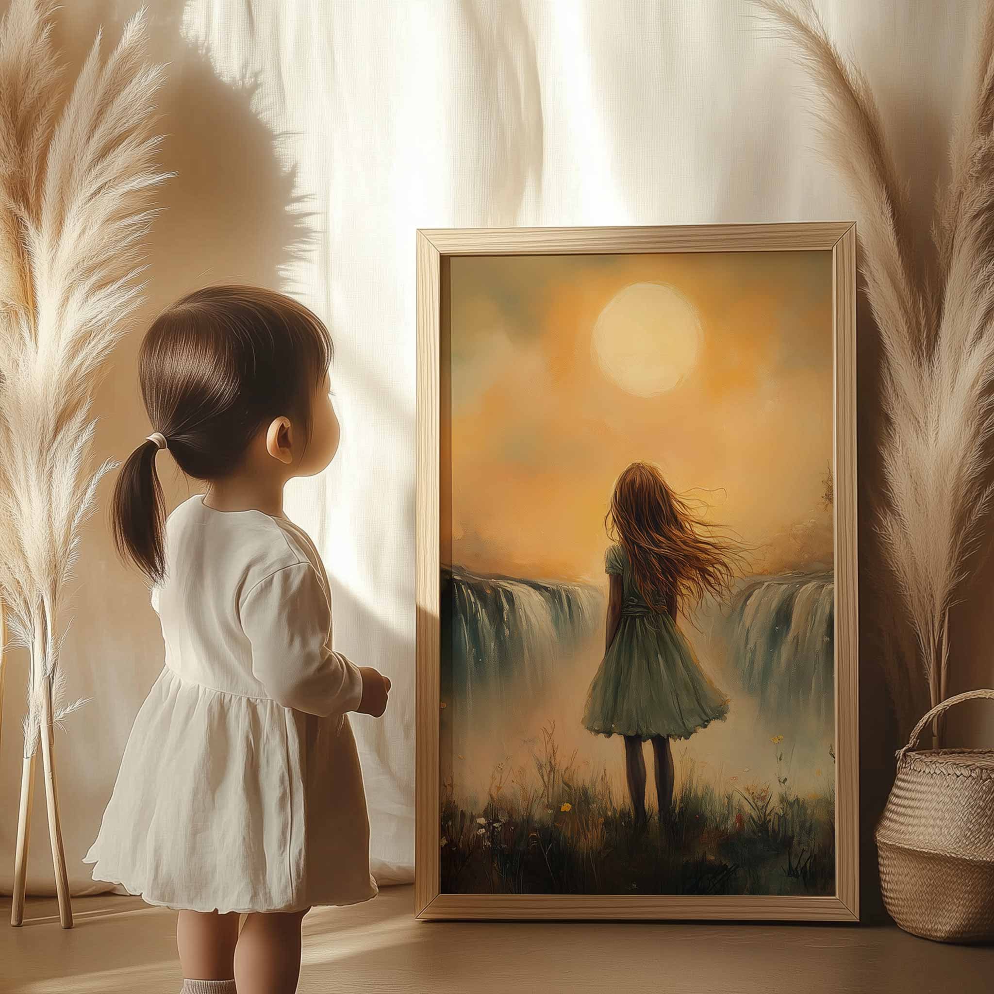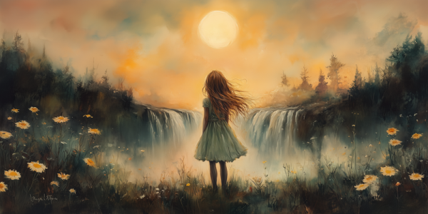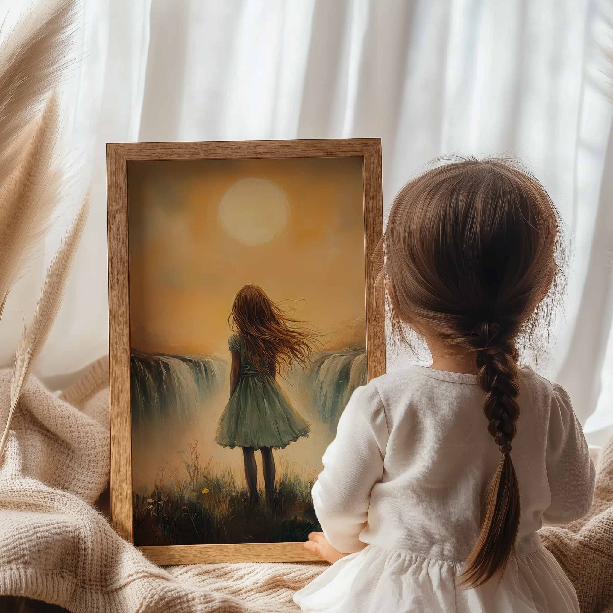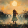 Dromerig Meisje bij Waterval – Pastel Sprookje