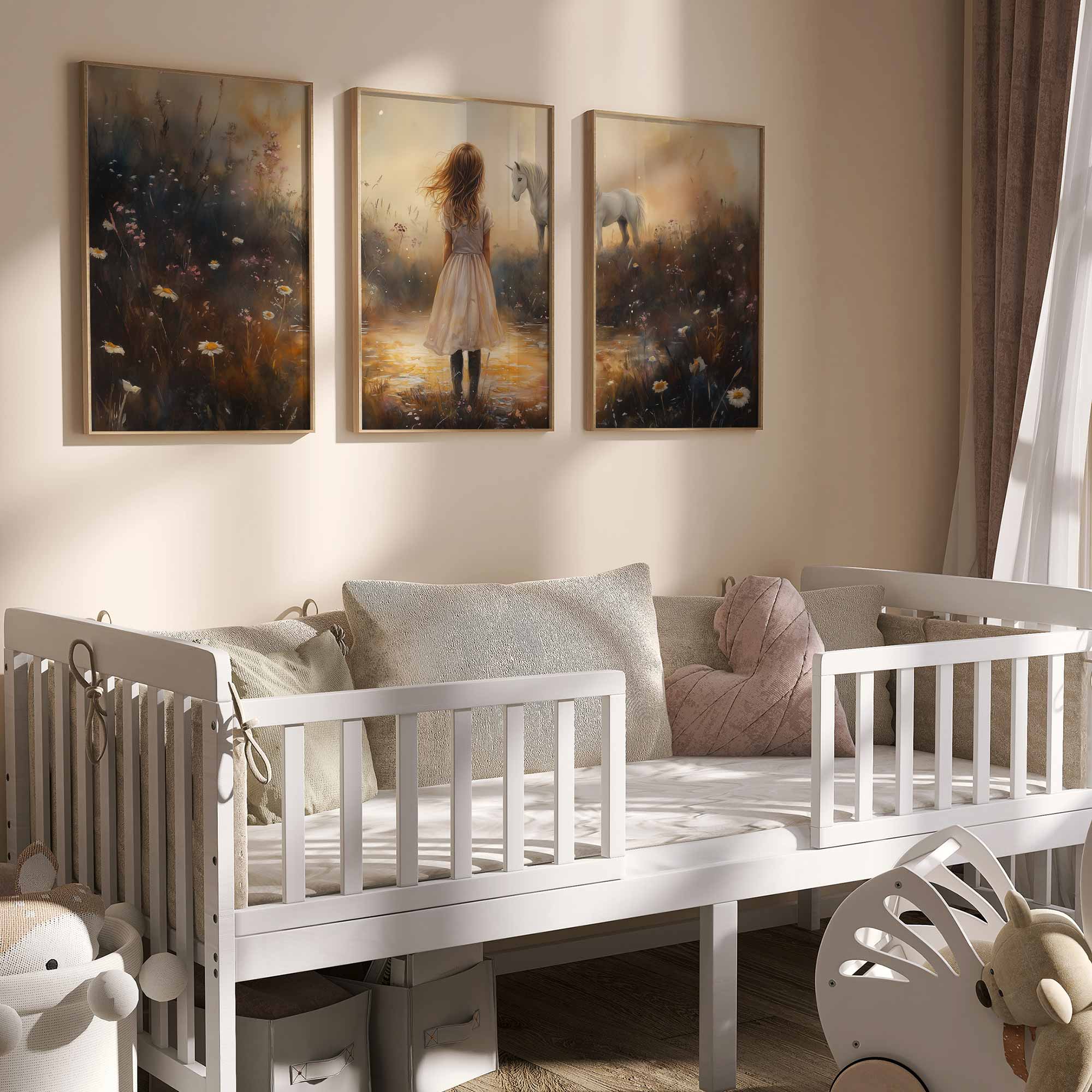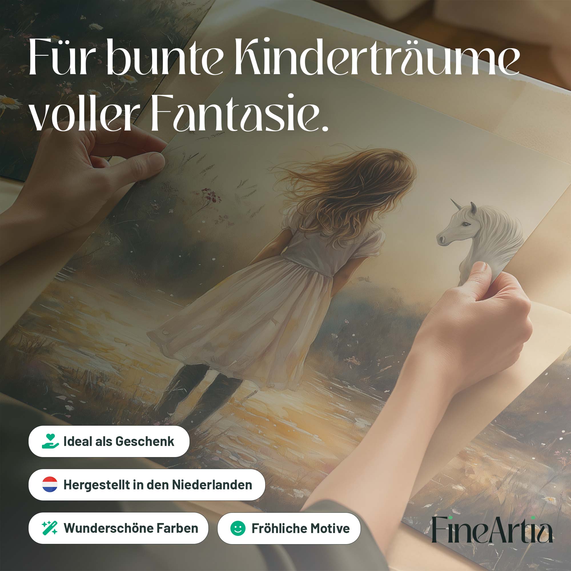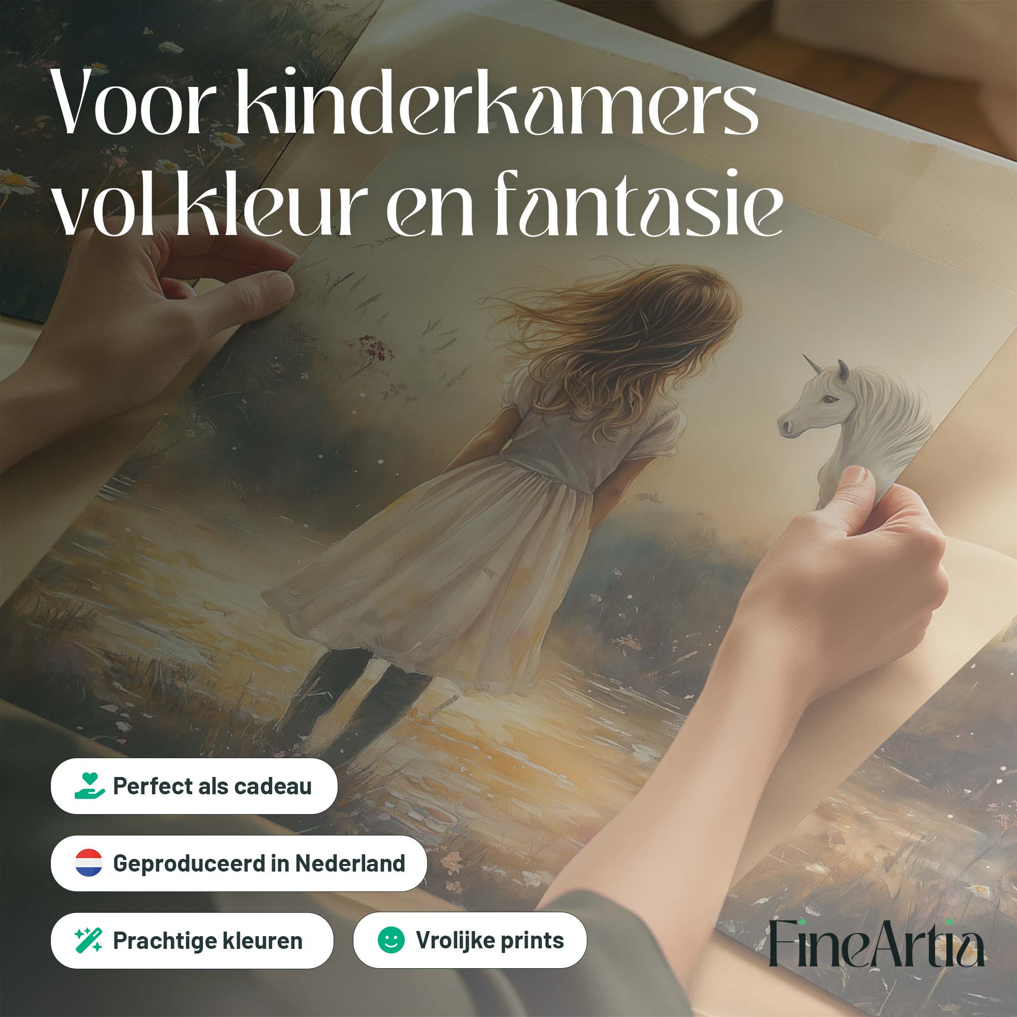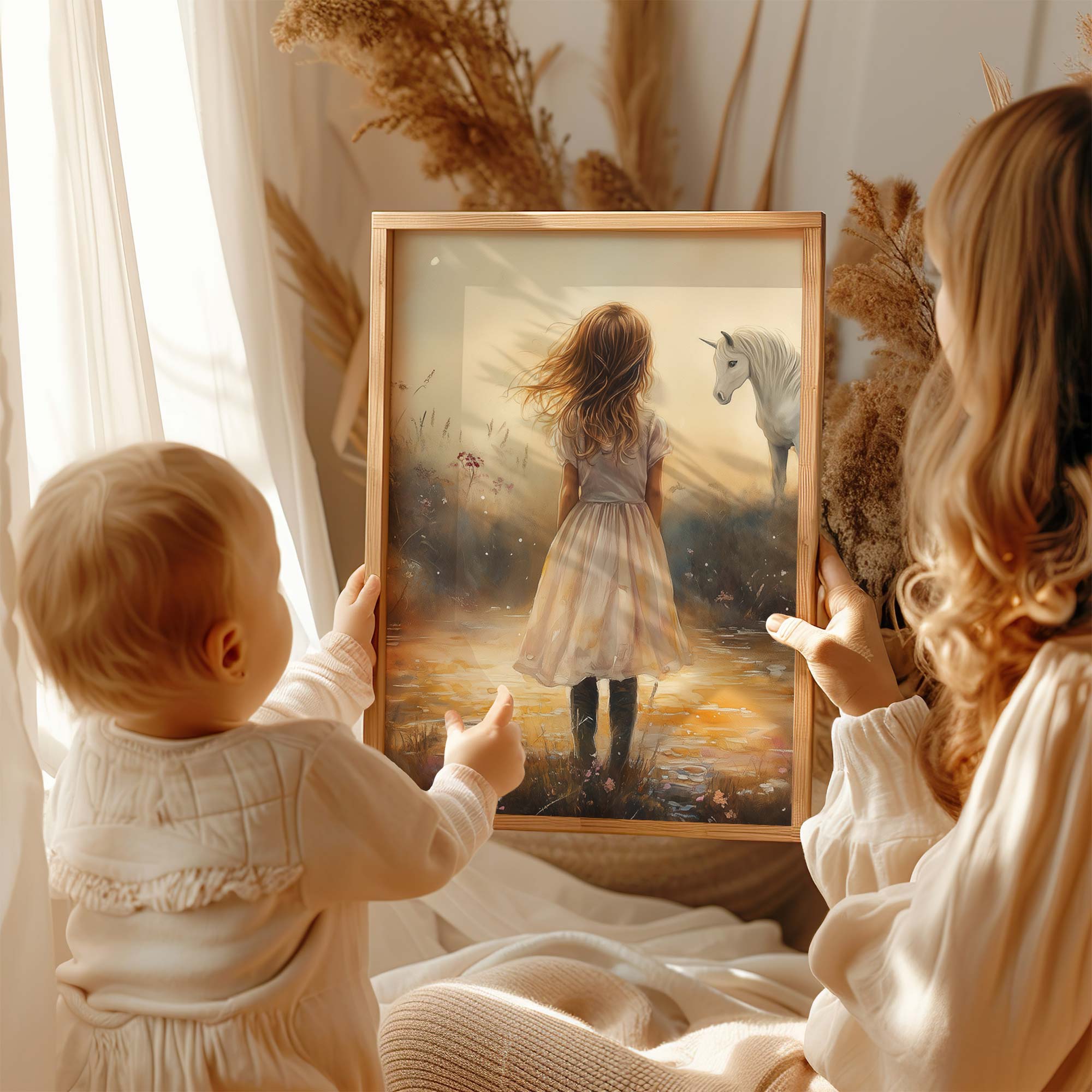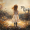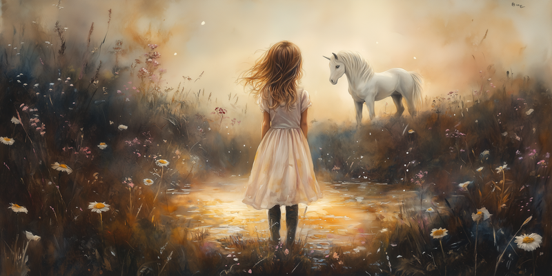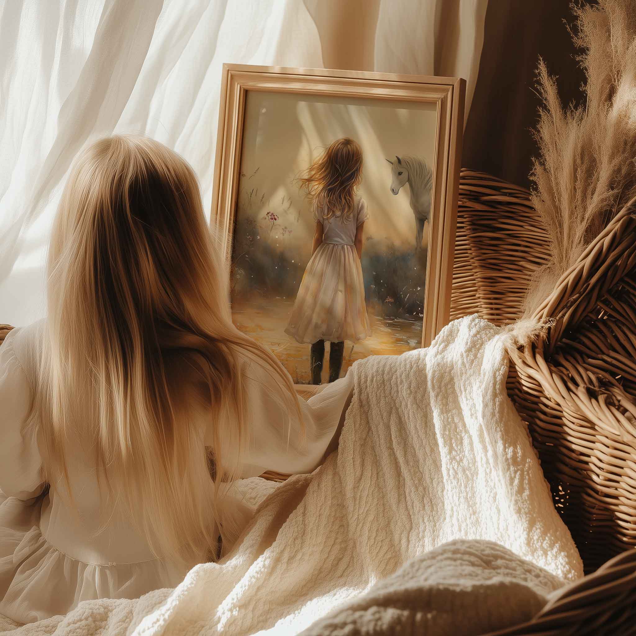 Dromerig Meisje en Witte Paard in Pastel Sfeer