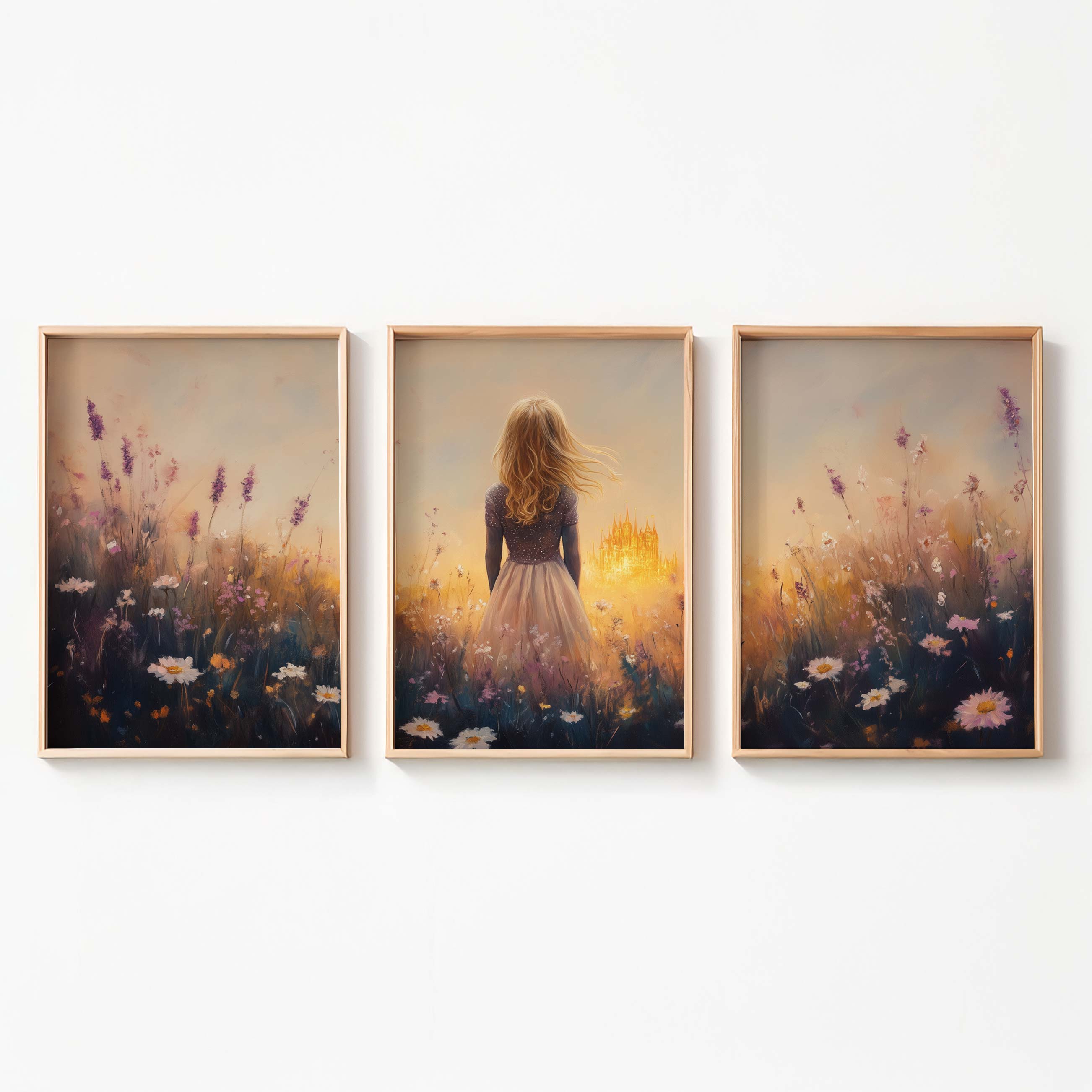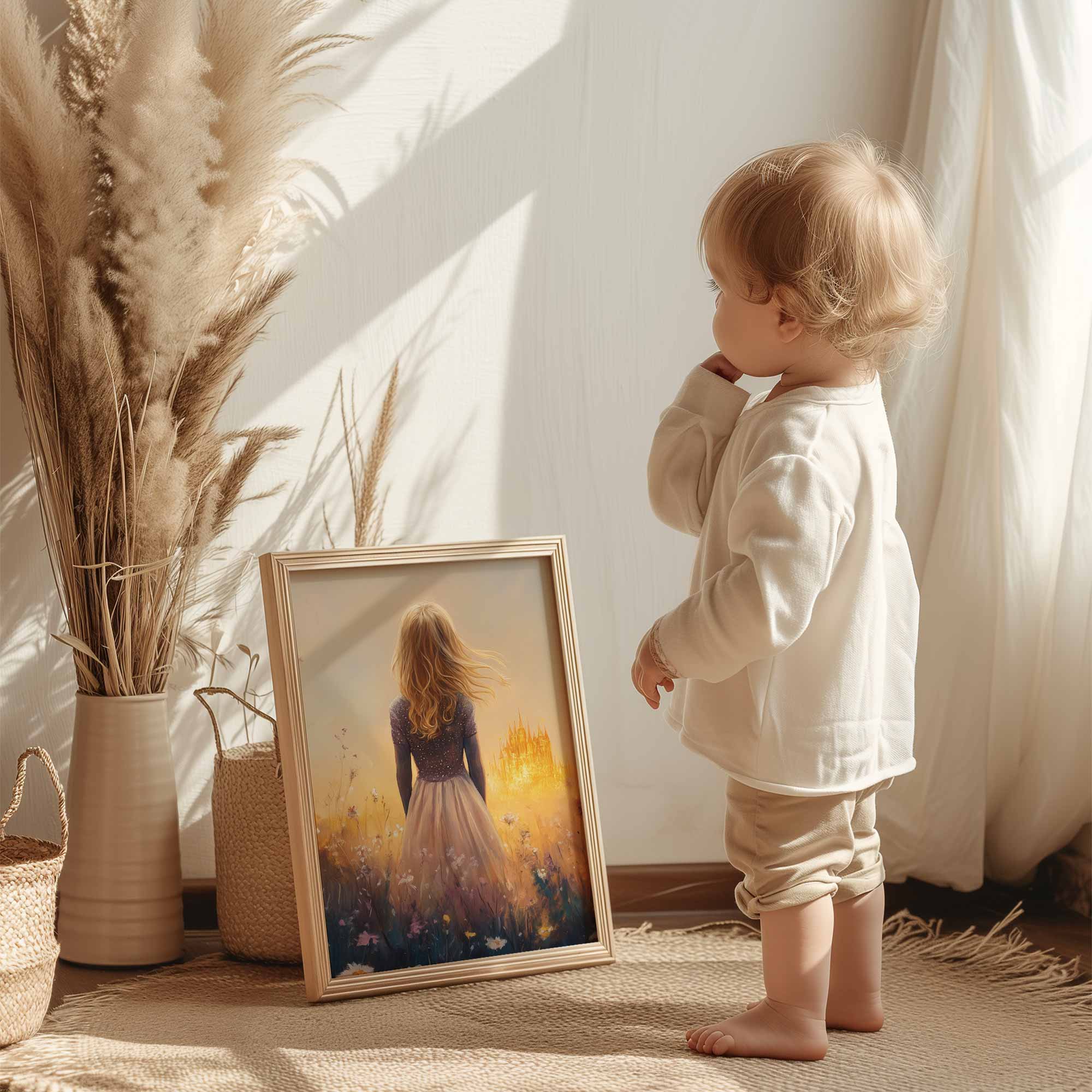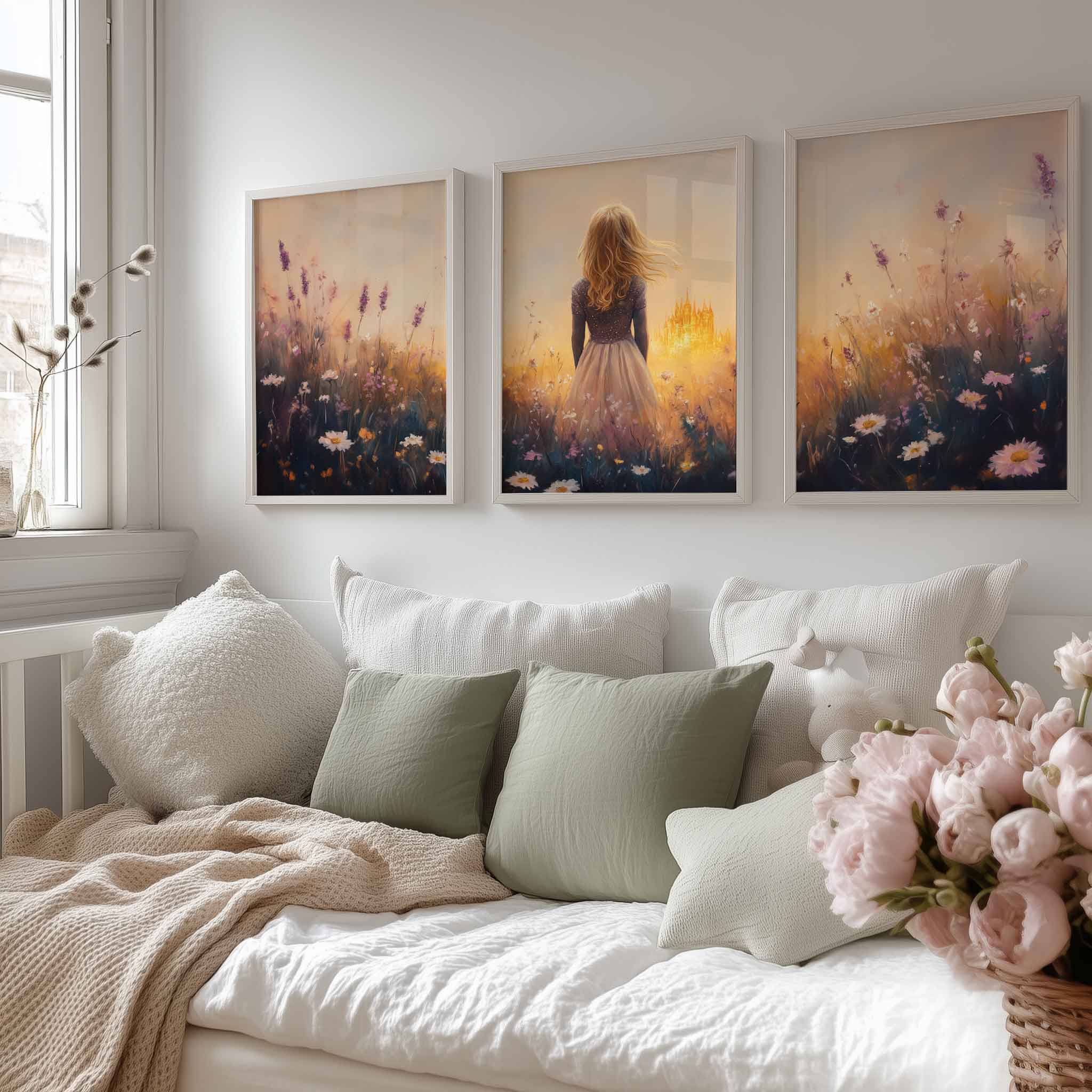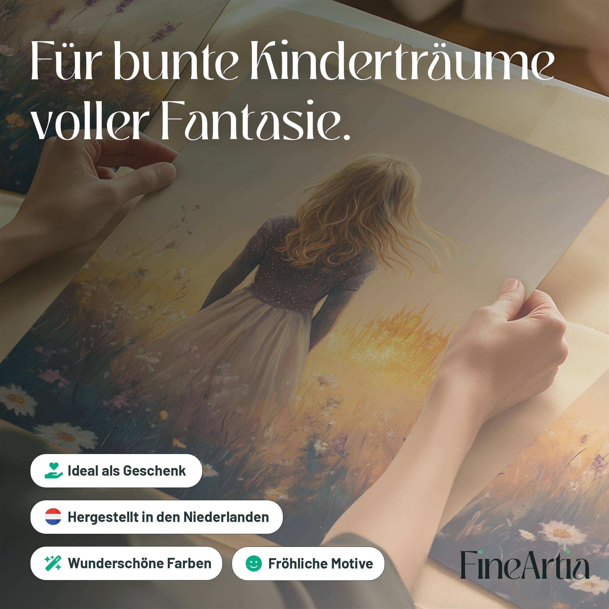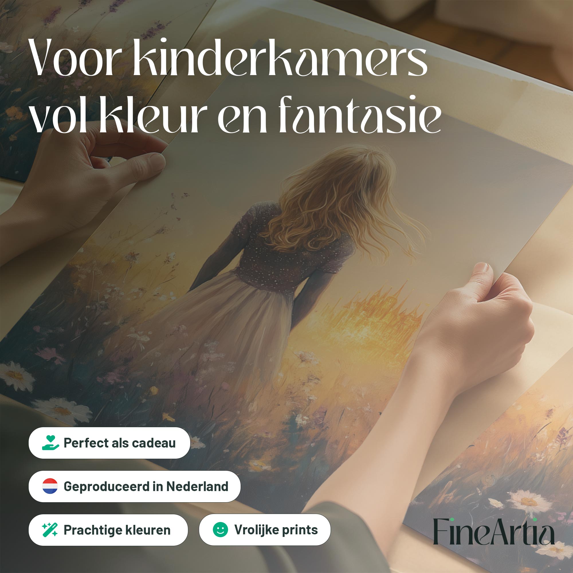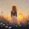 Terug naar collectie Posters Dromerig Meisje in Bloeiend Bloemenveld met Kasteel