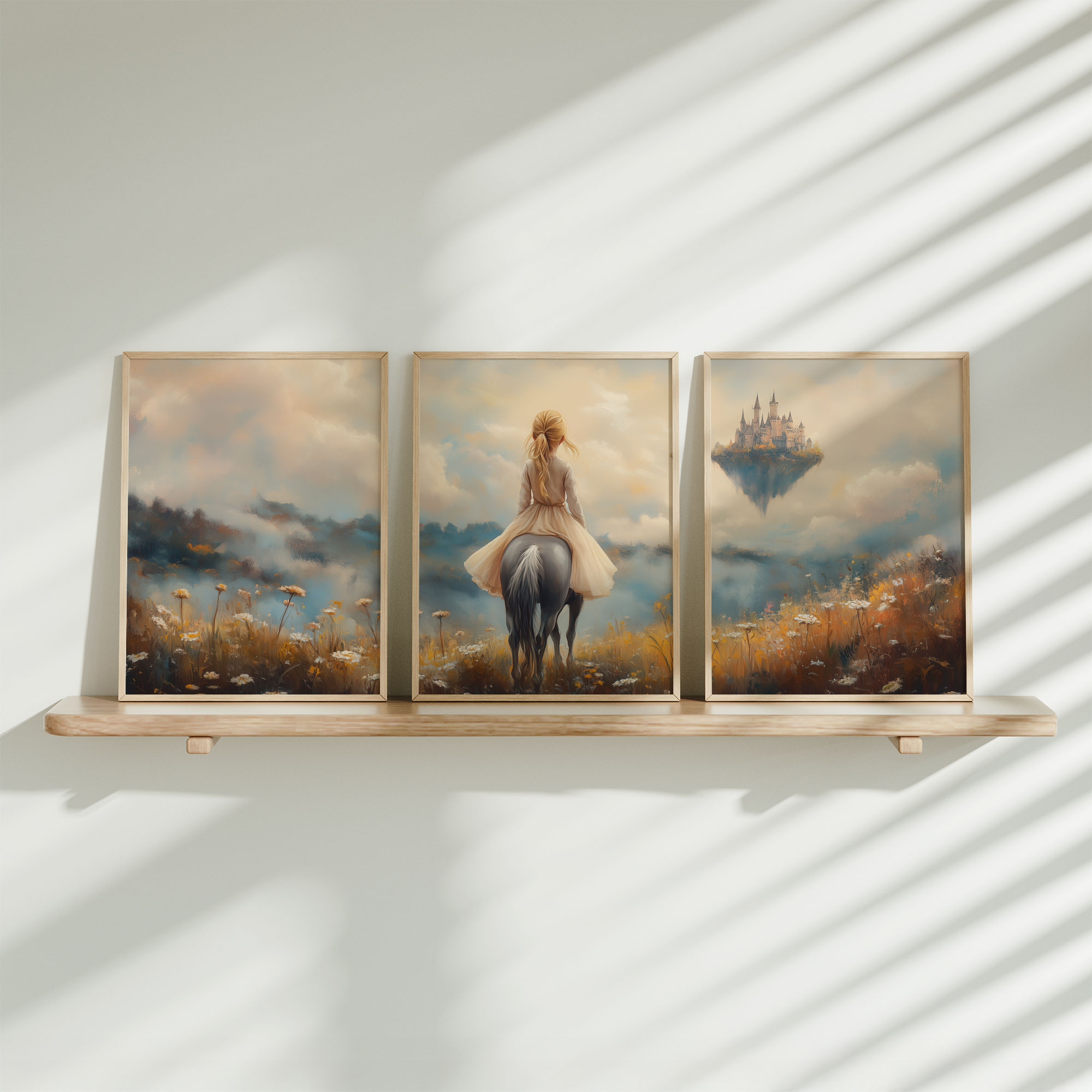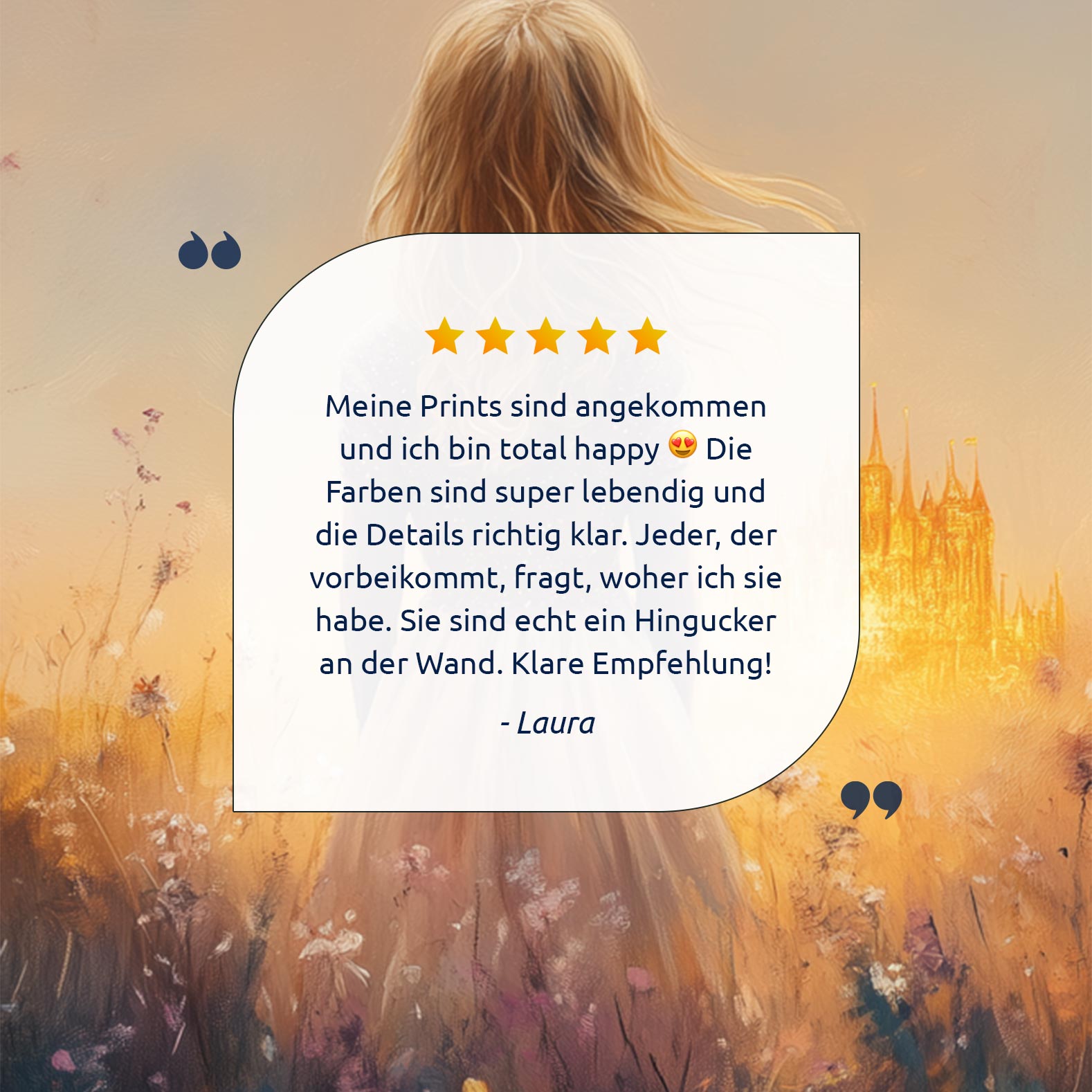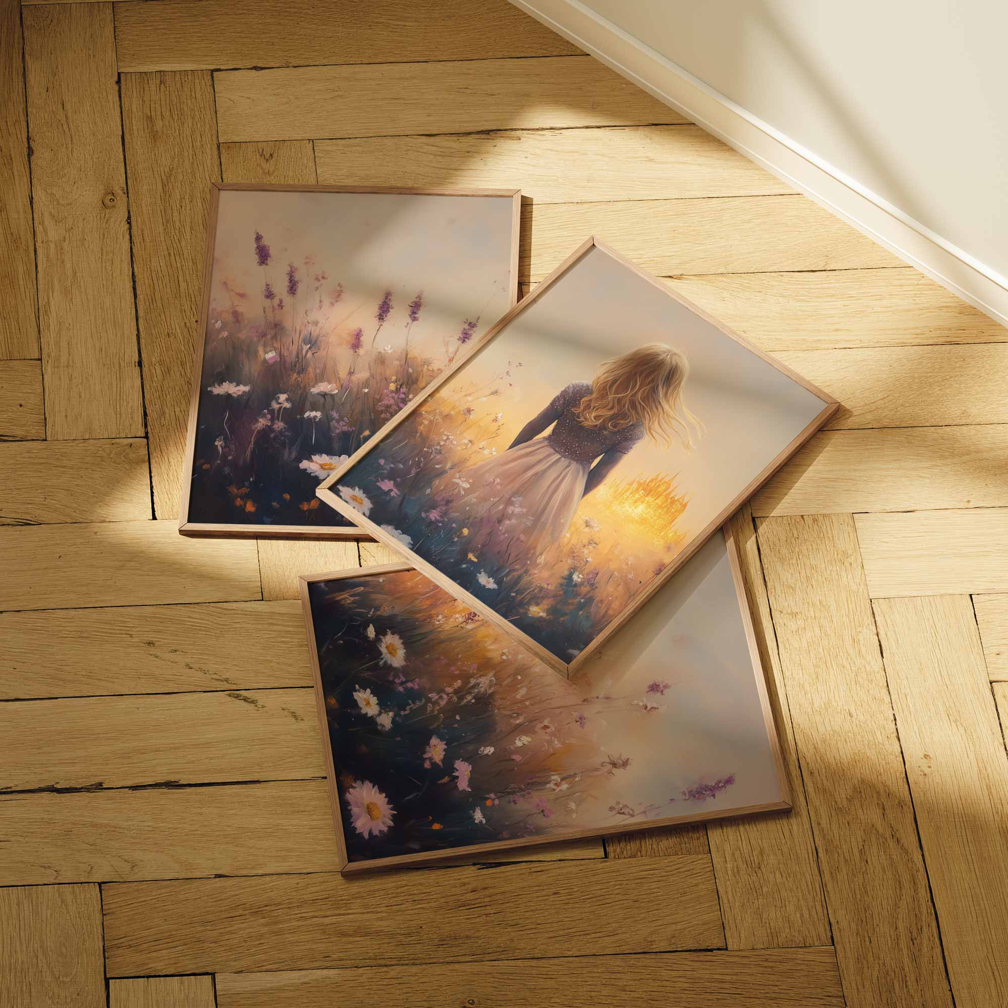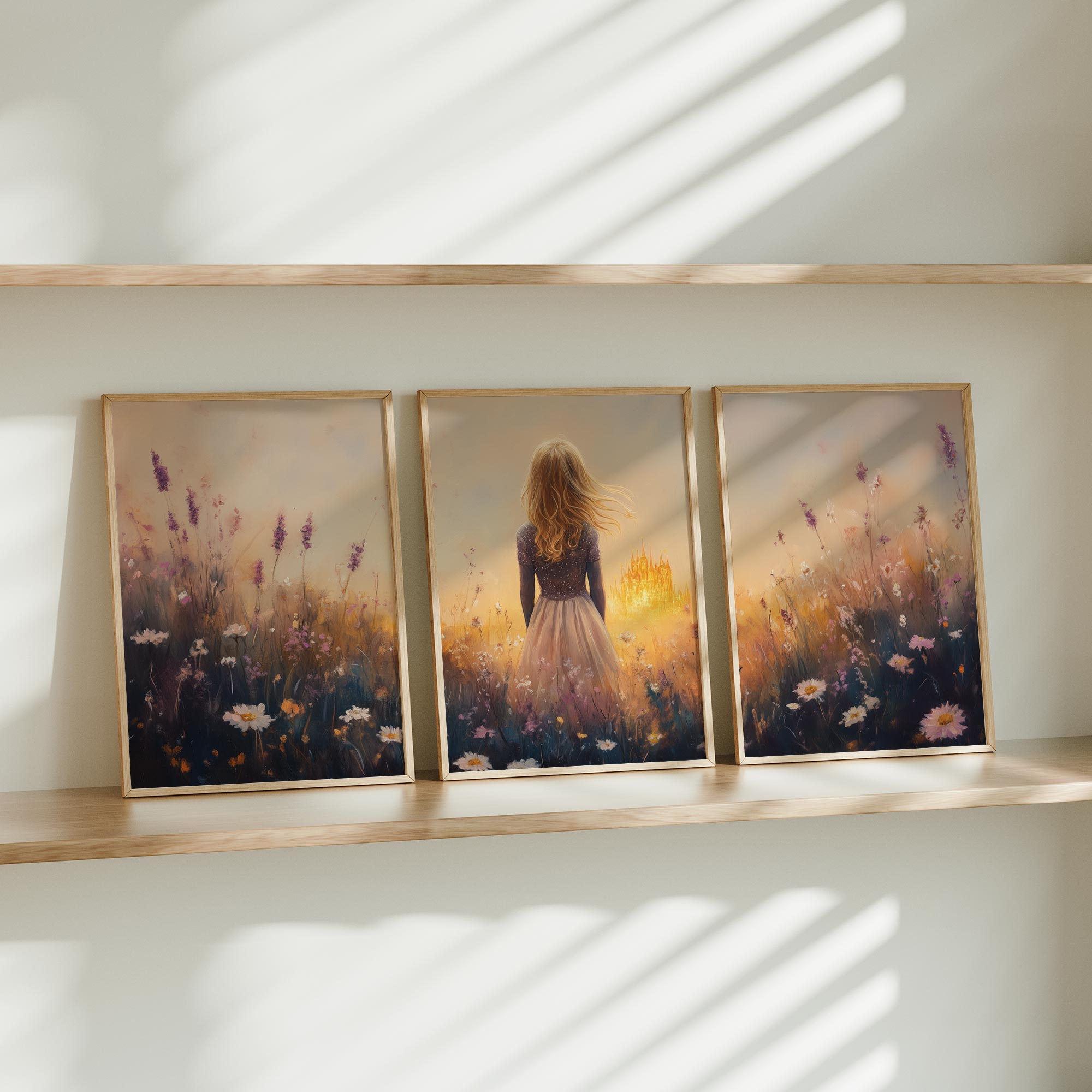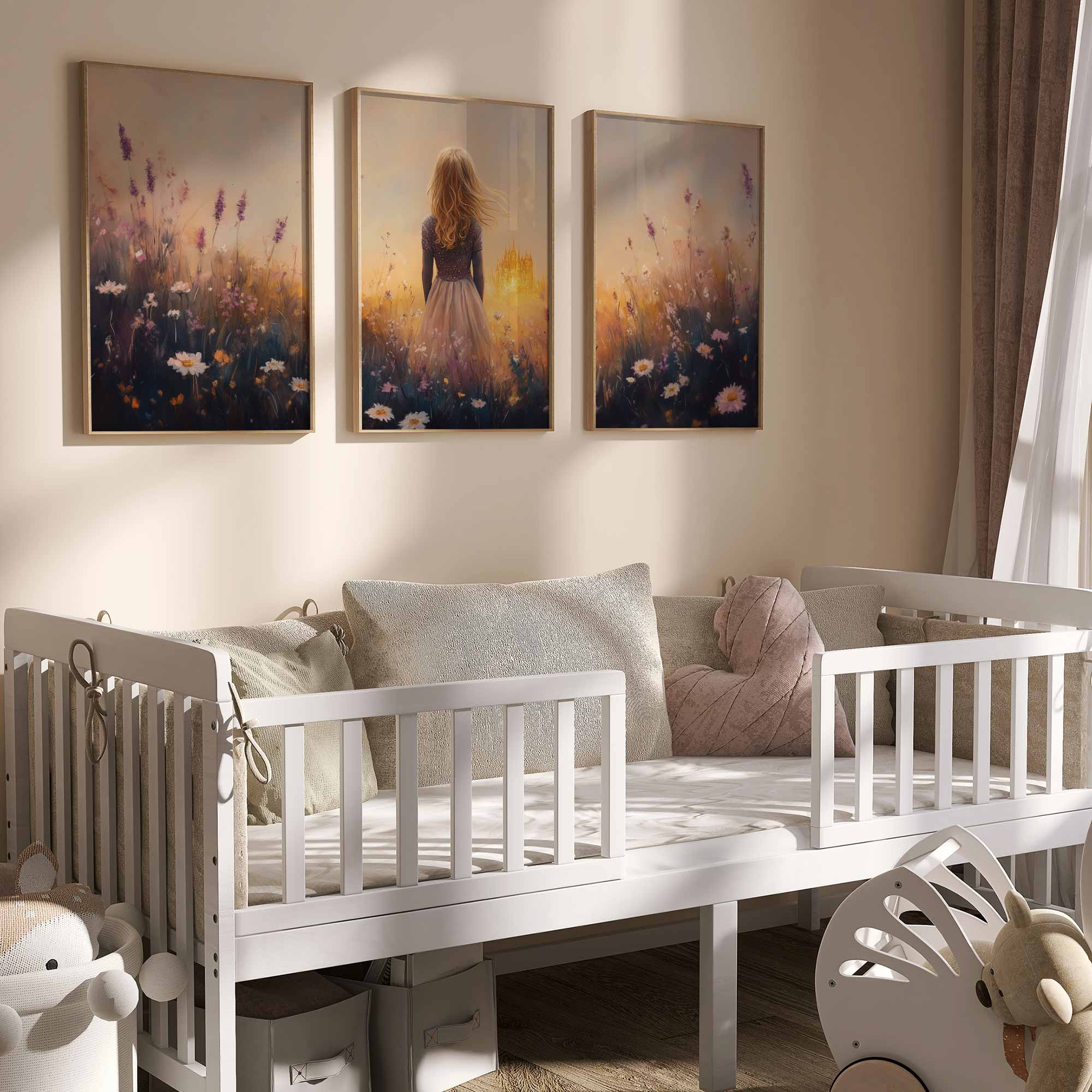 Terug naar collectie Posters Dromerig Meisje in Bloeiend Bloemenveld met Kasteel