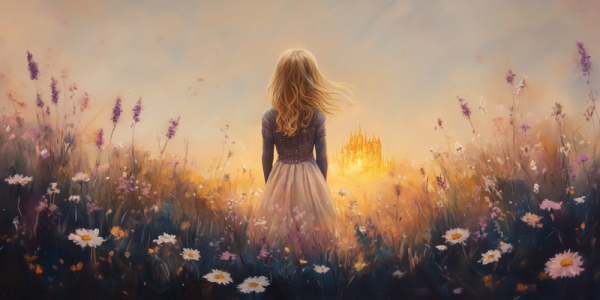 Dromerig Meisje in Bloeiend Bloemenveld met Kasteel