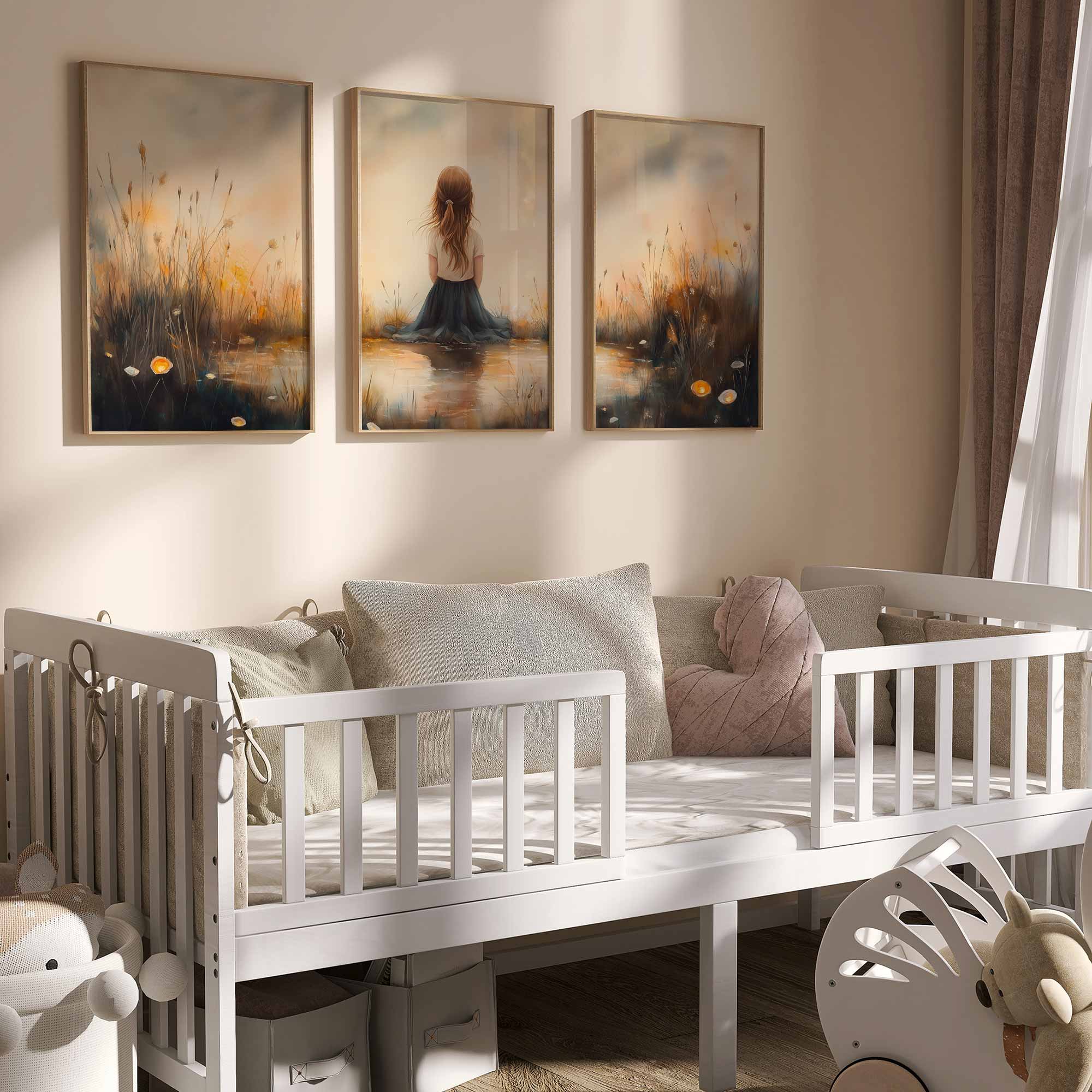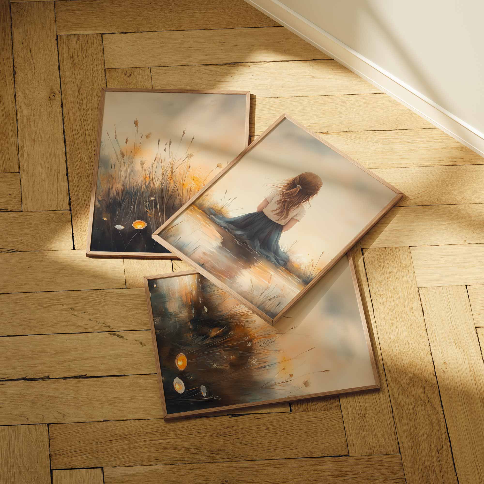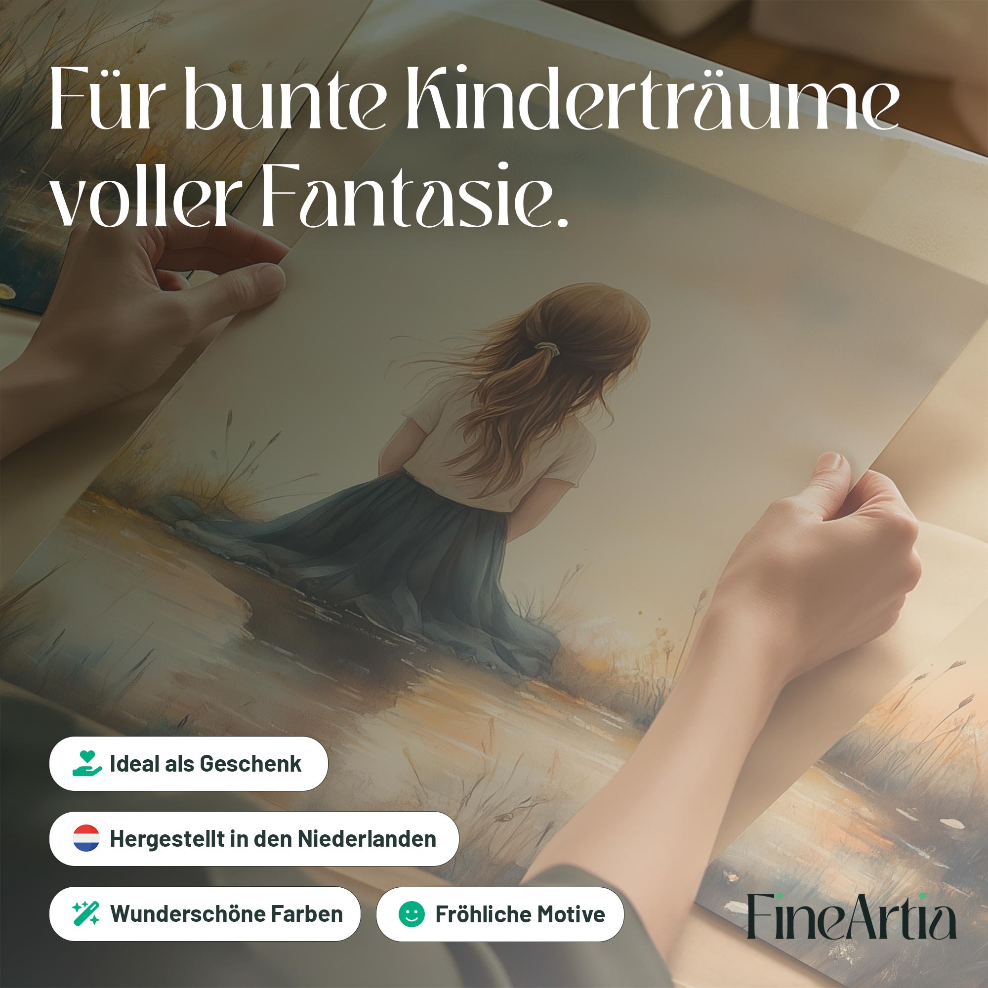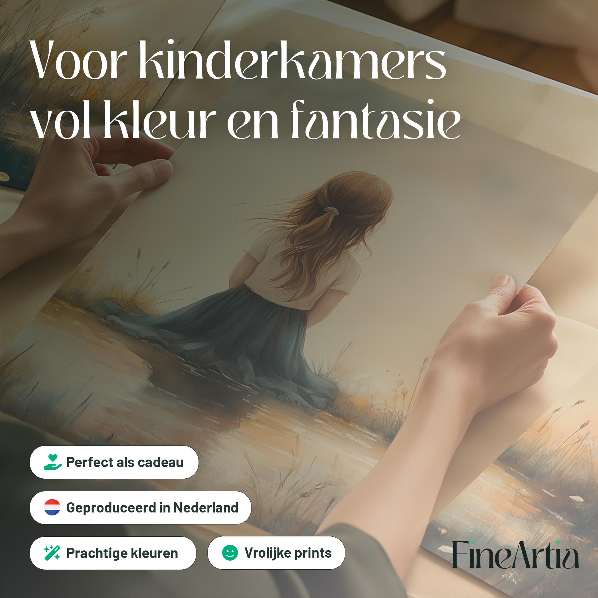 Terug naar collectie Posters Dromerig Meisje in Bloeiend Gras – Warme Zonovergoten Sfeer