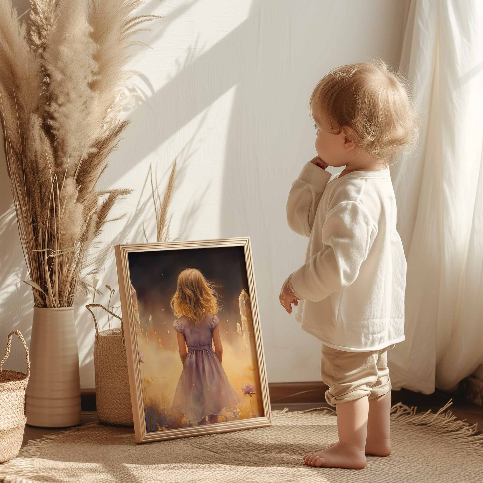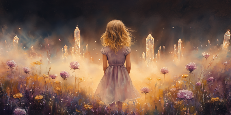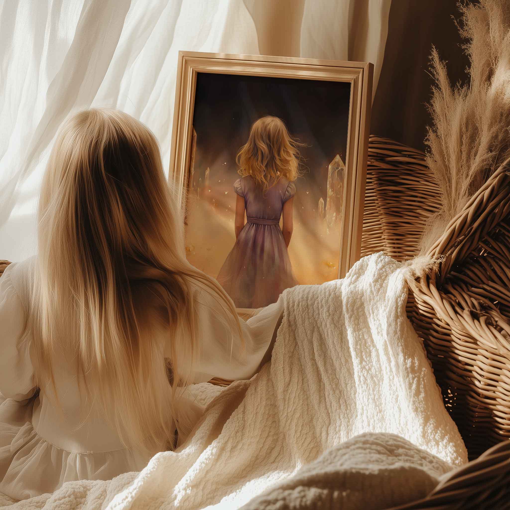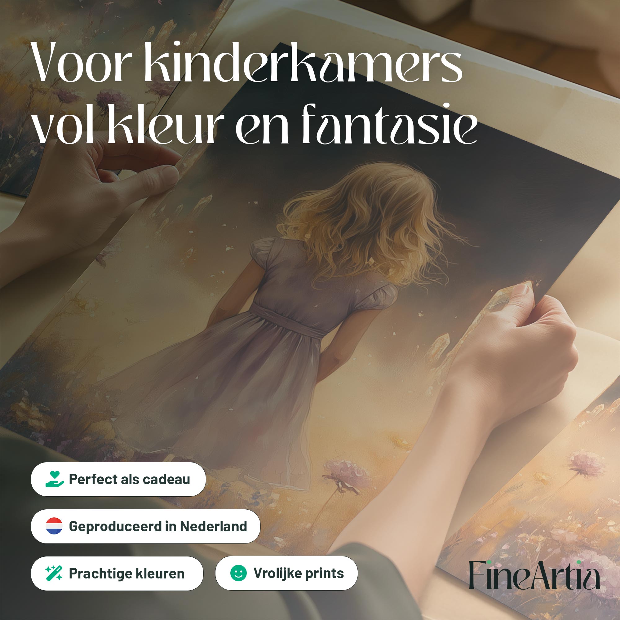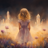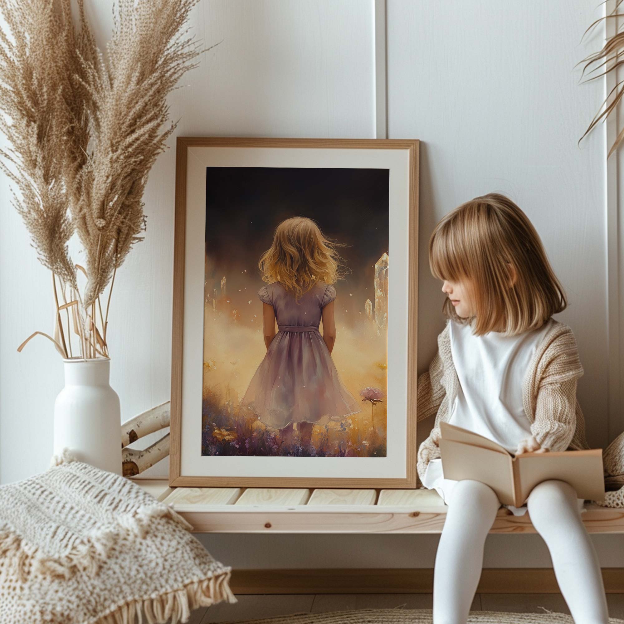 Dromerig Meisje in Bloeiend Landschap – Pastel Schilderij