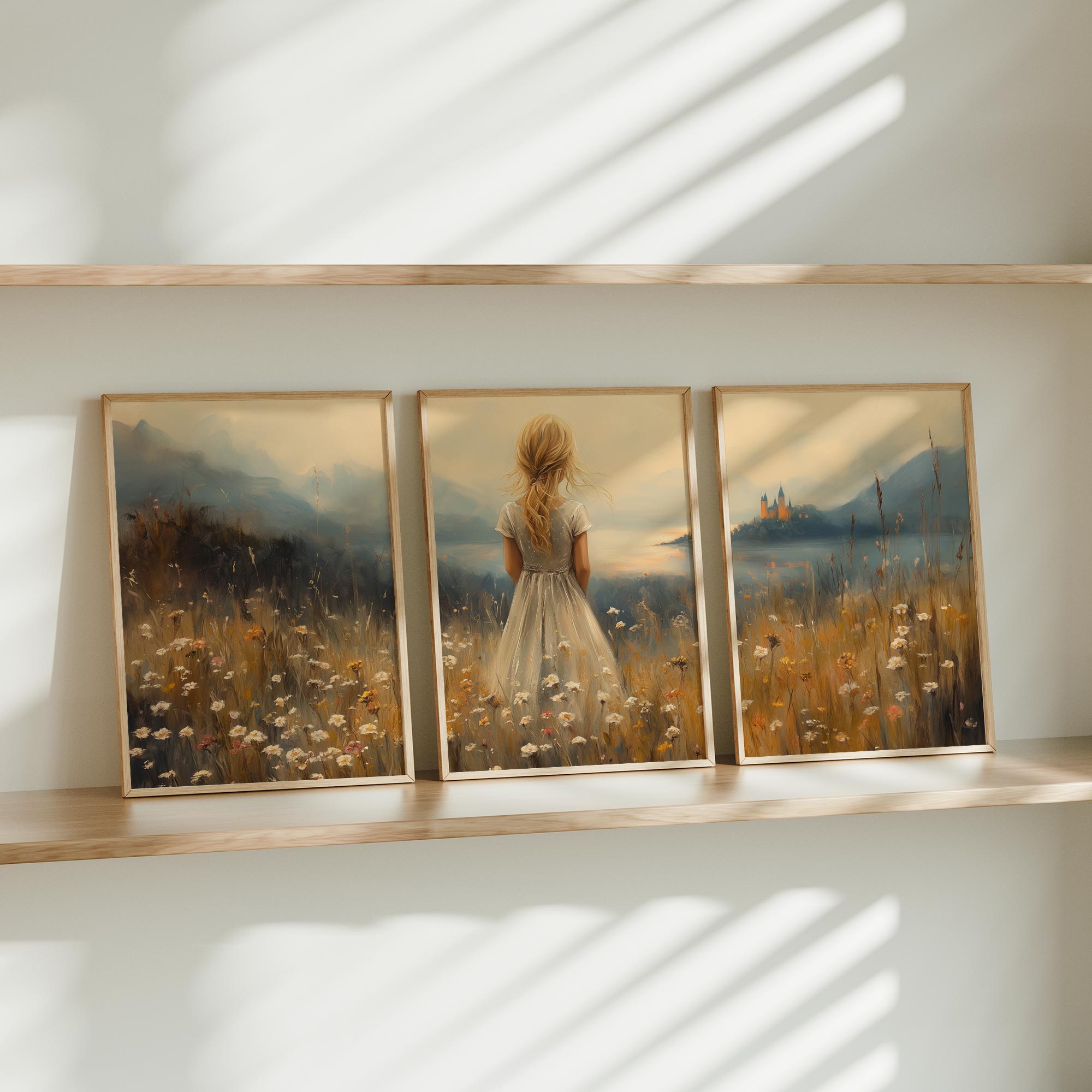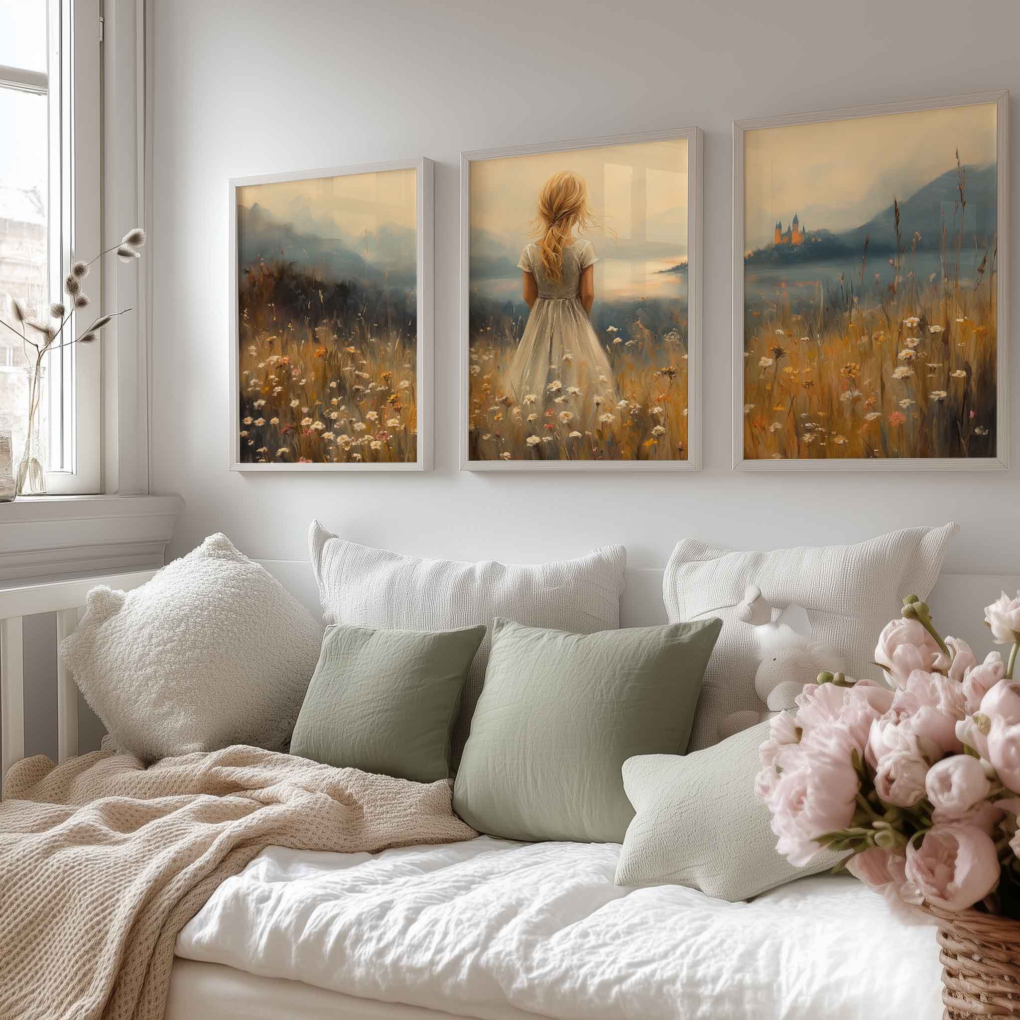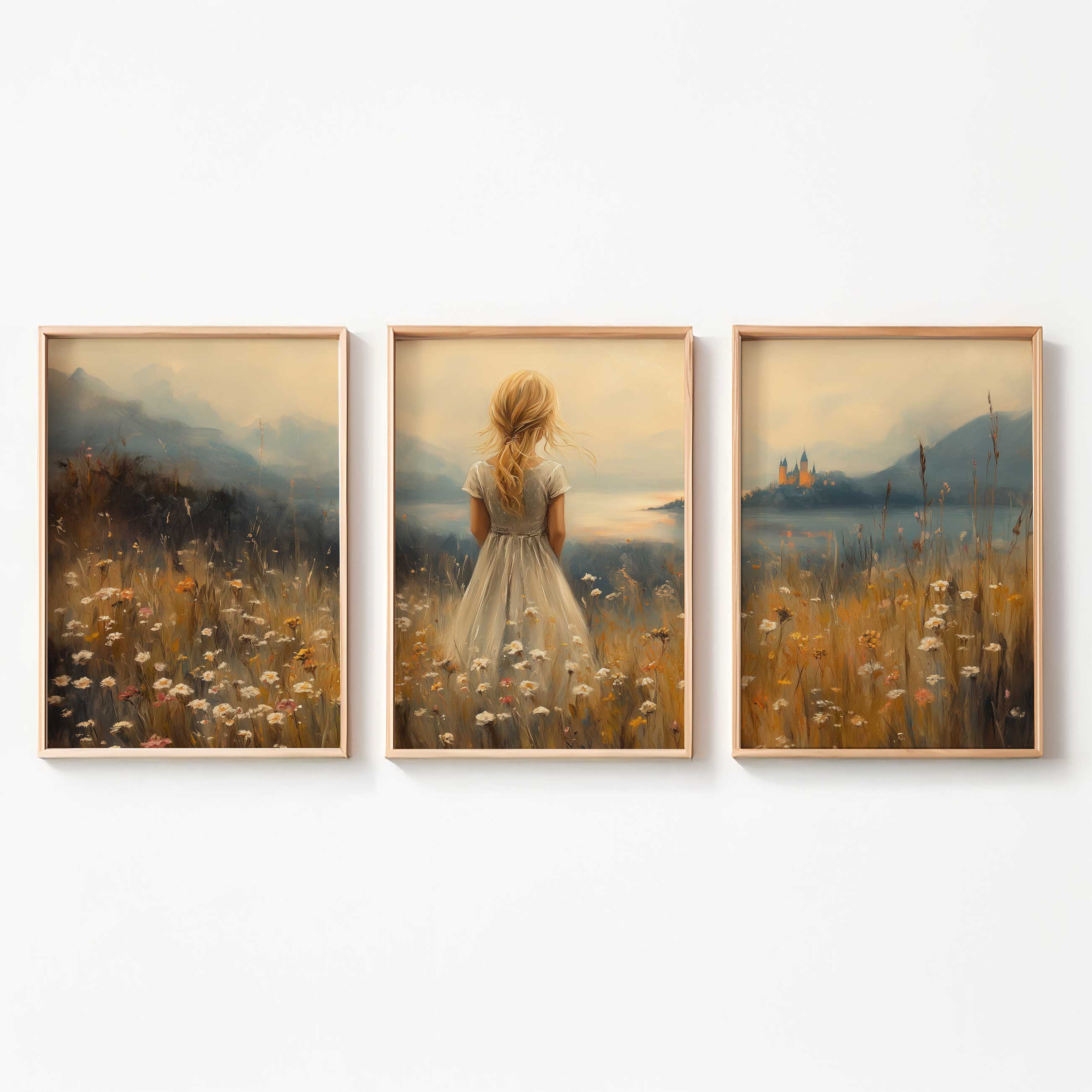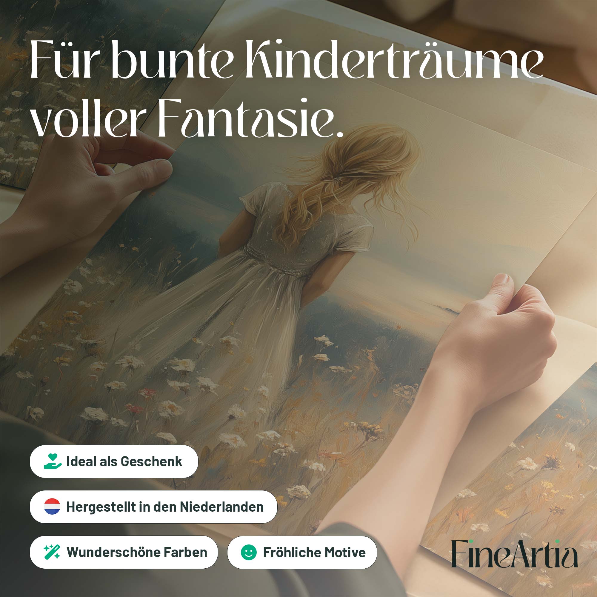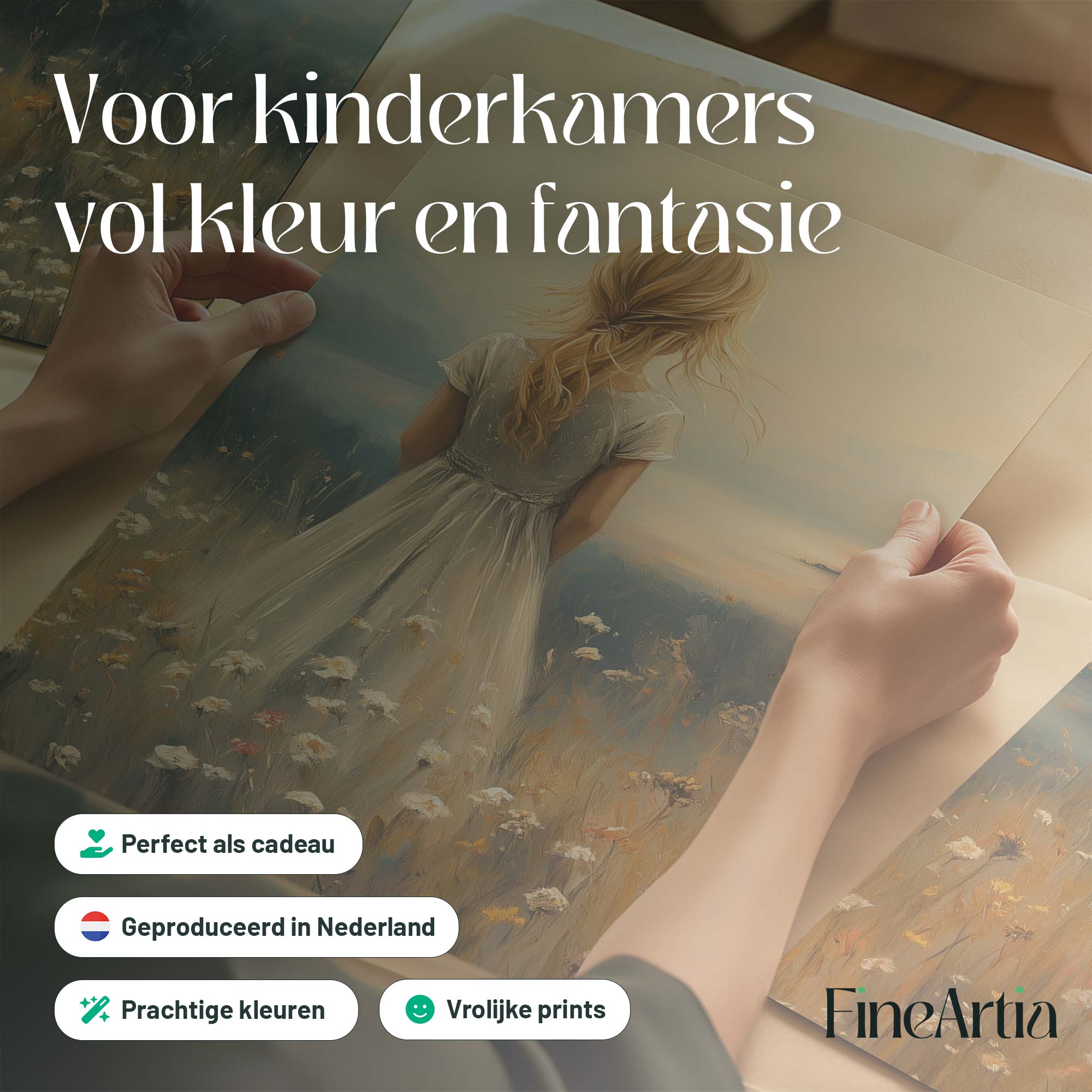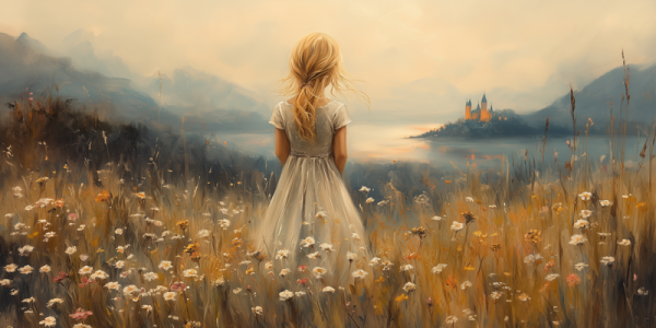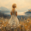 Dromerig Meisje in Bloemenveld bij Betoverend Kasteel