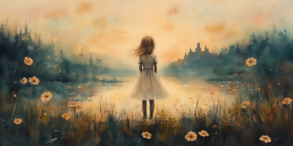 Dromerig Meisje in Bloemenveld bij Kasteel