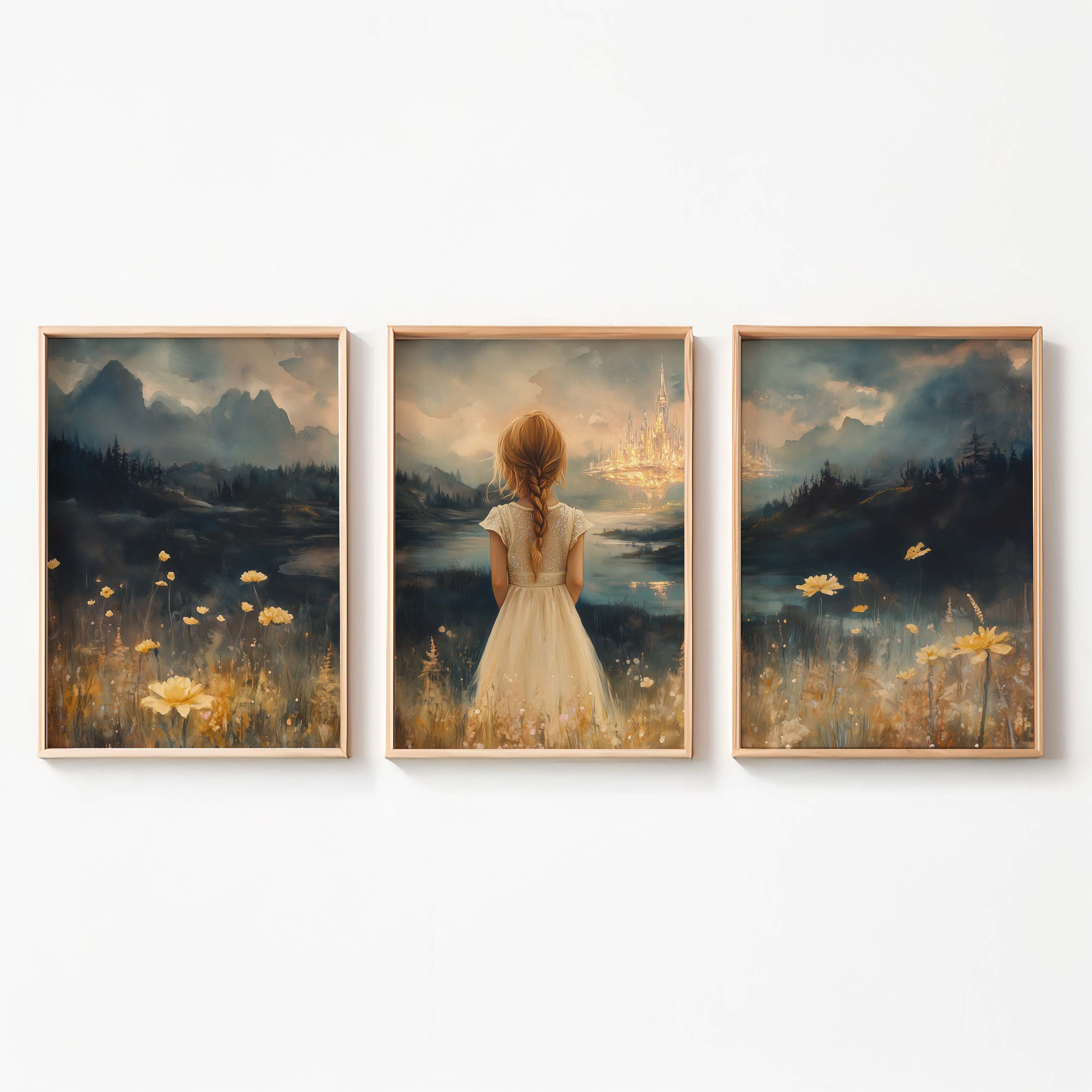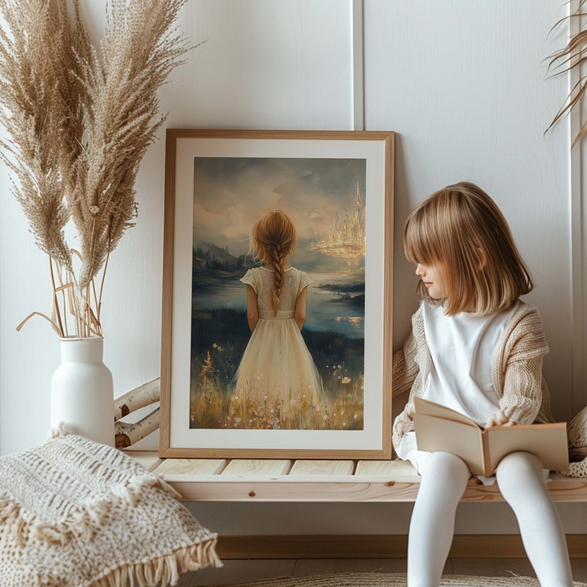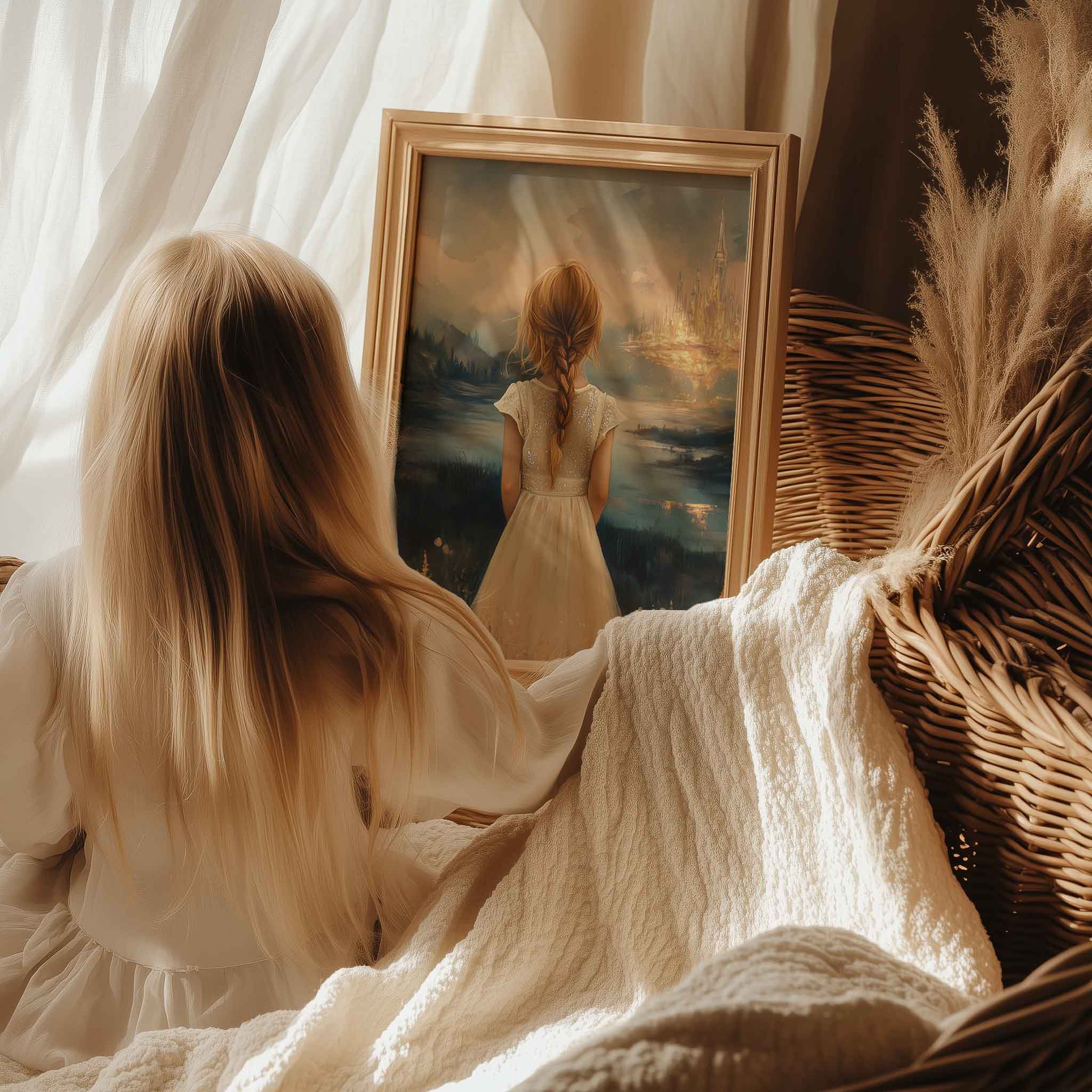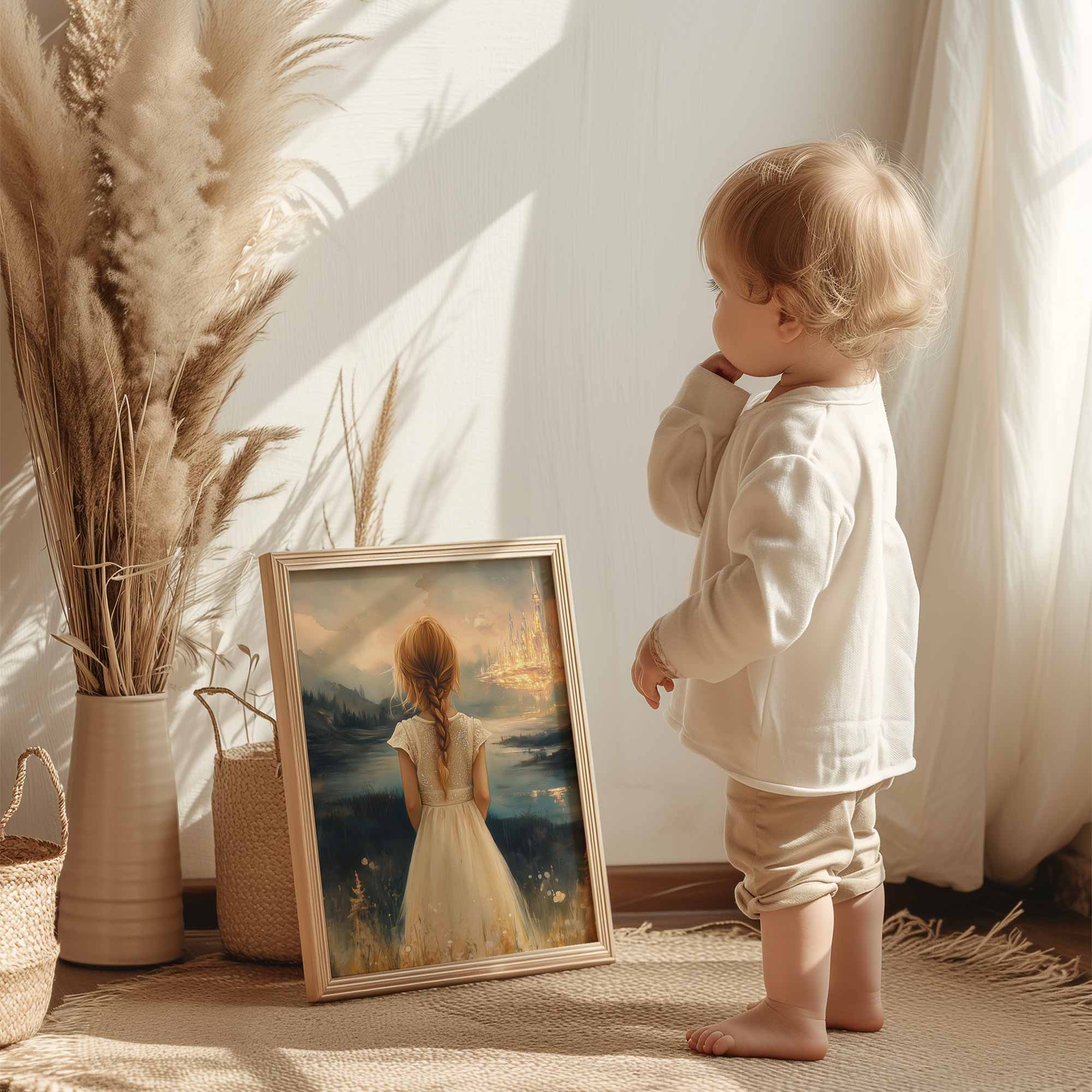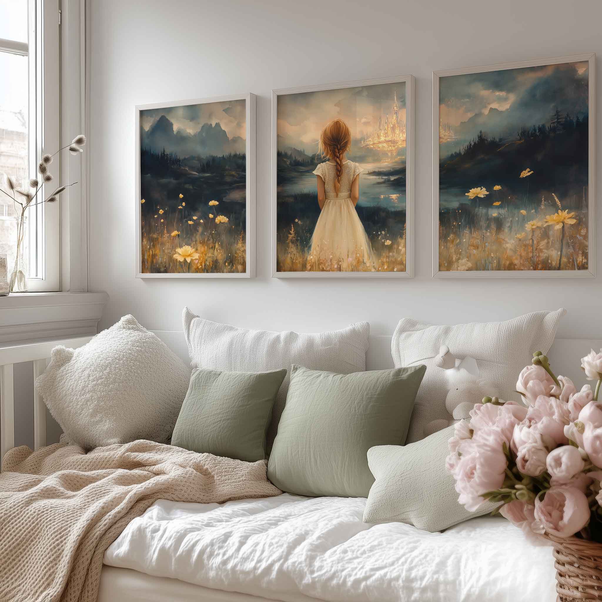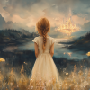 Terug naar collectie Posters Dromerig Meisje in Bloemenveld met Betoverend Kasteel