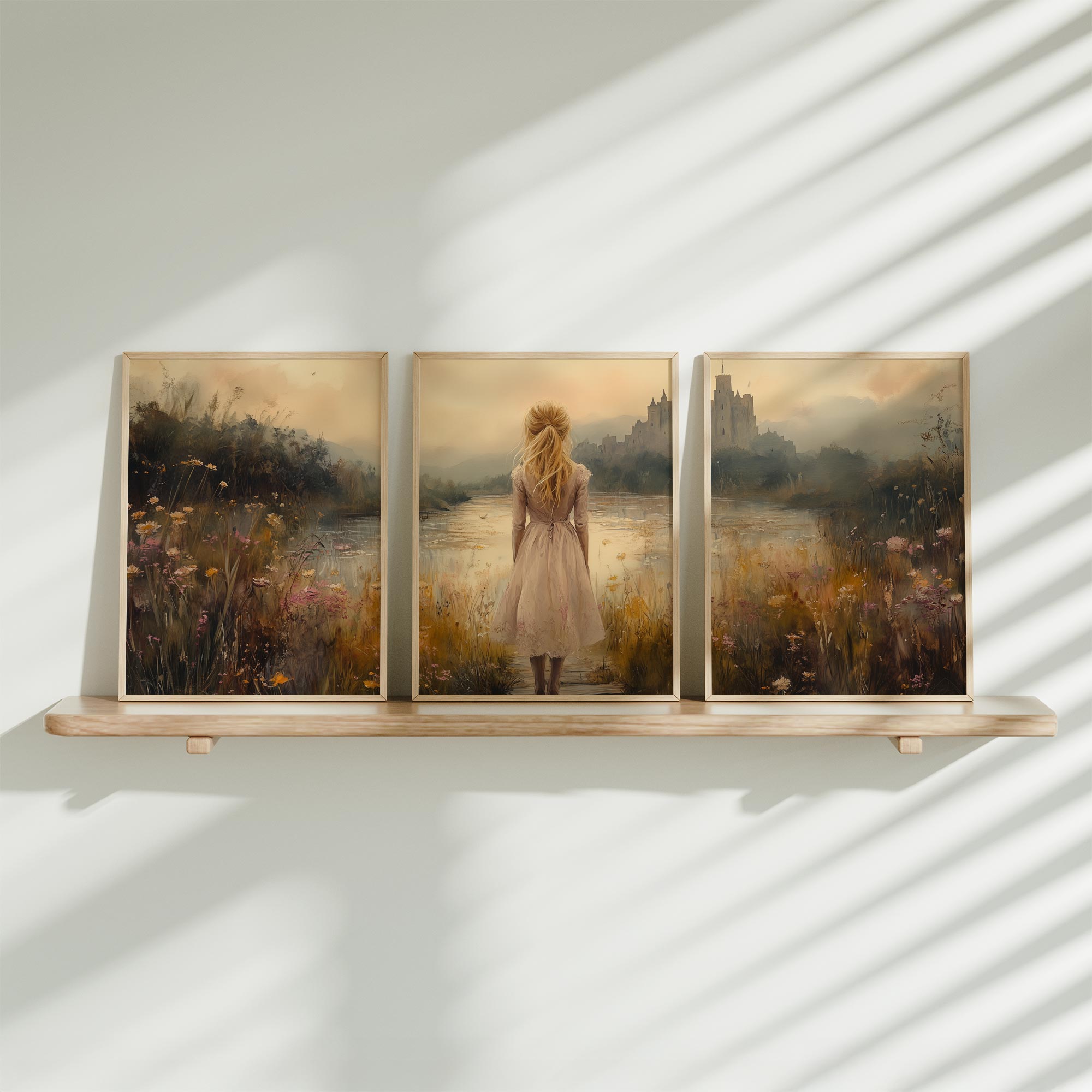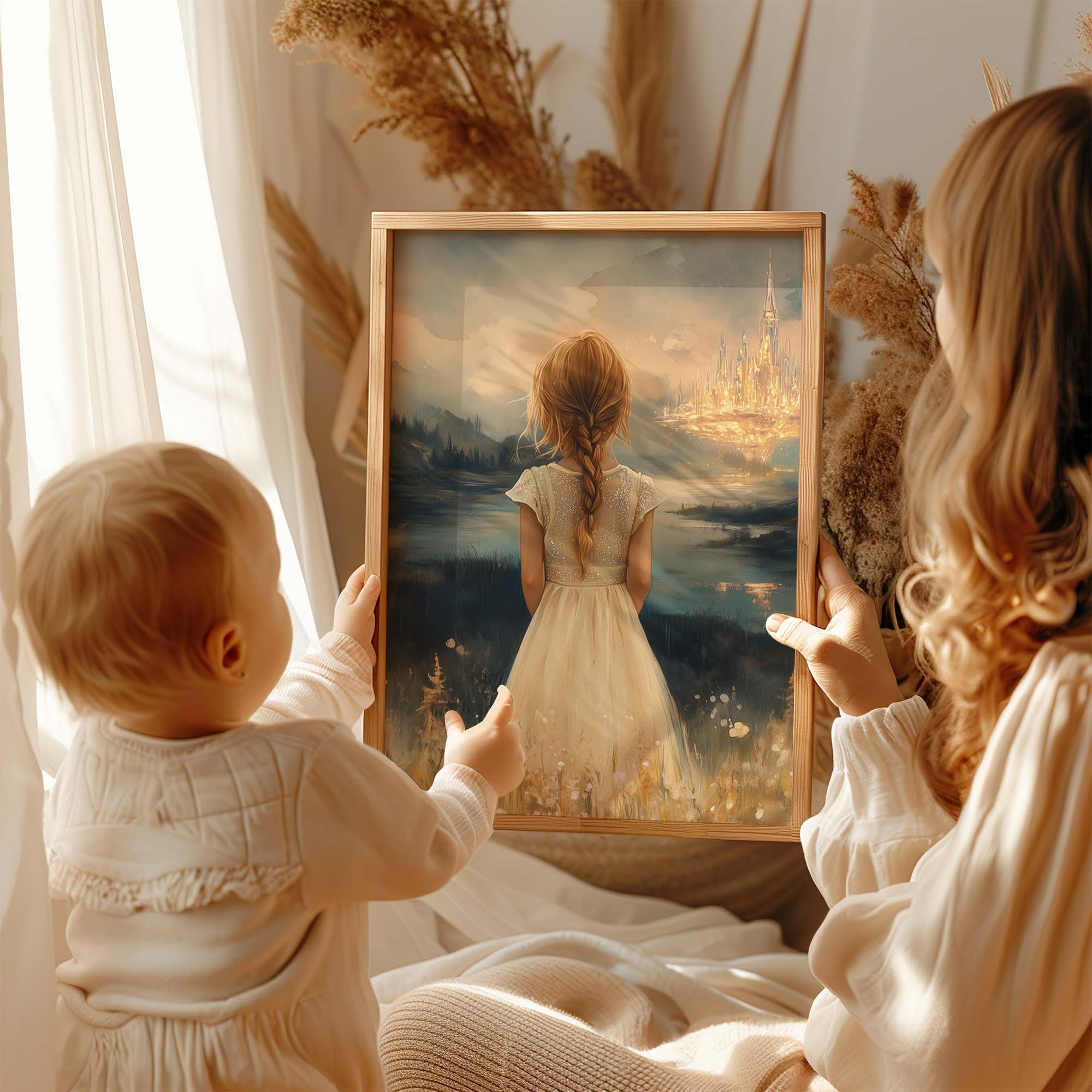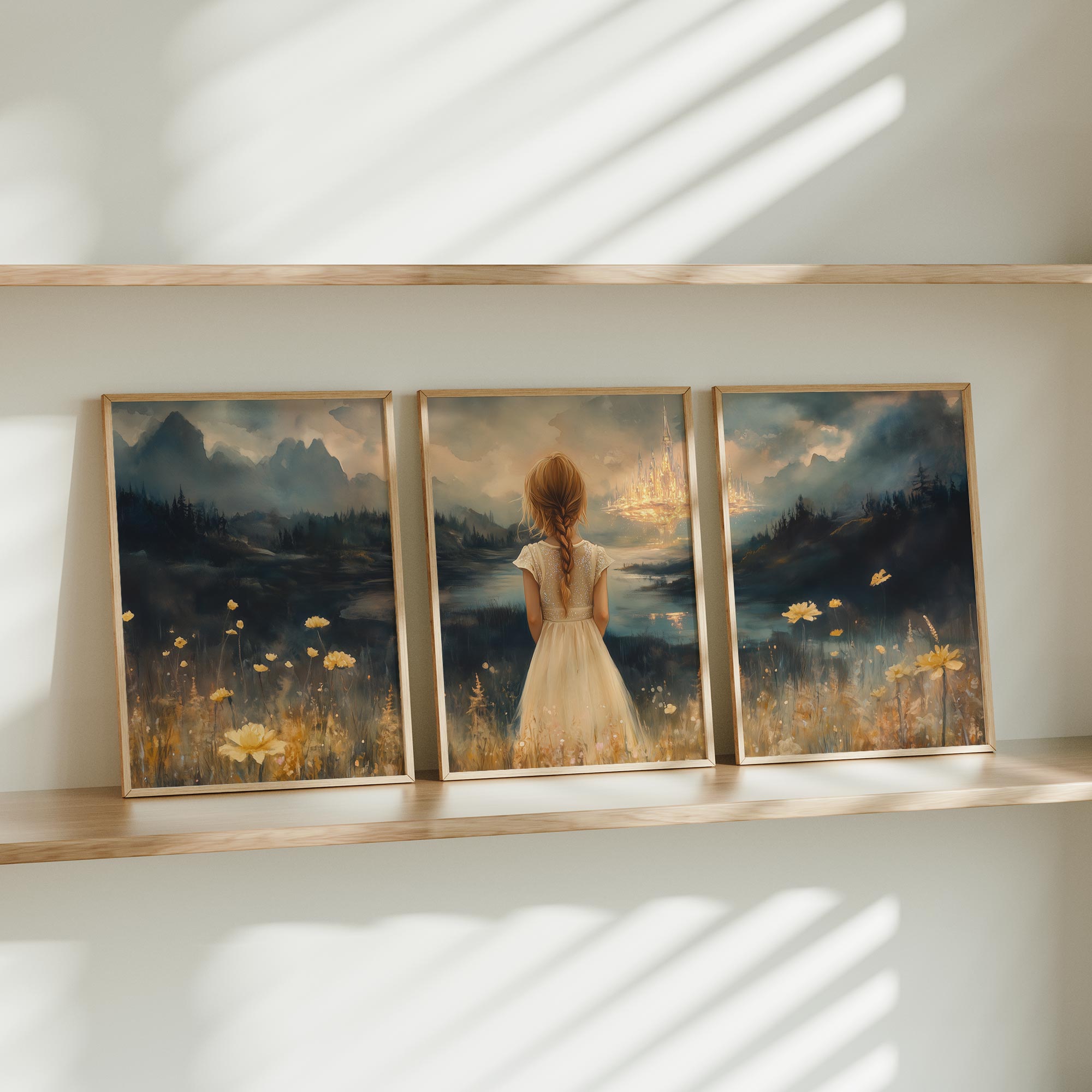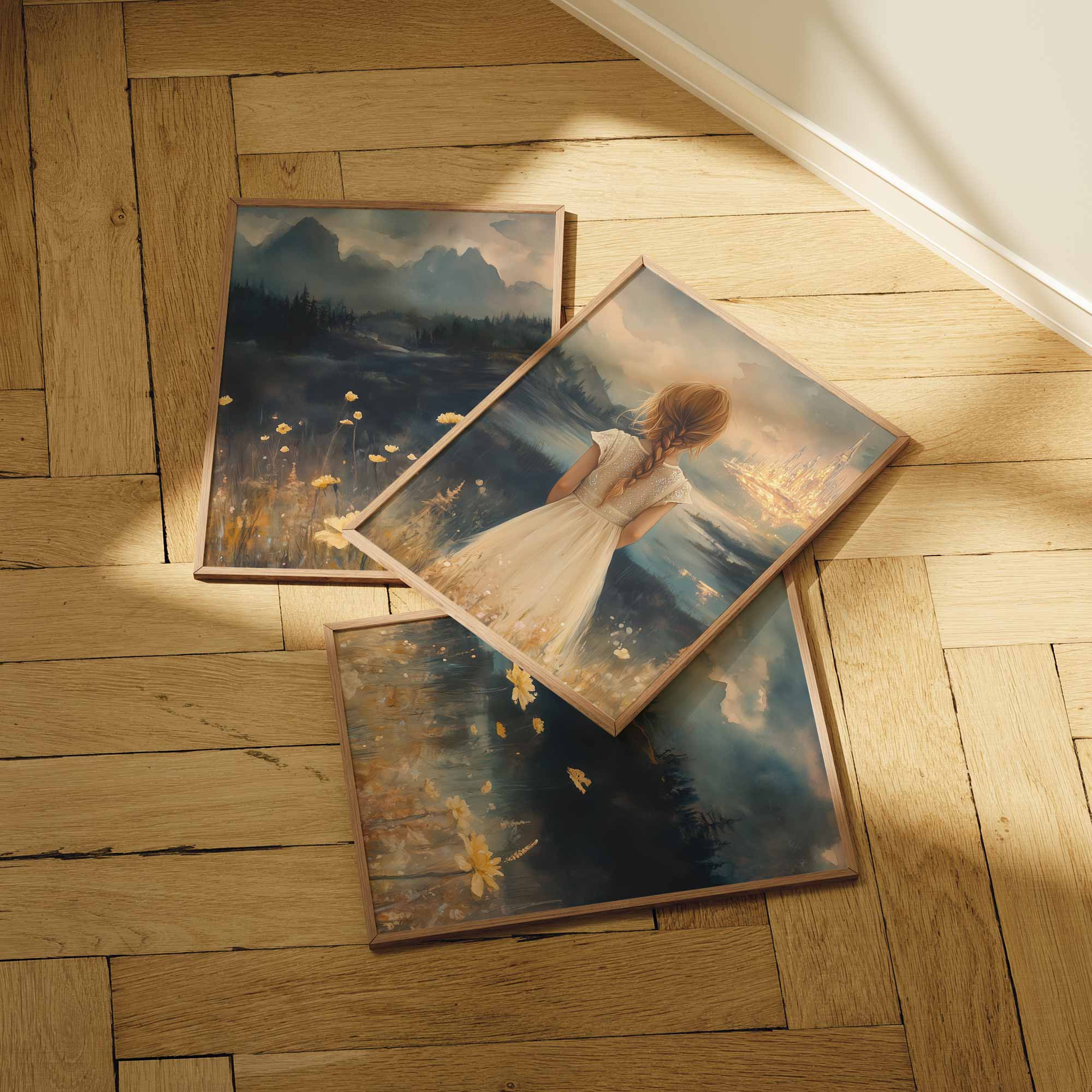 Terug naar collectie Posters Dromerig Meisje in Bloemenveld met Betoverend Kasteel