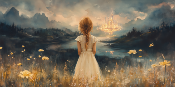 Dromerig Meisje in Bloemenveld met Betoverend Kasteel