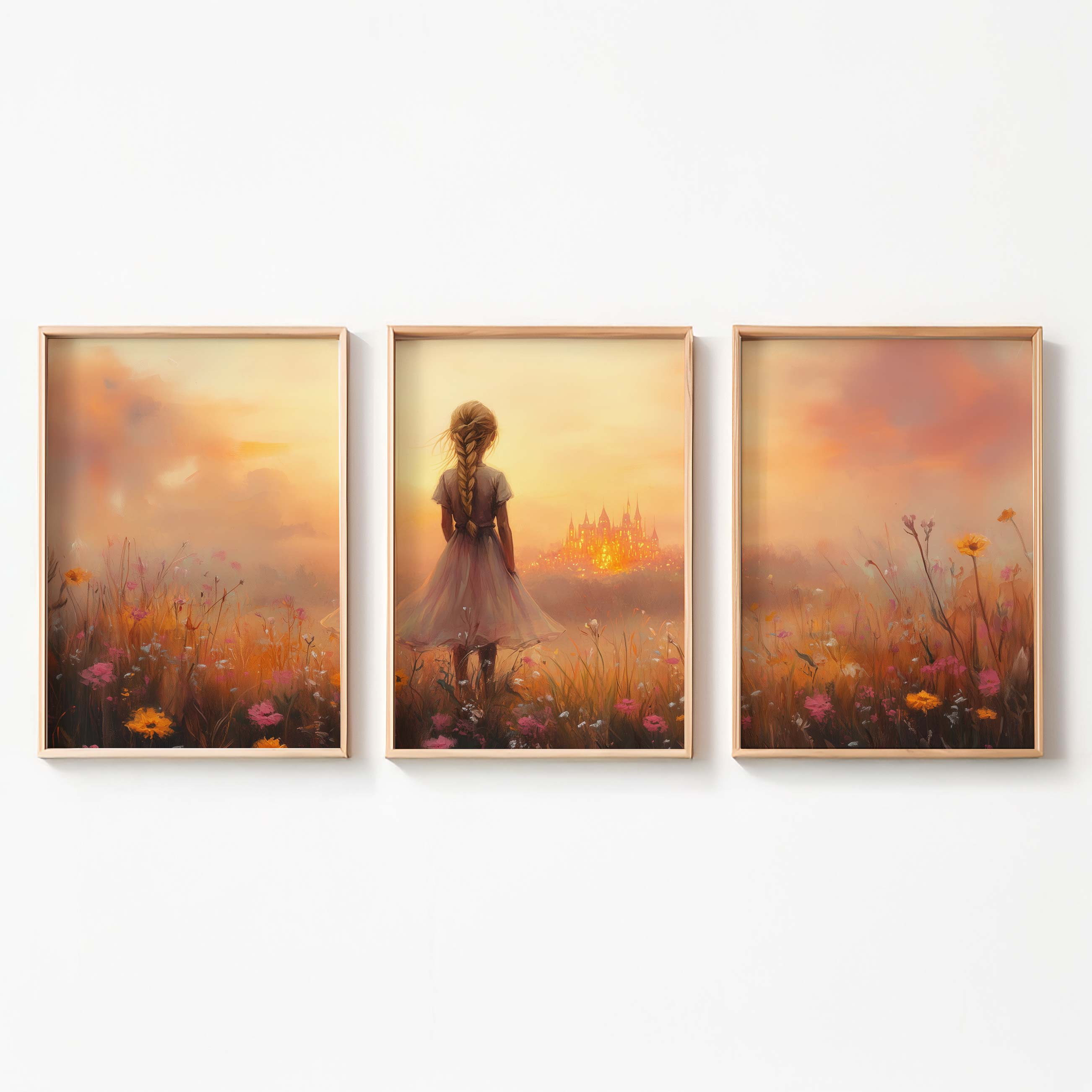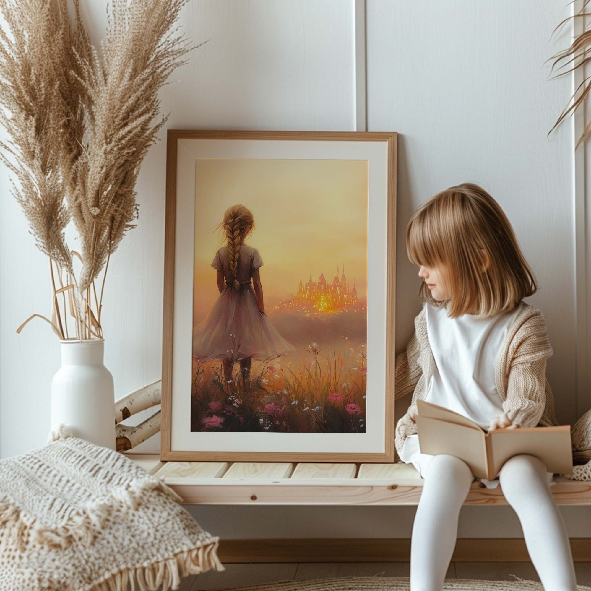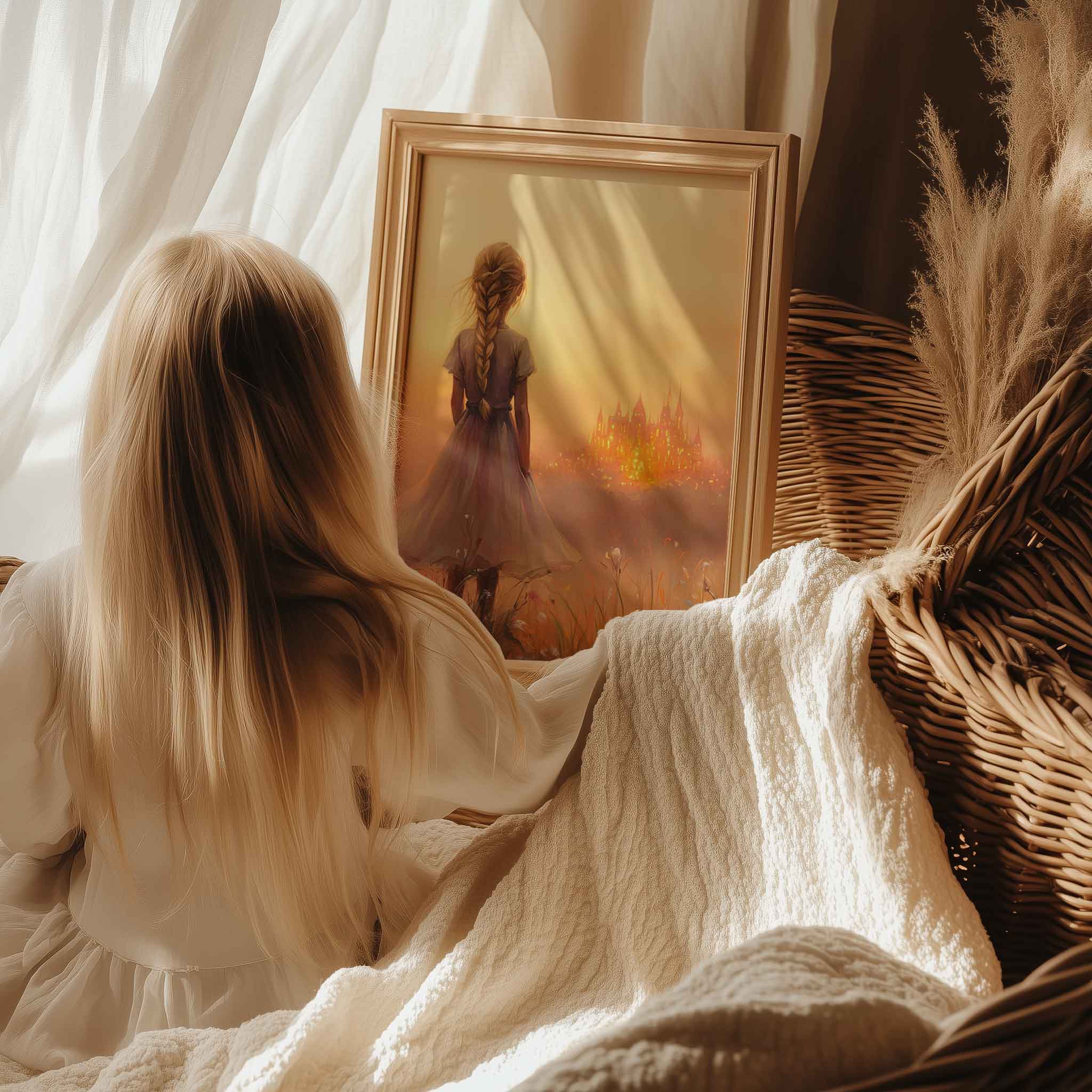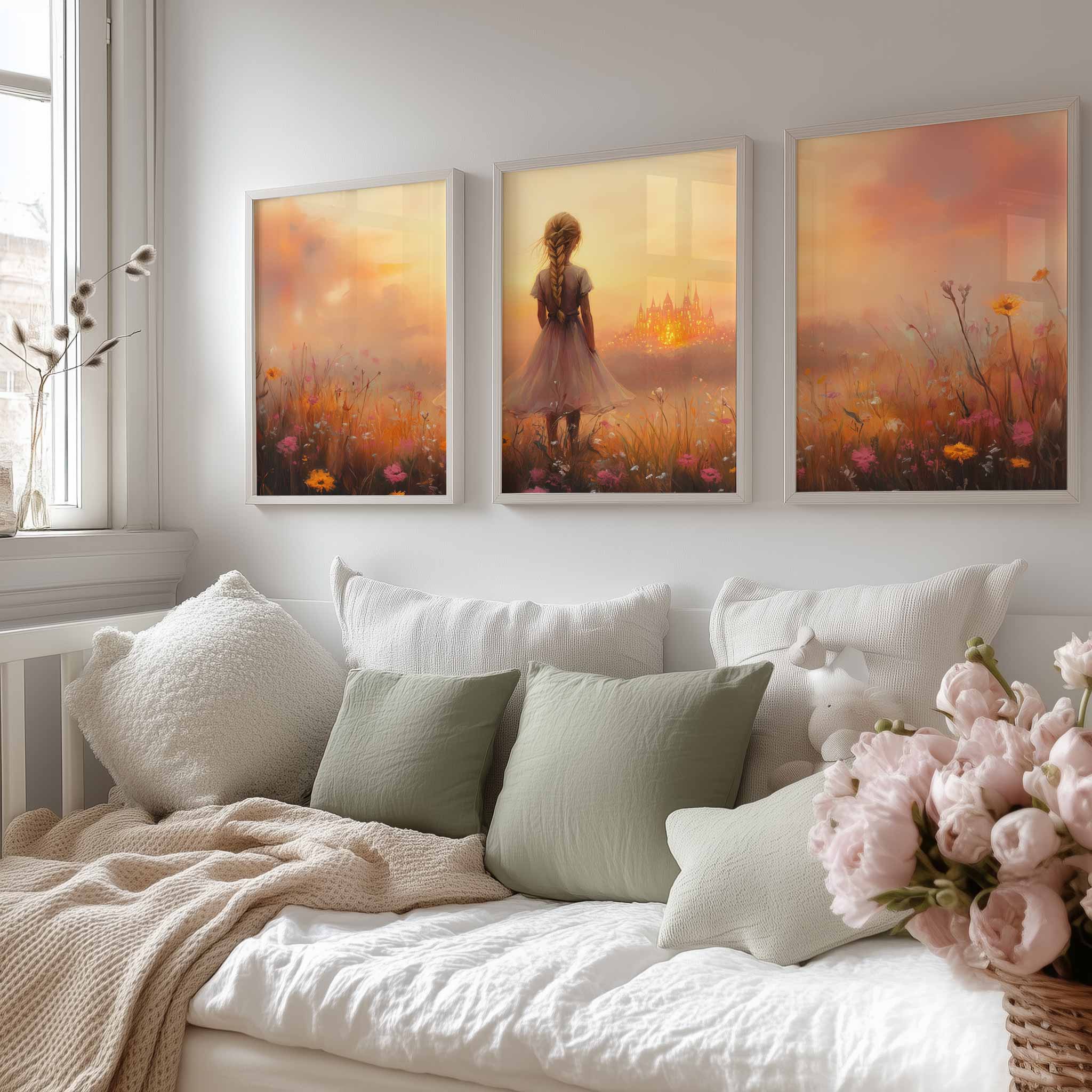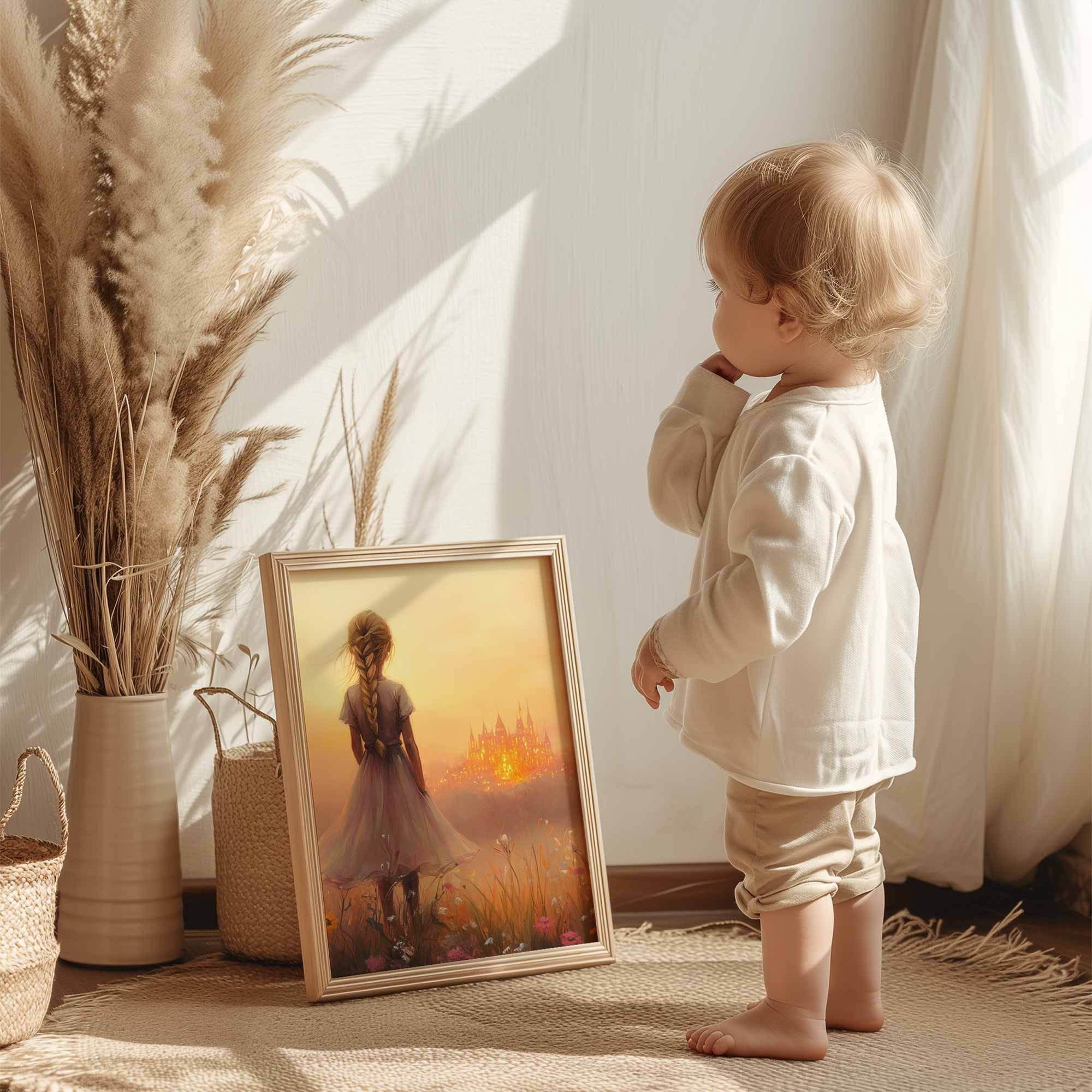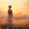 Terug naar collectie Posters Dromerig Meisje in Bloemenveld met Betoverend Kasteel