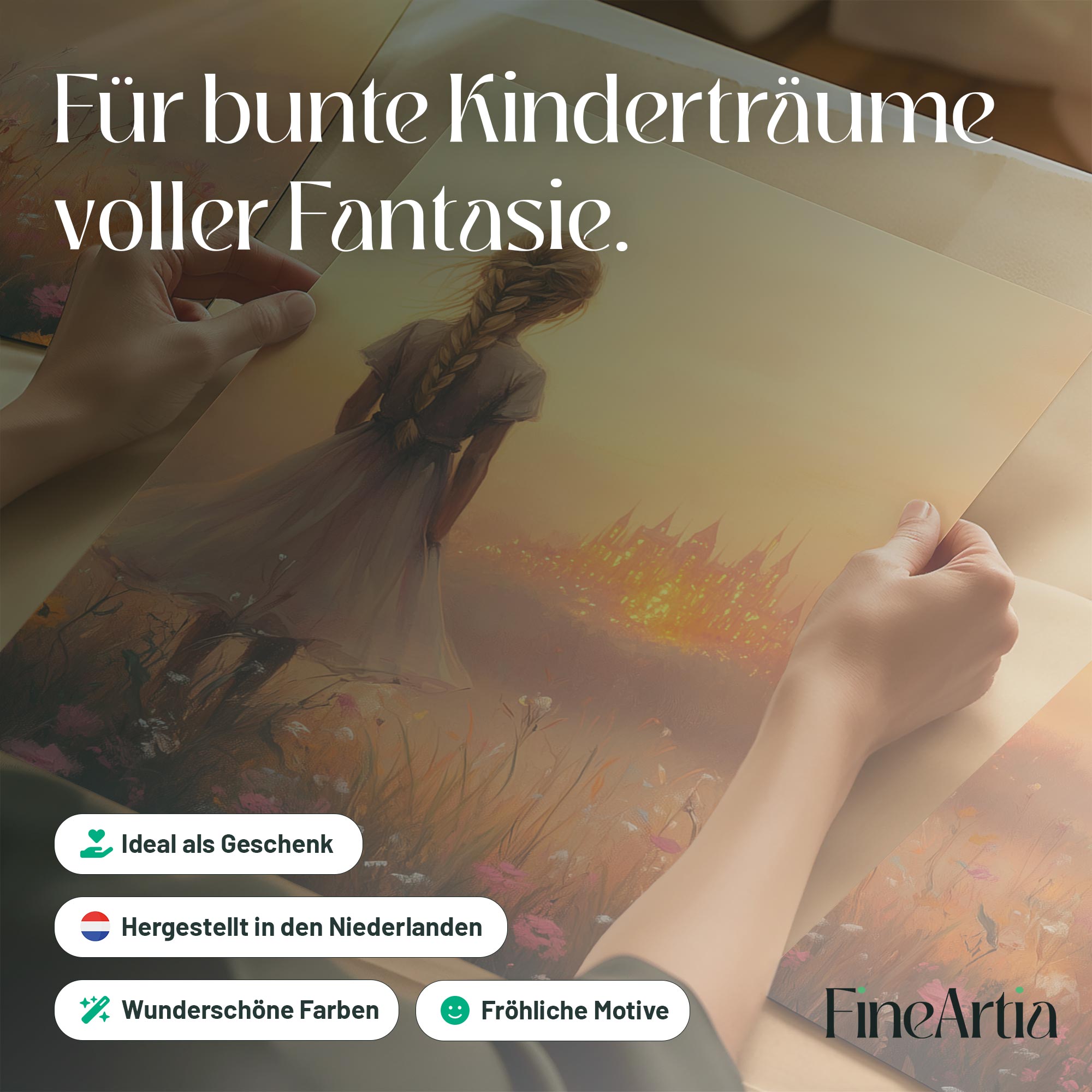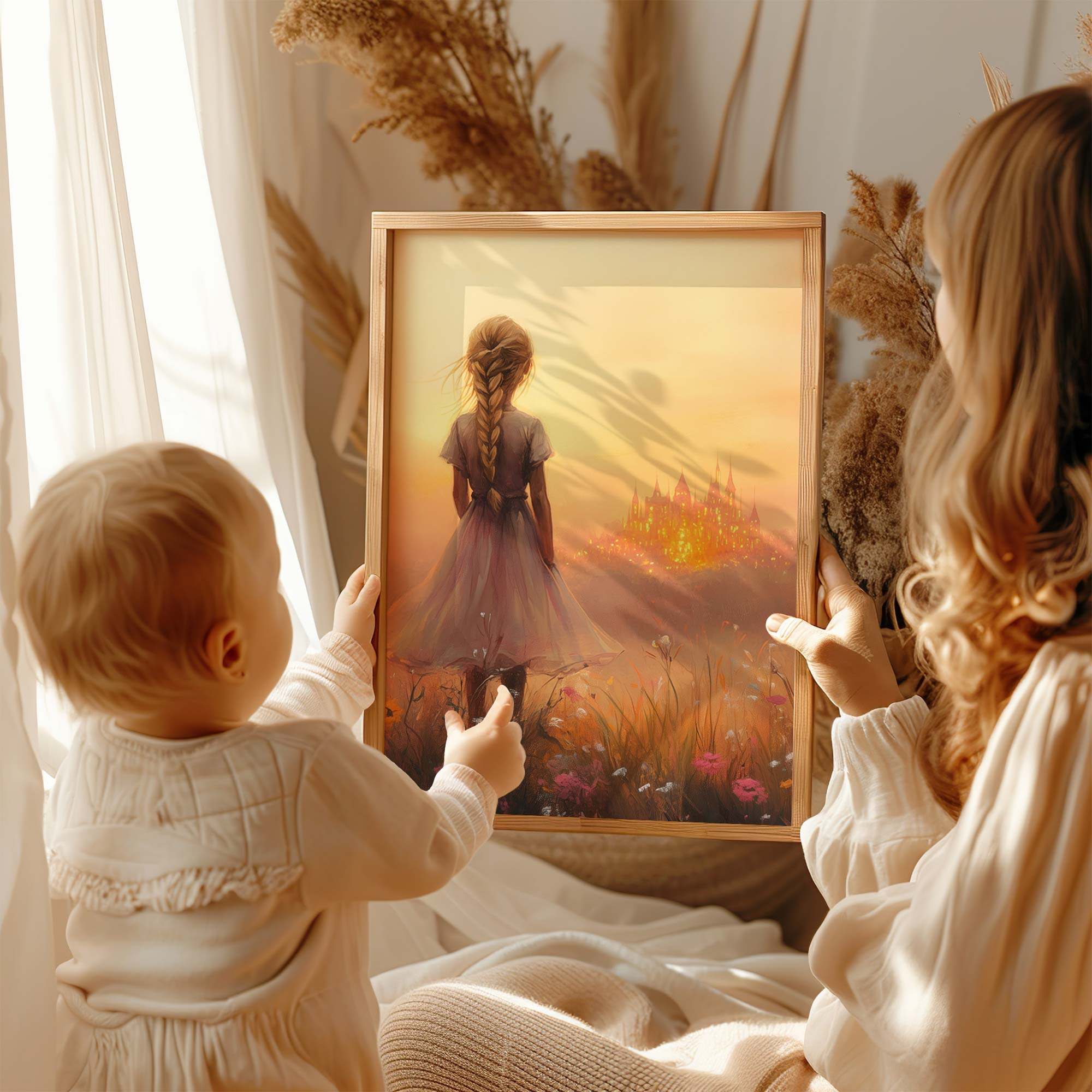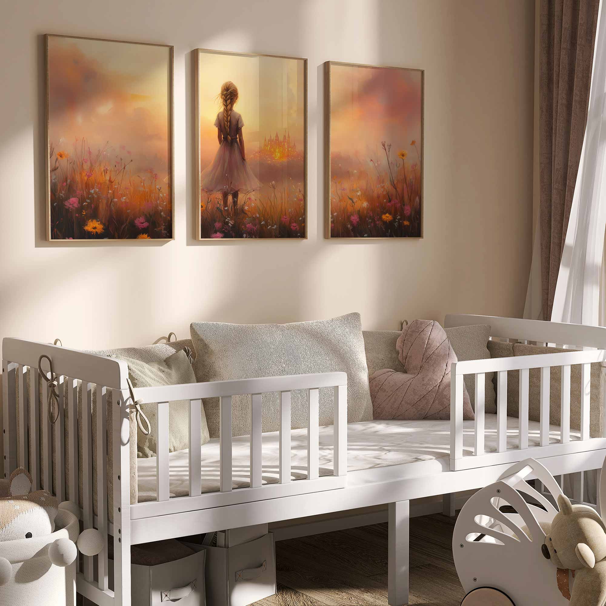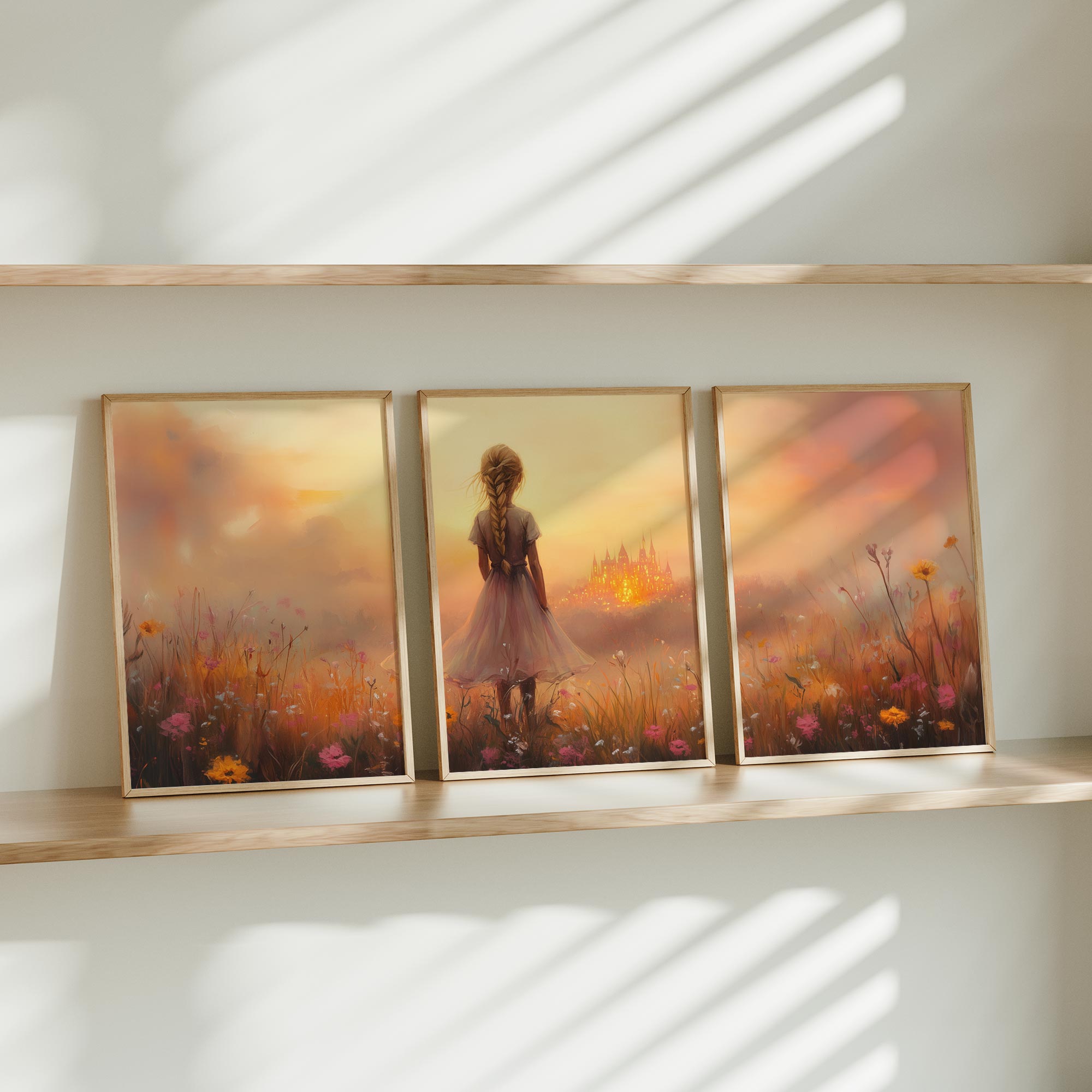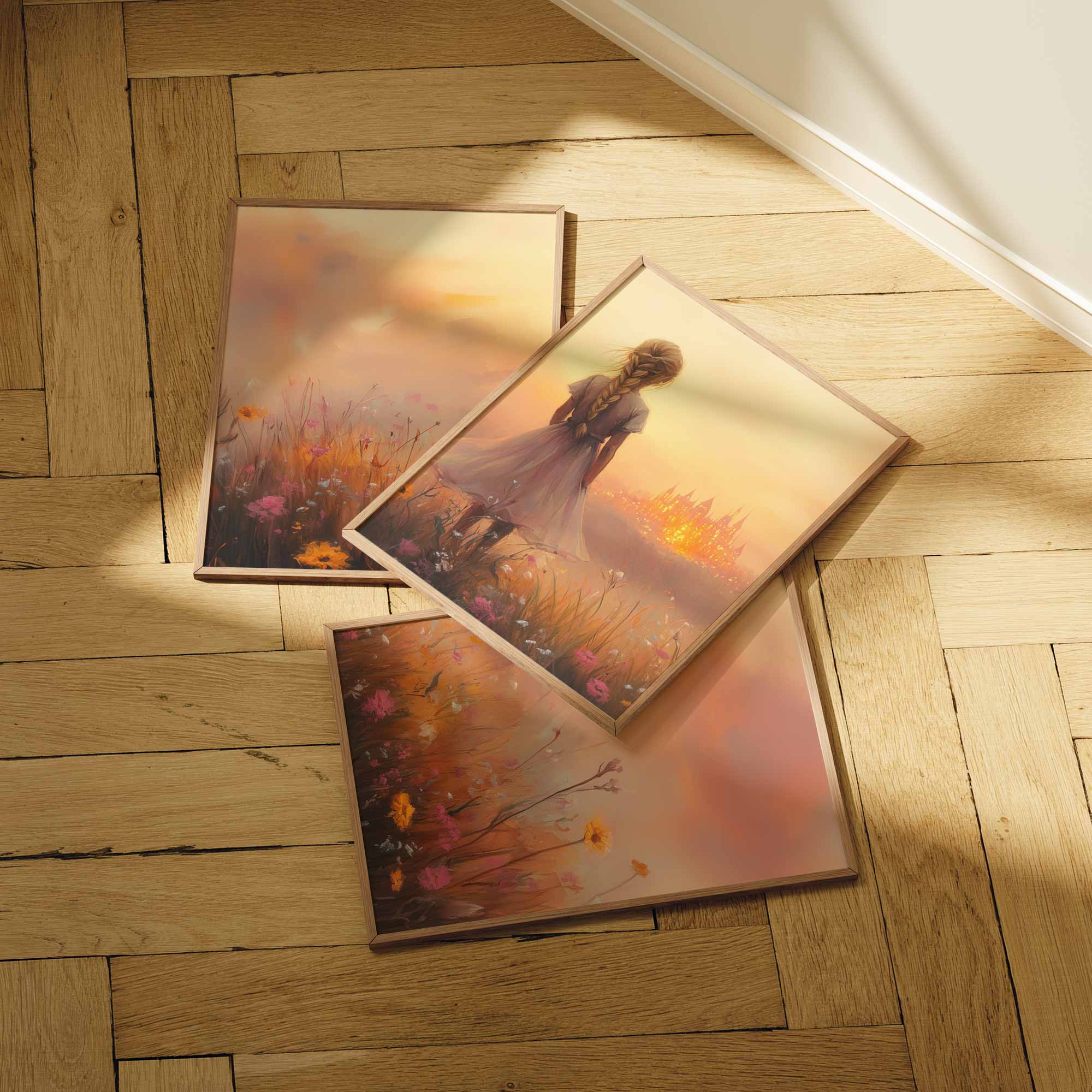 Terug naar collectie Posters Dromerig Meisje in Bloemenveld met Betoverend Kasteel