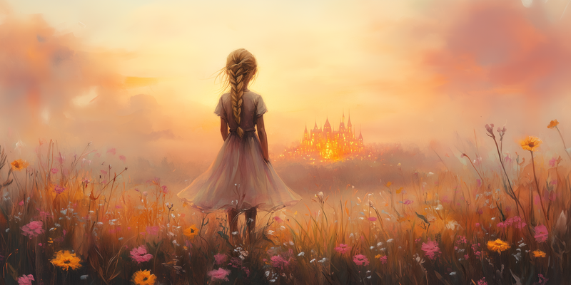 Dromerig Meisje in Bloemenveld met Betoverend Kasteel