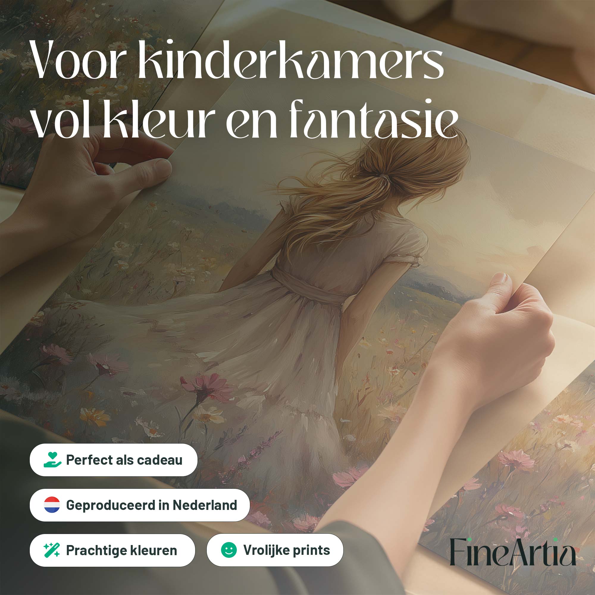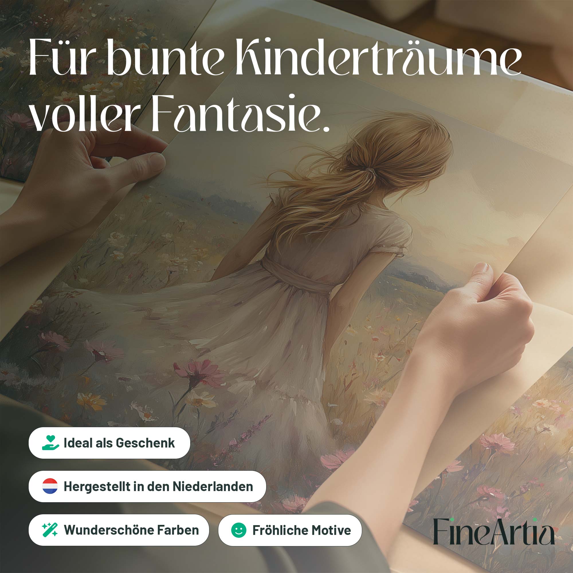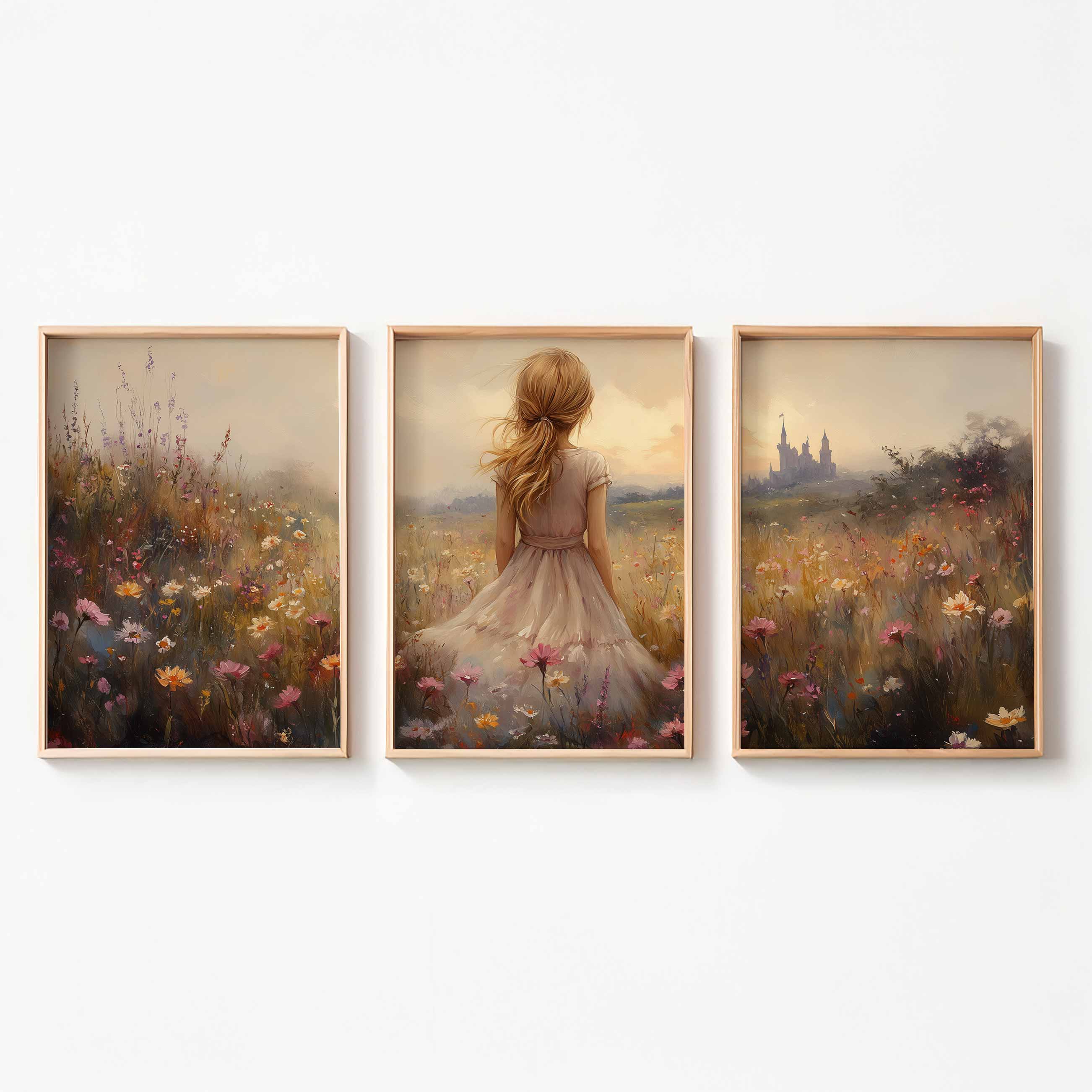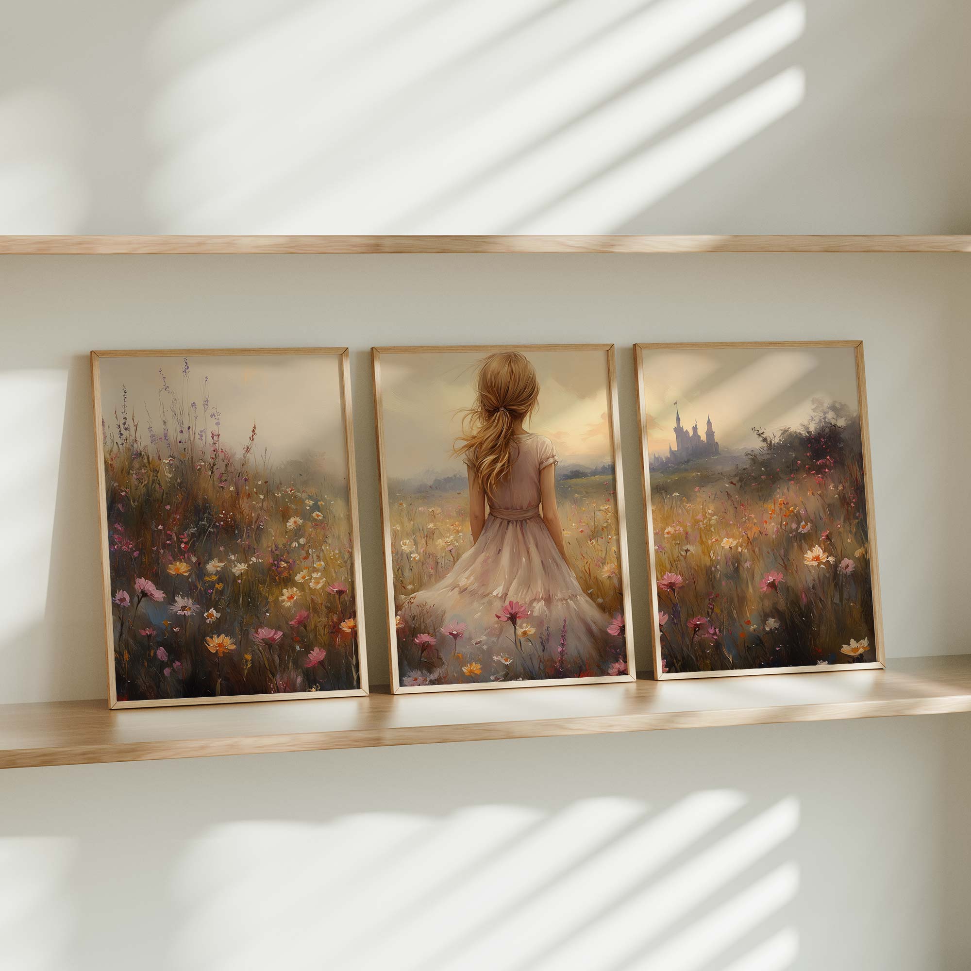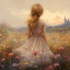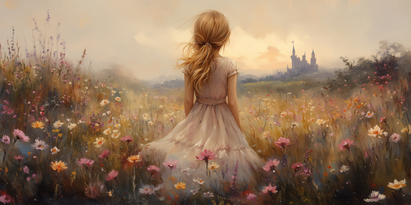 Dromerig Meisje in Bloemenveld met Kasteelzicht