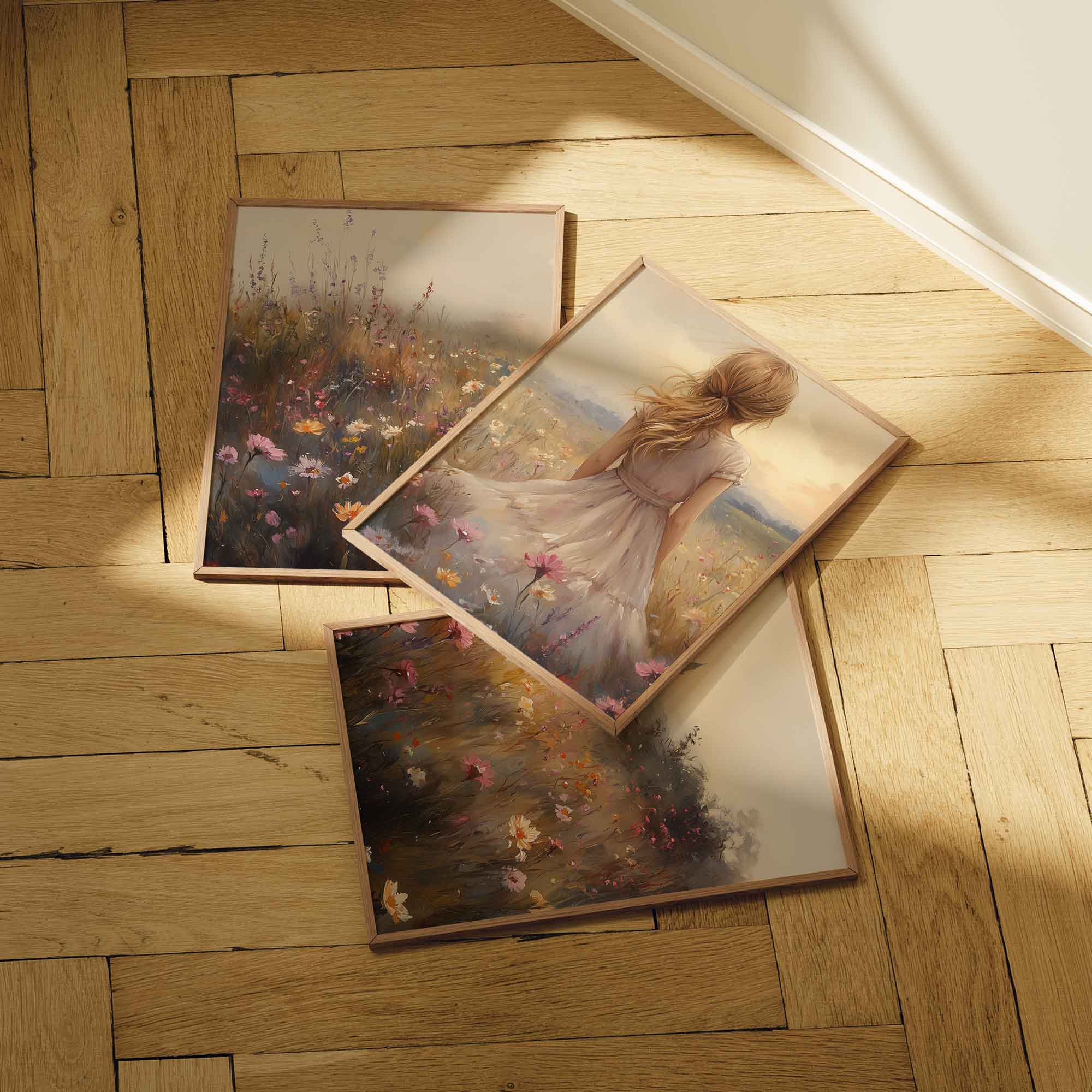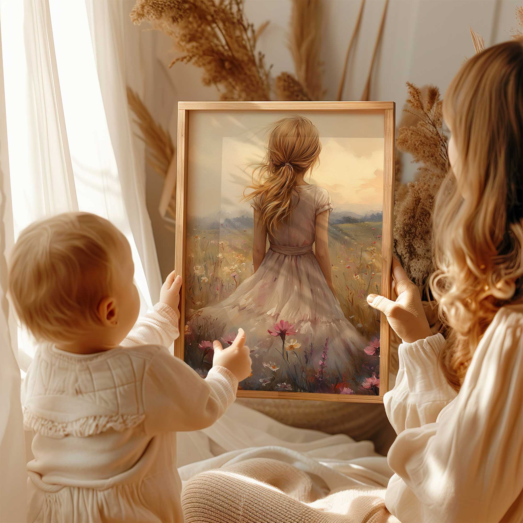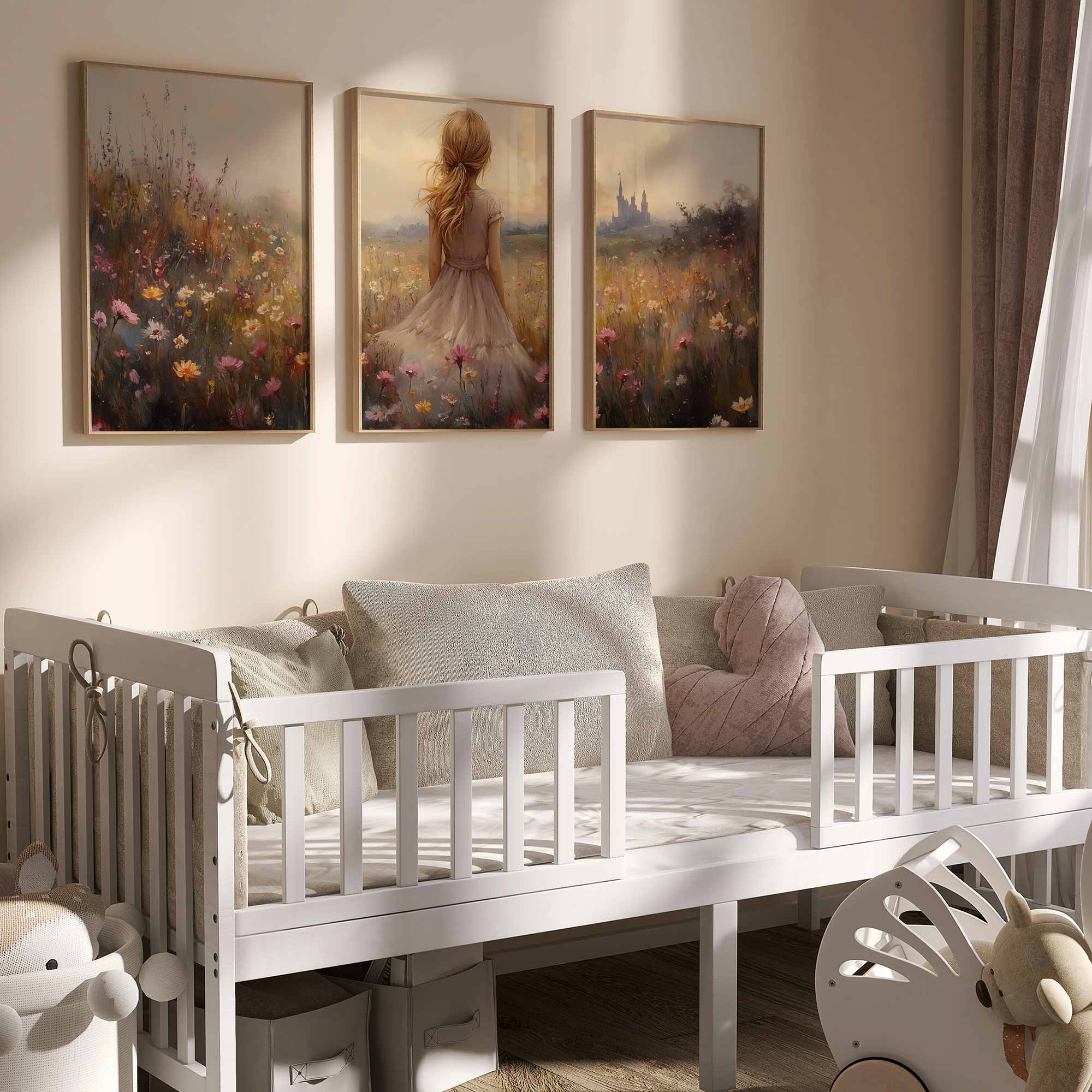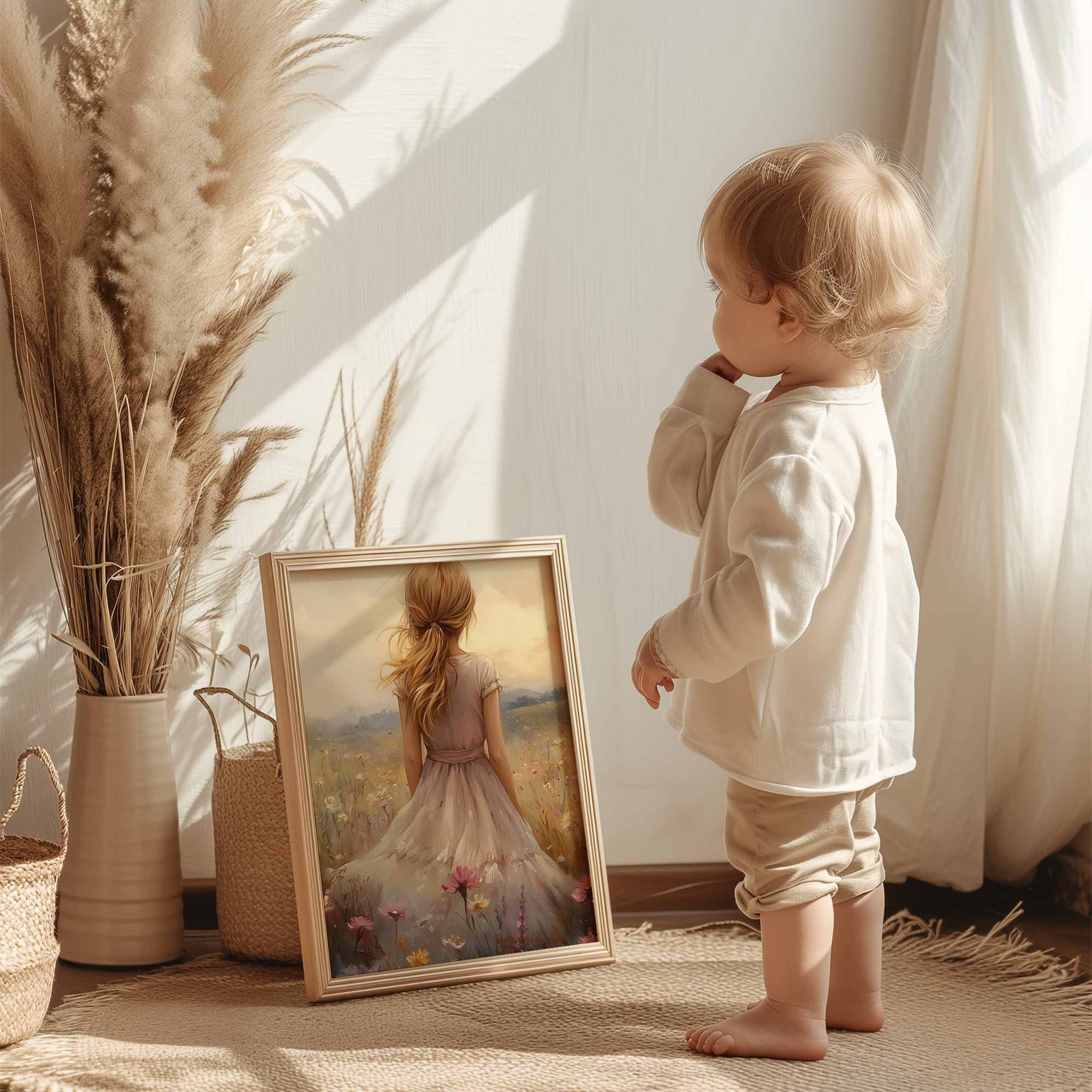 Dromerig Meisje in Bloemenveld met Kasteelzicht