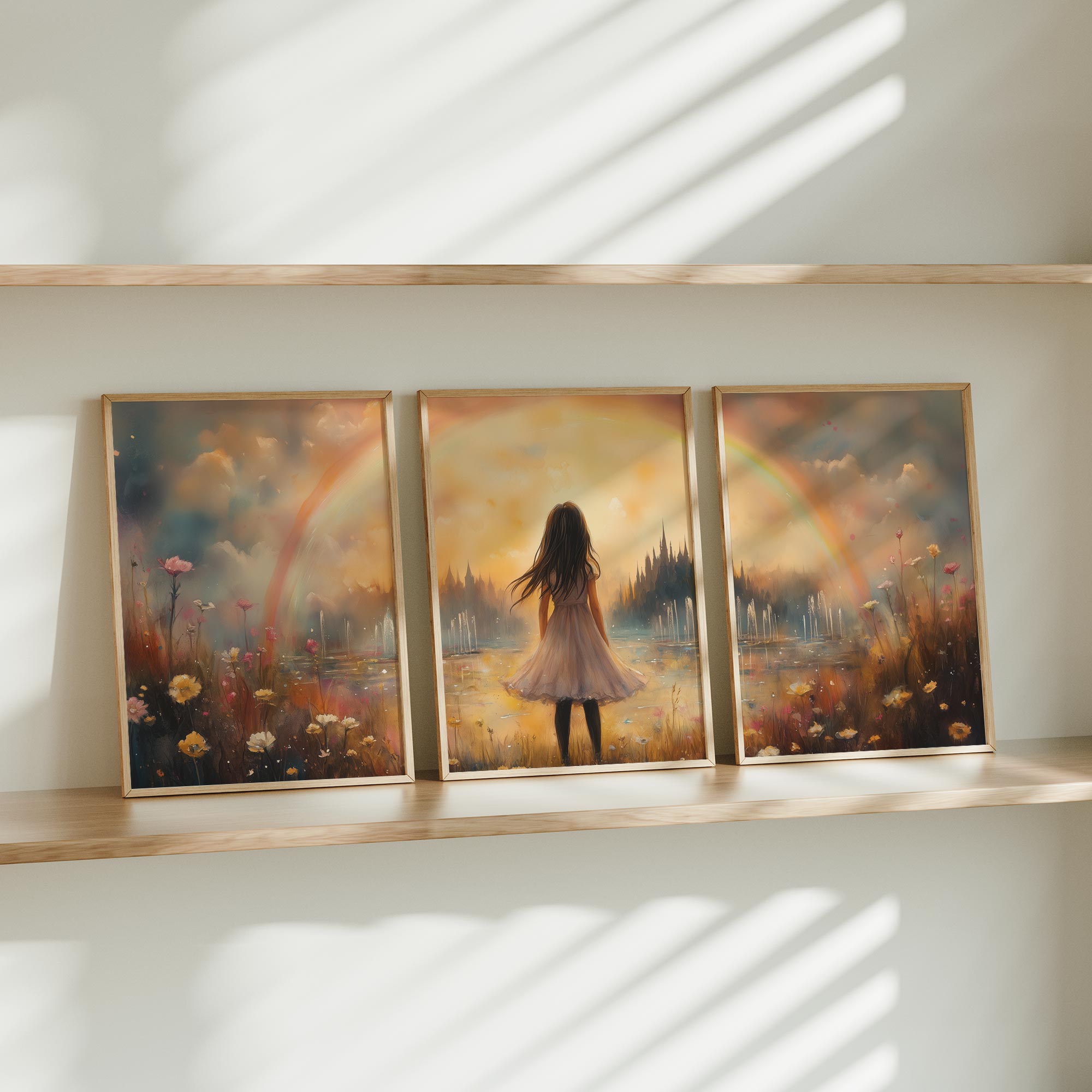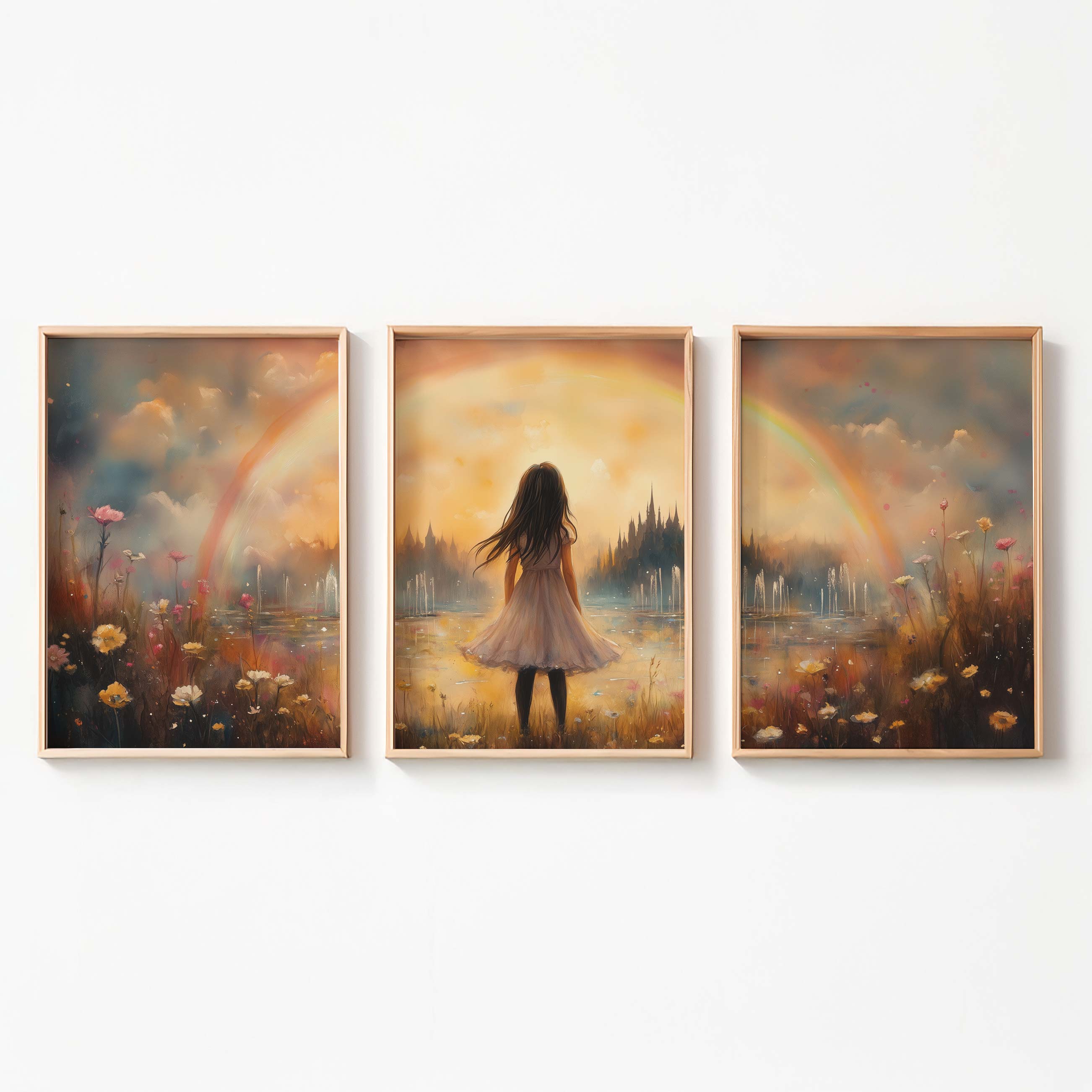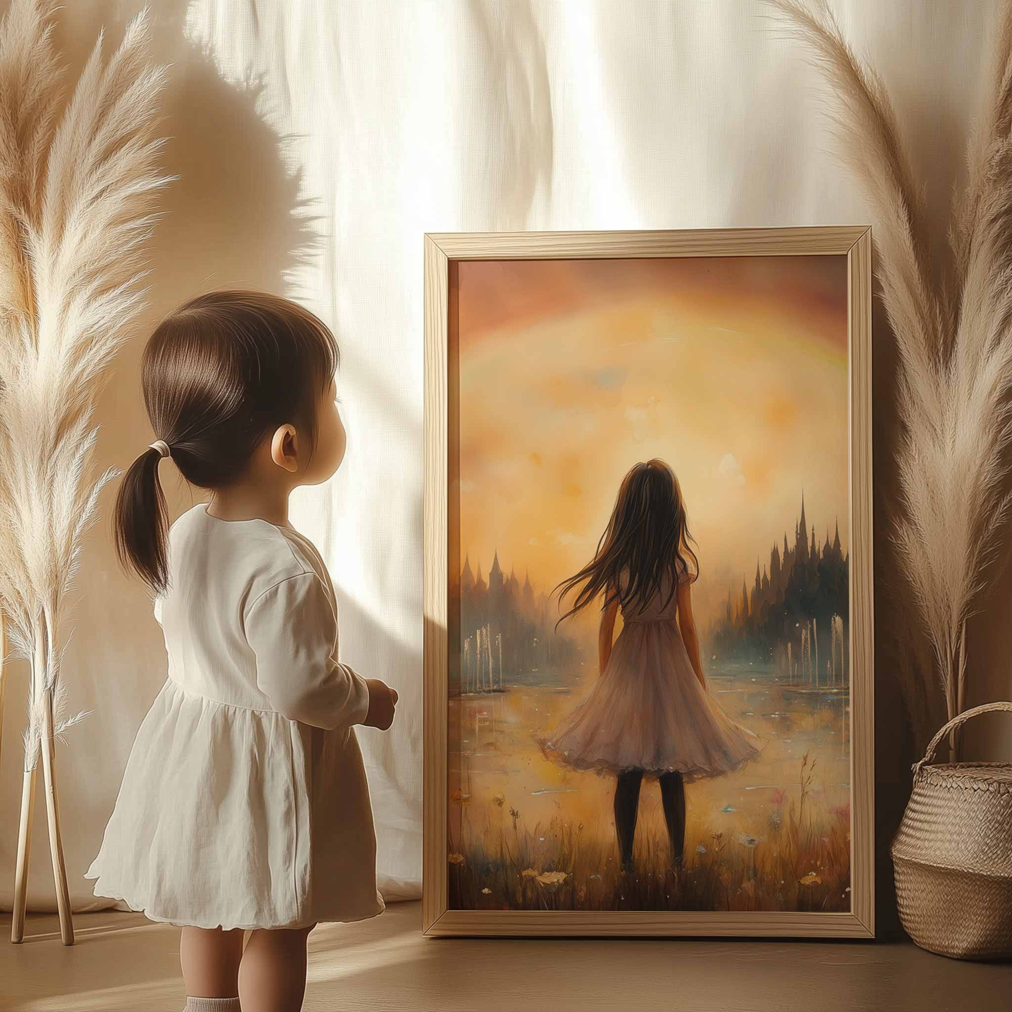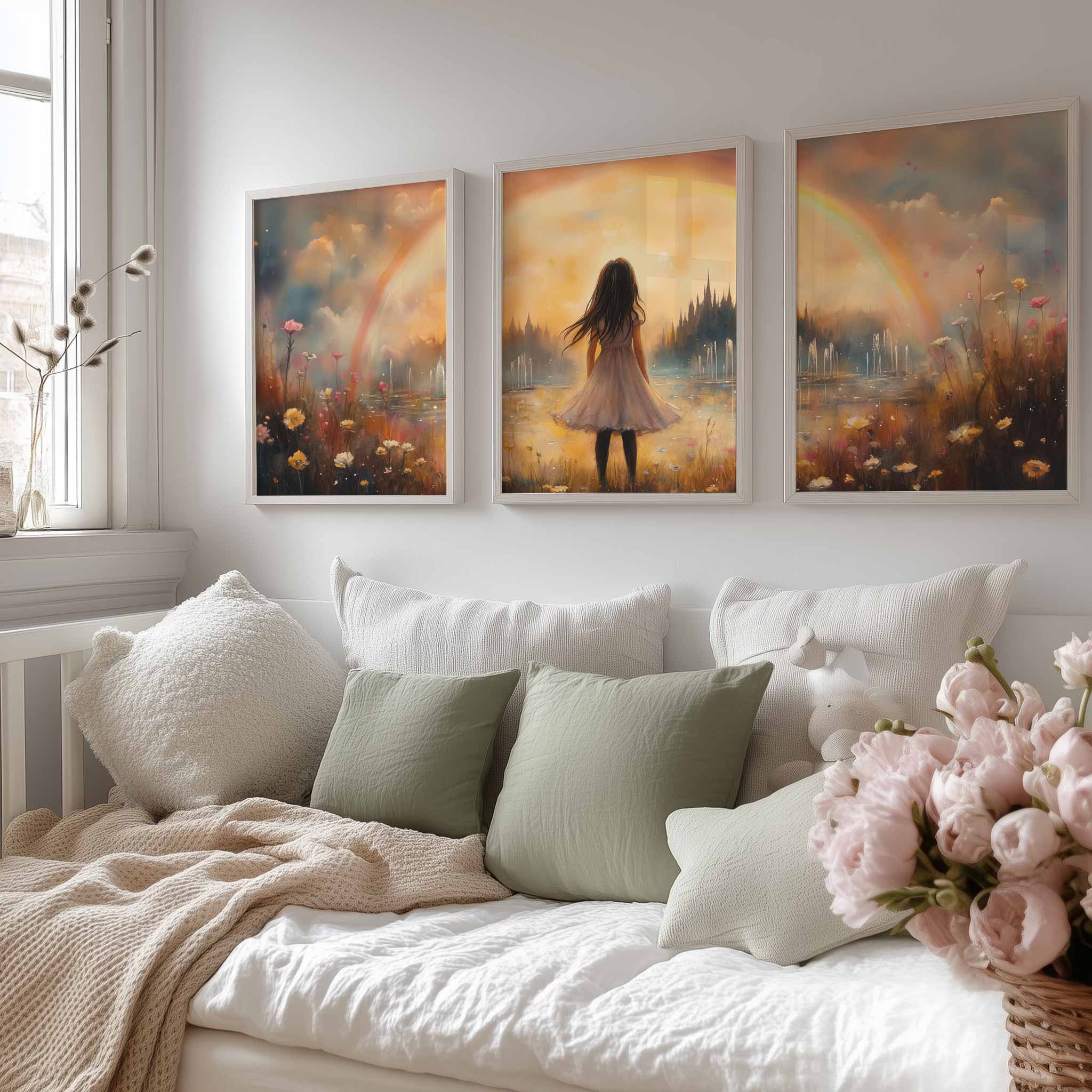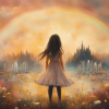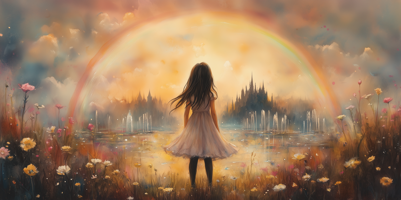 Dromerig Meisje in Bloemenveld met Regenboog