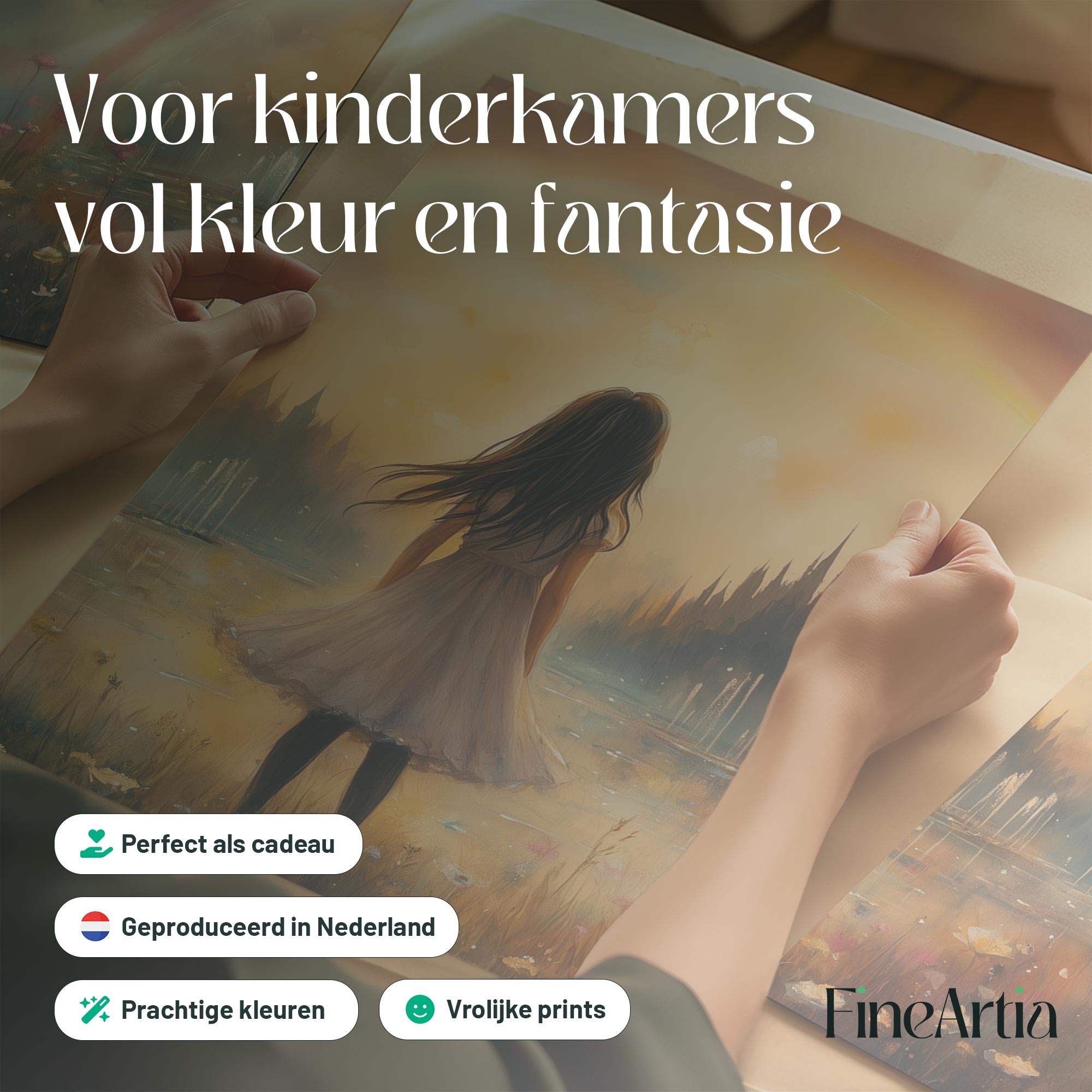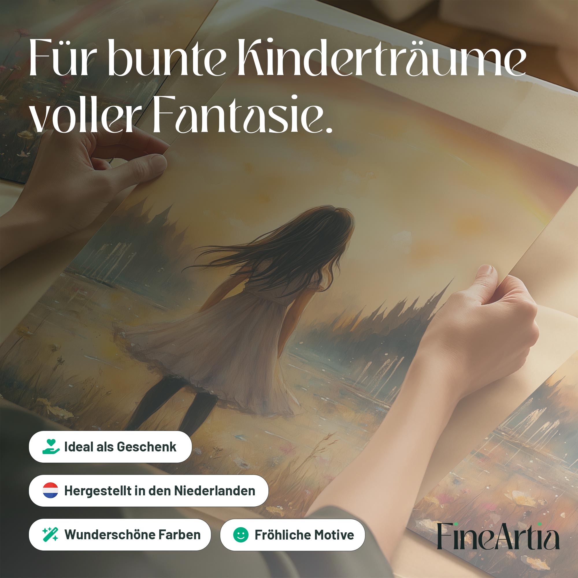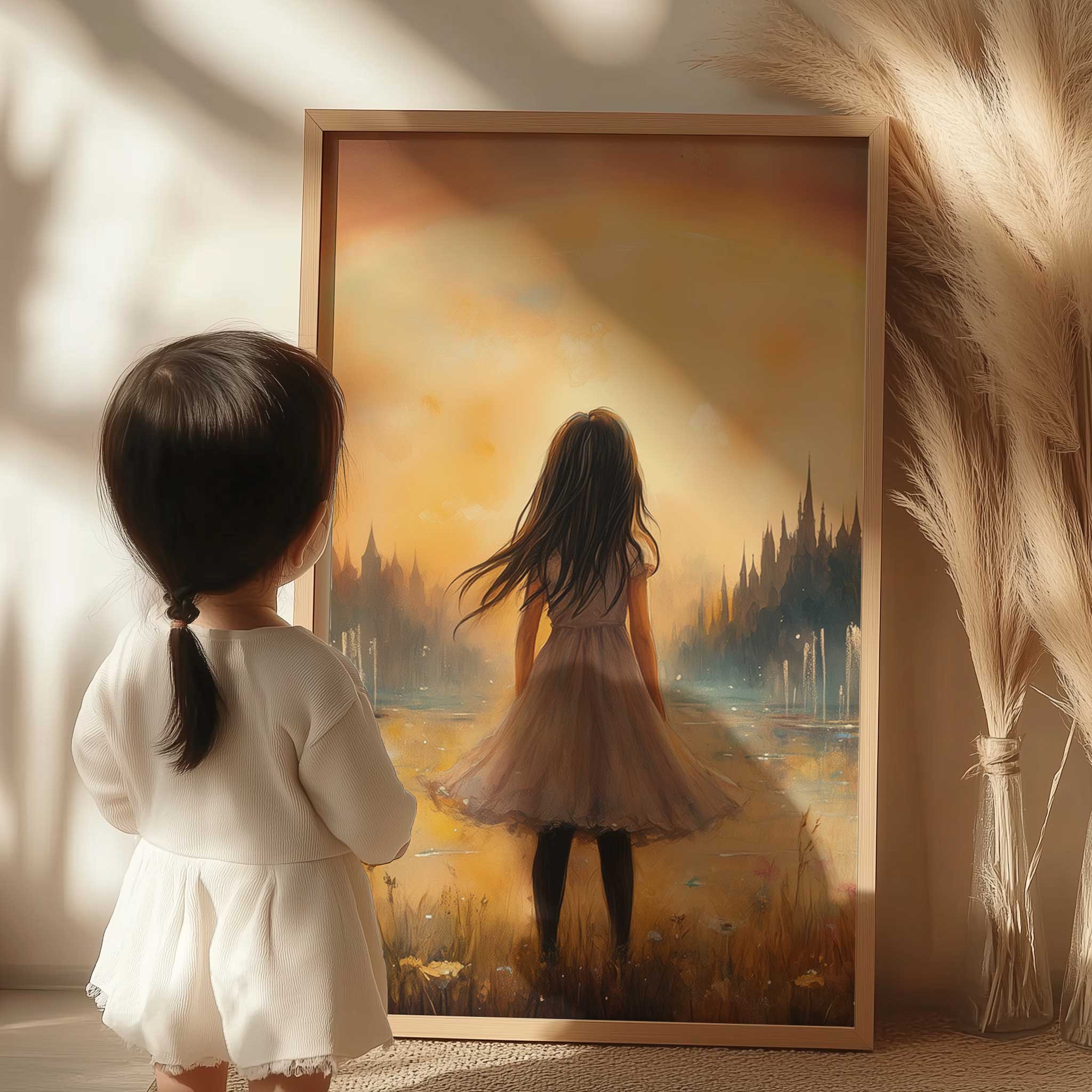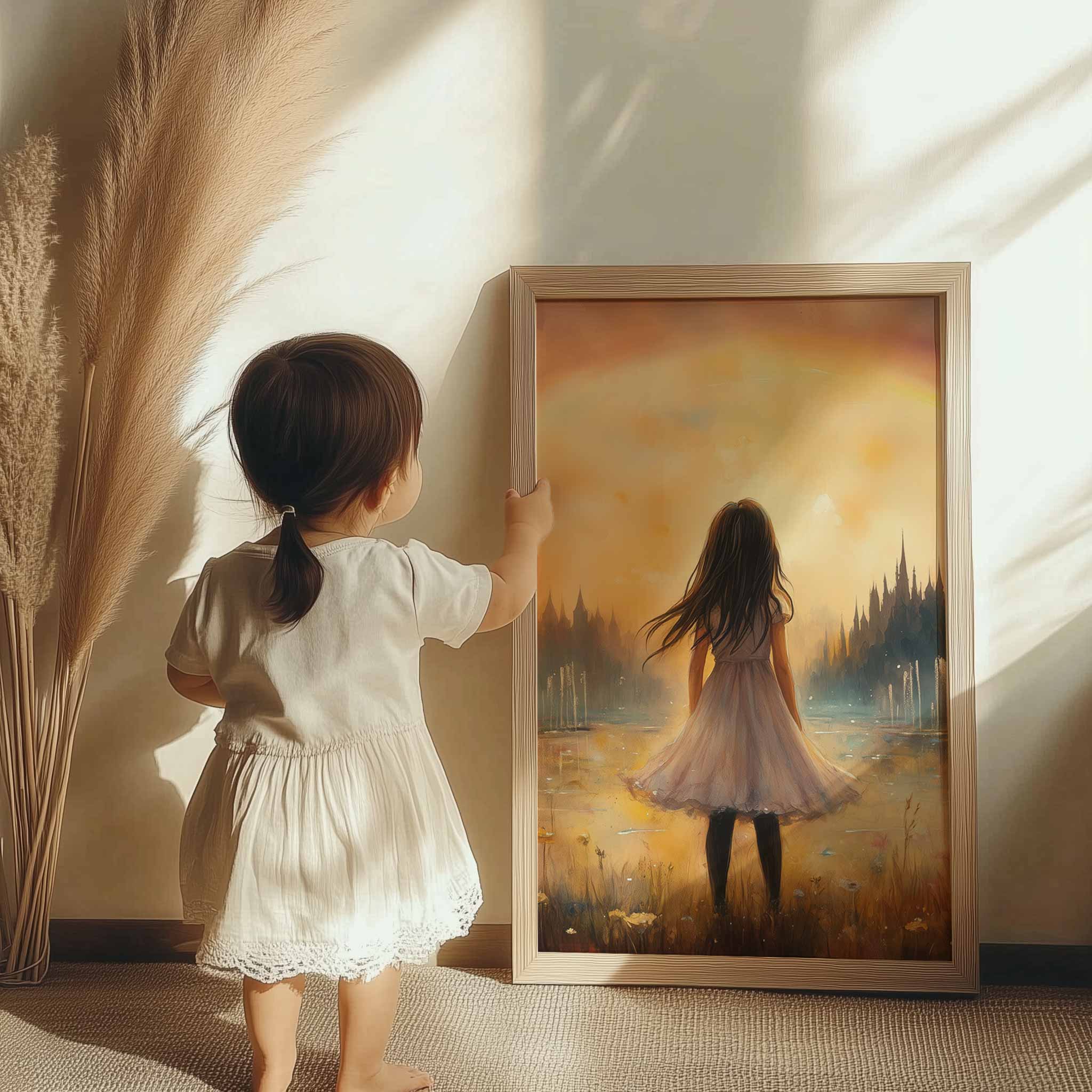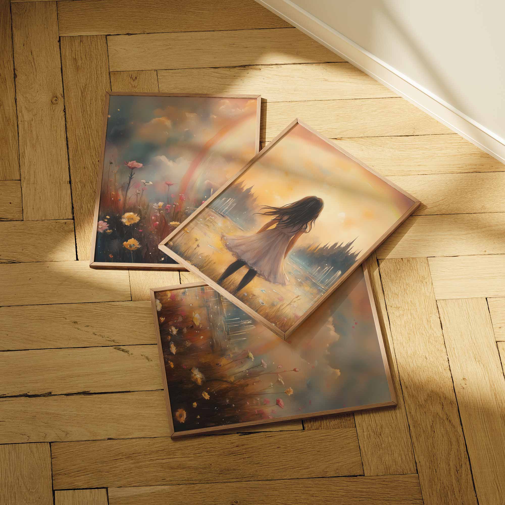 Dromerig Meisje in Bloemenveld met Regenboog
