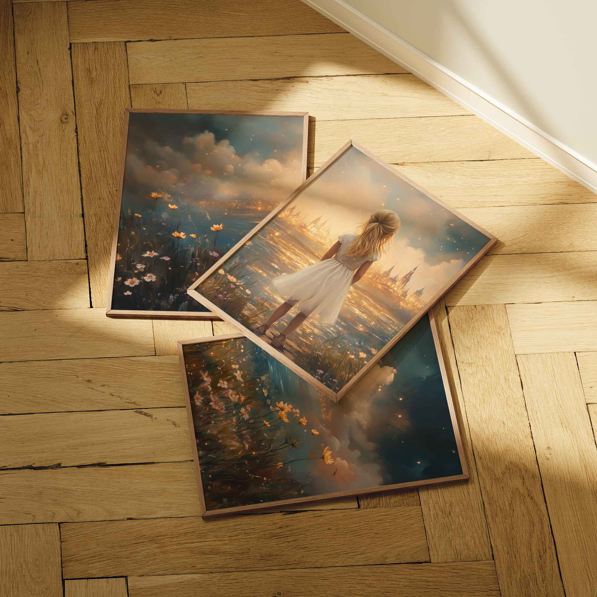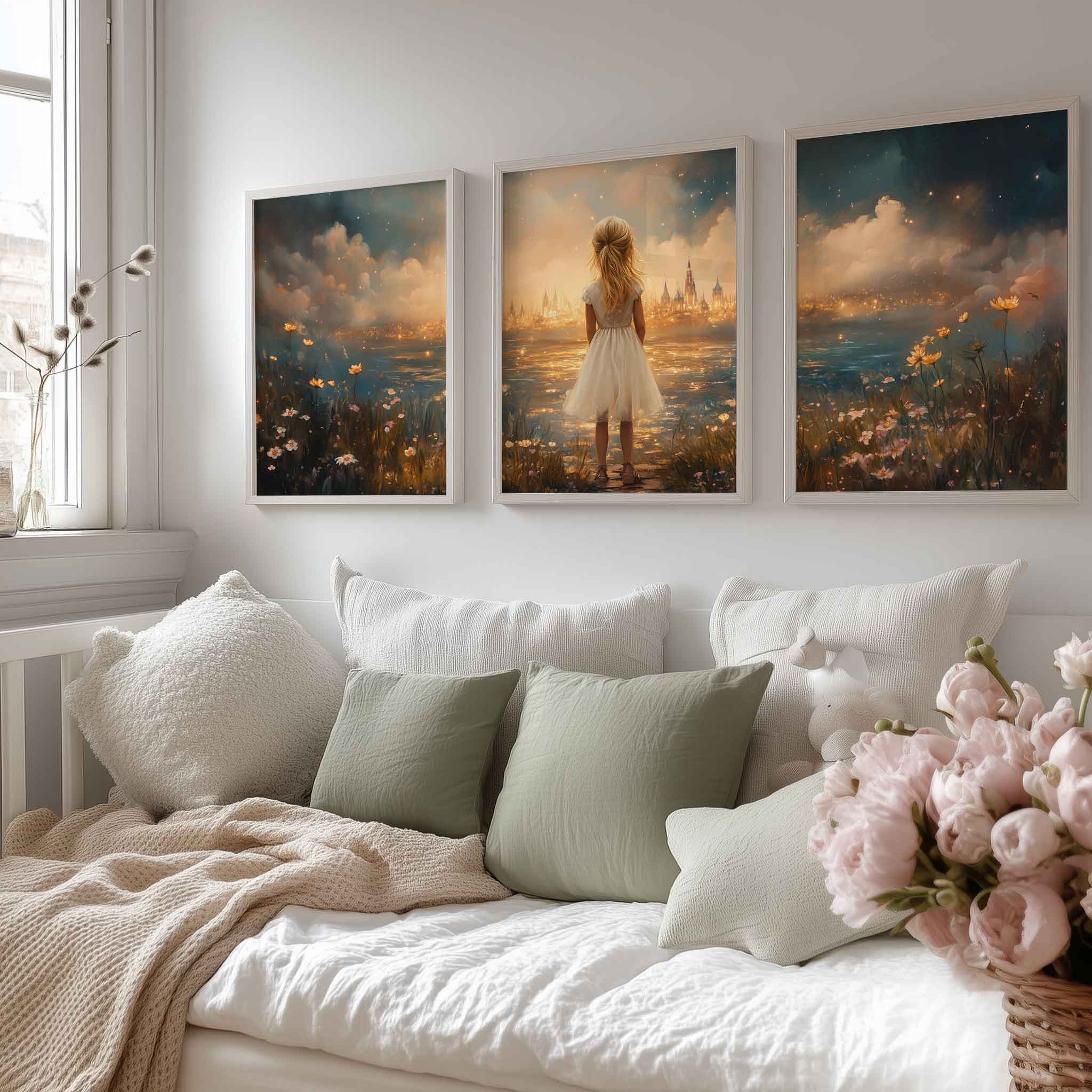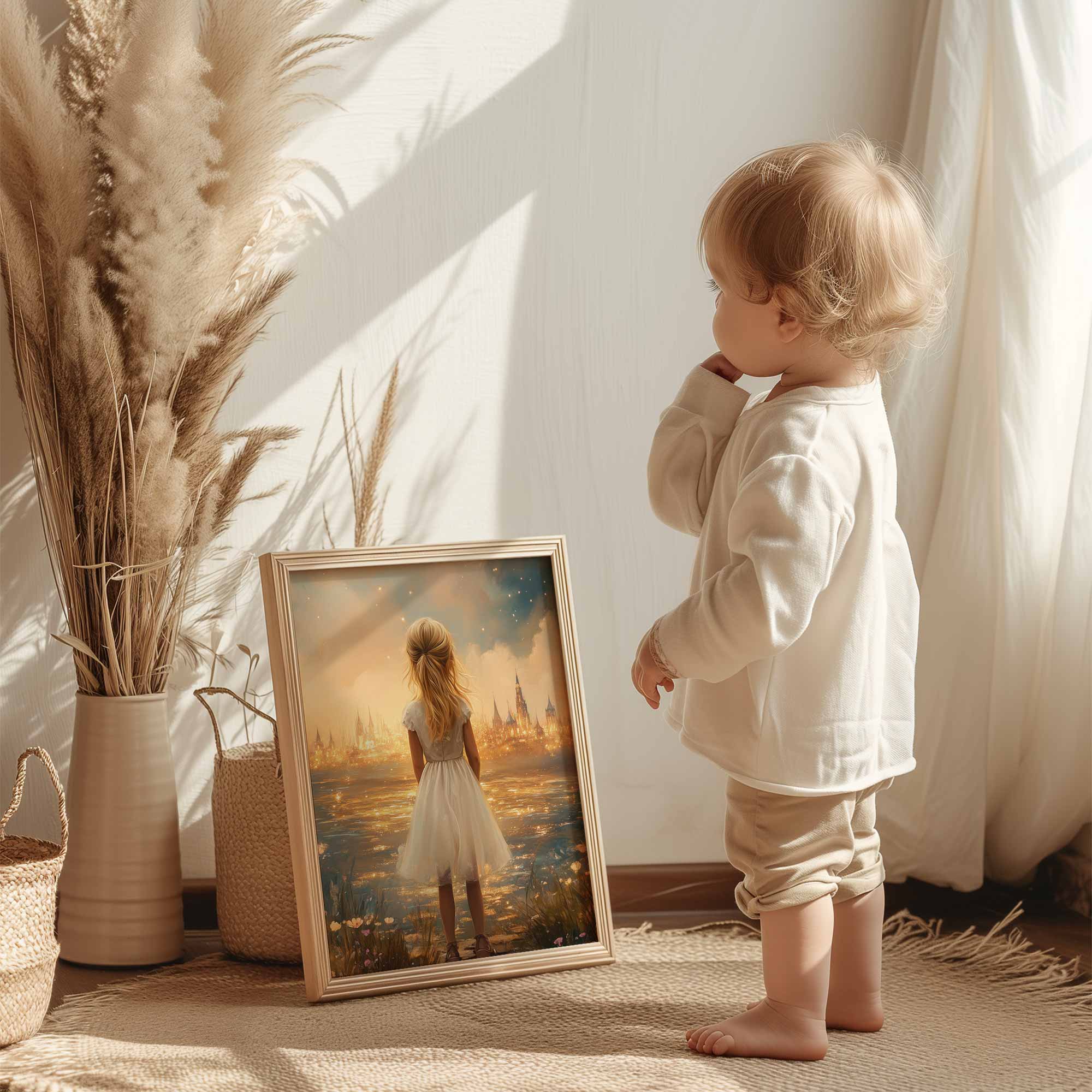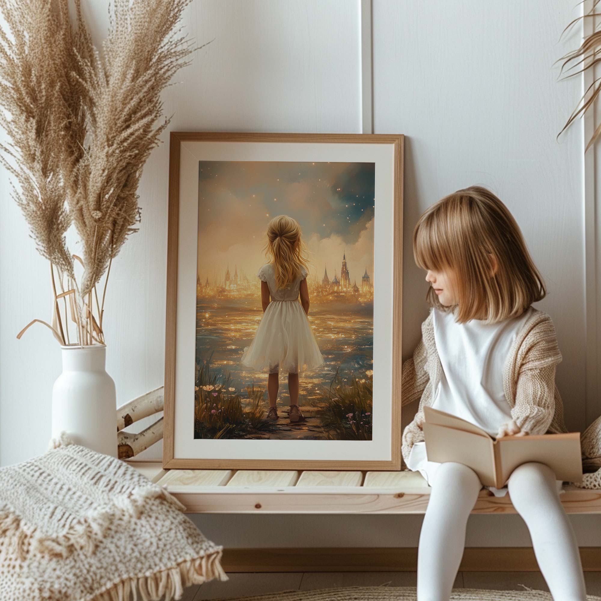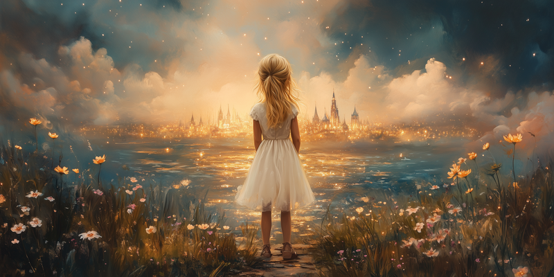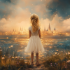 Dromerig Meisje in Bloemenveld met Stad op Achtergrond