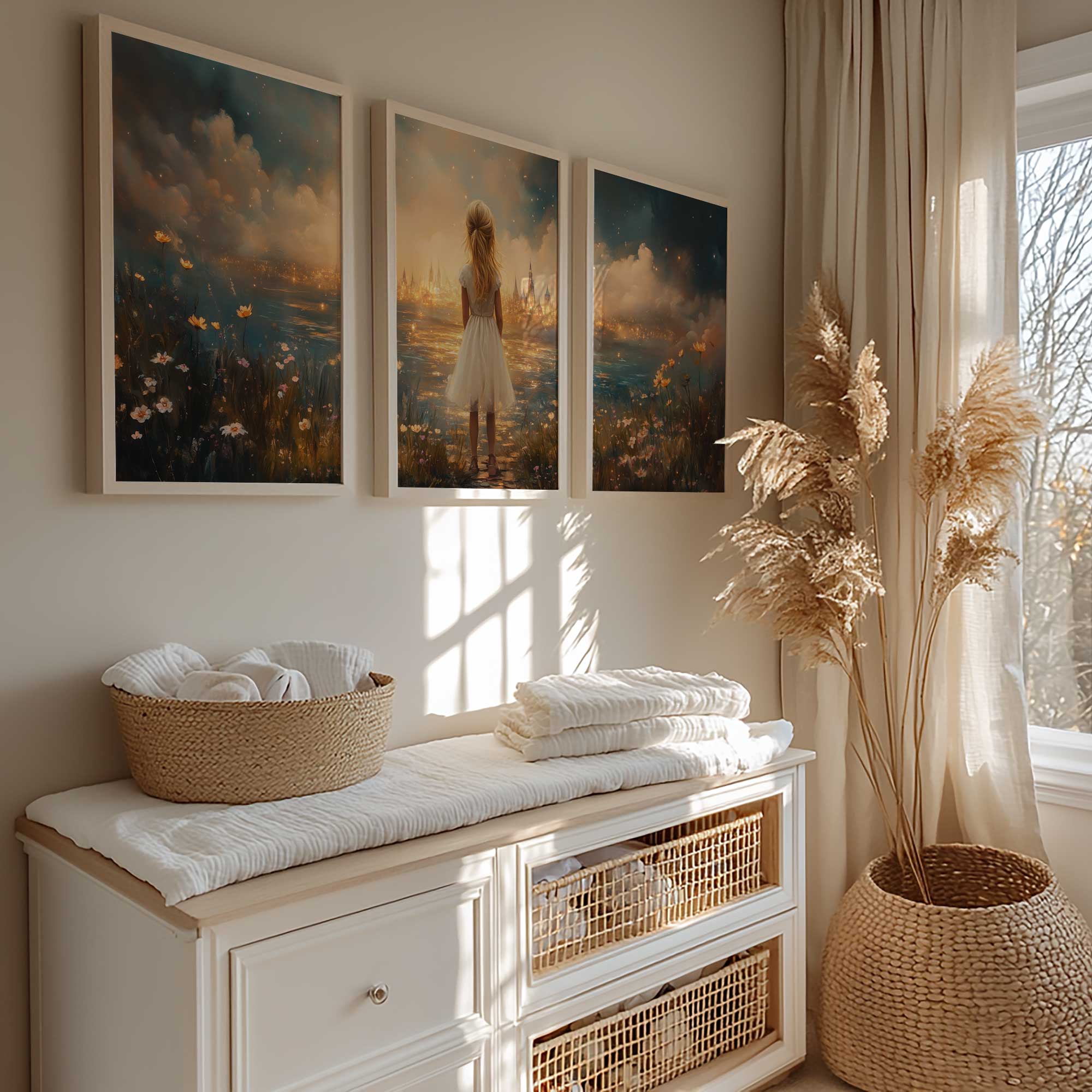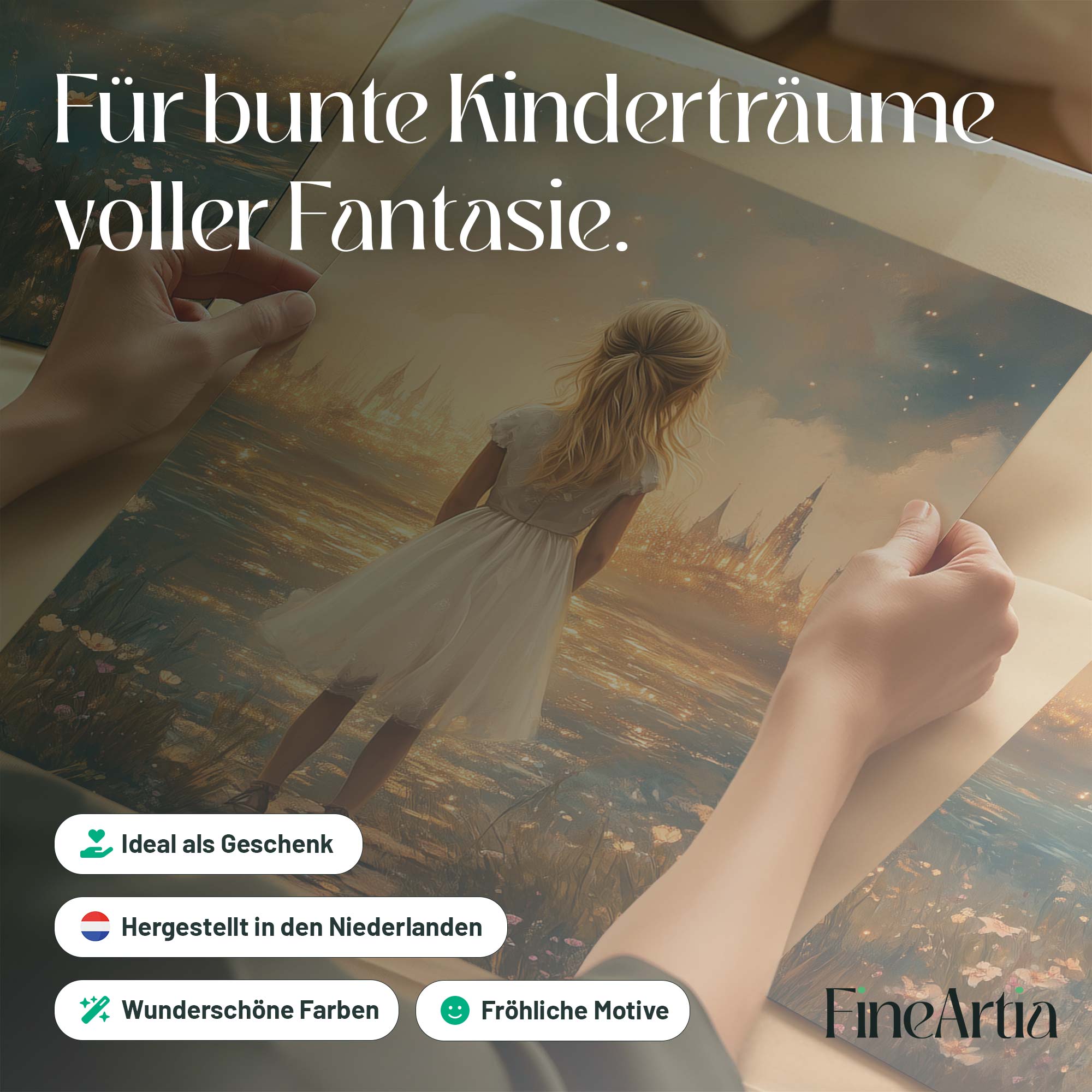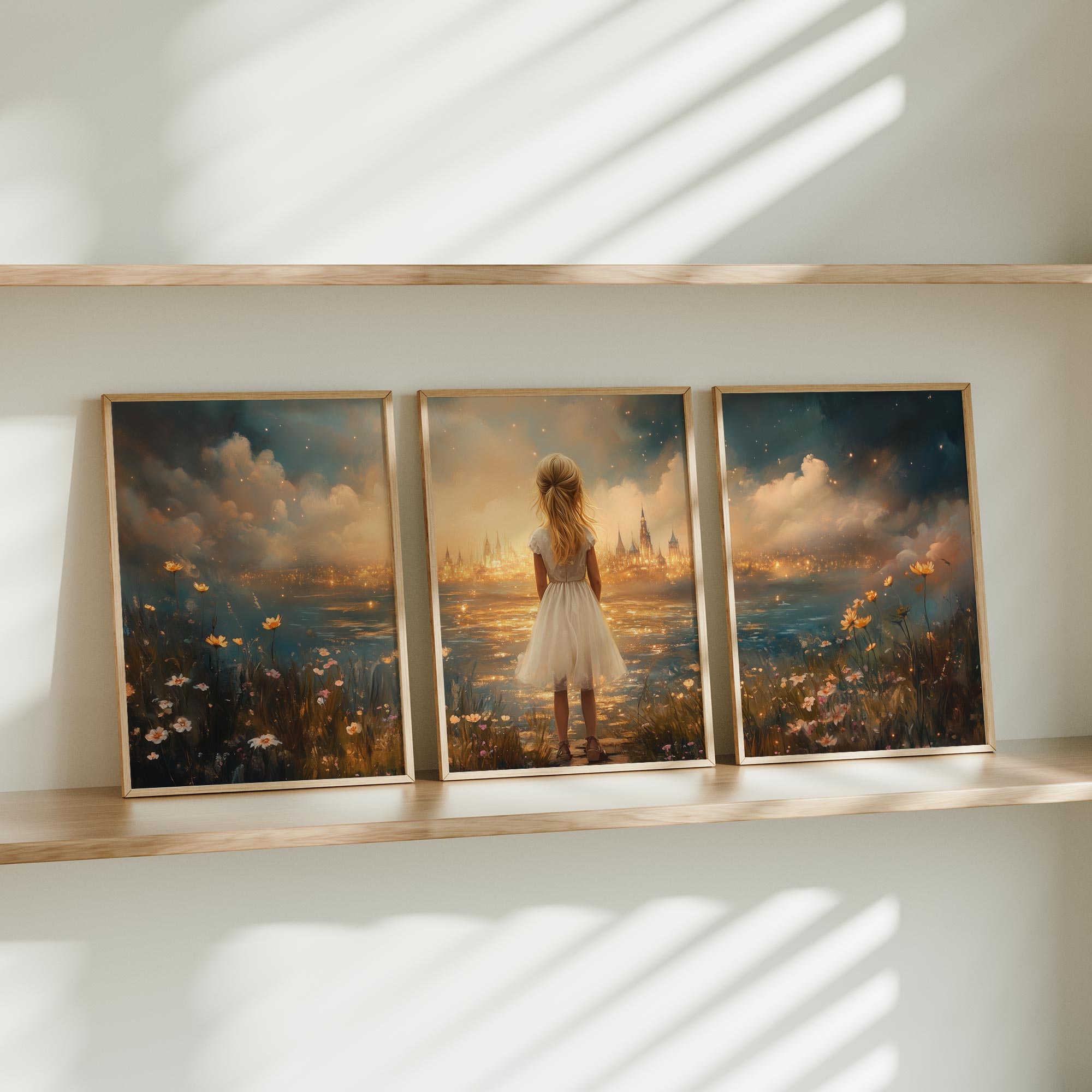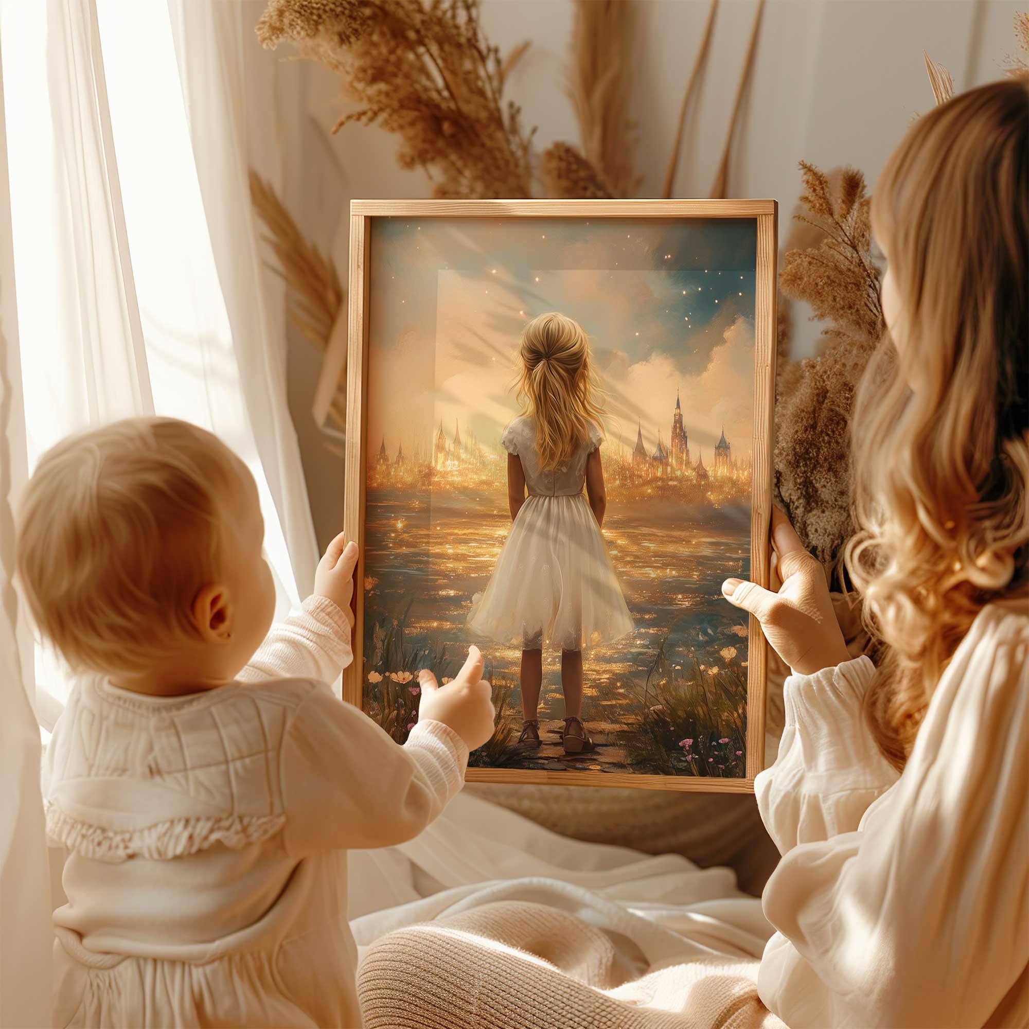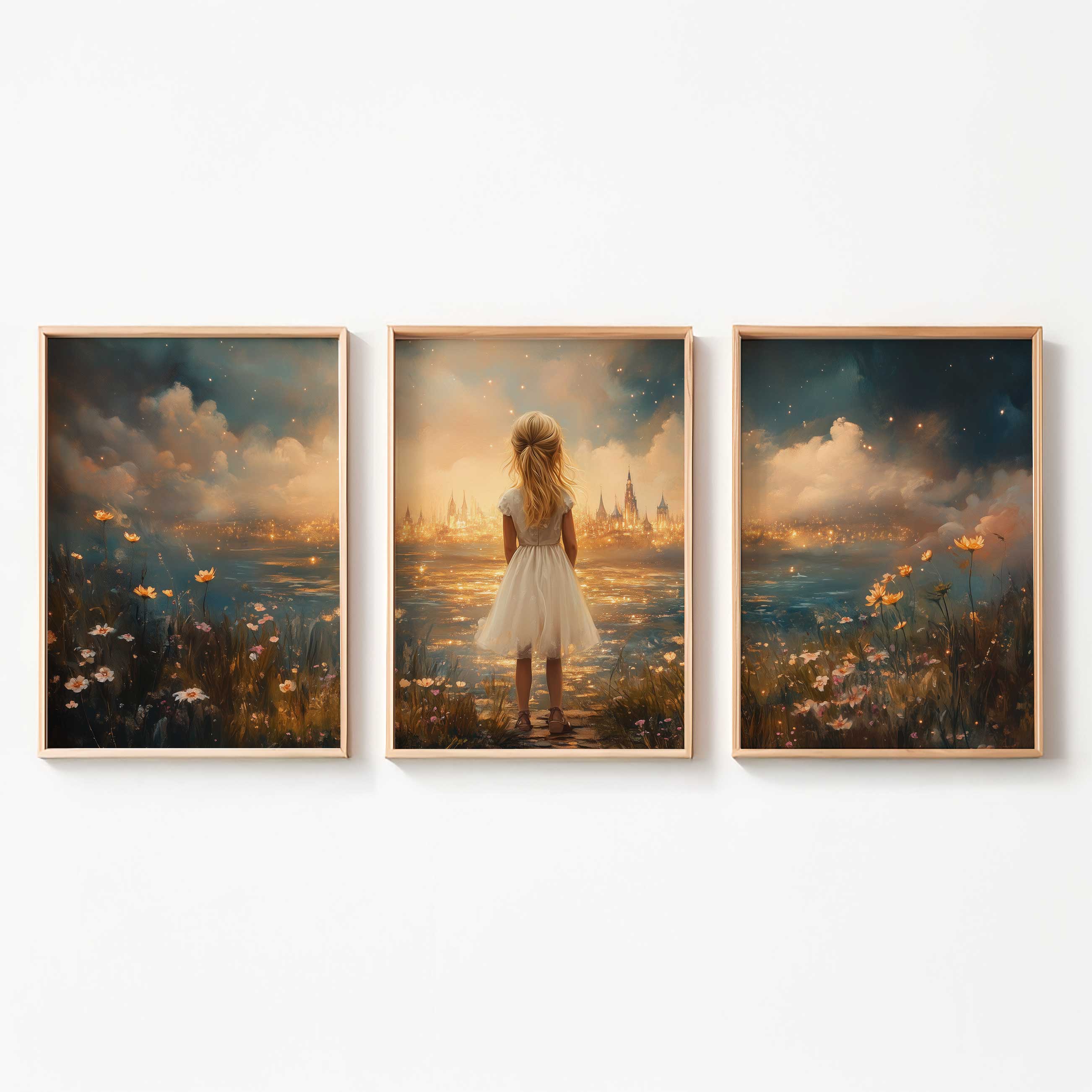 Dromerig Meisje in Bloemenveld met Stad op Achtergrond