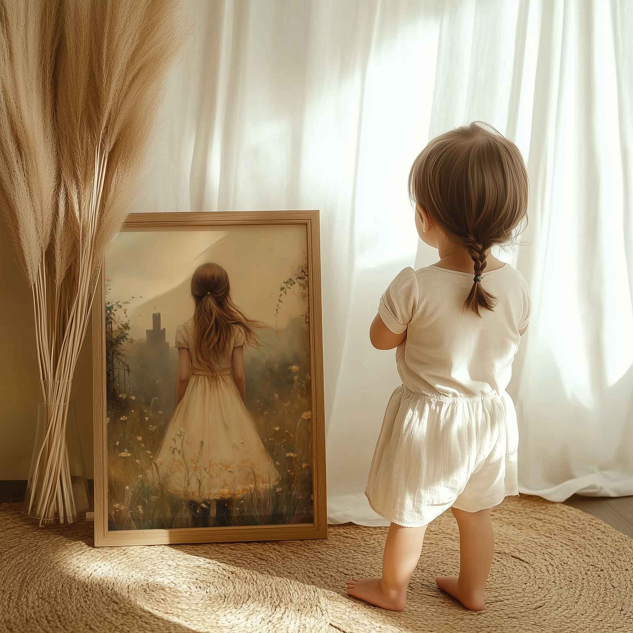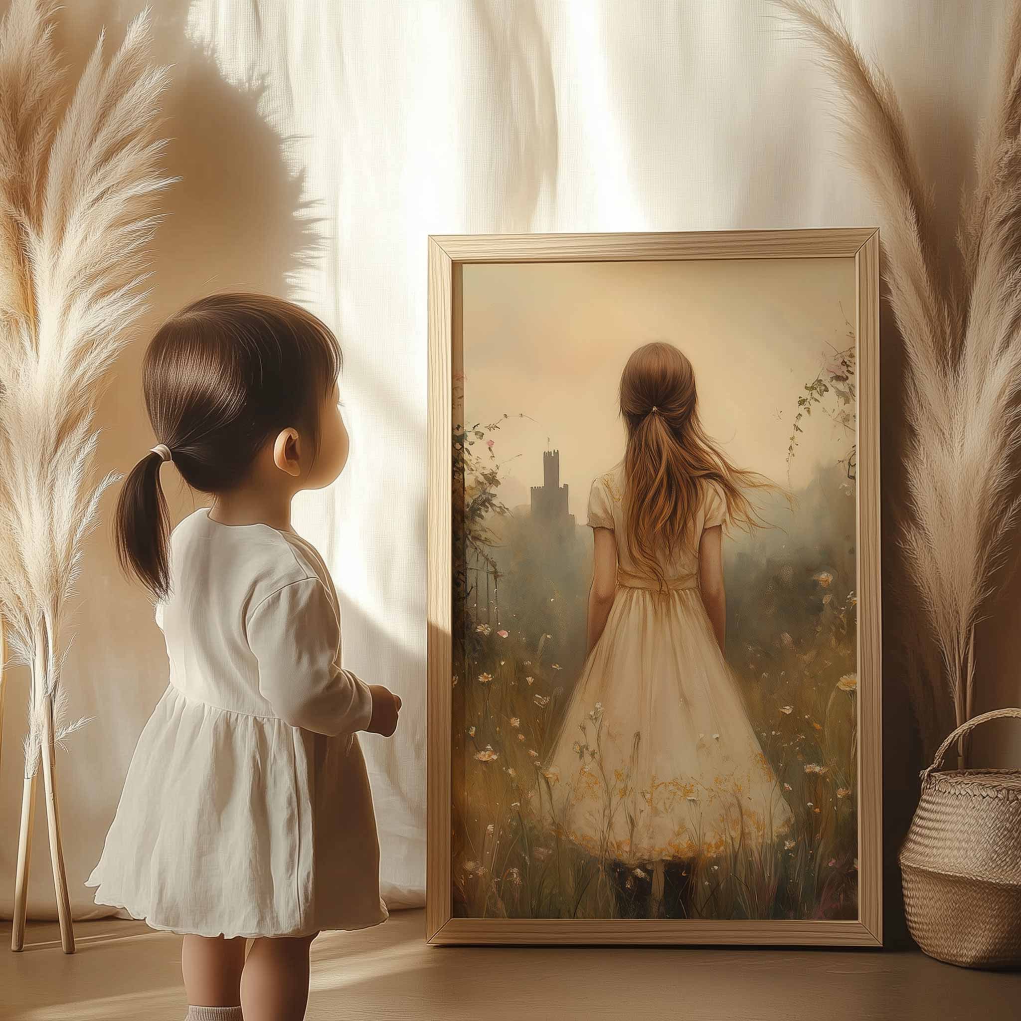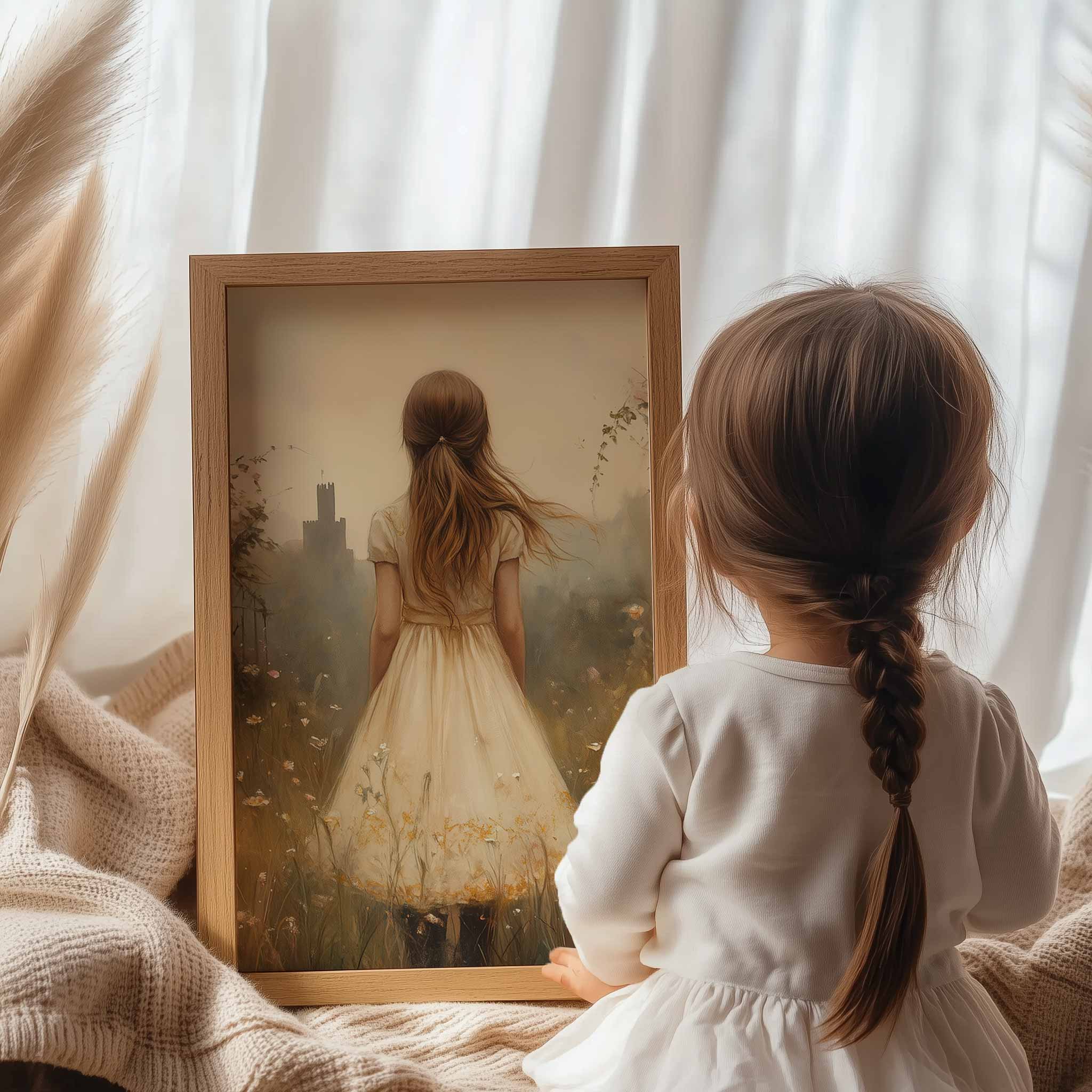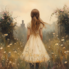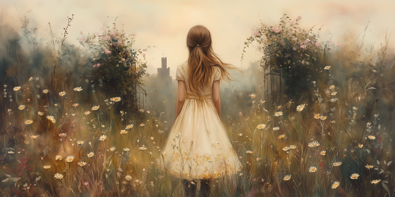 Dromerig Meisje in Bloemenveld met Stad op Achtergrond