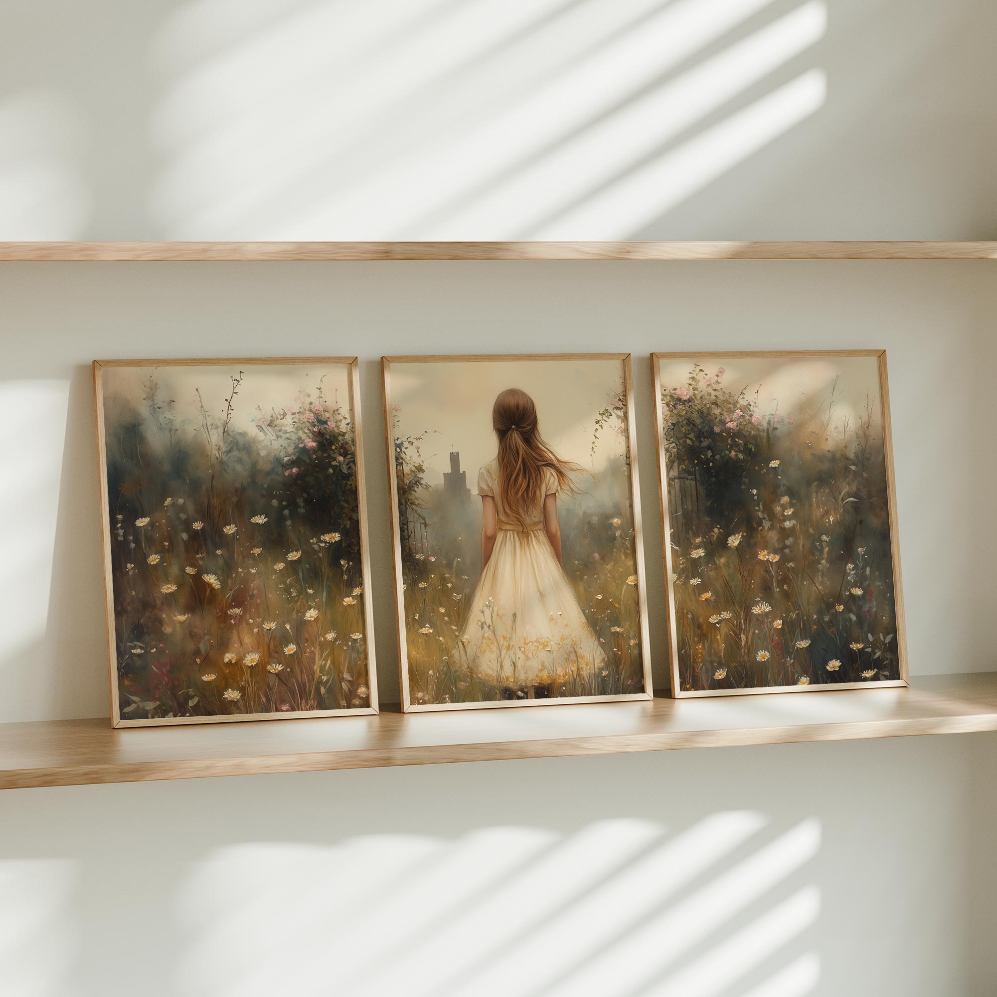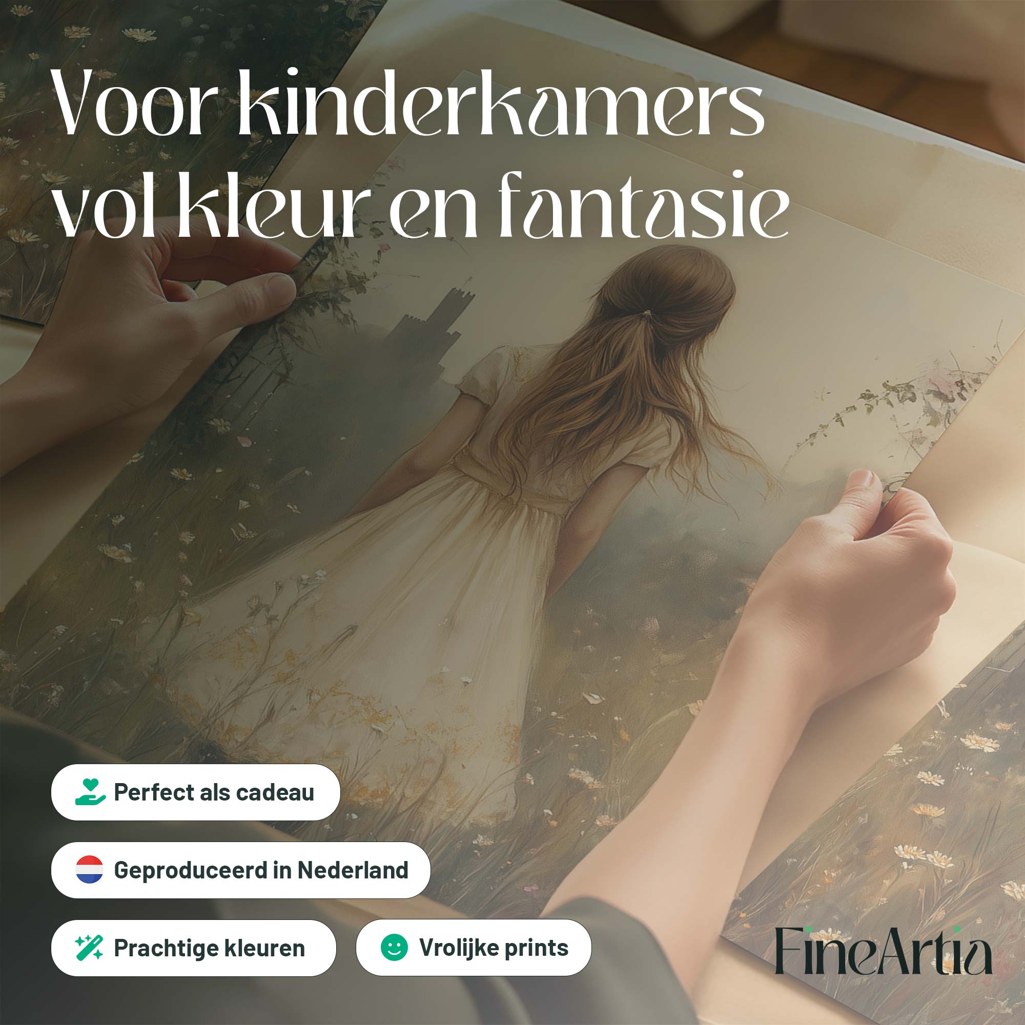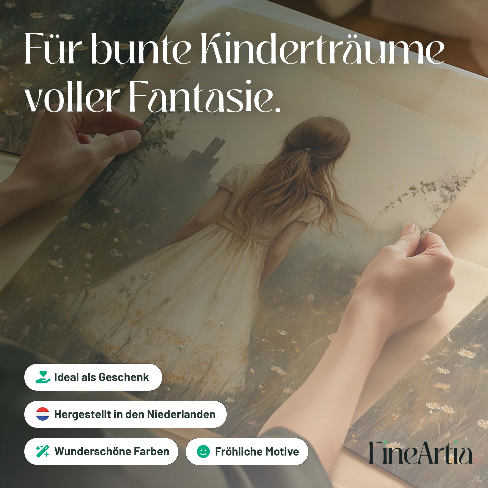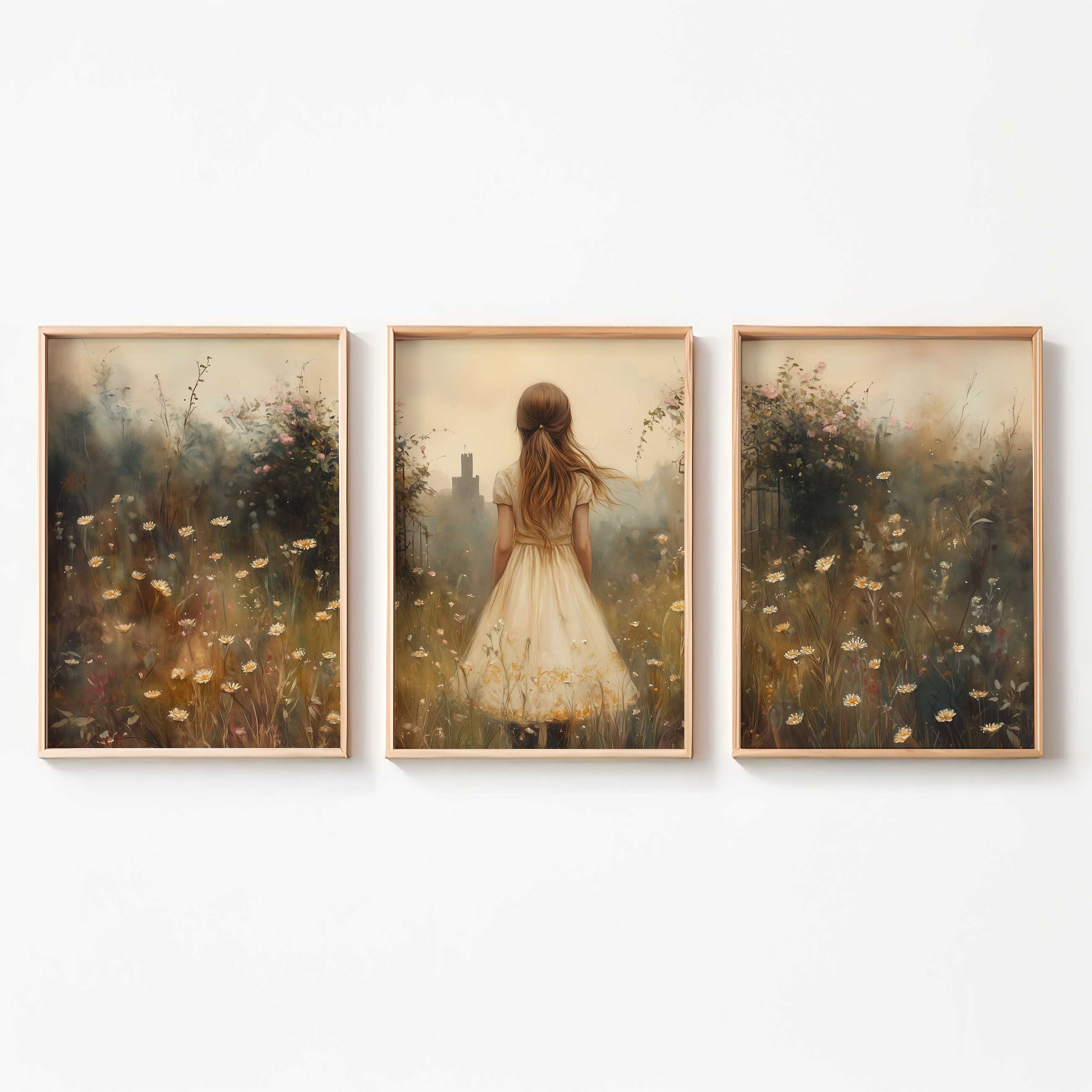 Dromerig Meisje in Bloemenveld met Stad op Achtergrond