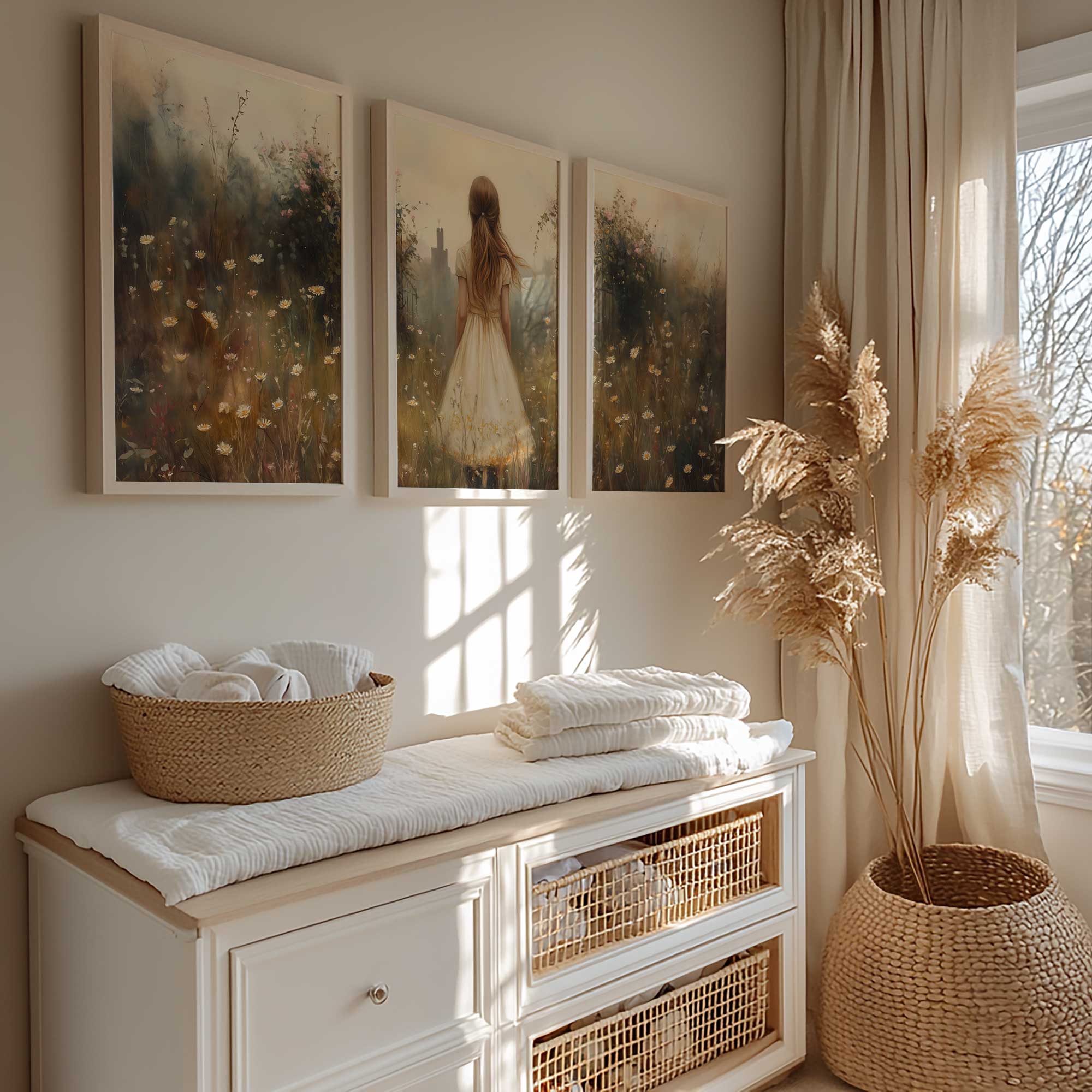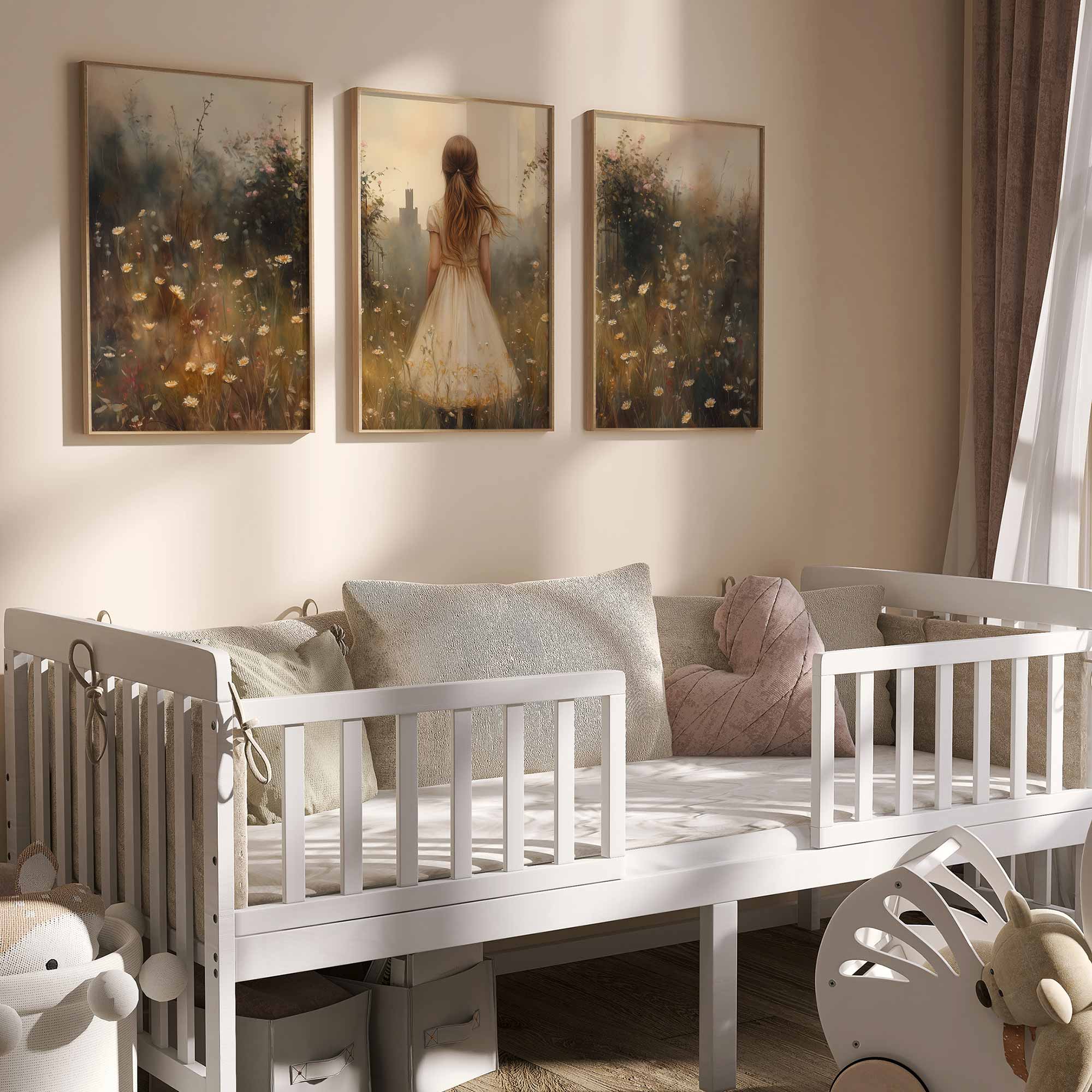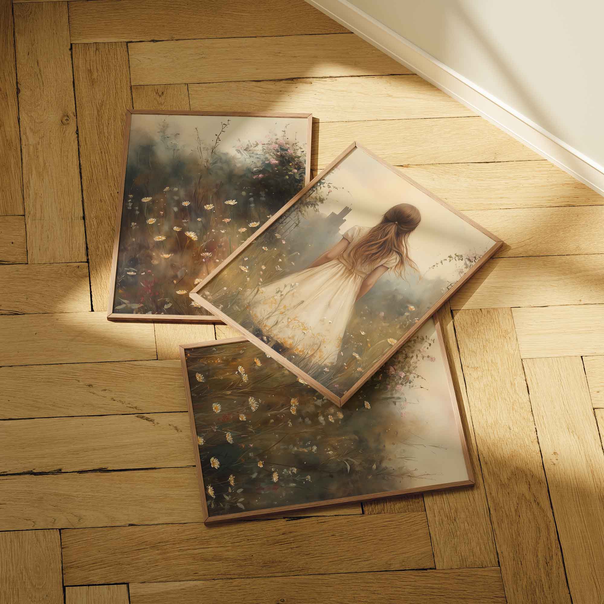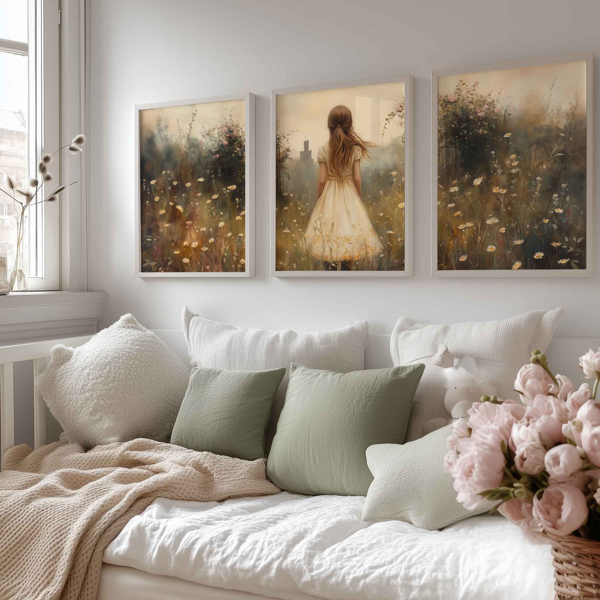 Dromerig Meisje in Bloemenveld met Stad op Achtergrond