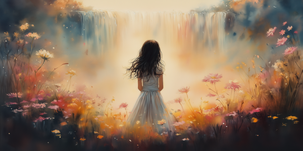 Dromerig Meisje in Bloemenveld met Waterval