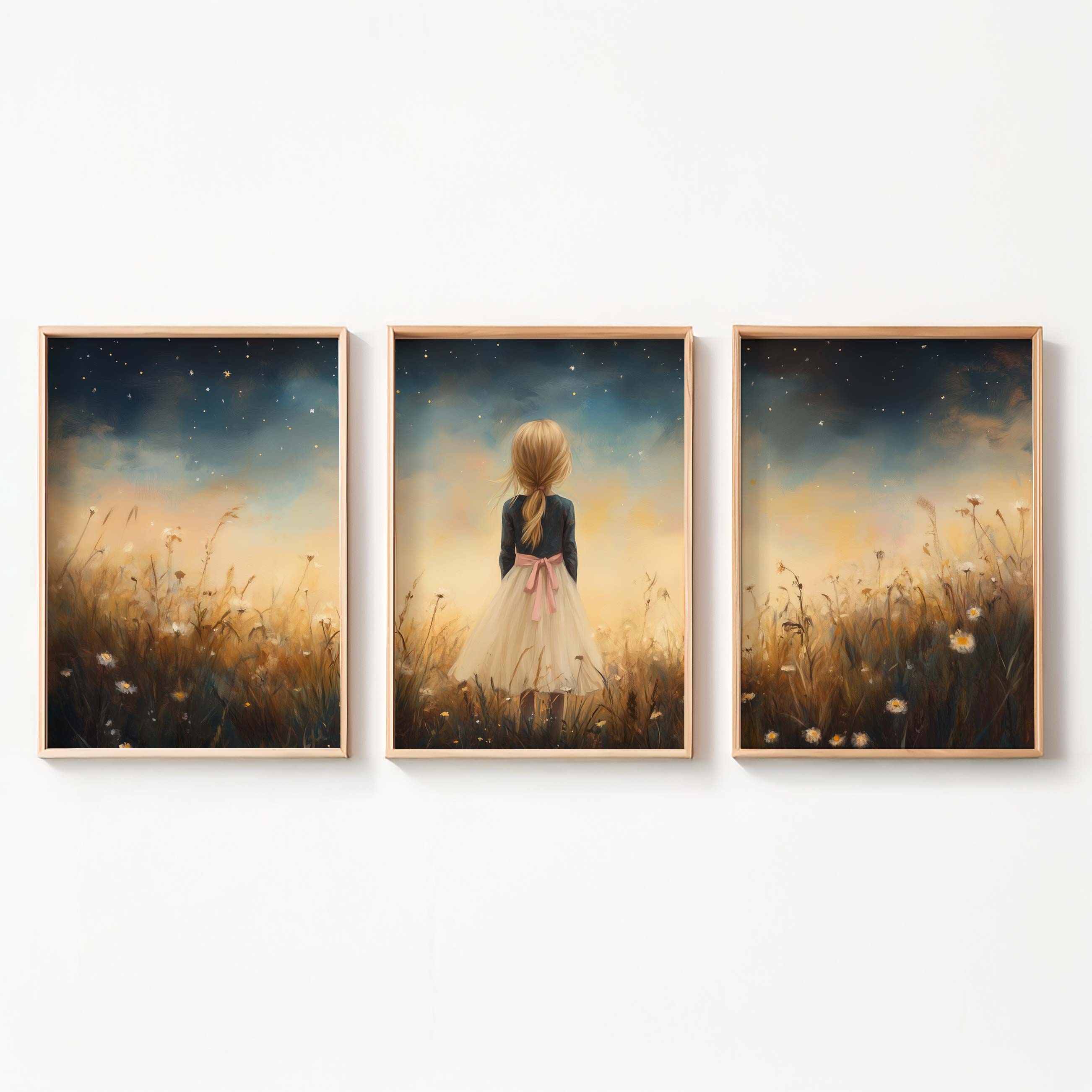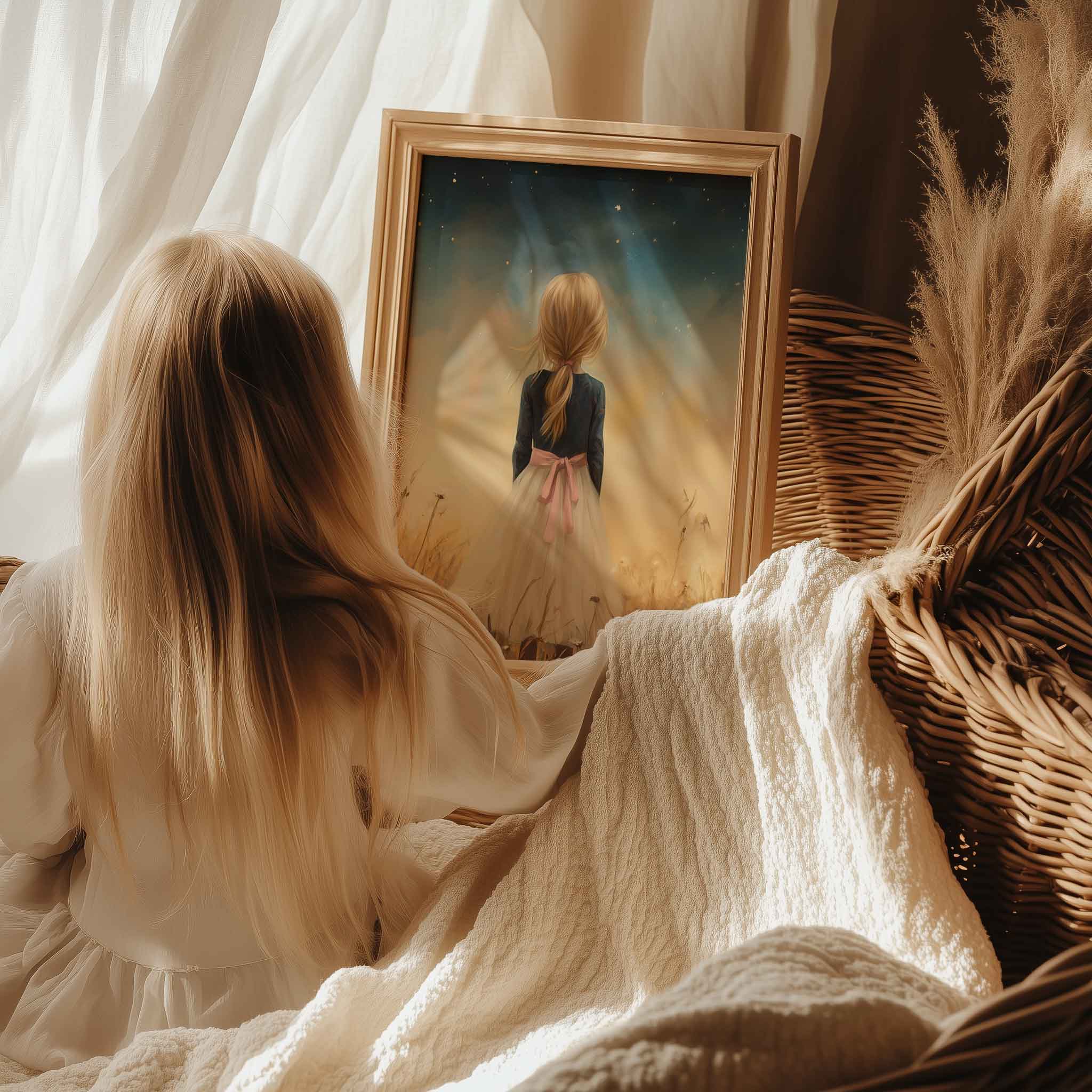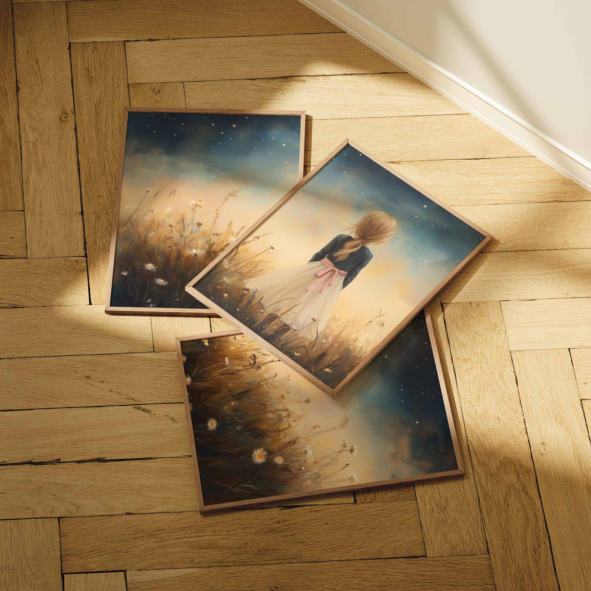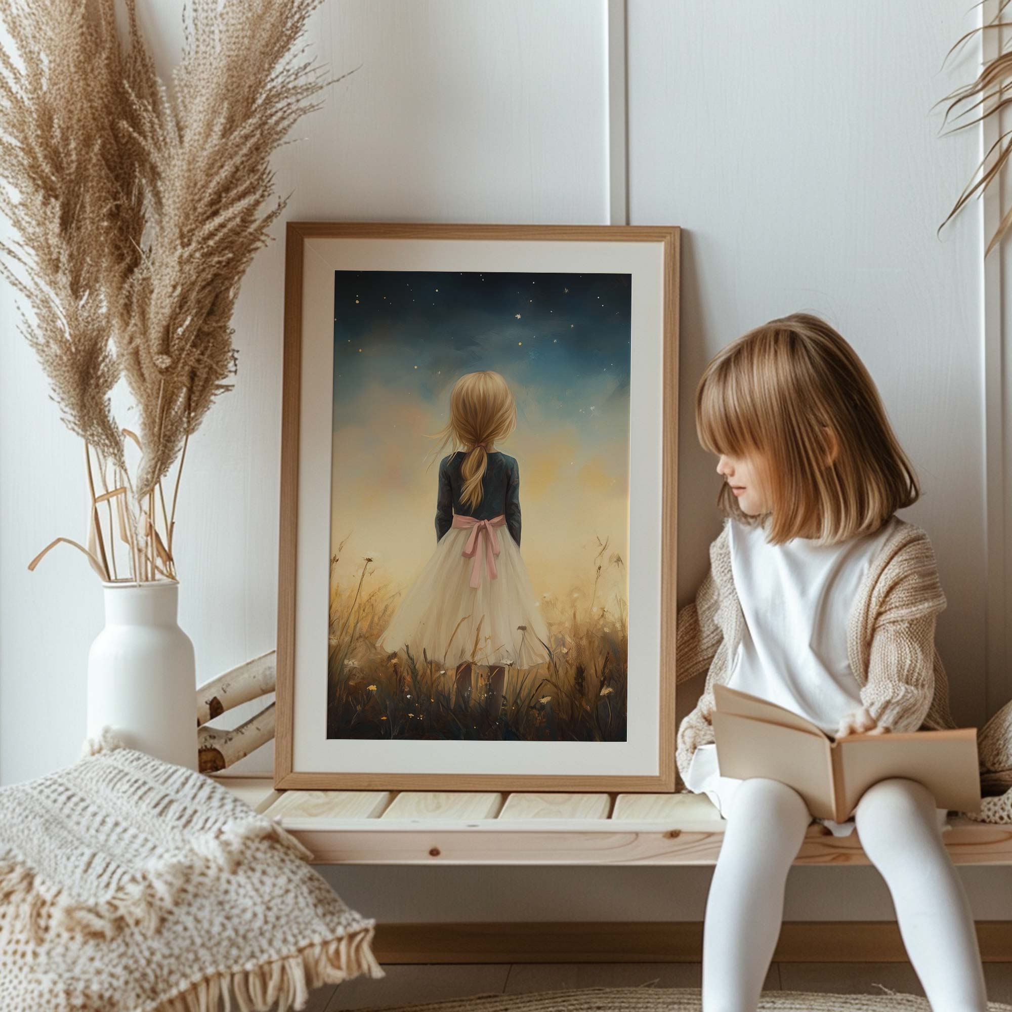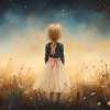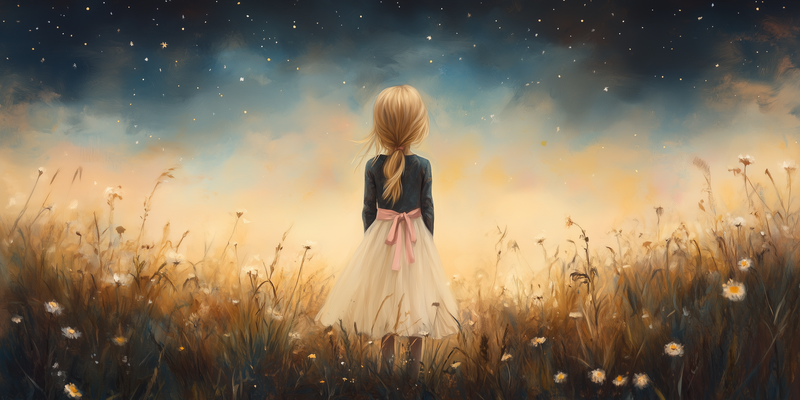 Dromerig Meisje in Bloemenveld onder Sterrenhemel