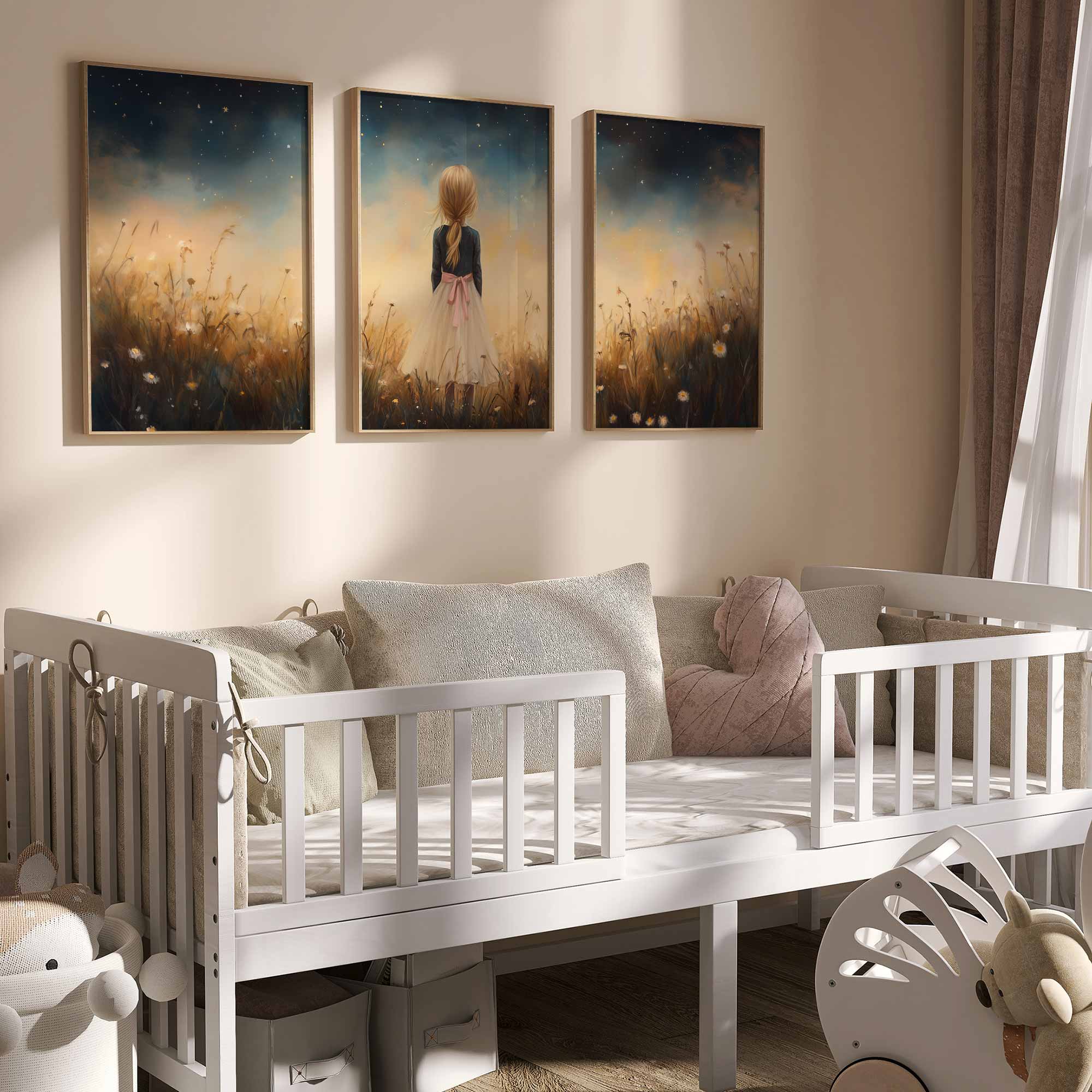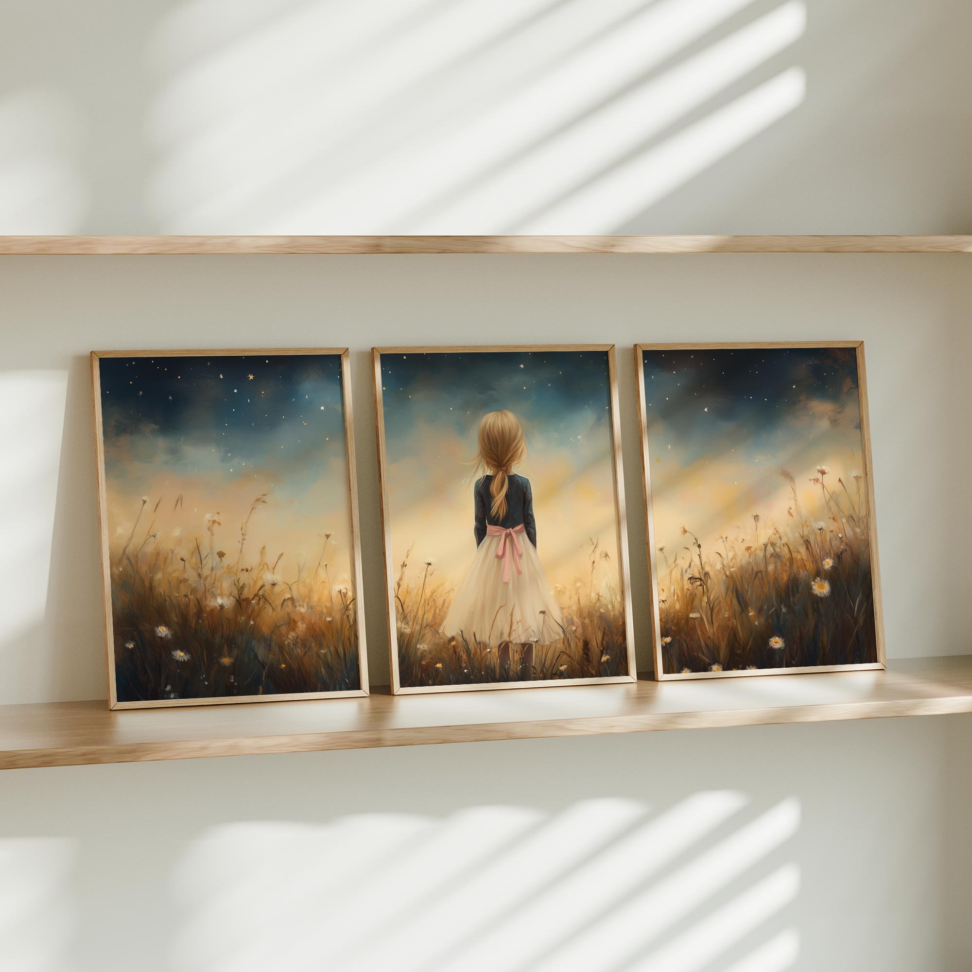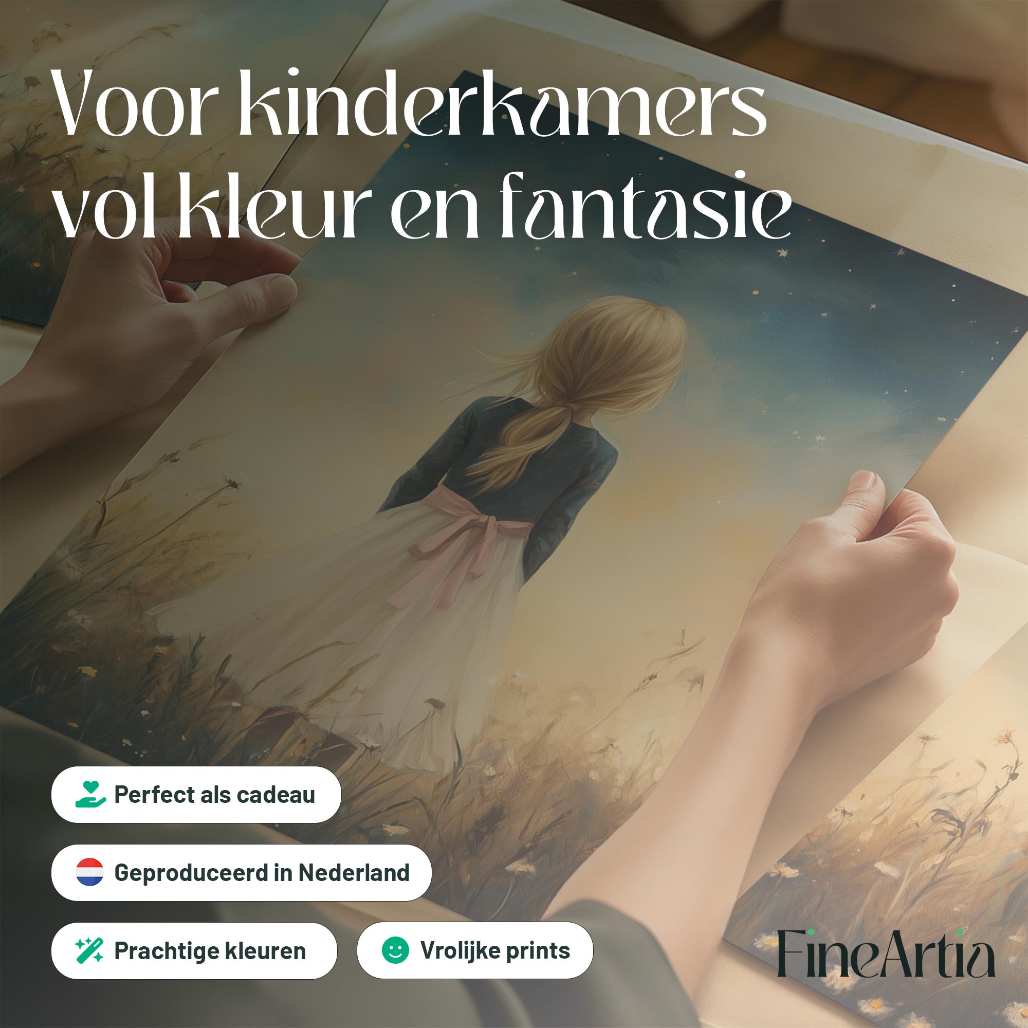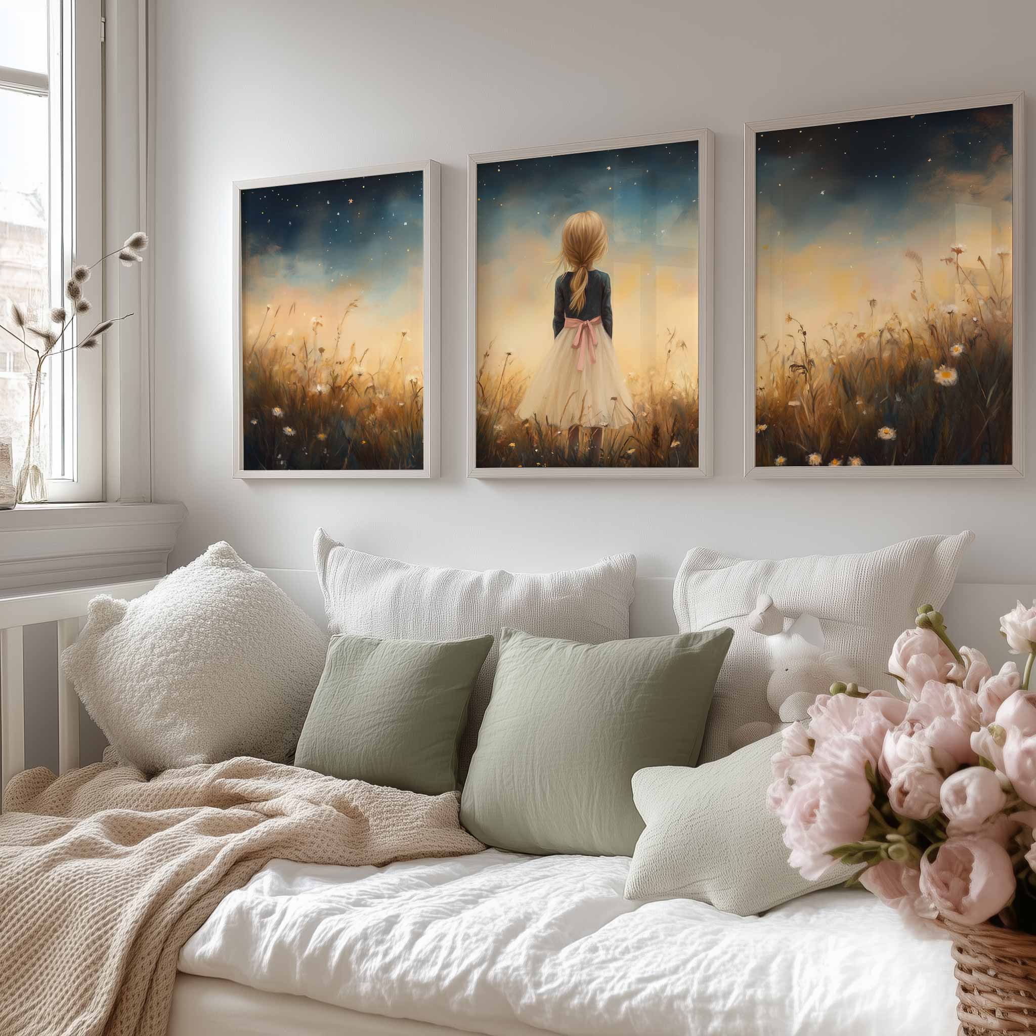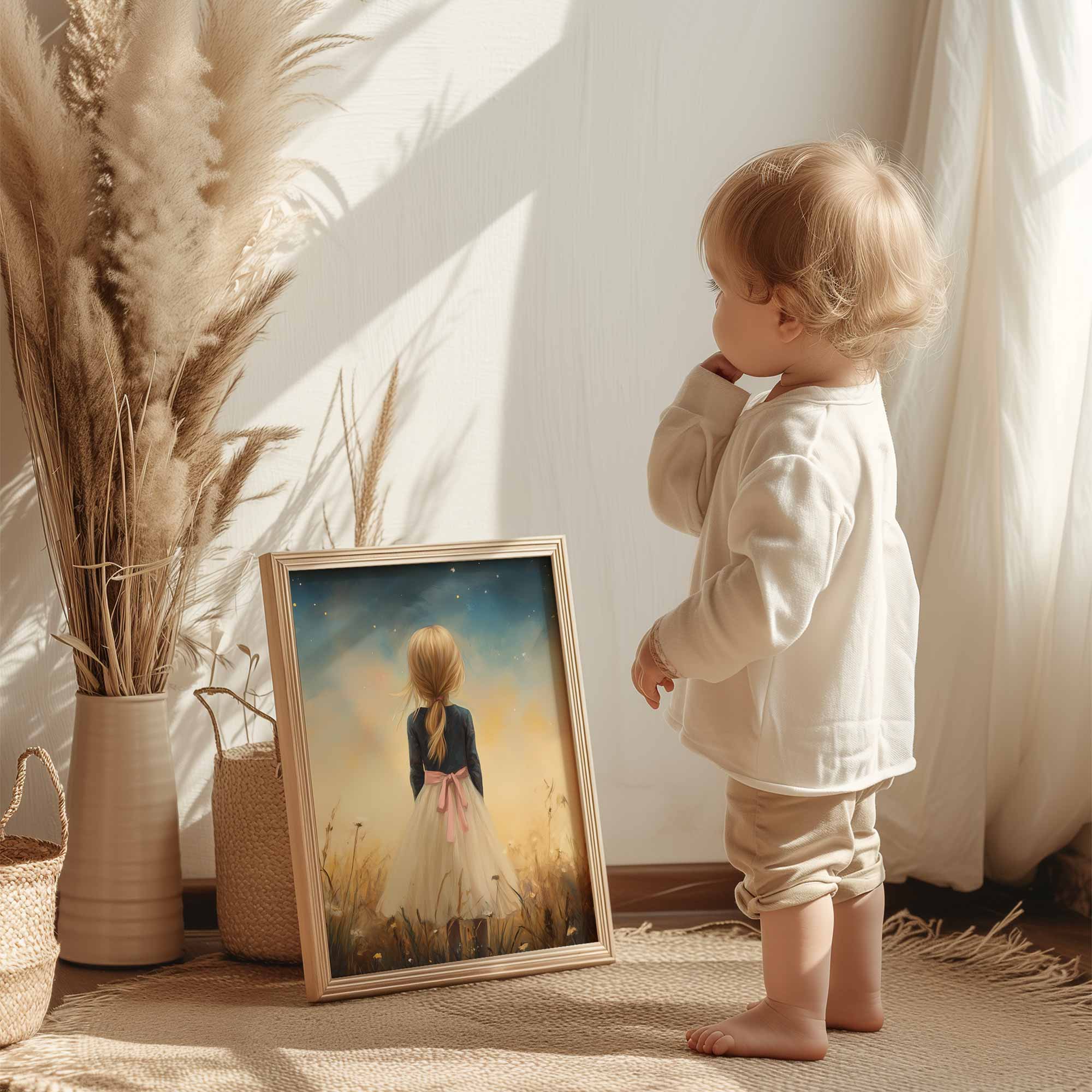 Dromerig Meisje in Bloemenveld onder Sterrenhemel