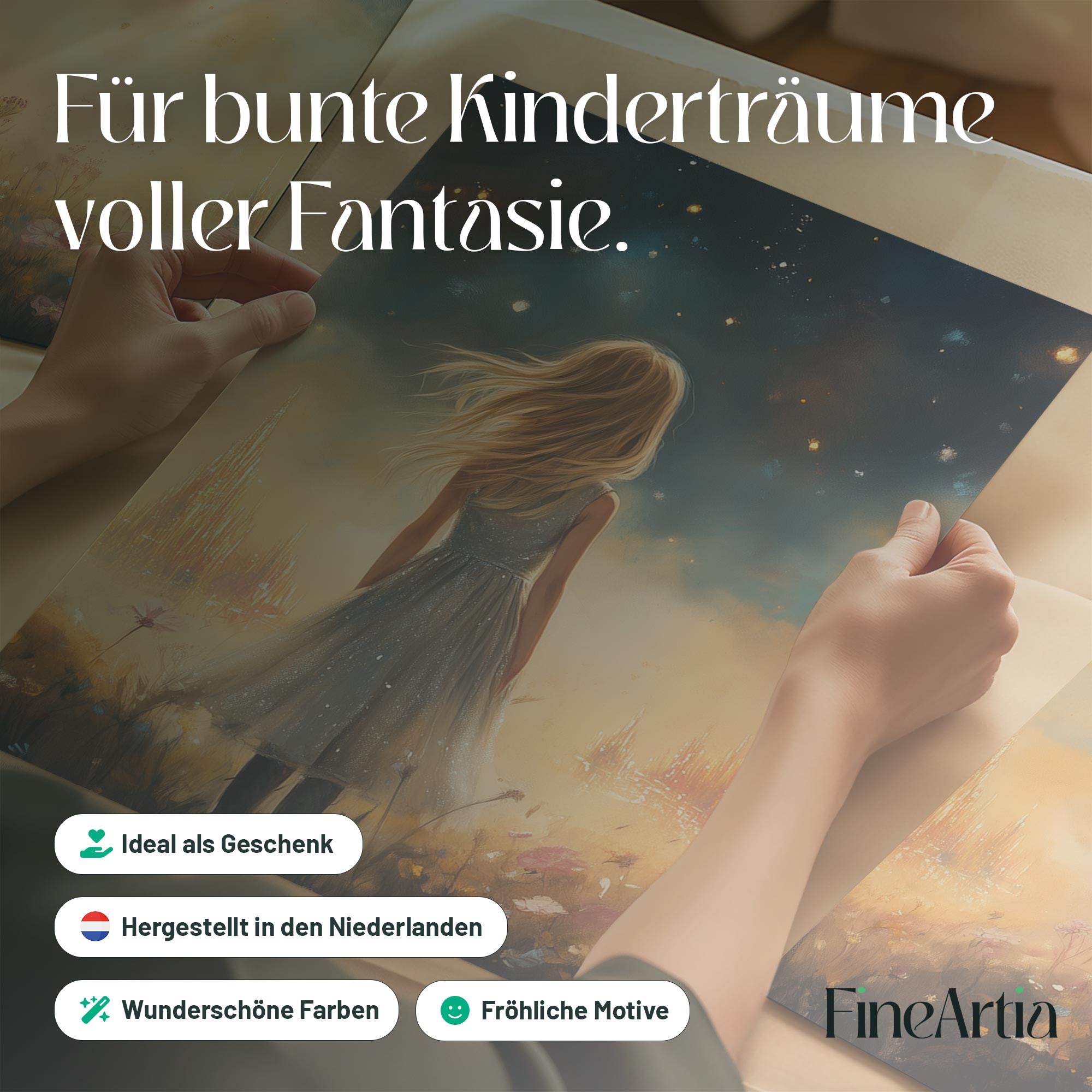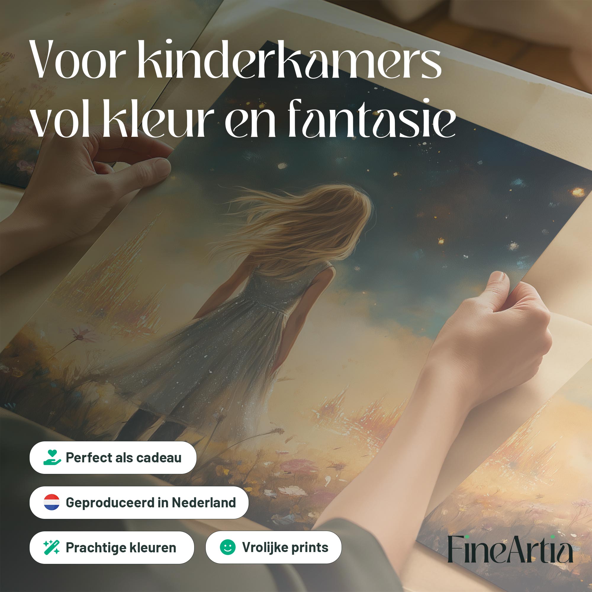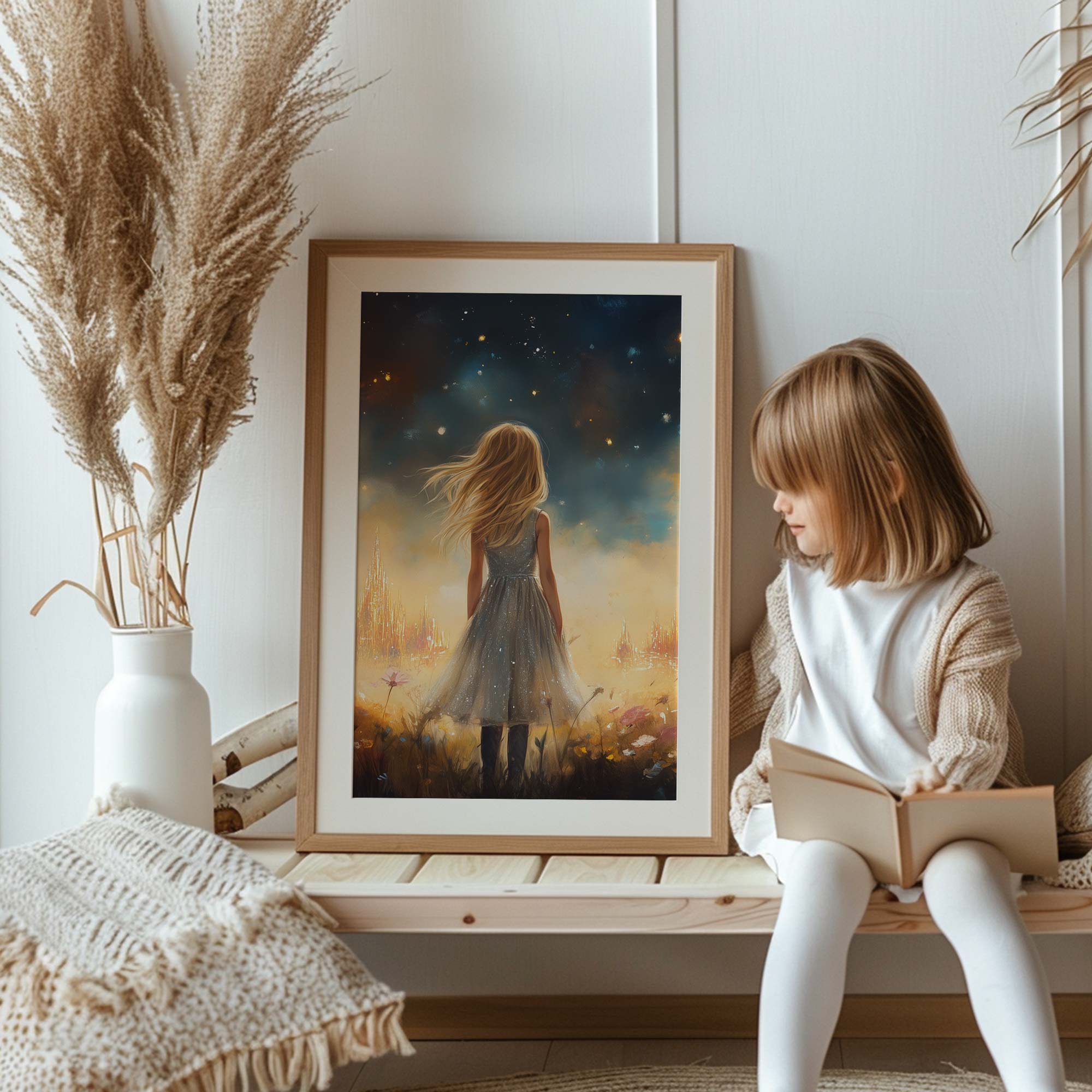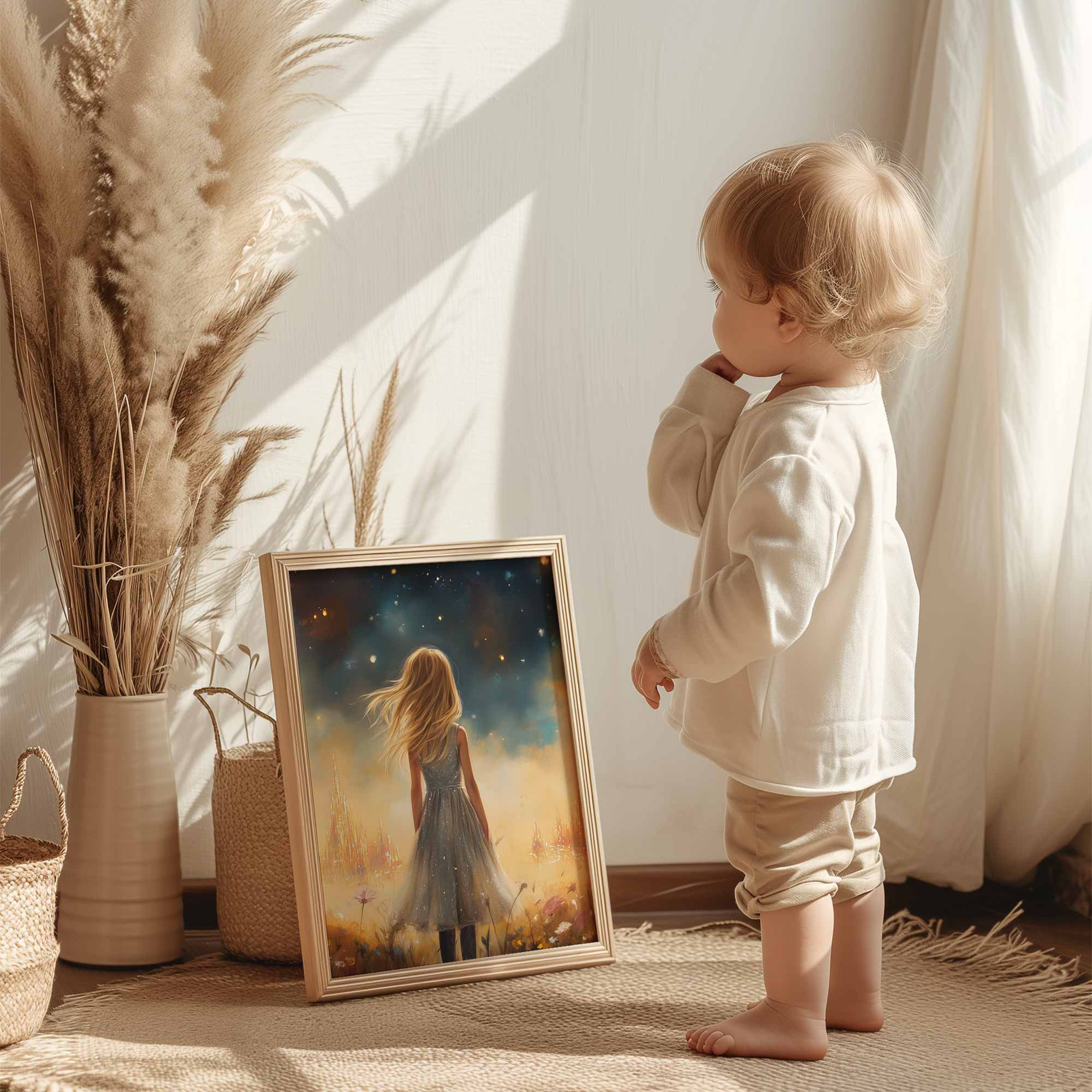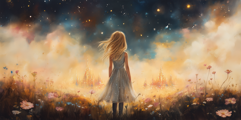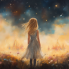 Dromerig Meisje in Bloemenveld onder Sterrenhemel