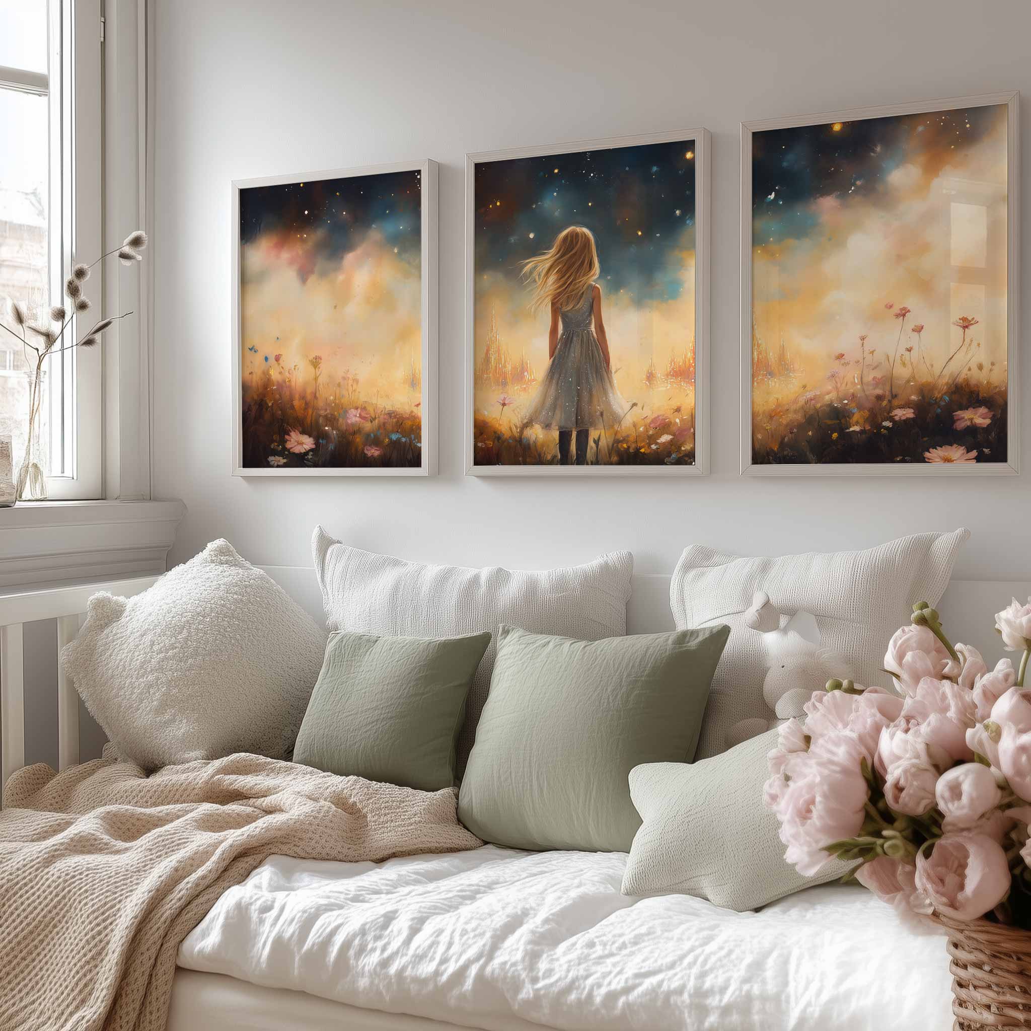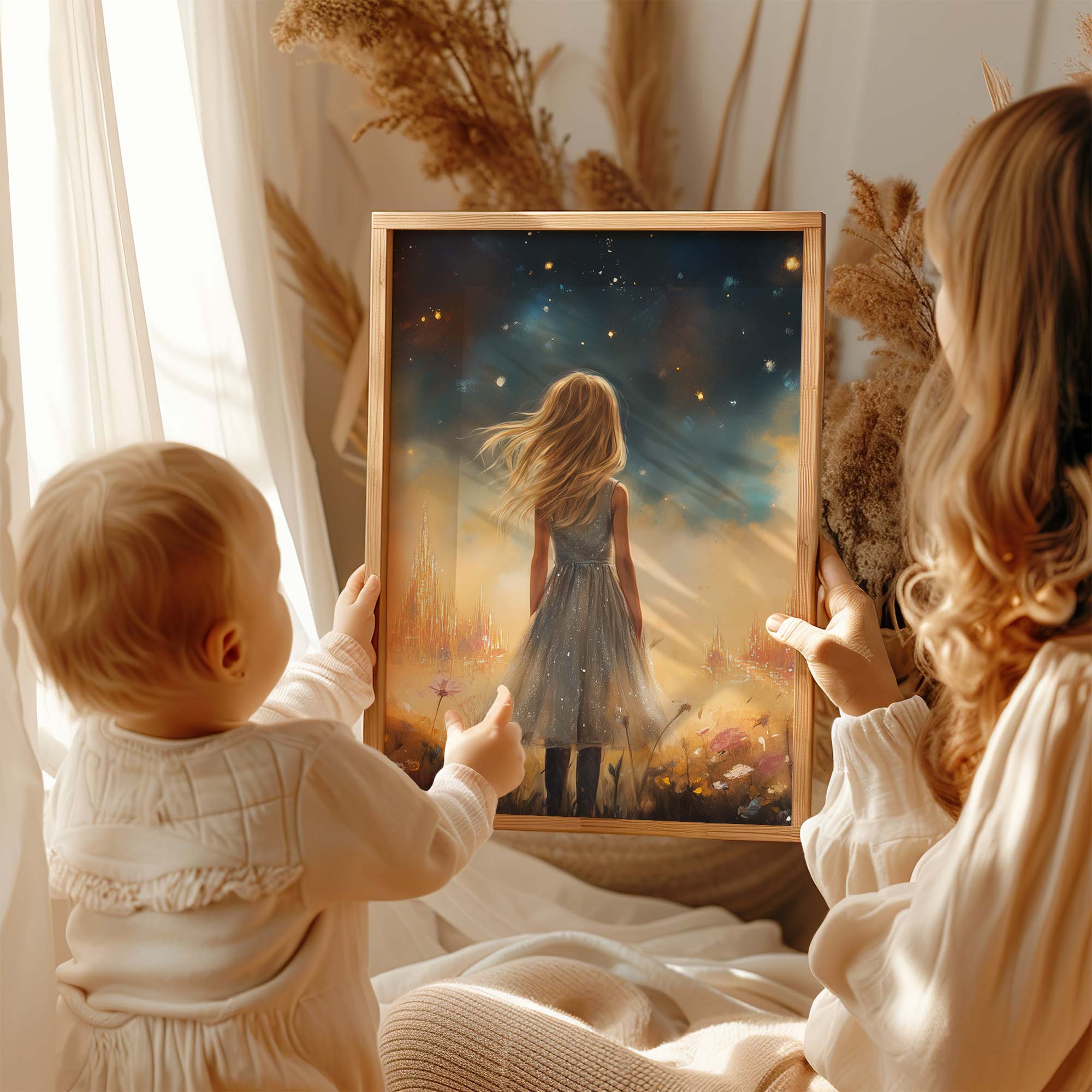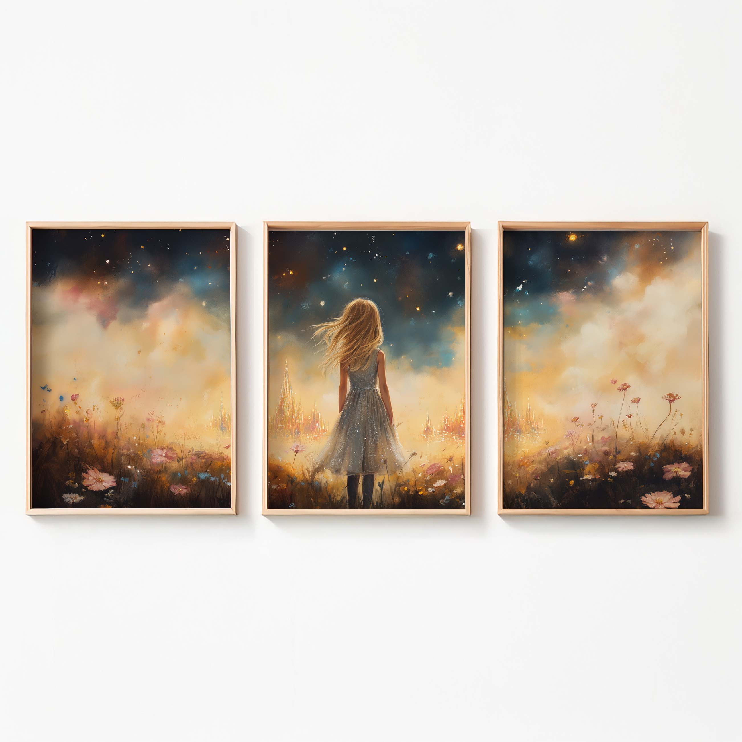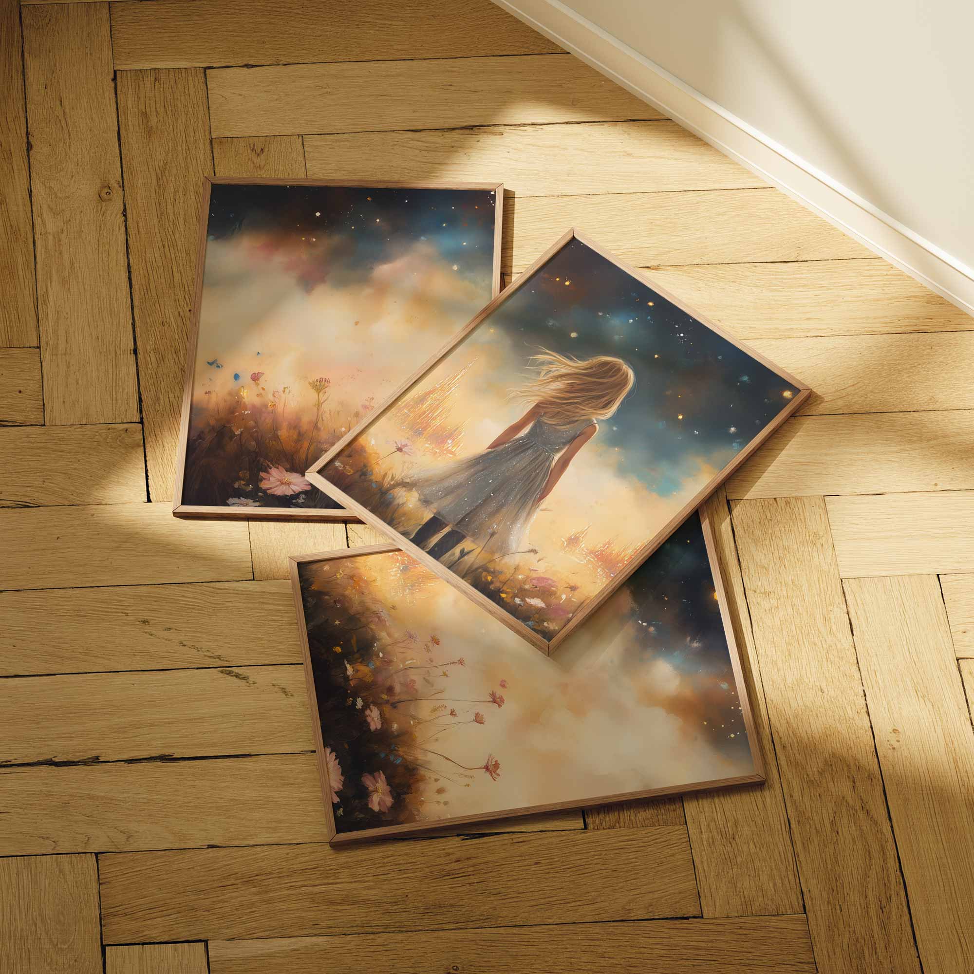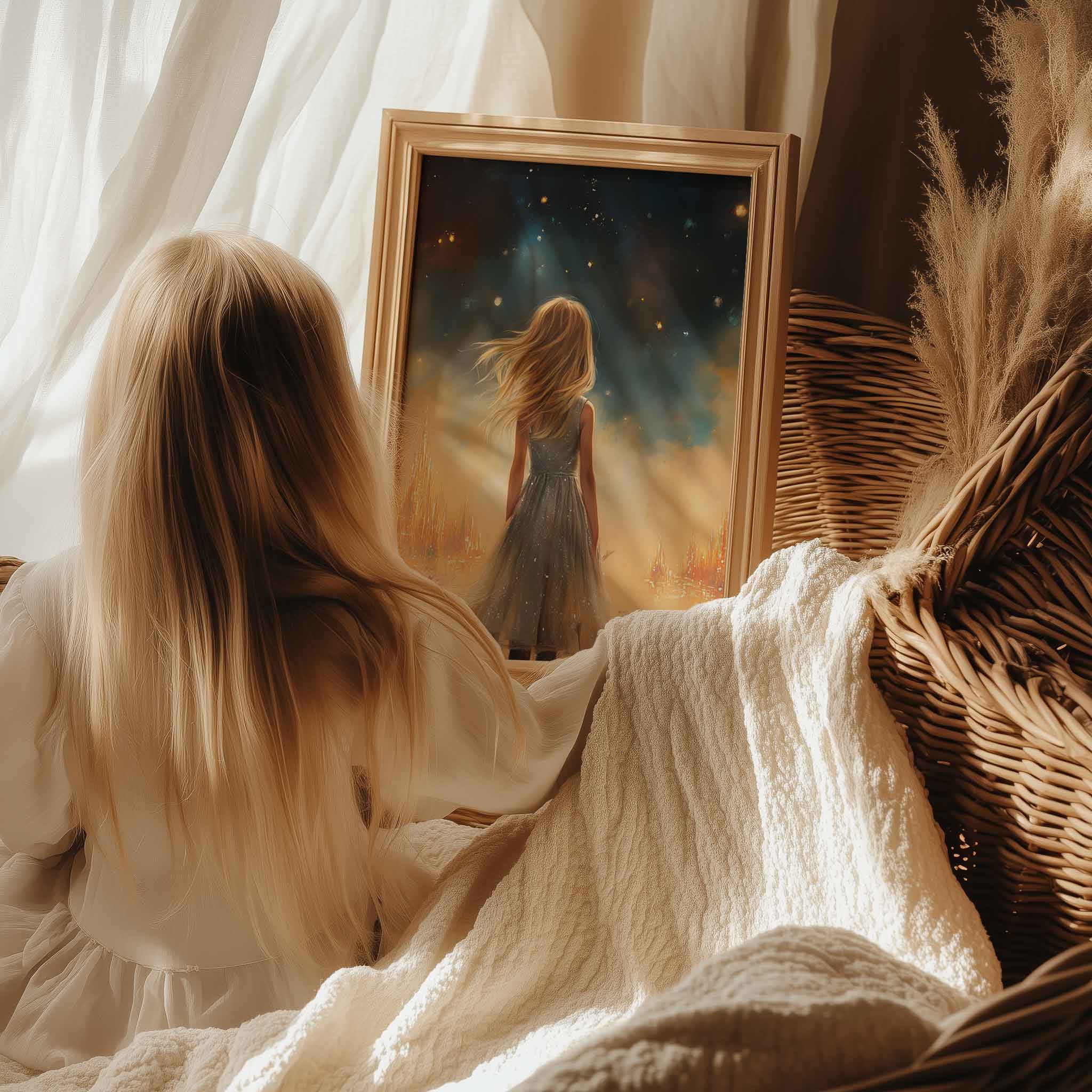 Dromerig Meisje in Bloemenveld onder Sterrenhemel