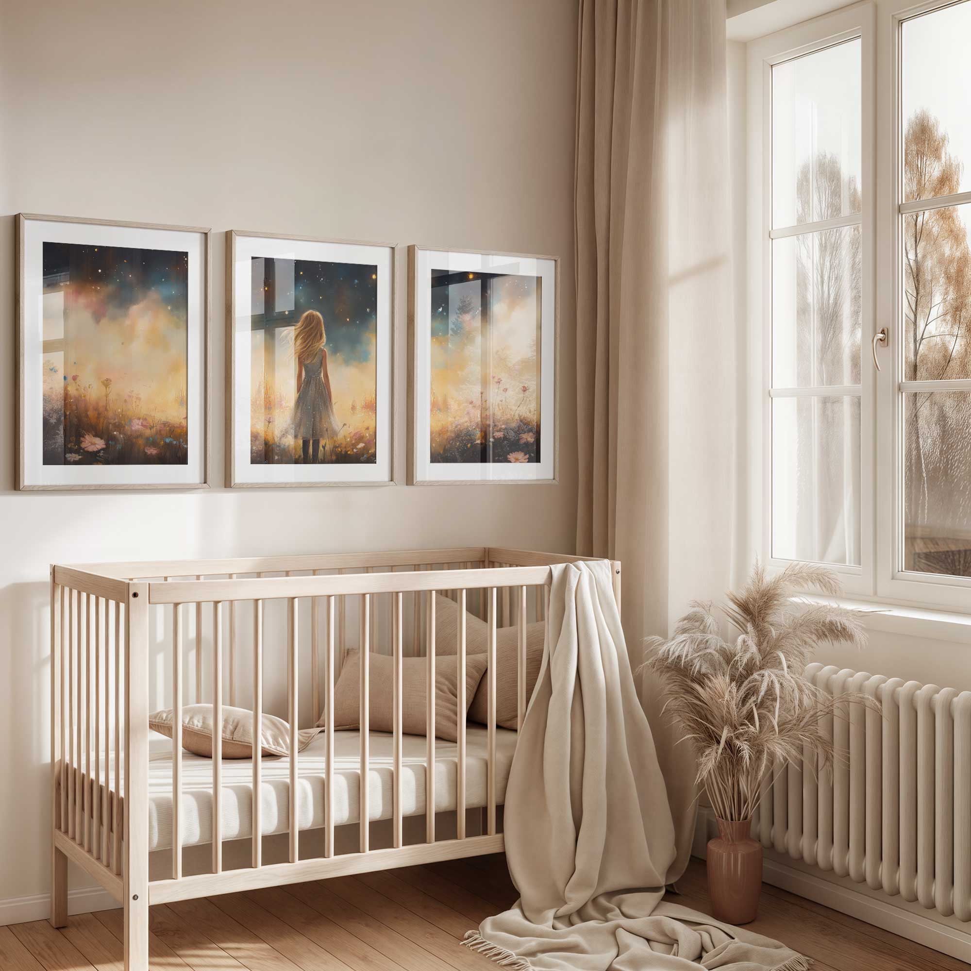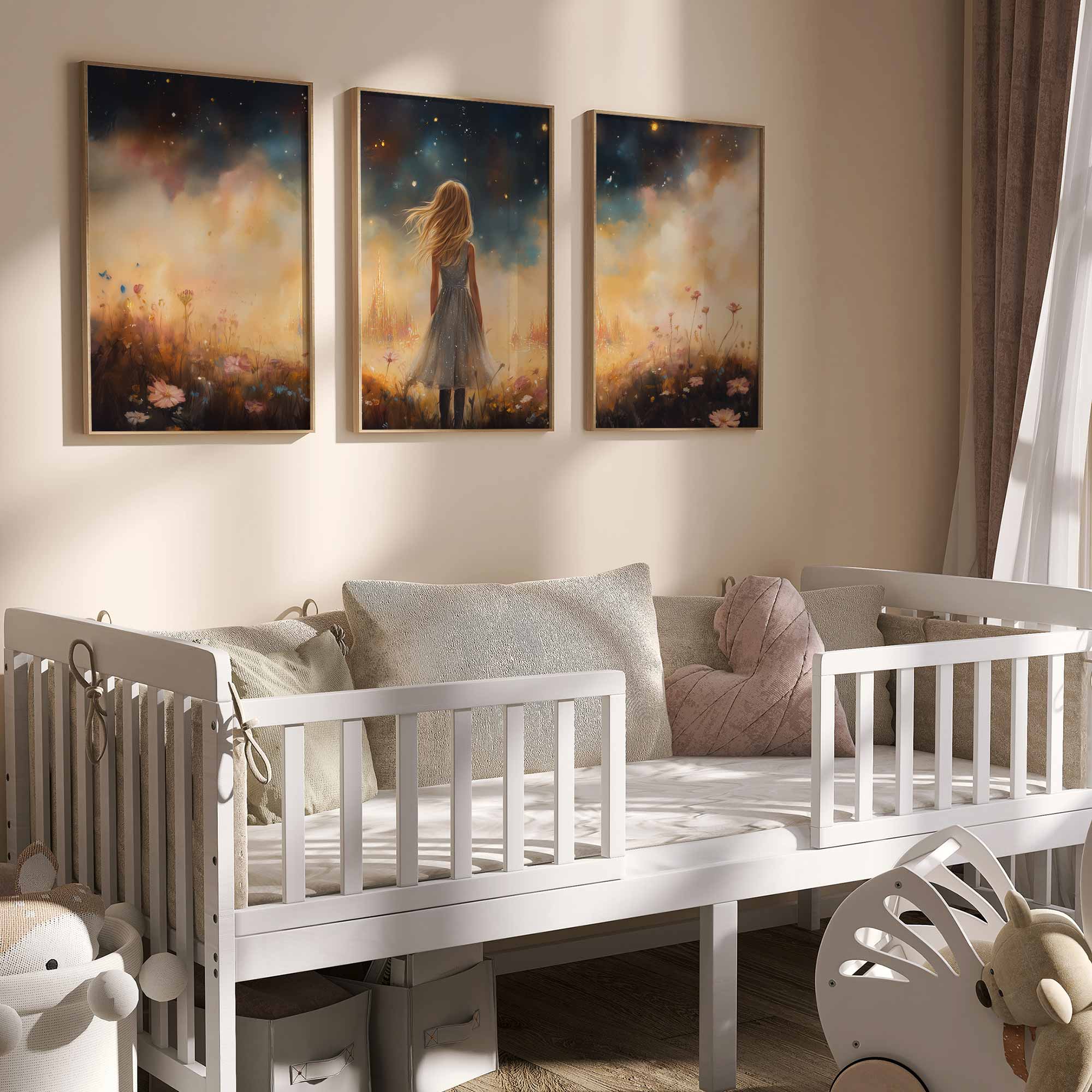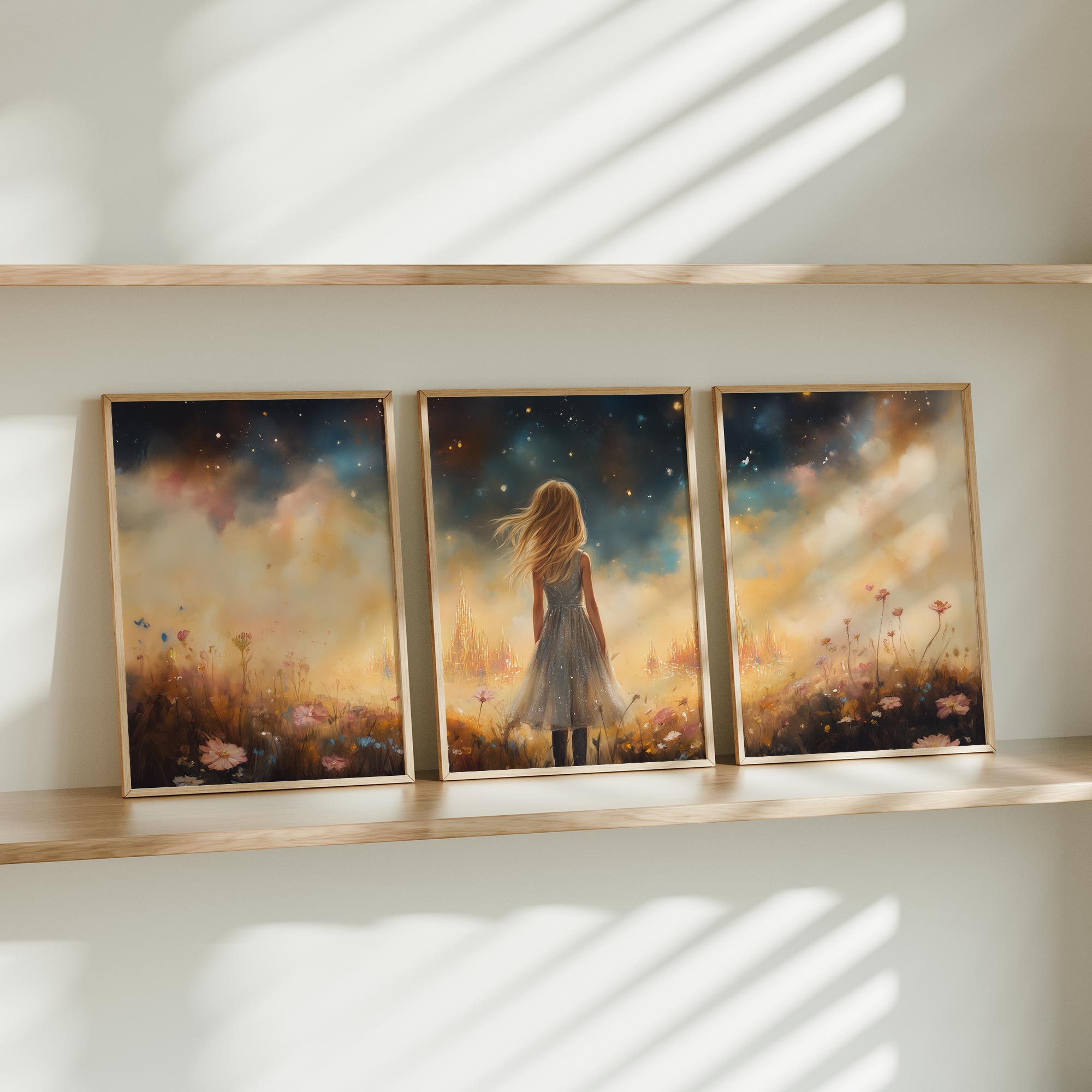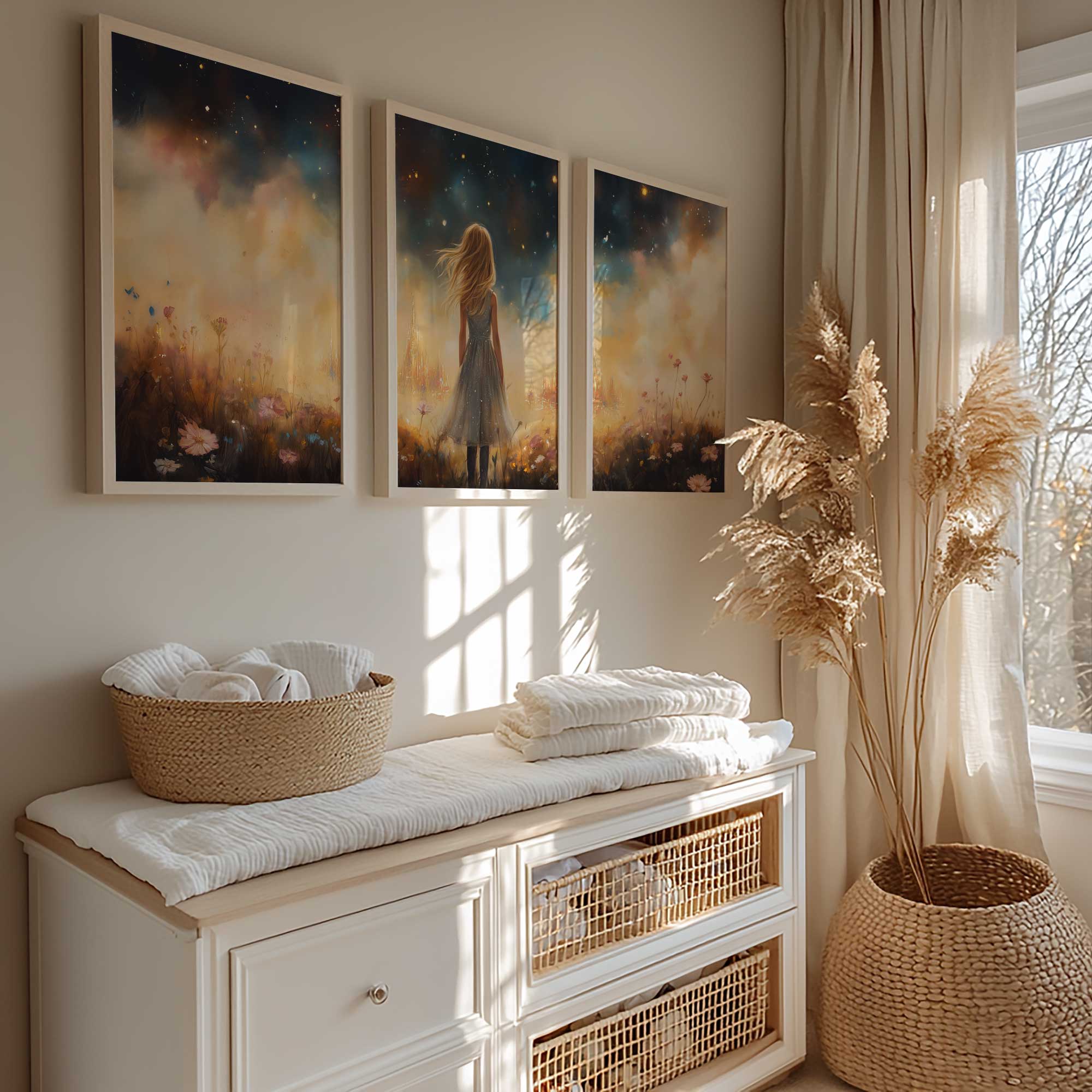 Dromerig Meisje in Bloemenveld onder Sterrenhemel