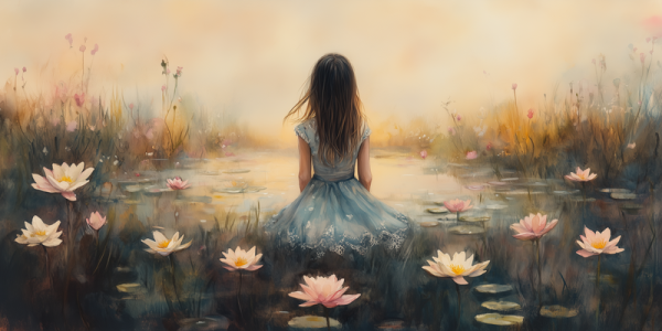 Dromerig Meisje in Bloemenveld – Pastel Blauw en Roze