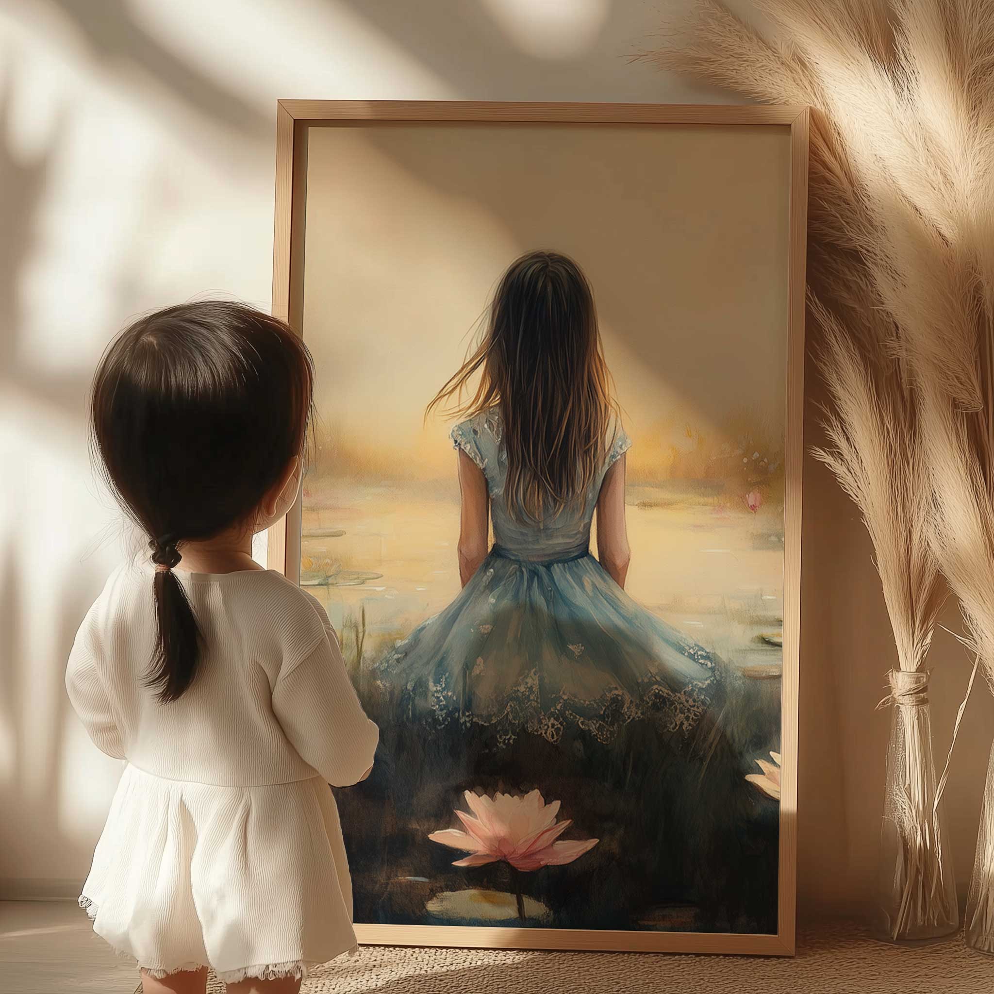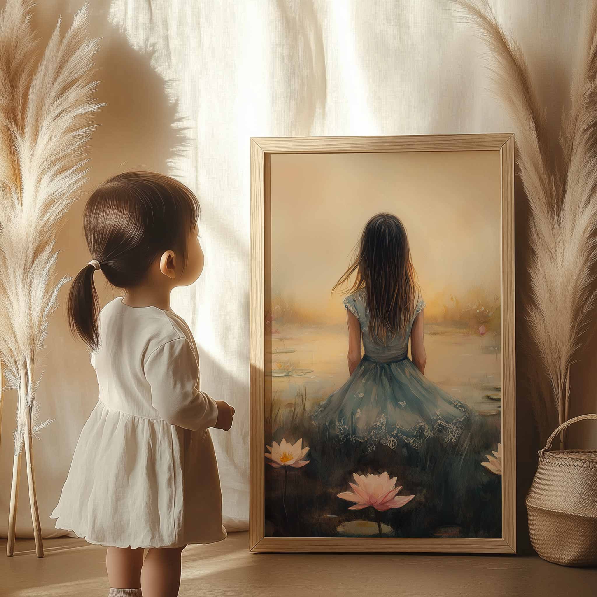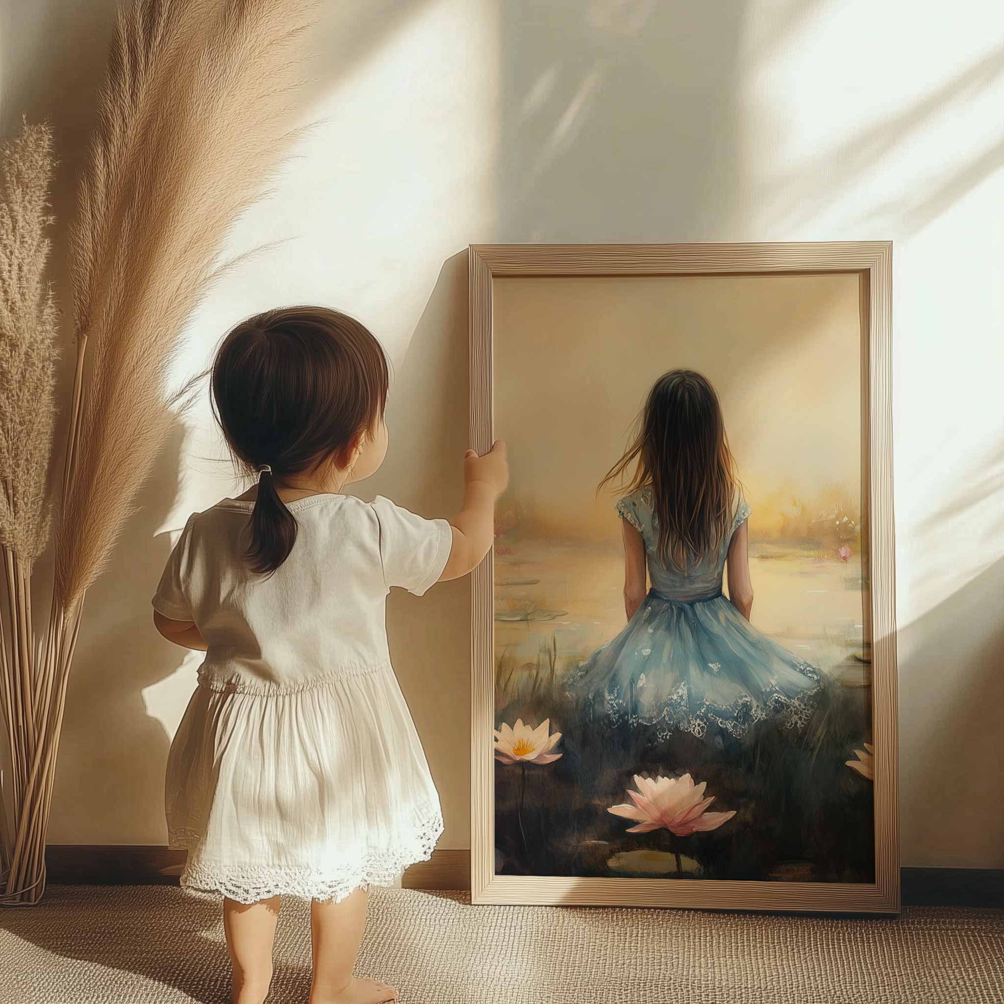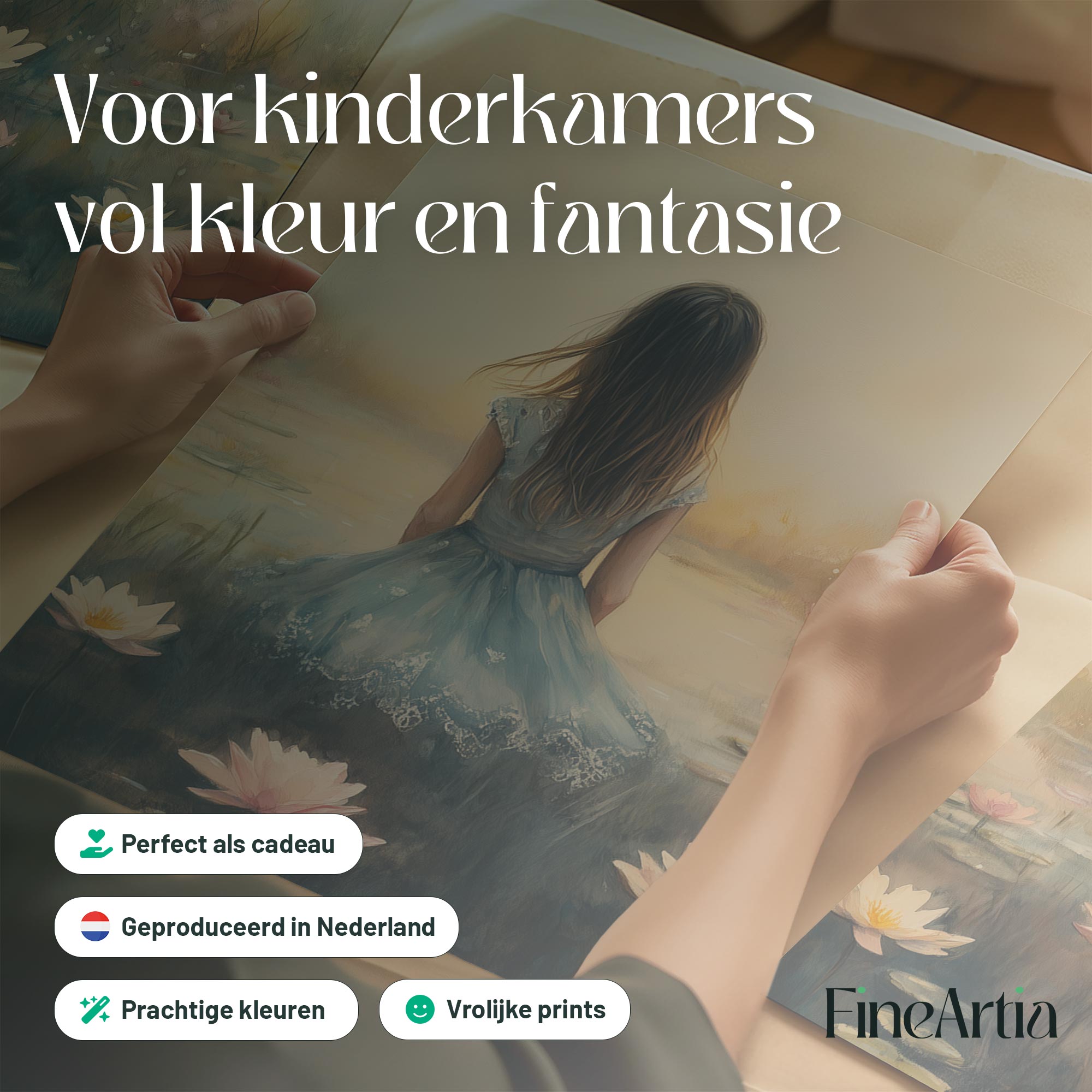 Terug naar collectie Posters Dromerig Meisje in Bloemenveld – Pastel Blauw en Roze