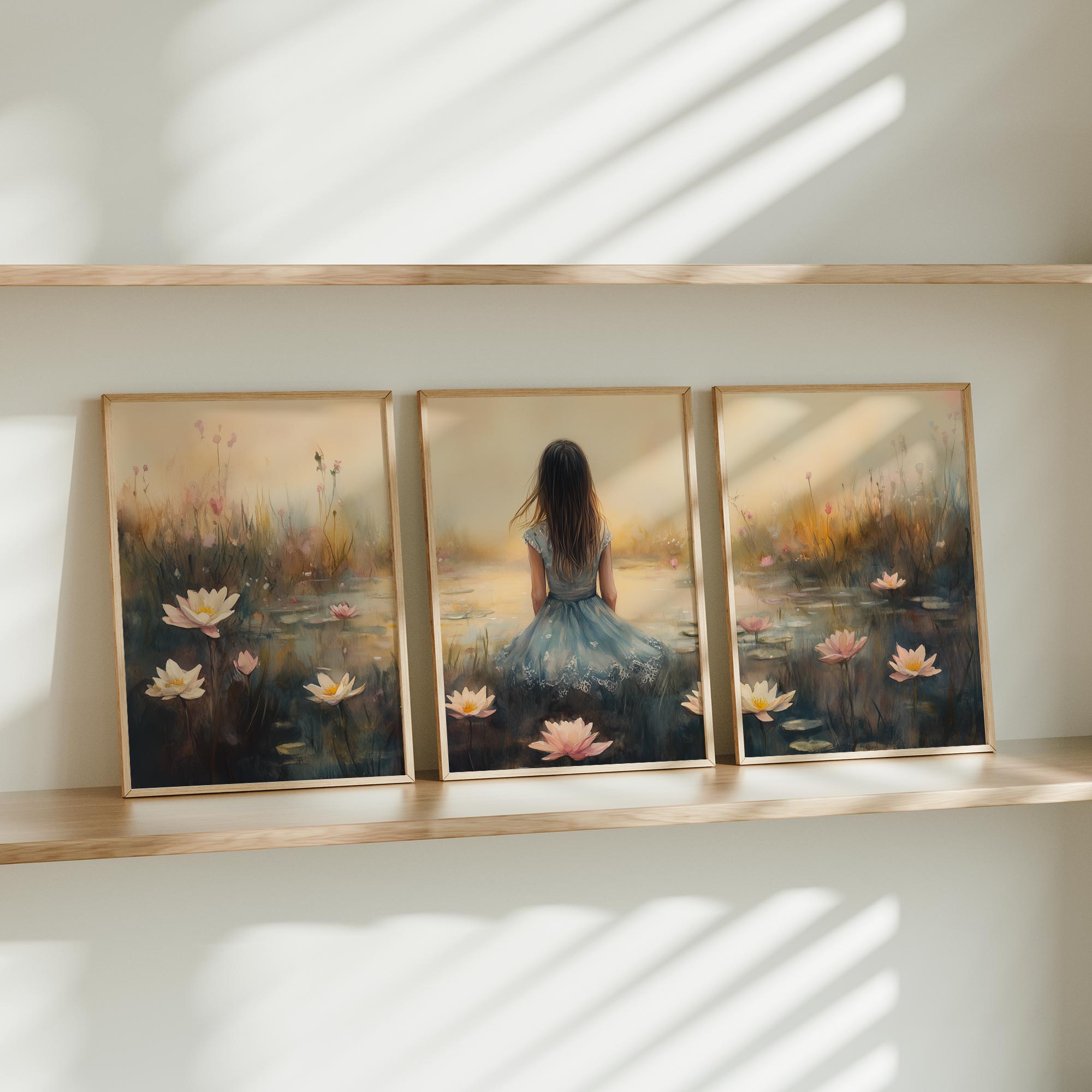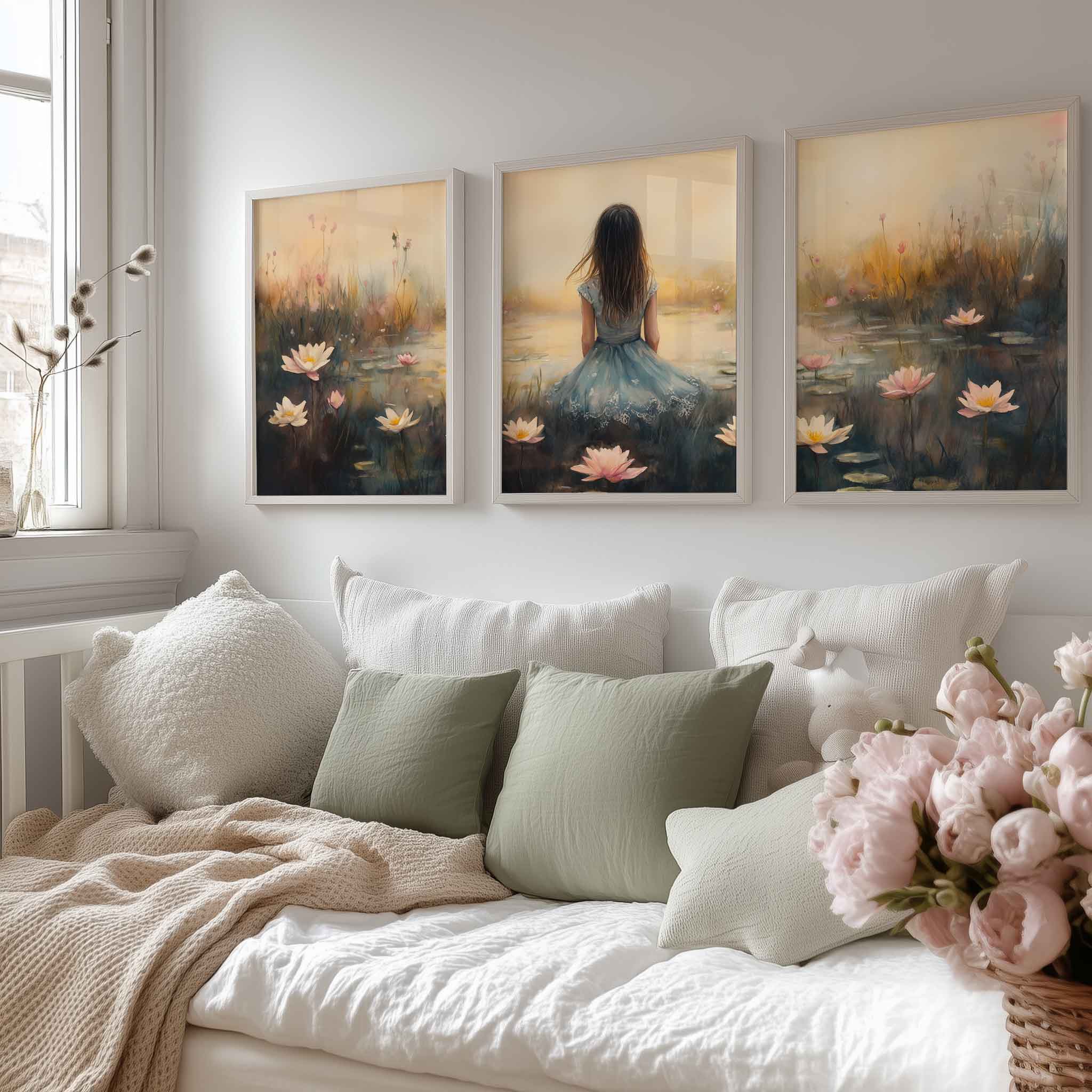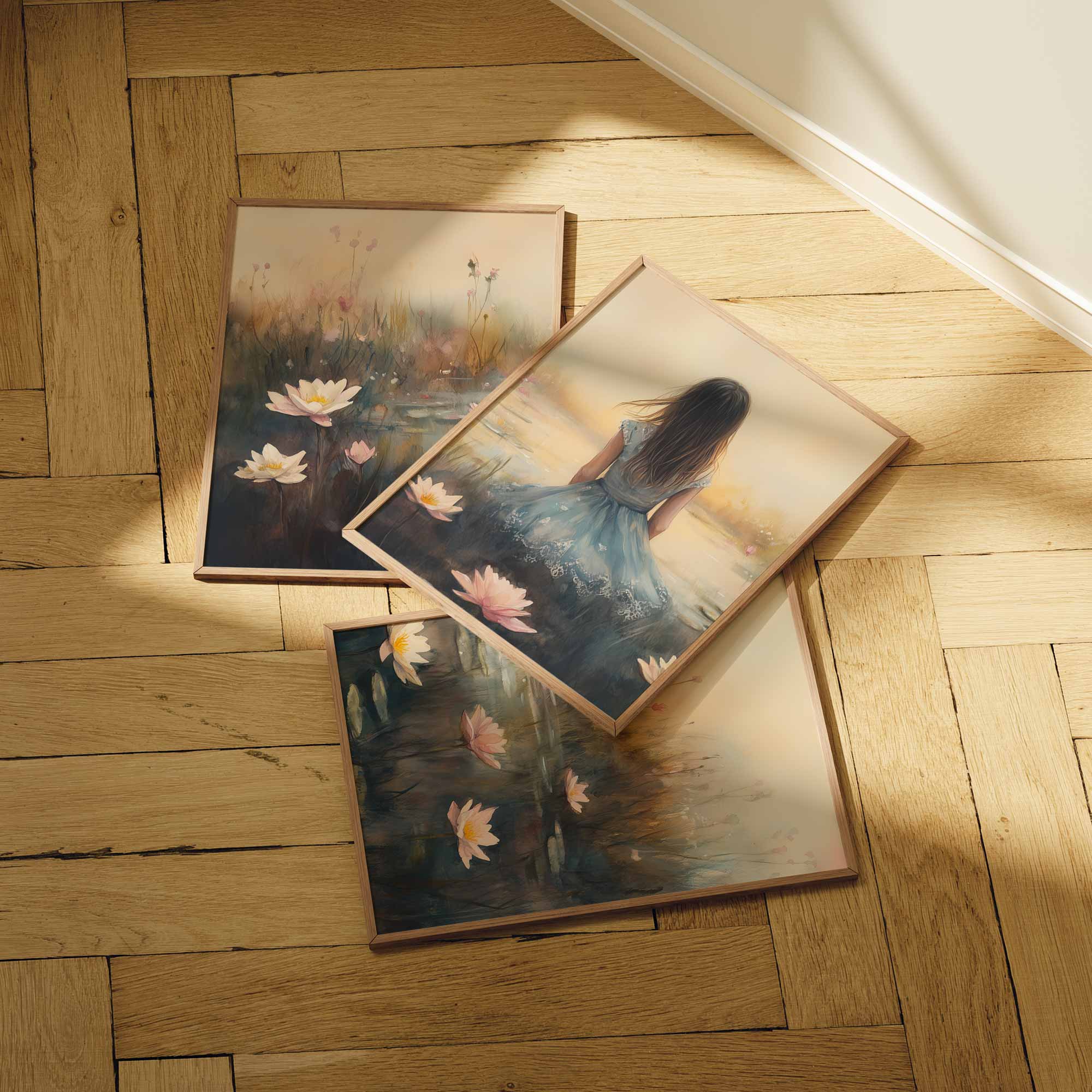 Terug naar collectie Posters Dromerig Meisje in Bloemenveld – Pastel Blauw en Roze
