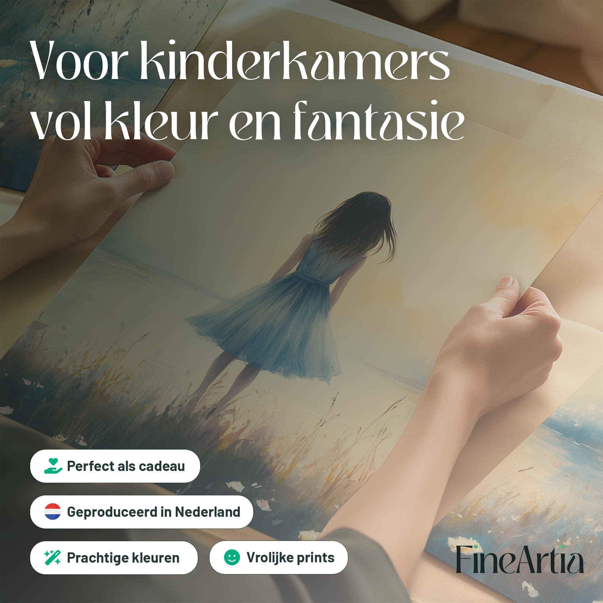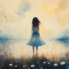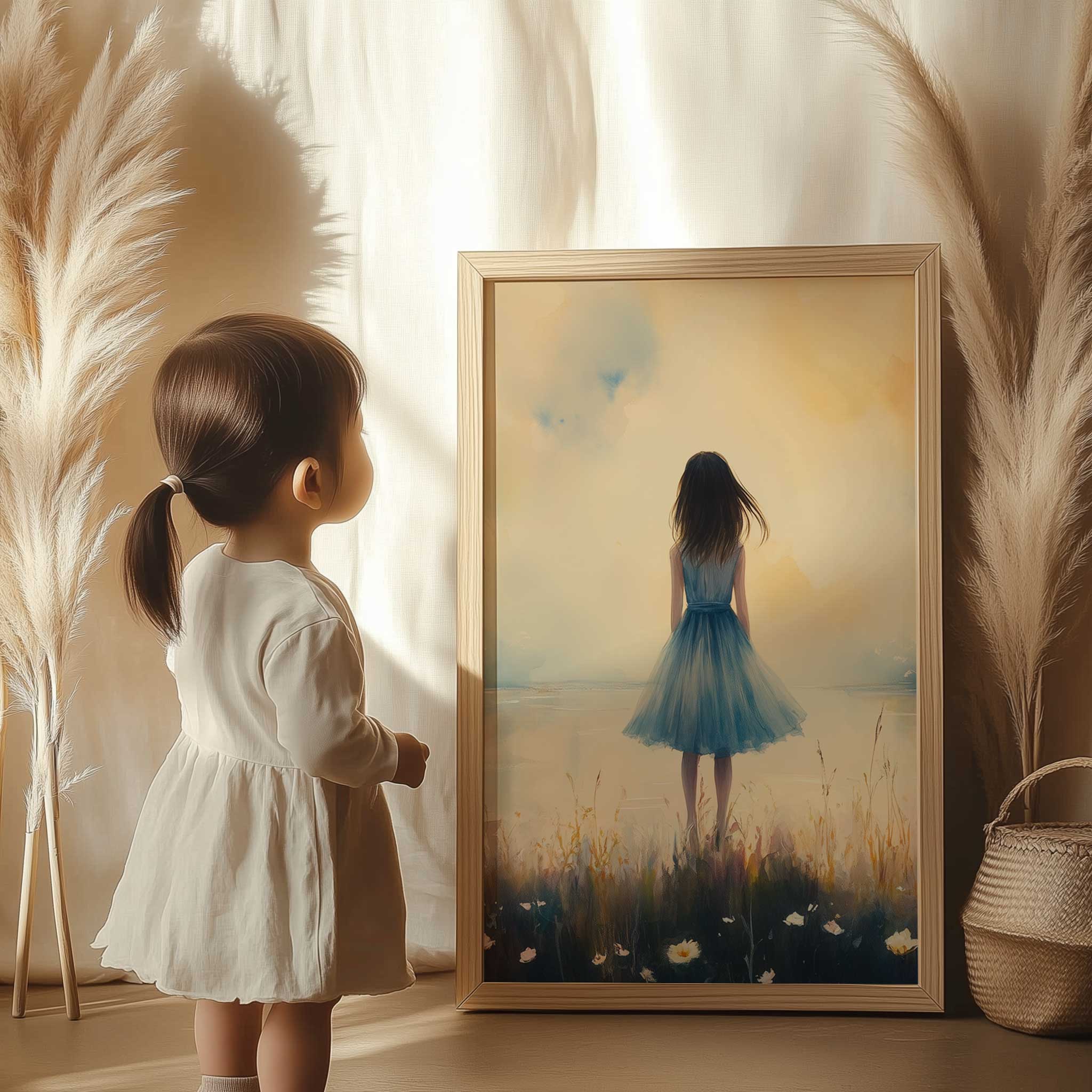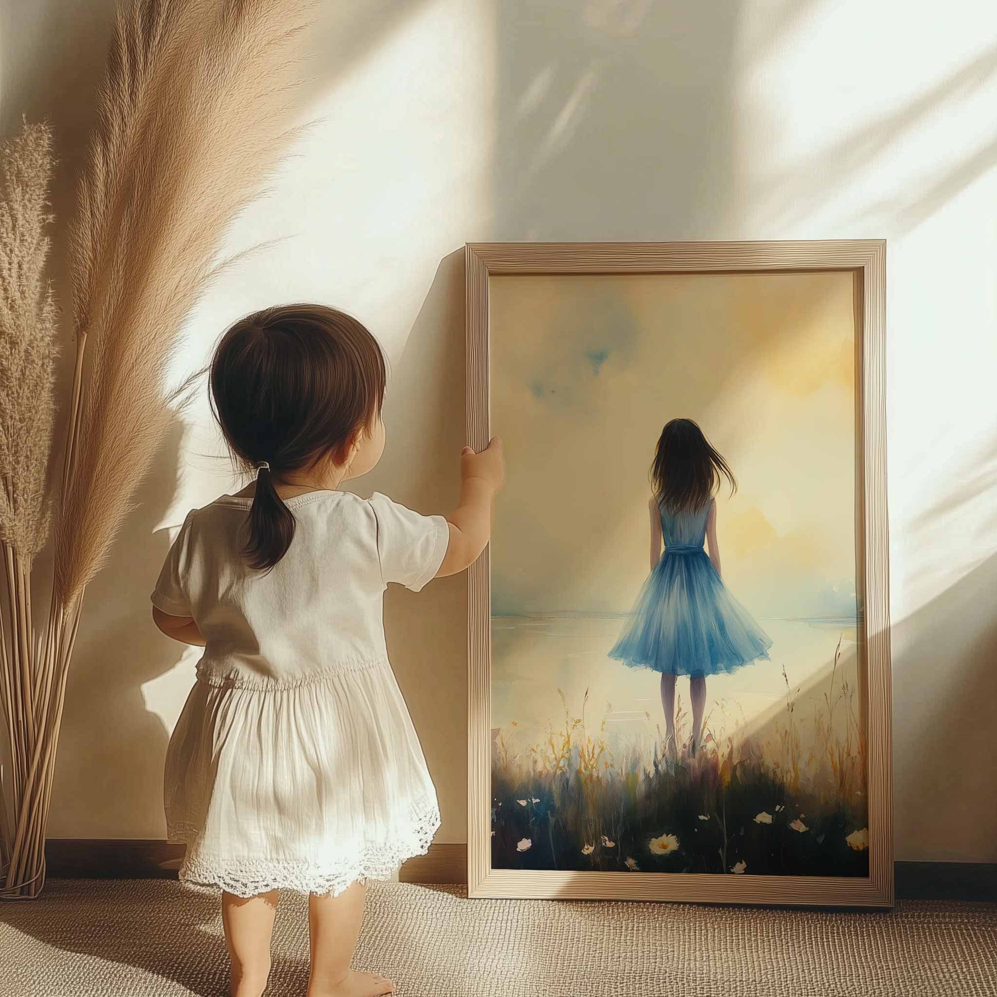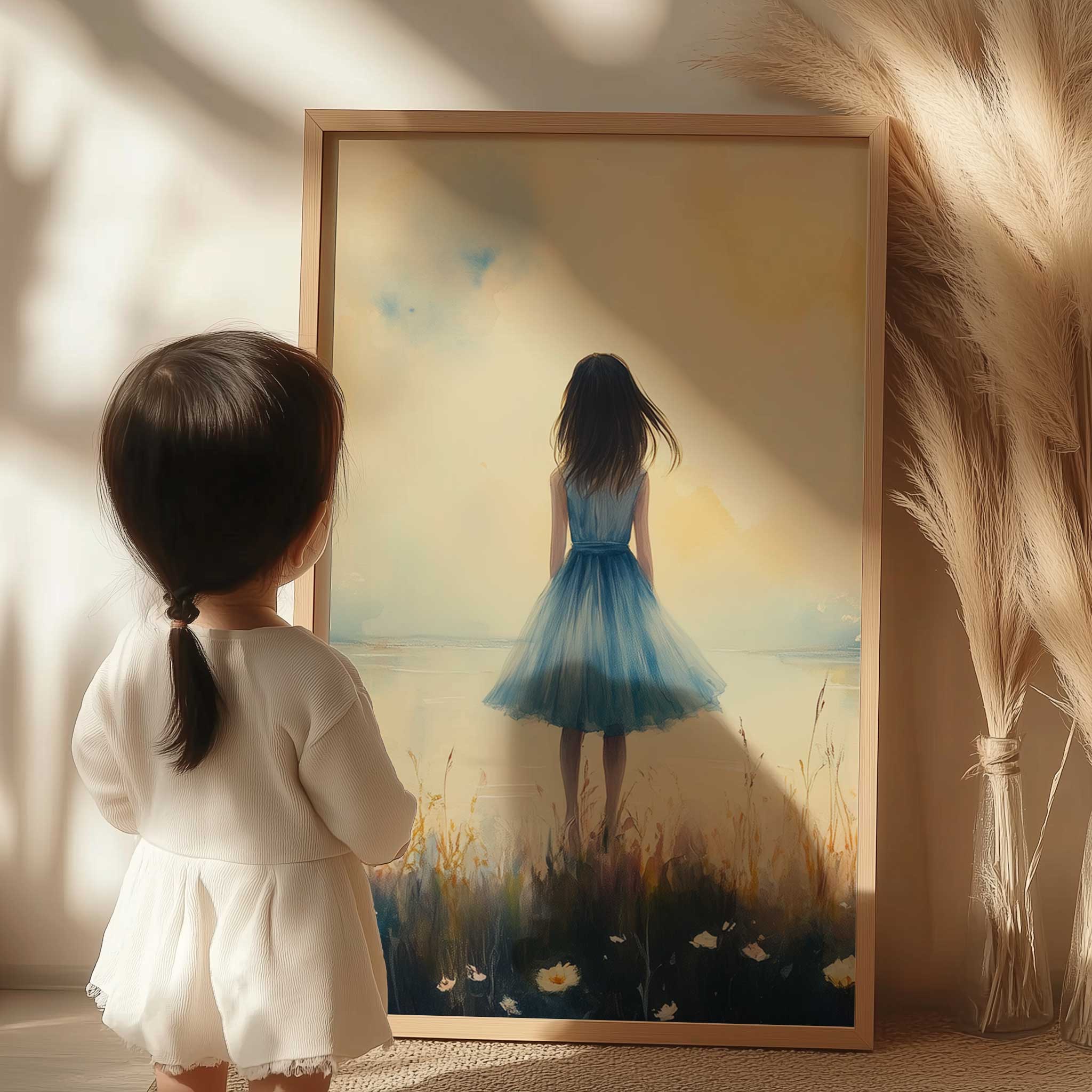 Dromerig Meisje in Bloemenveld – Pastel Blauwe Jurk