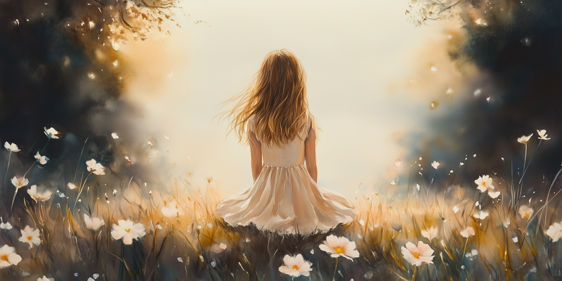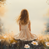 Dromerig Meisje in Bloemenveld – Pastel Sfeer