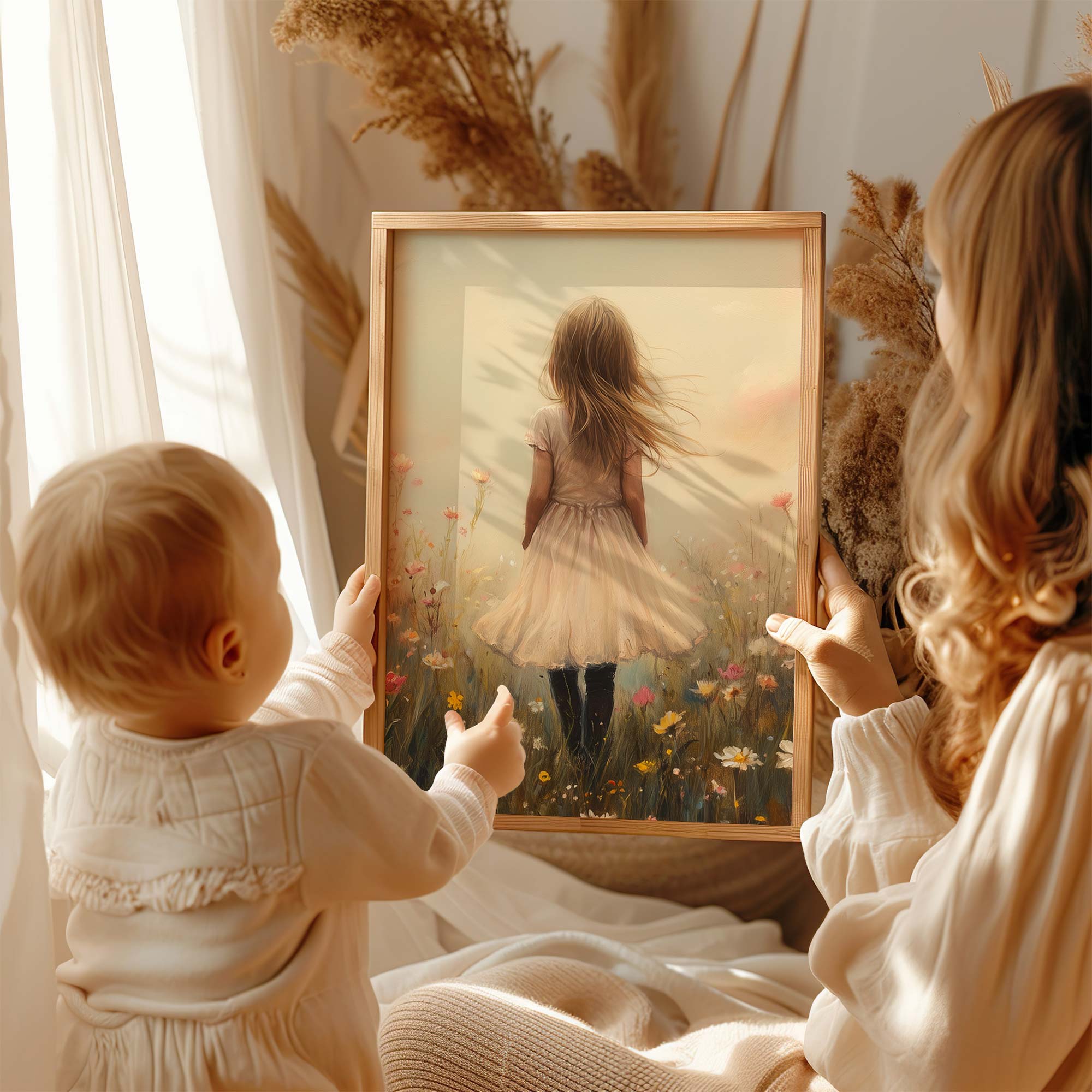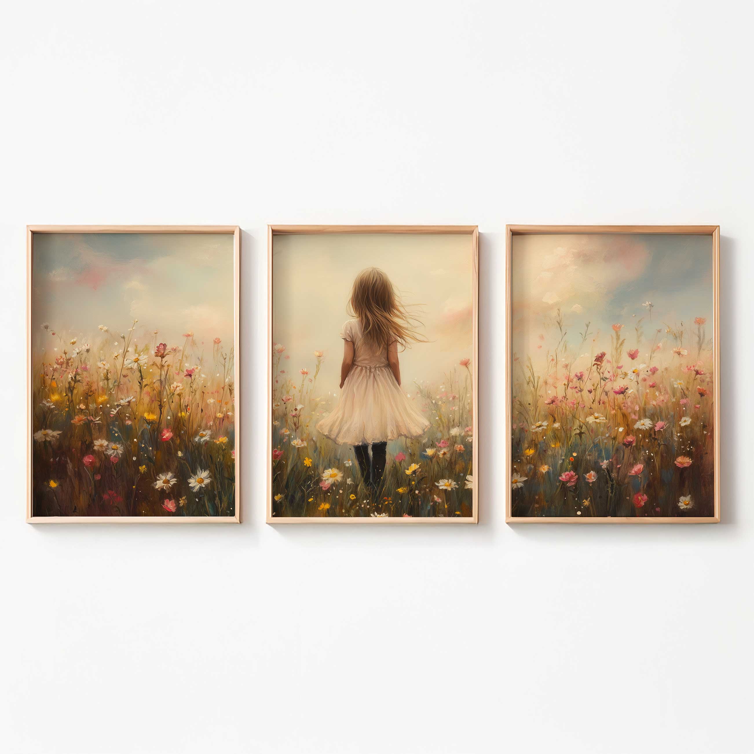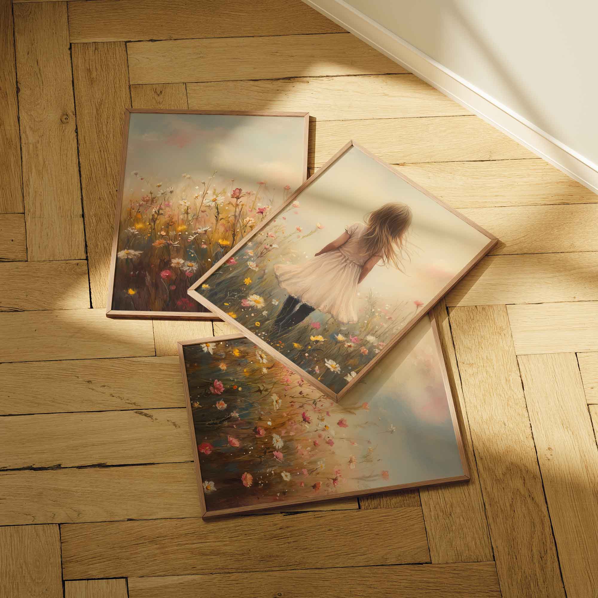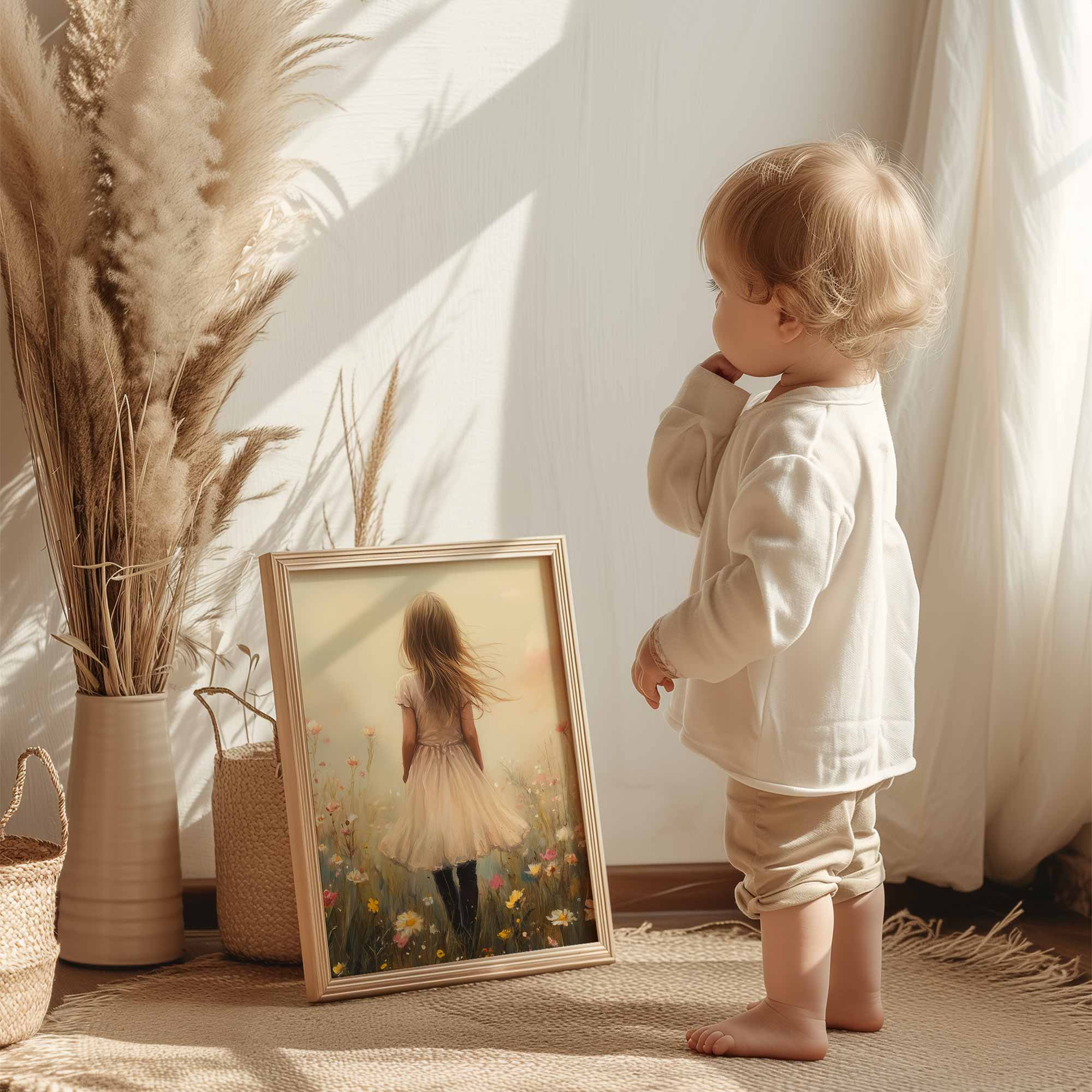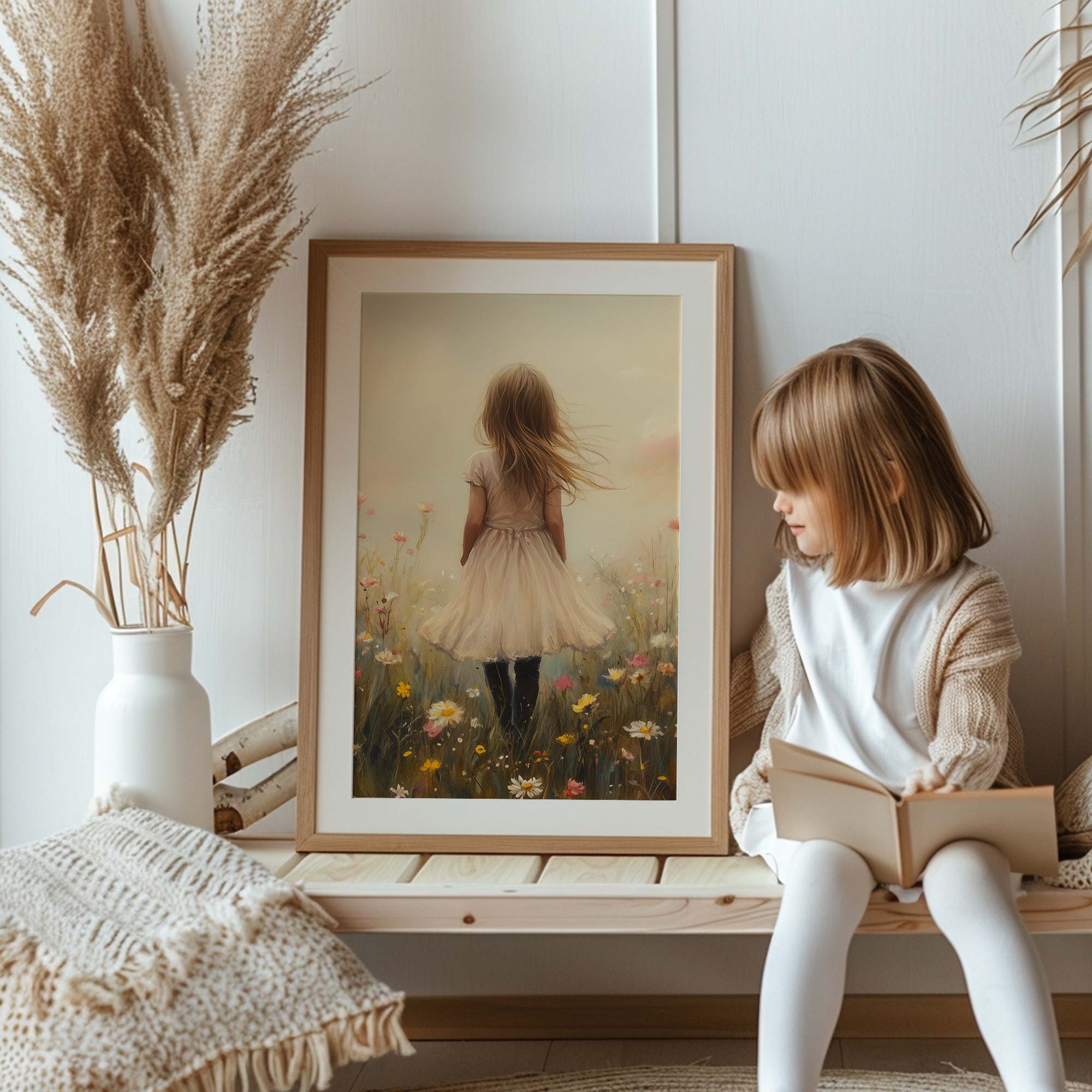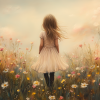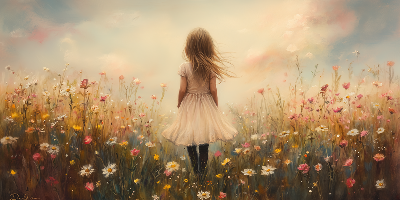 Dromerig Meisje in Bloemenveld – Pastel Sprookje