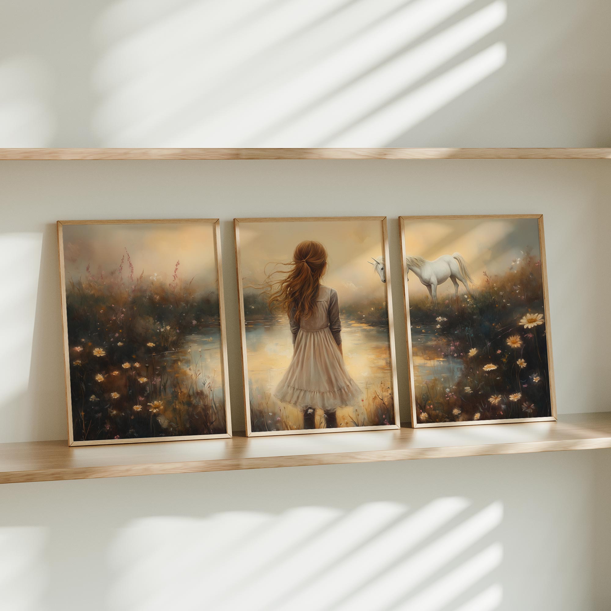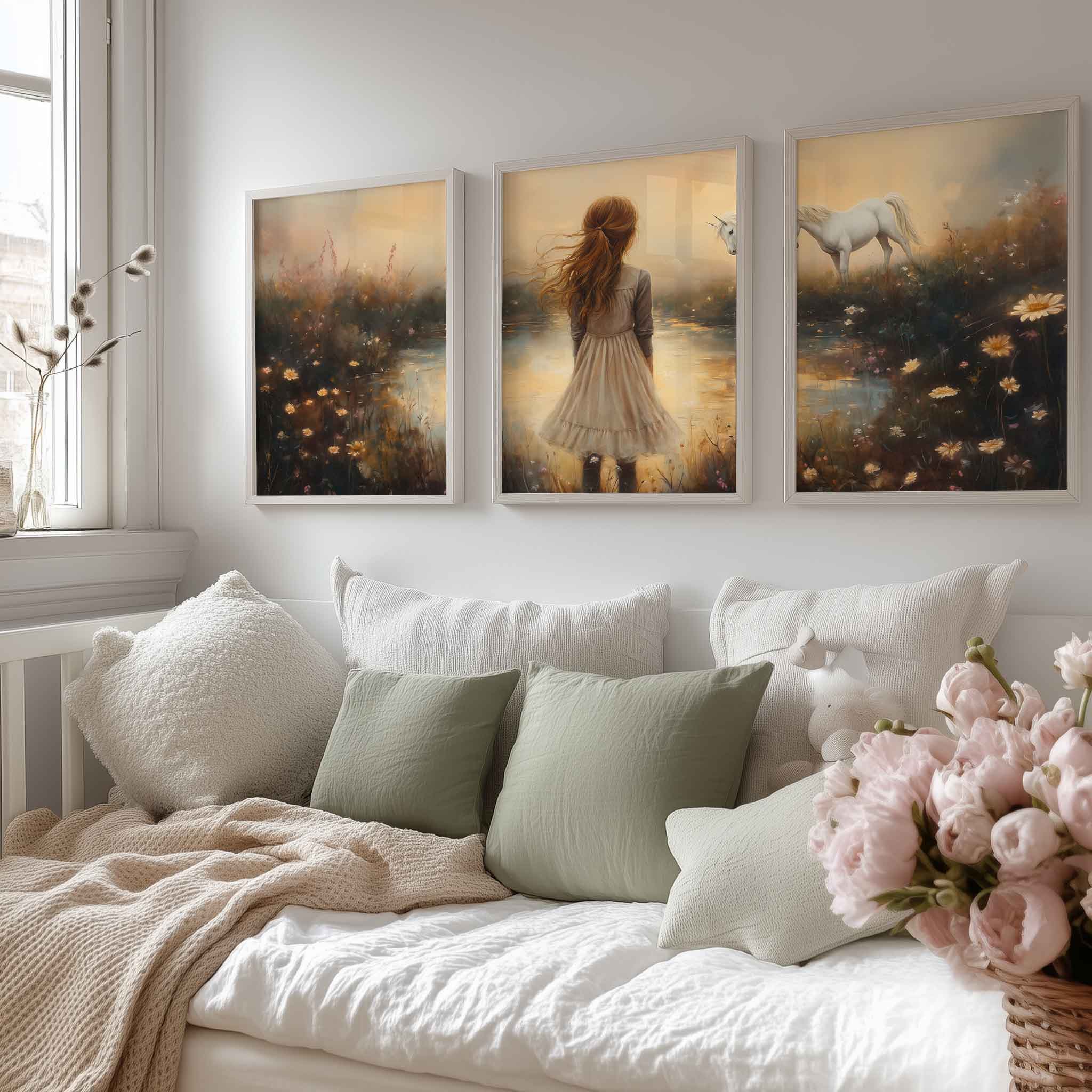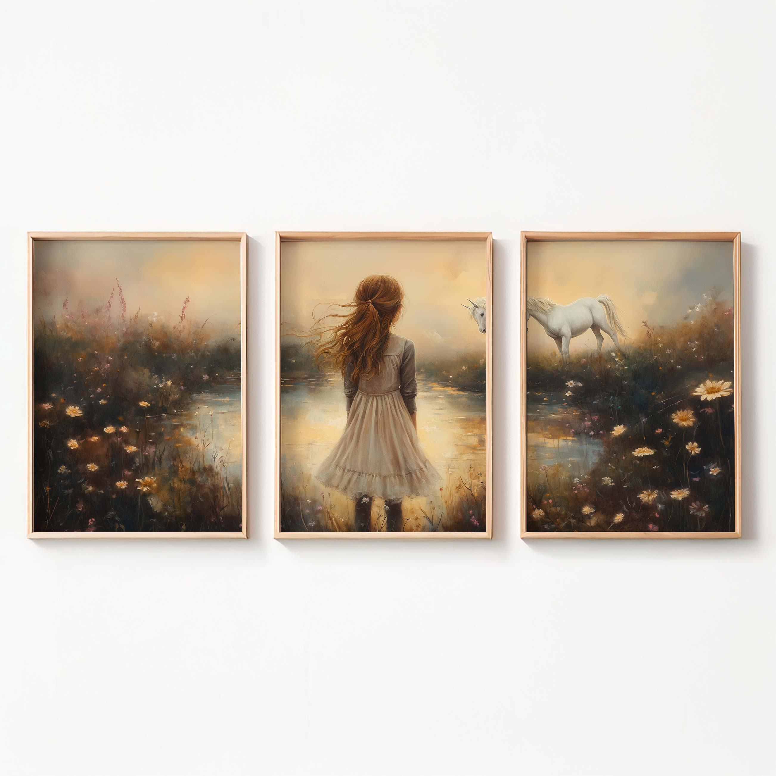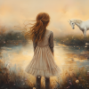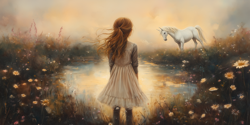 Dromerig Meisje met Eenhoorn in Pastel Veld