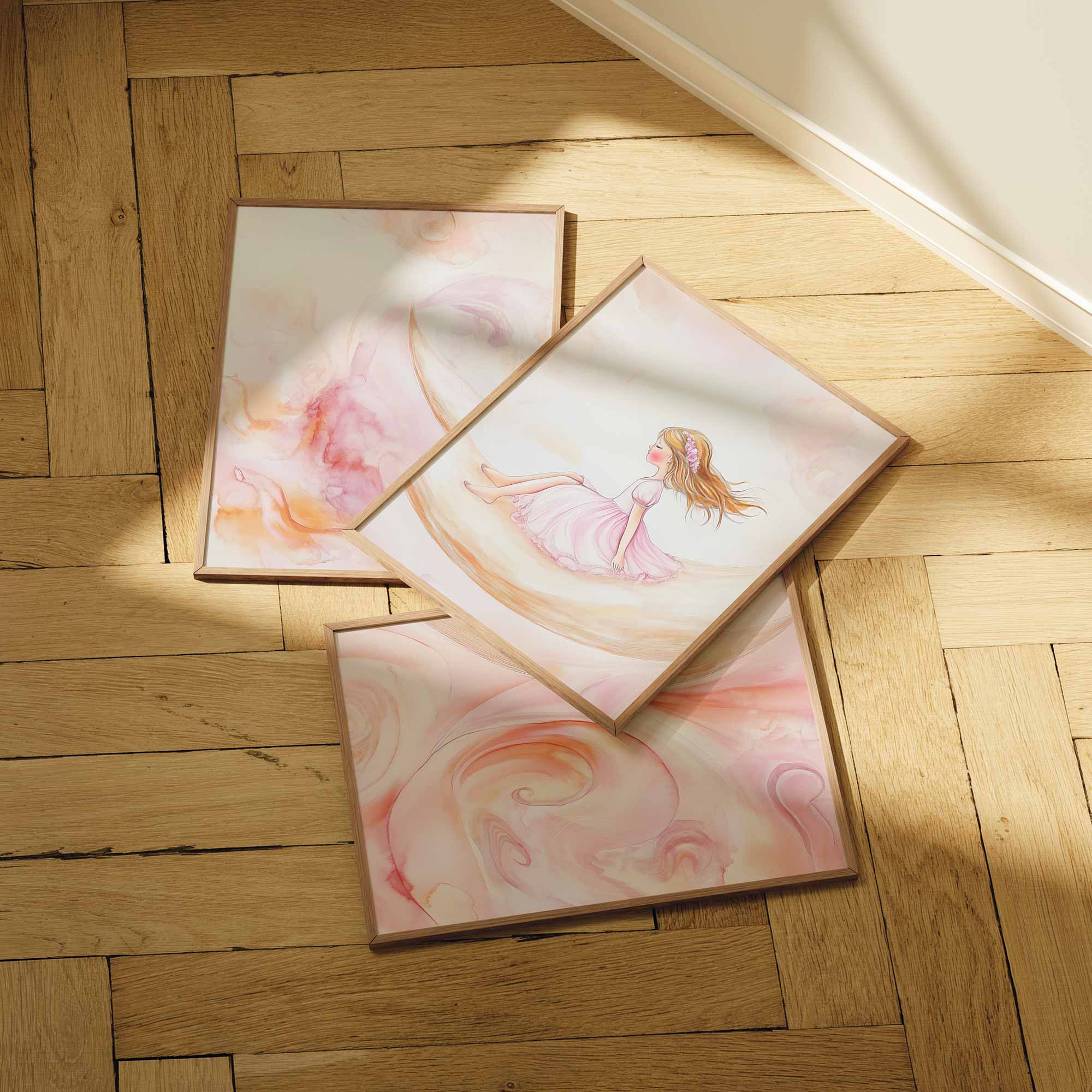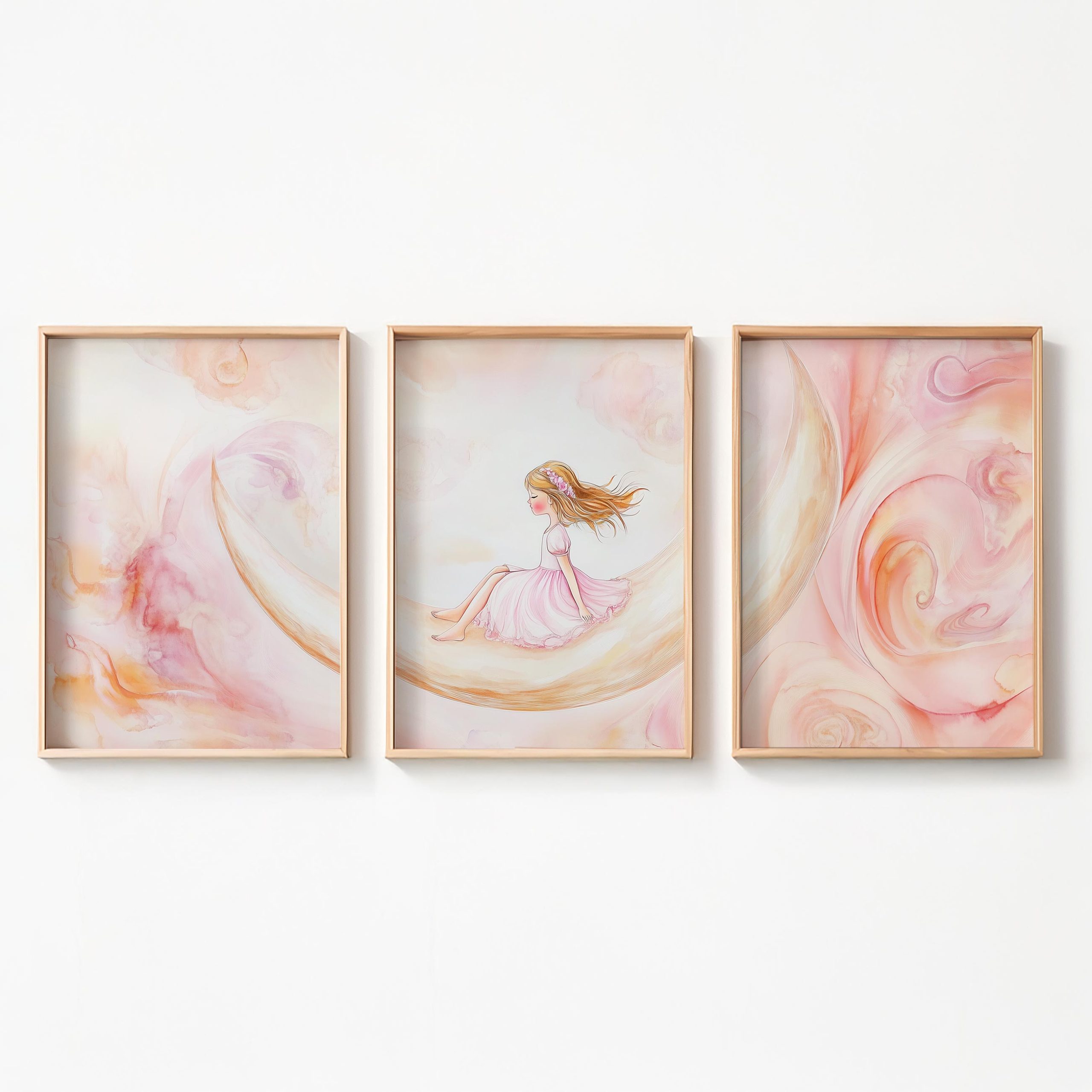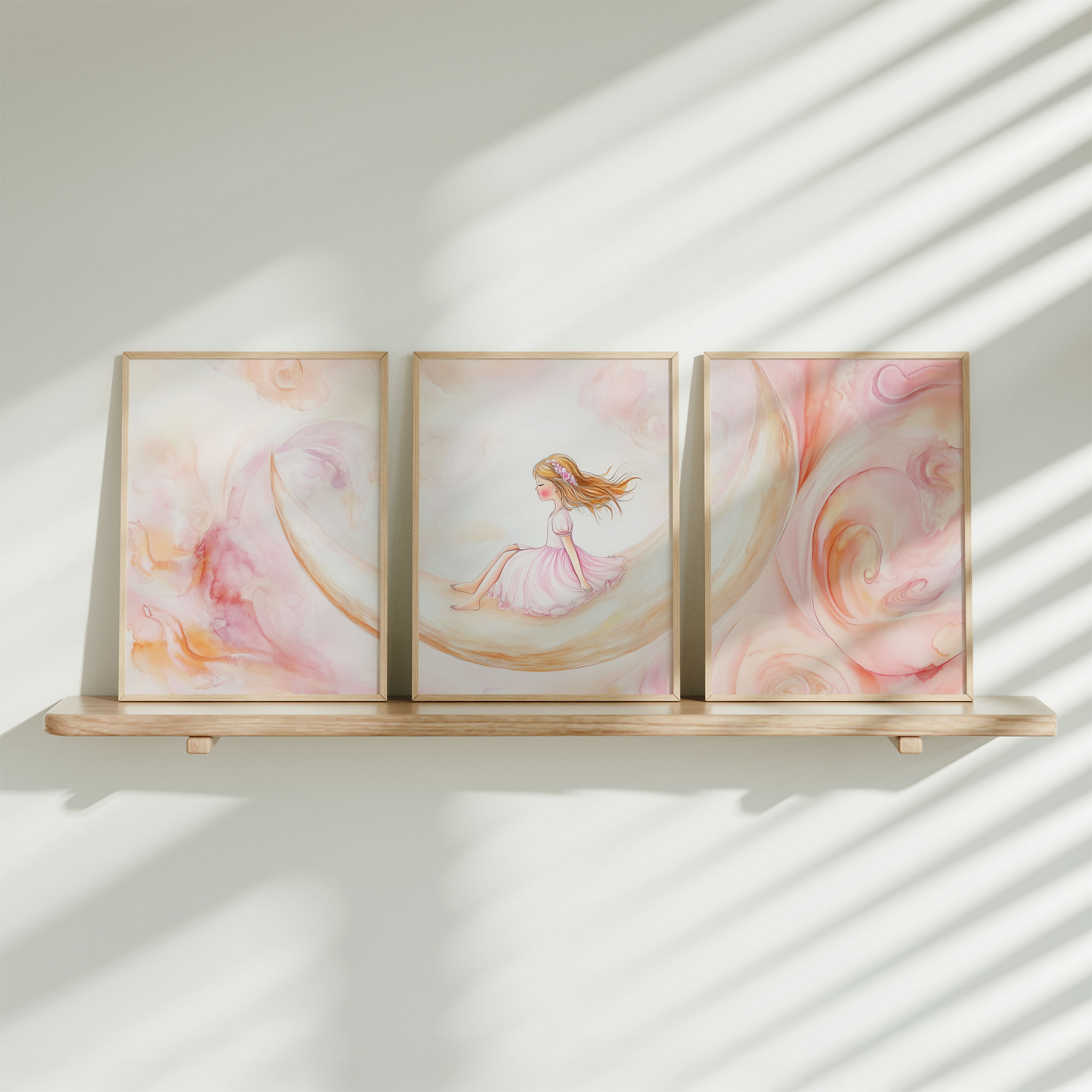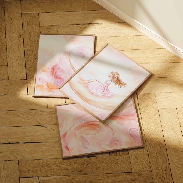 Dromerig Meisje op Maansikkel – Pastel Waterverf Sfeer