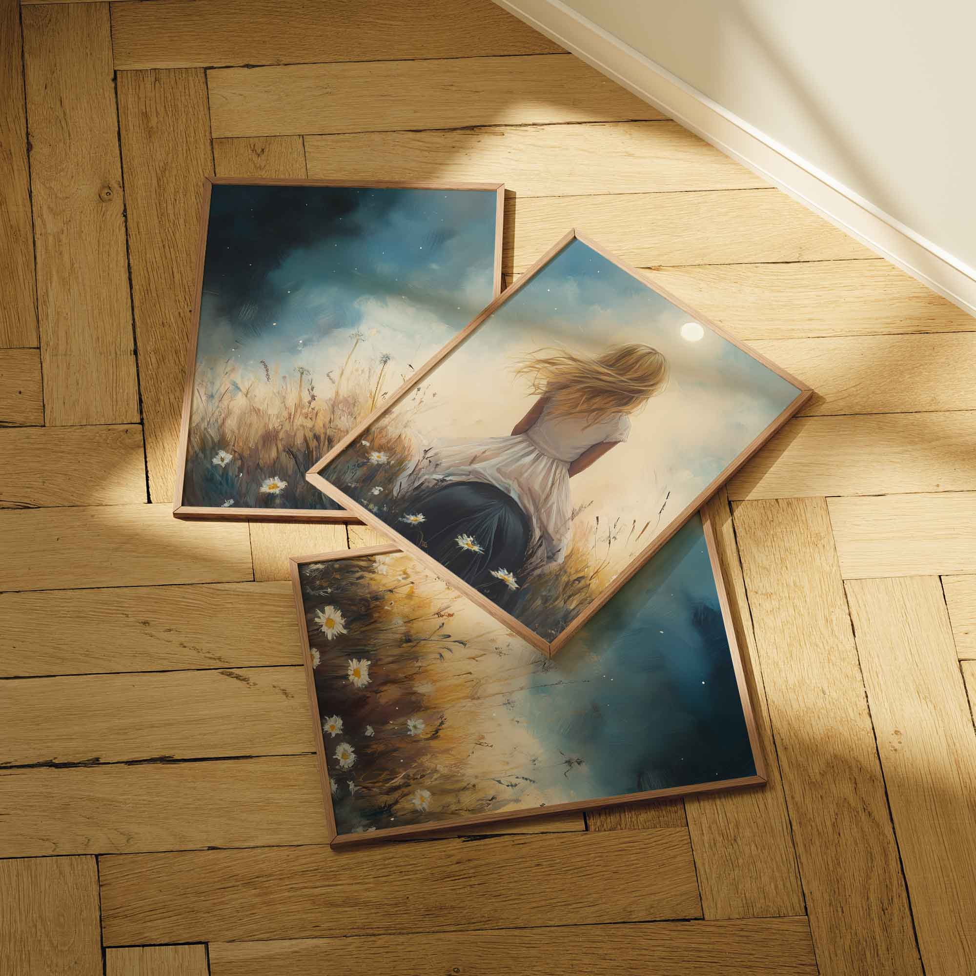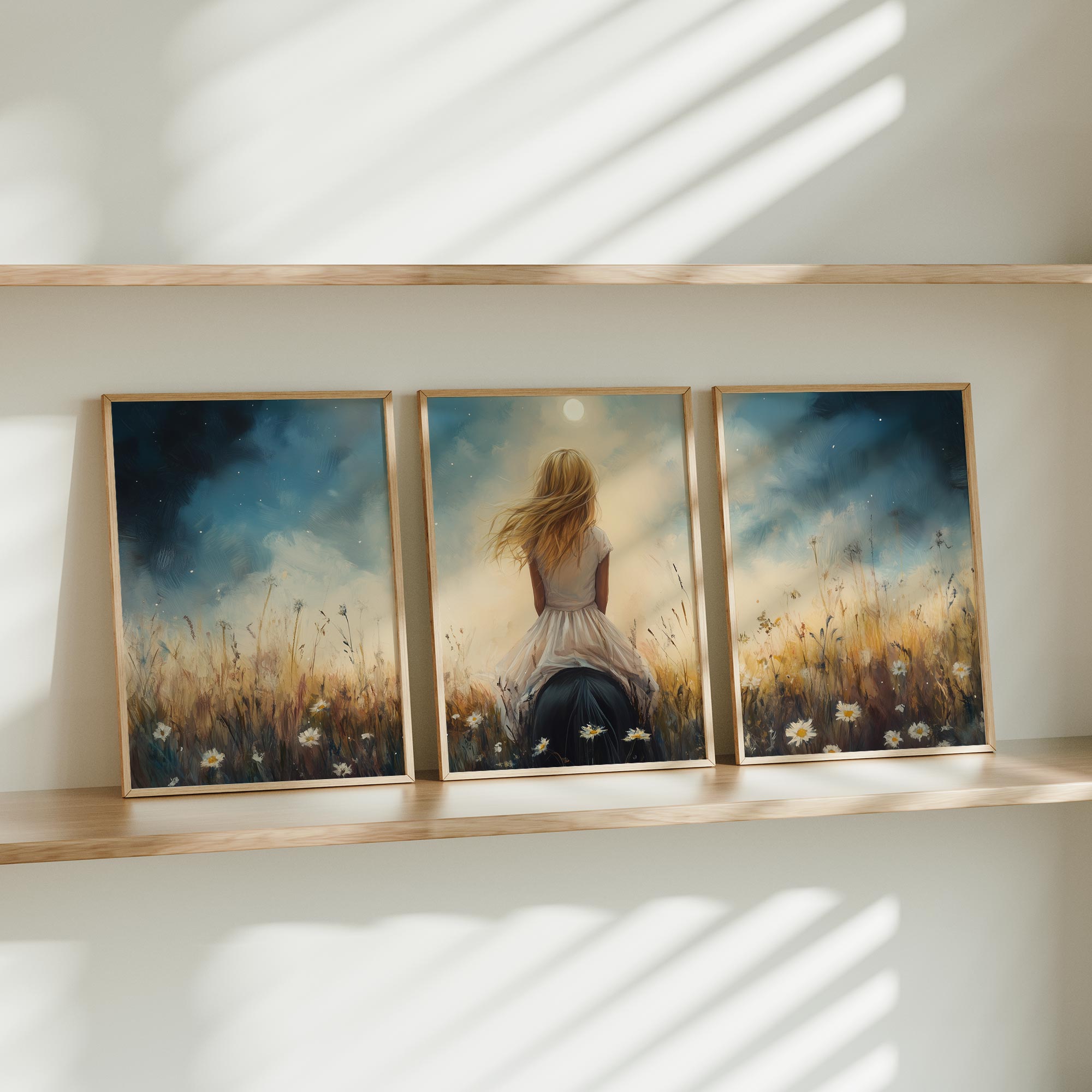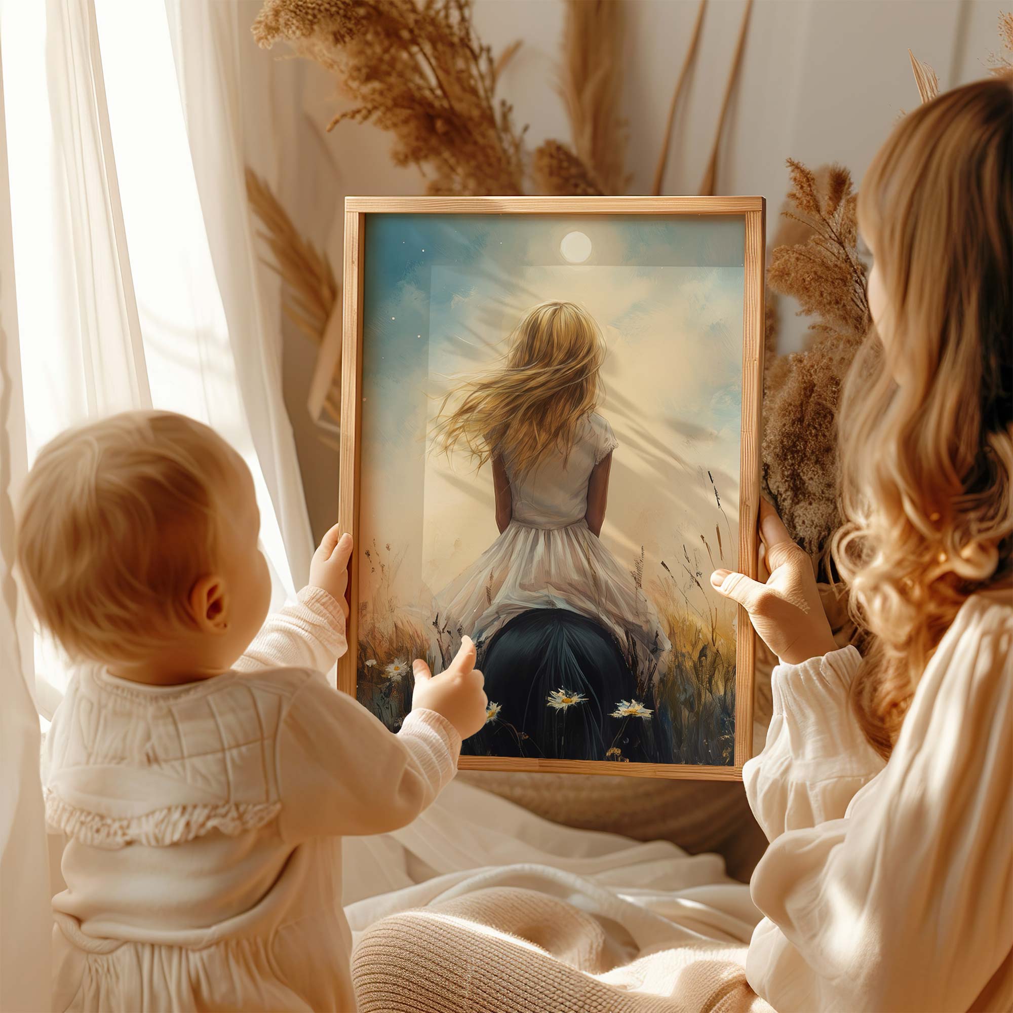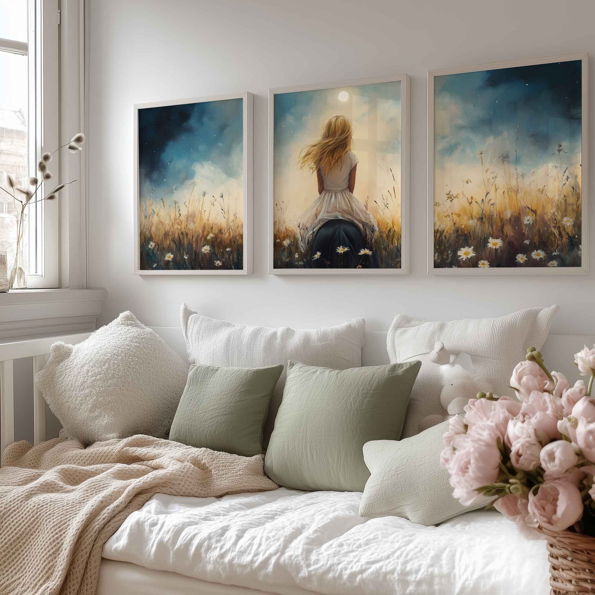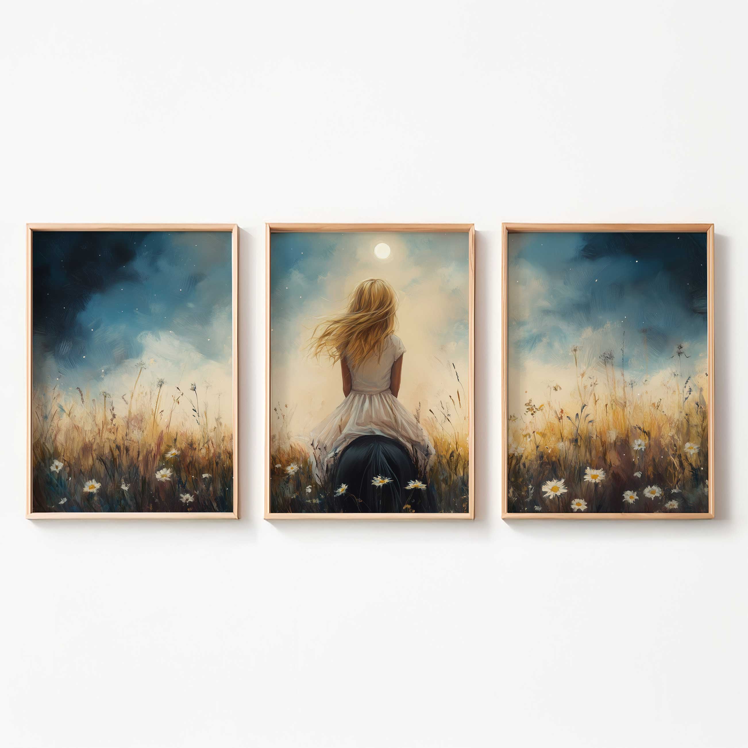 Terug naar collectie Posters Dromerig Meisje op Paard tussen Bloemen en Maan
