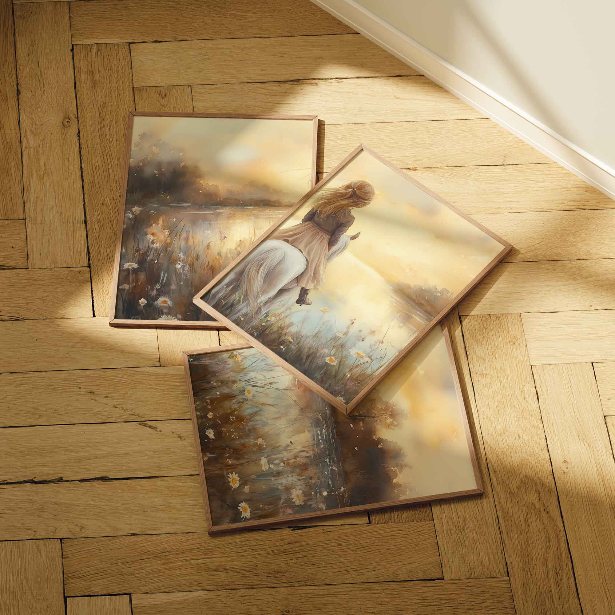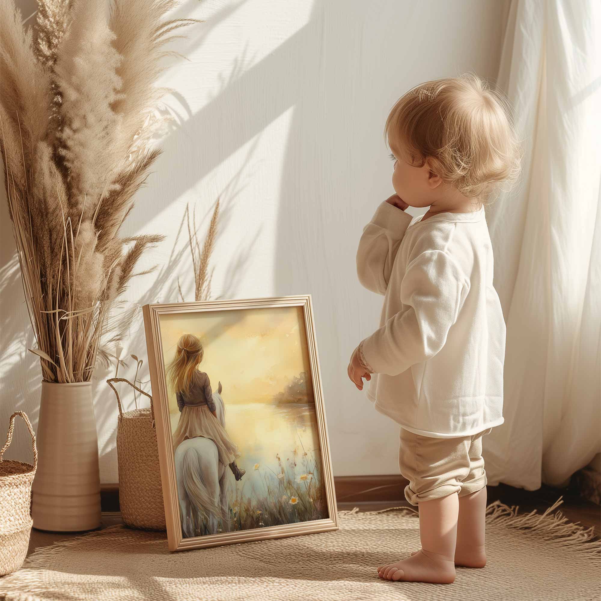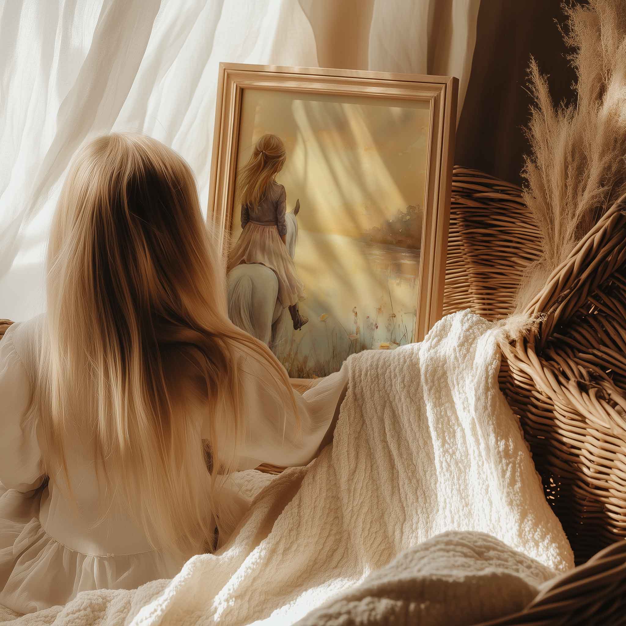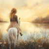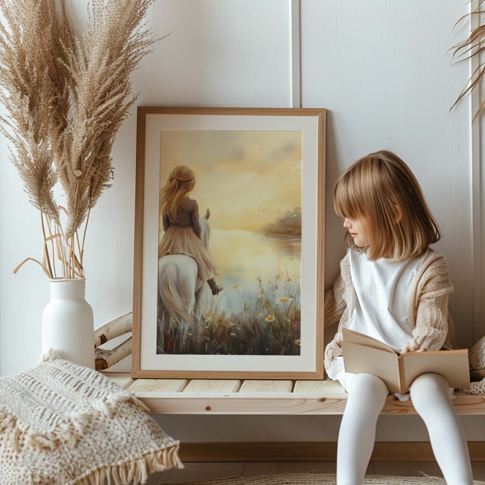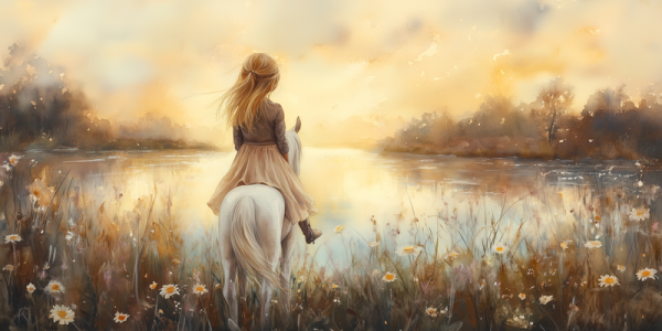 Dromerig Meisje op Wit Paard in Bloemenveld