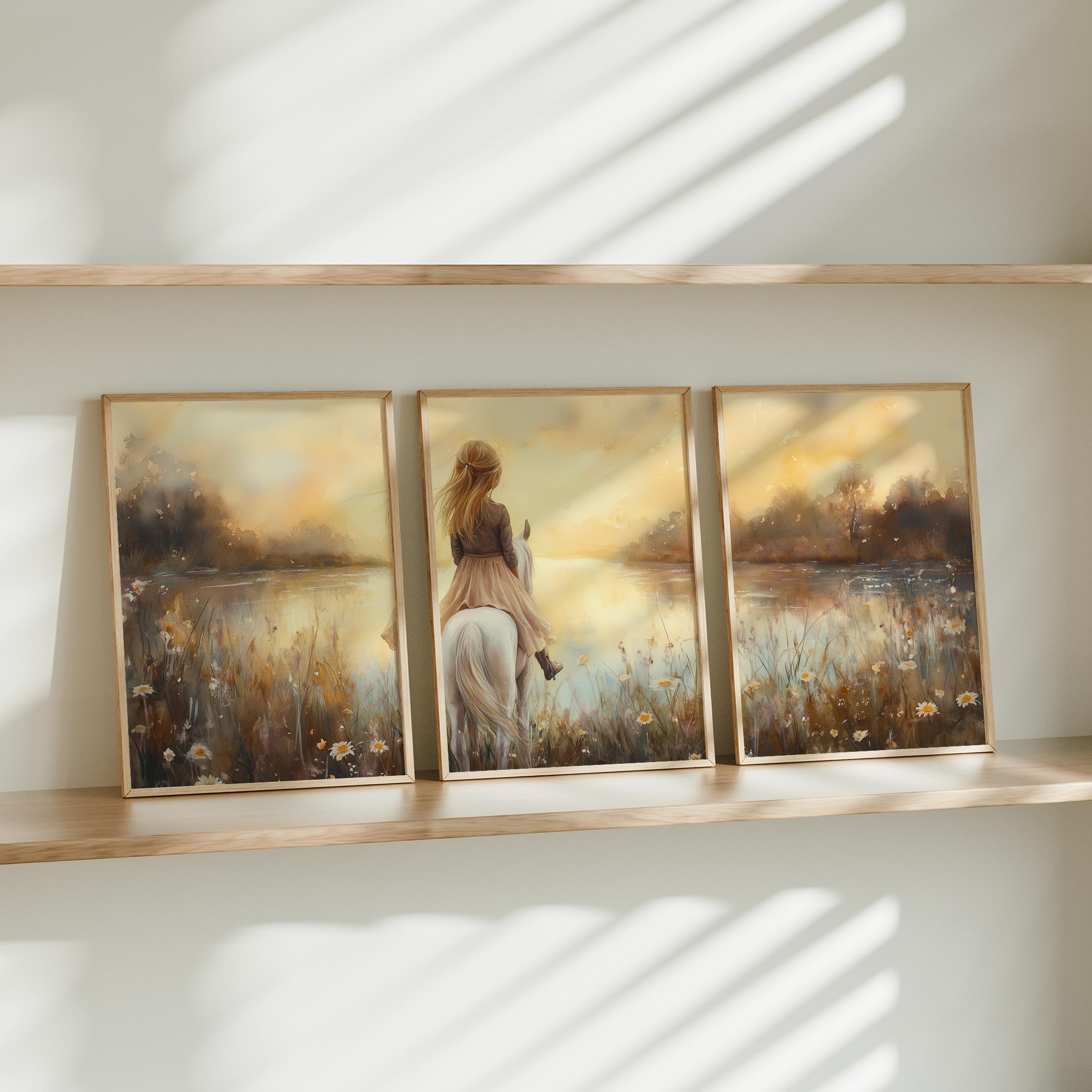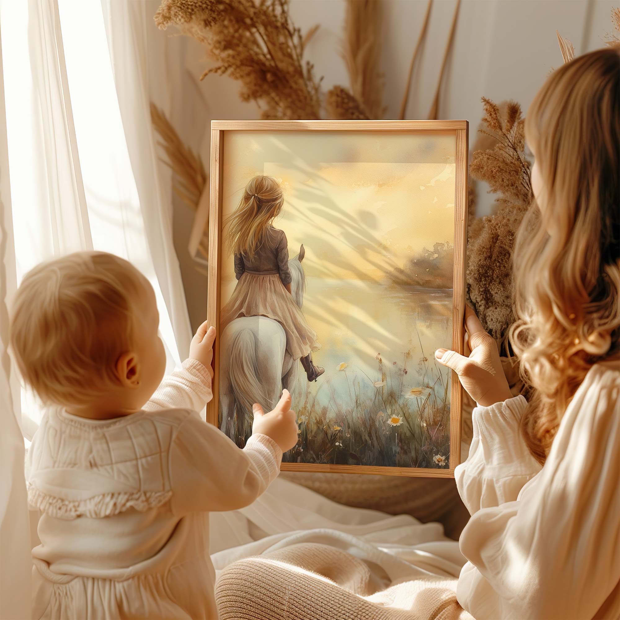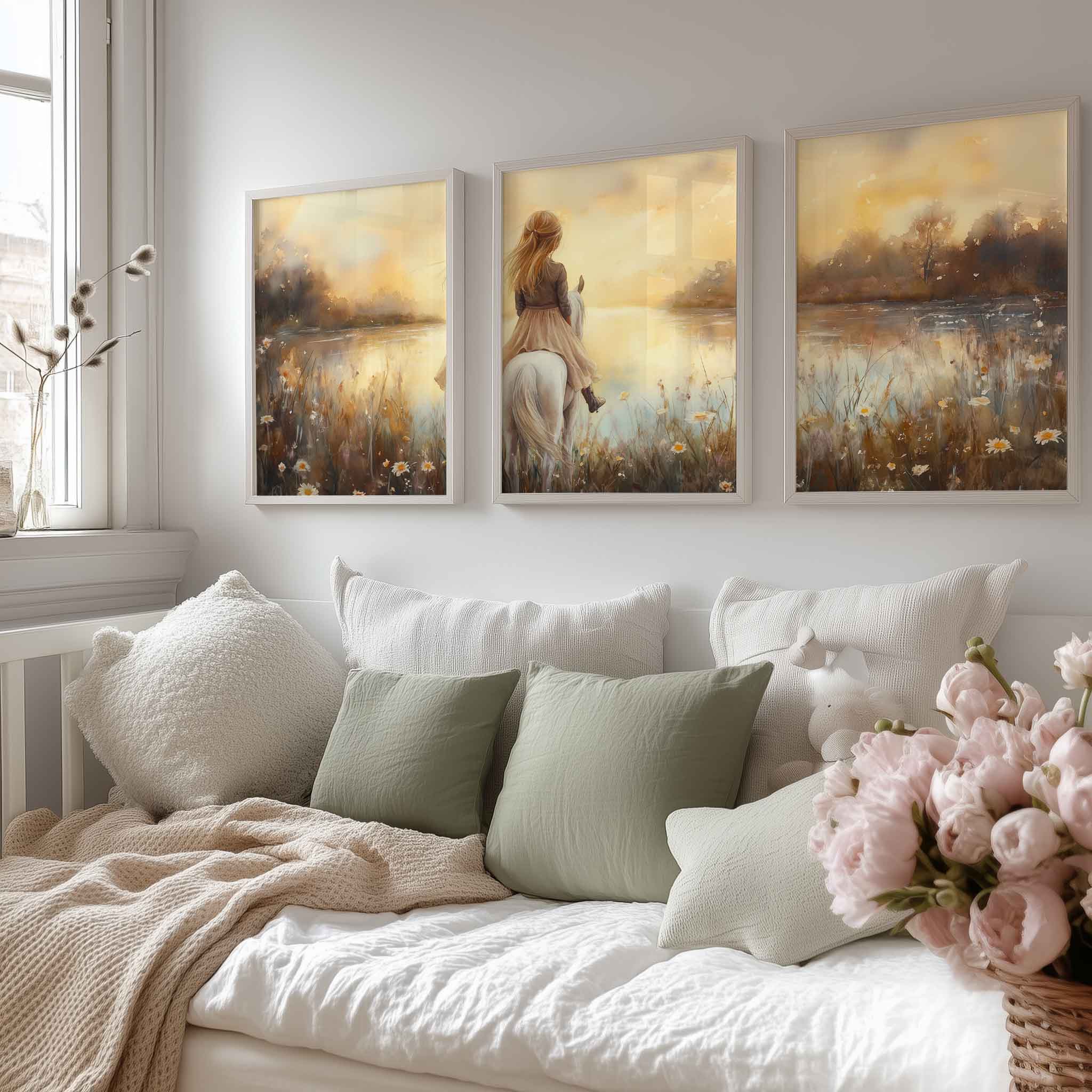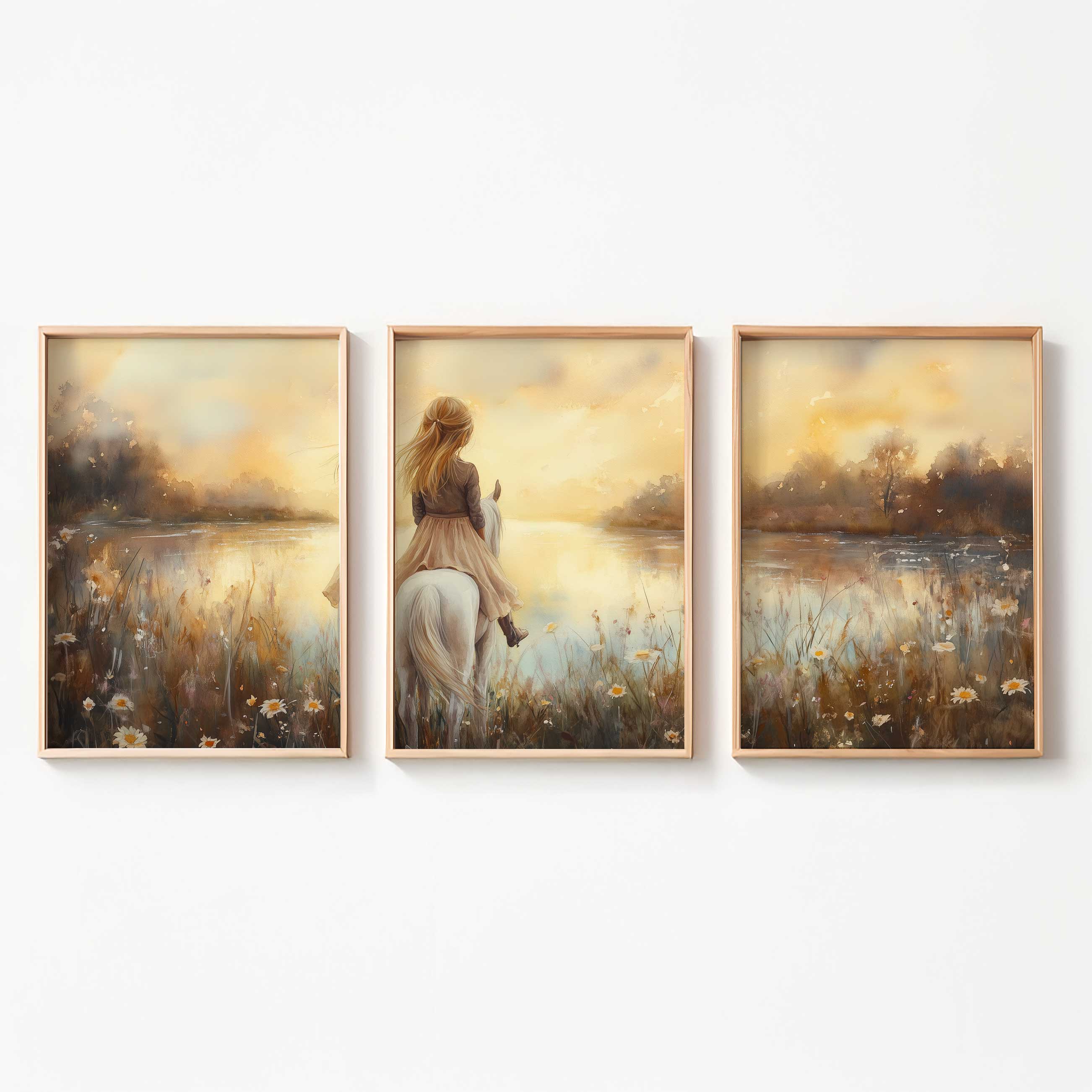 Dromerig Meisje op Wit Paard in Bloemenveld