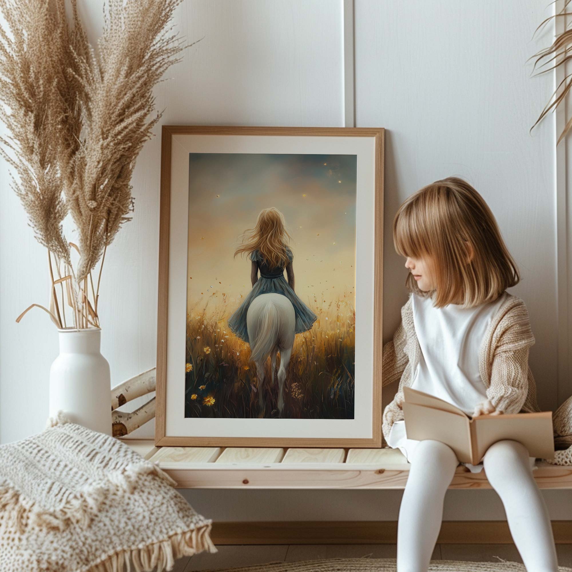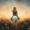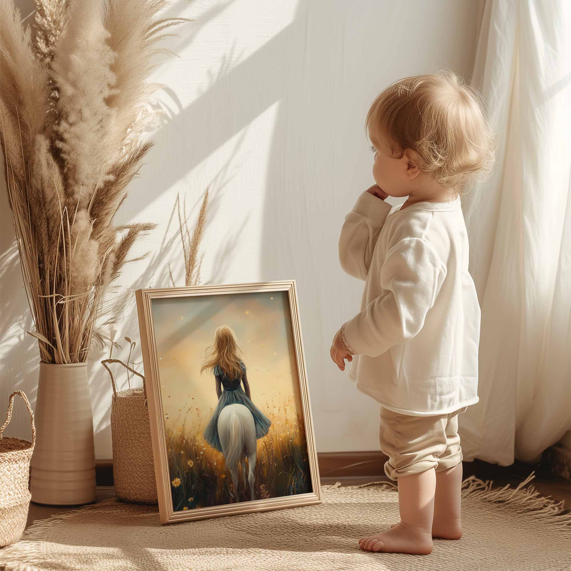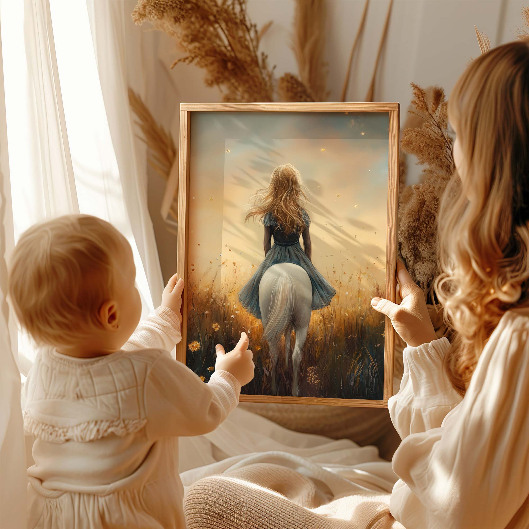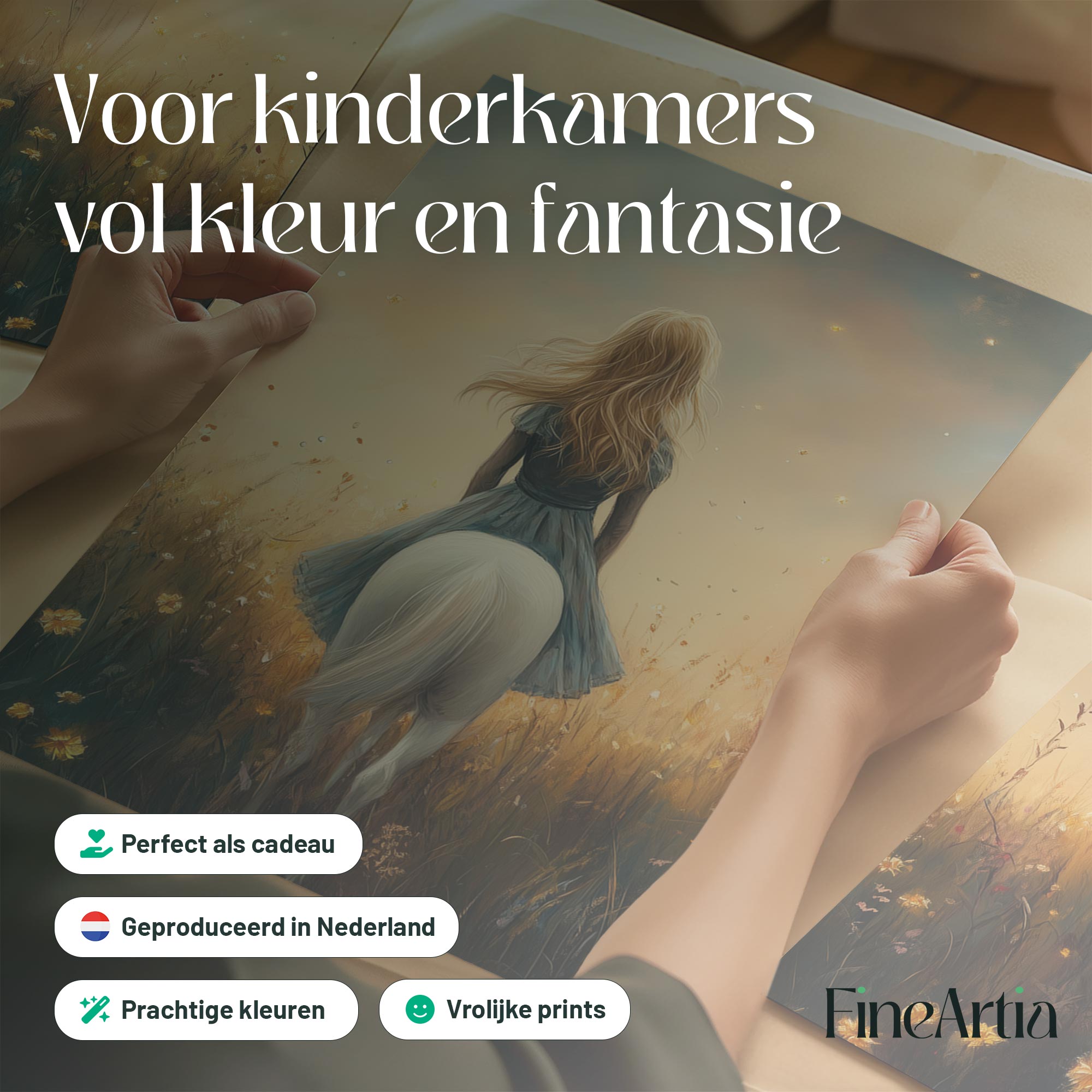 Terug naar collectie Posters Dromerig Meisje op Wit Paard tussen Bloemen