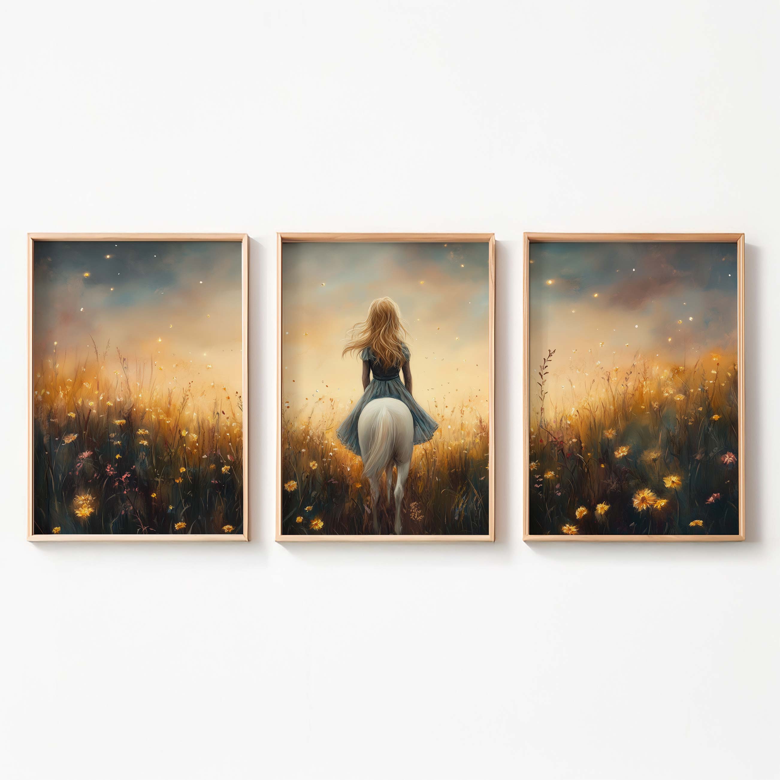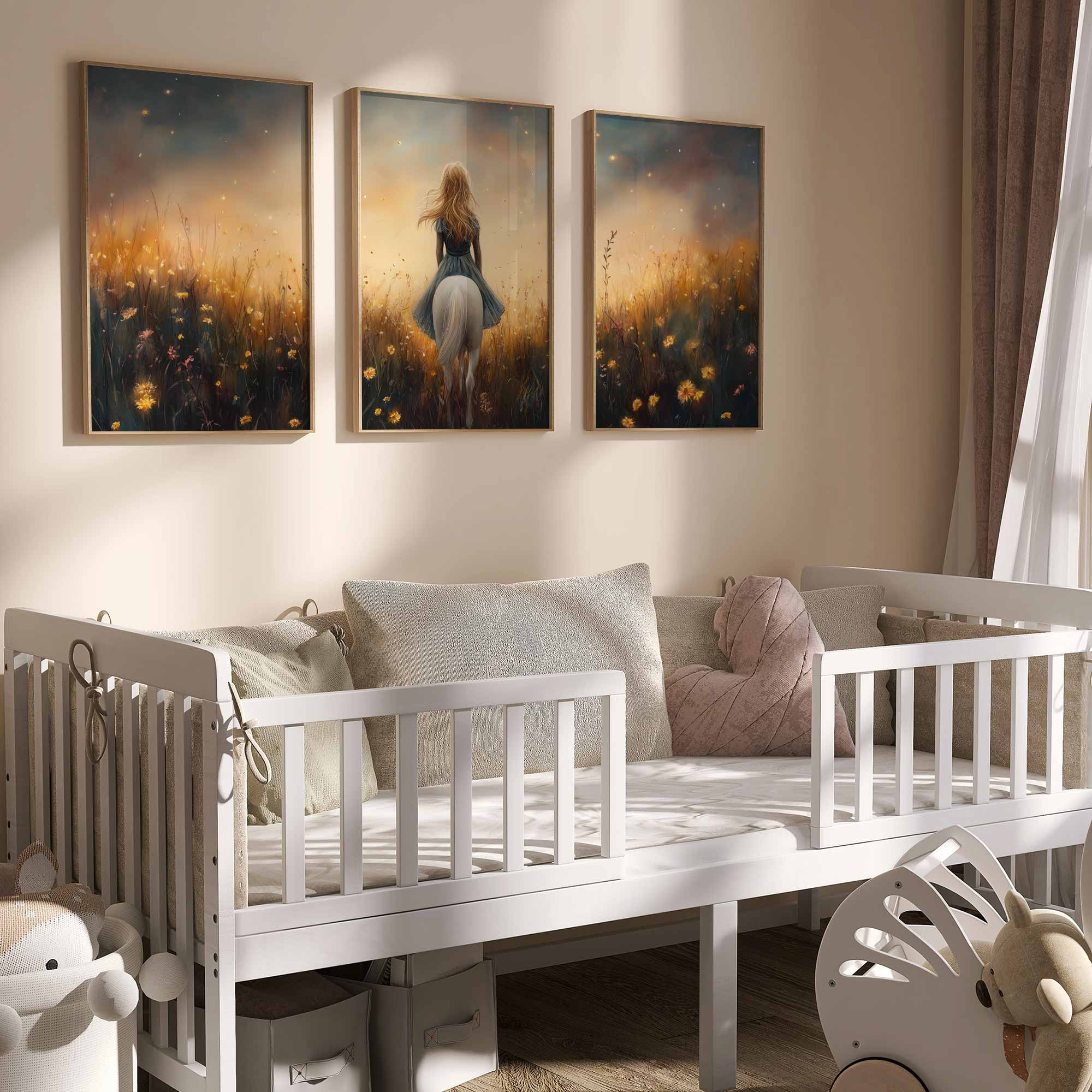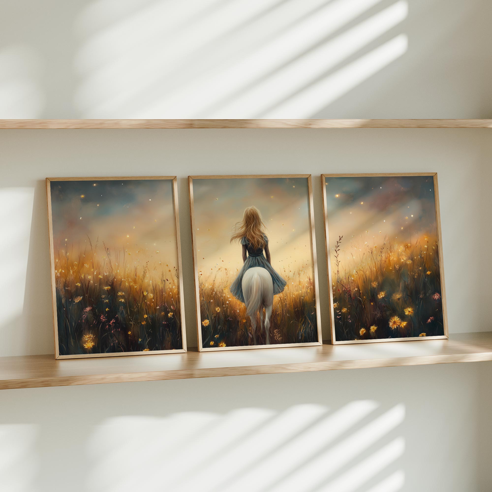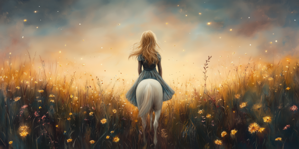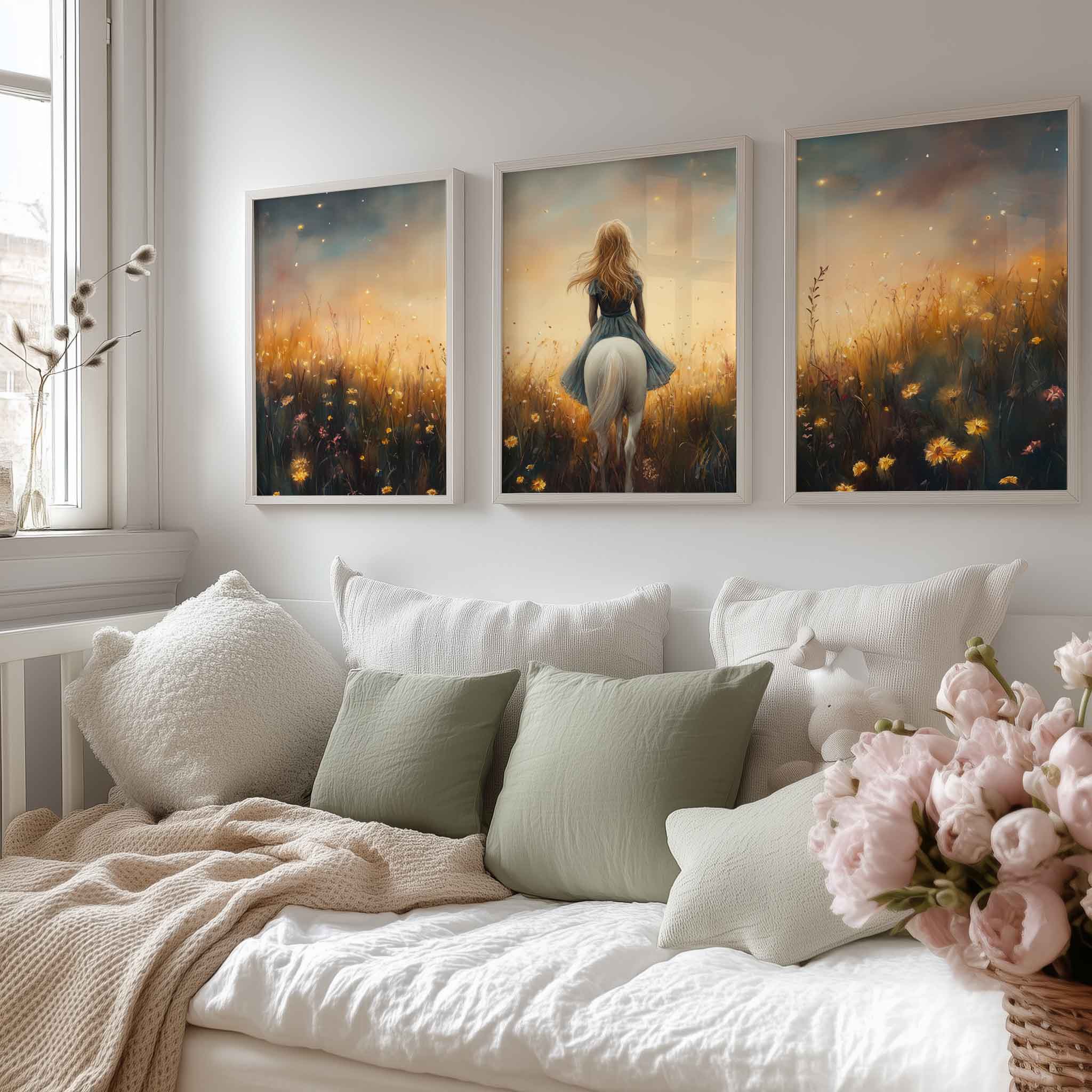 Terug naar collectie Posters Dromerig Meisje op Wit Paard tussen Bloemen
