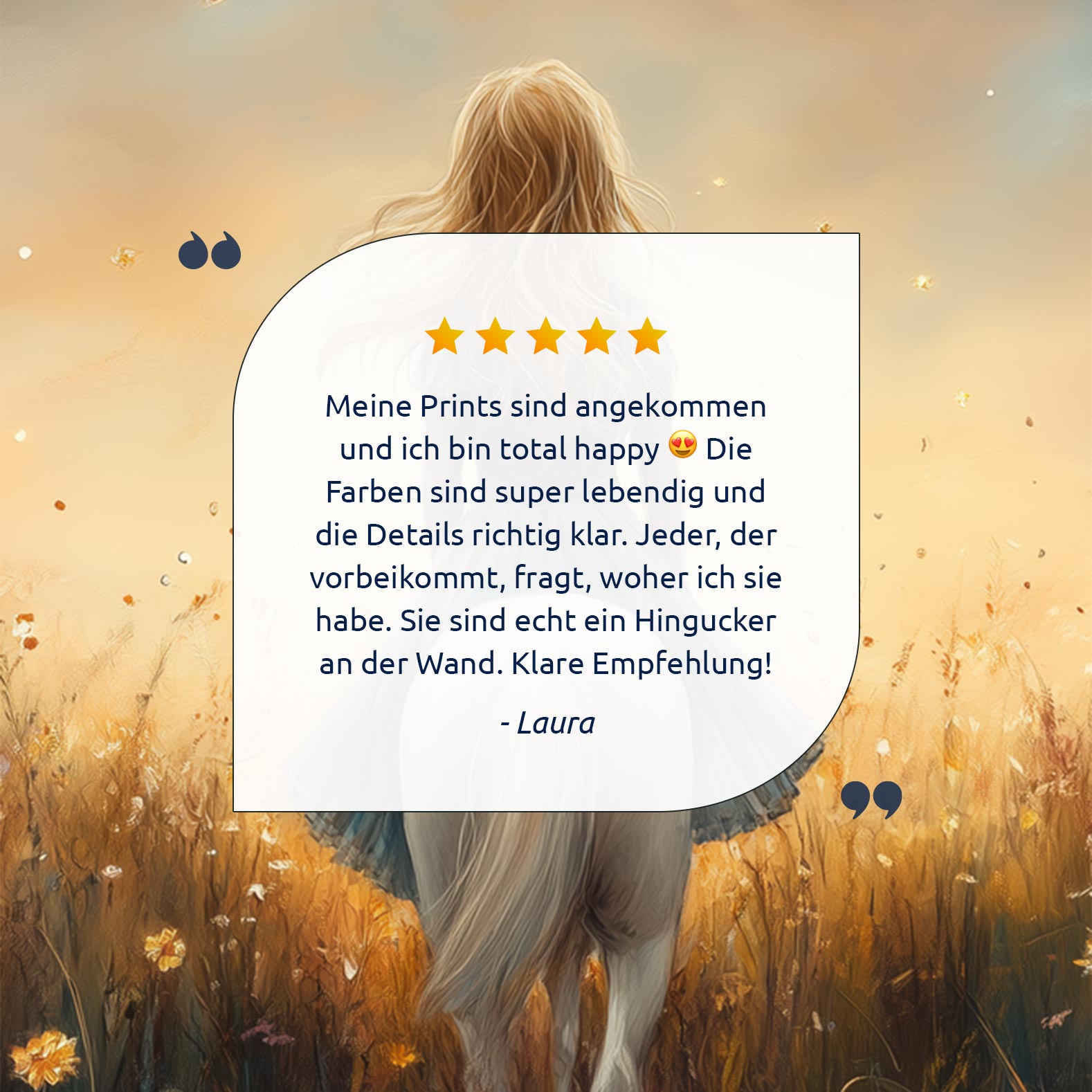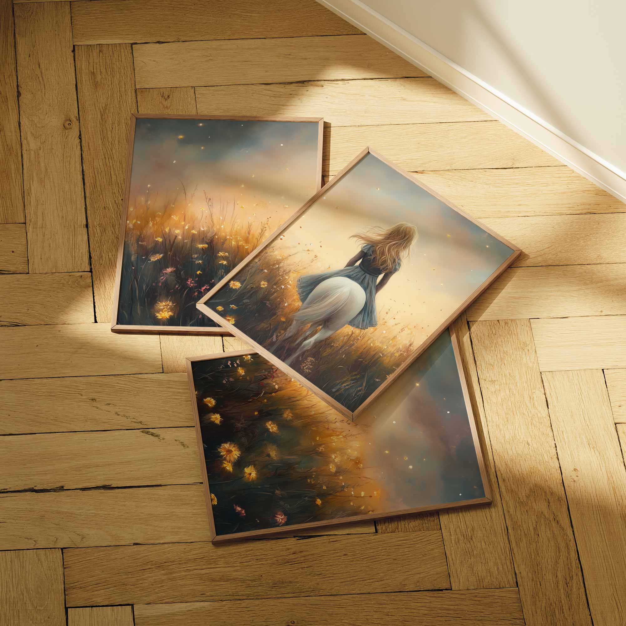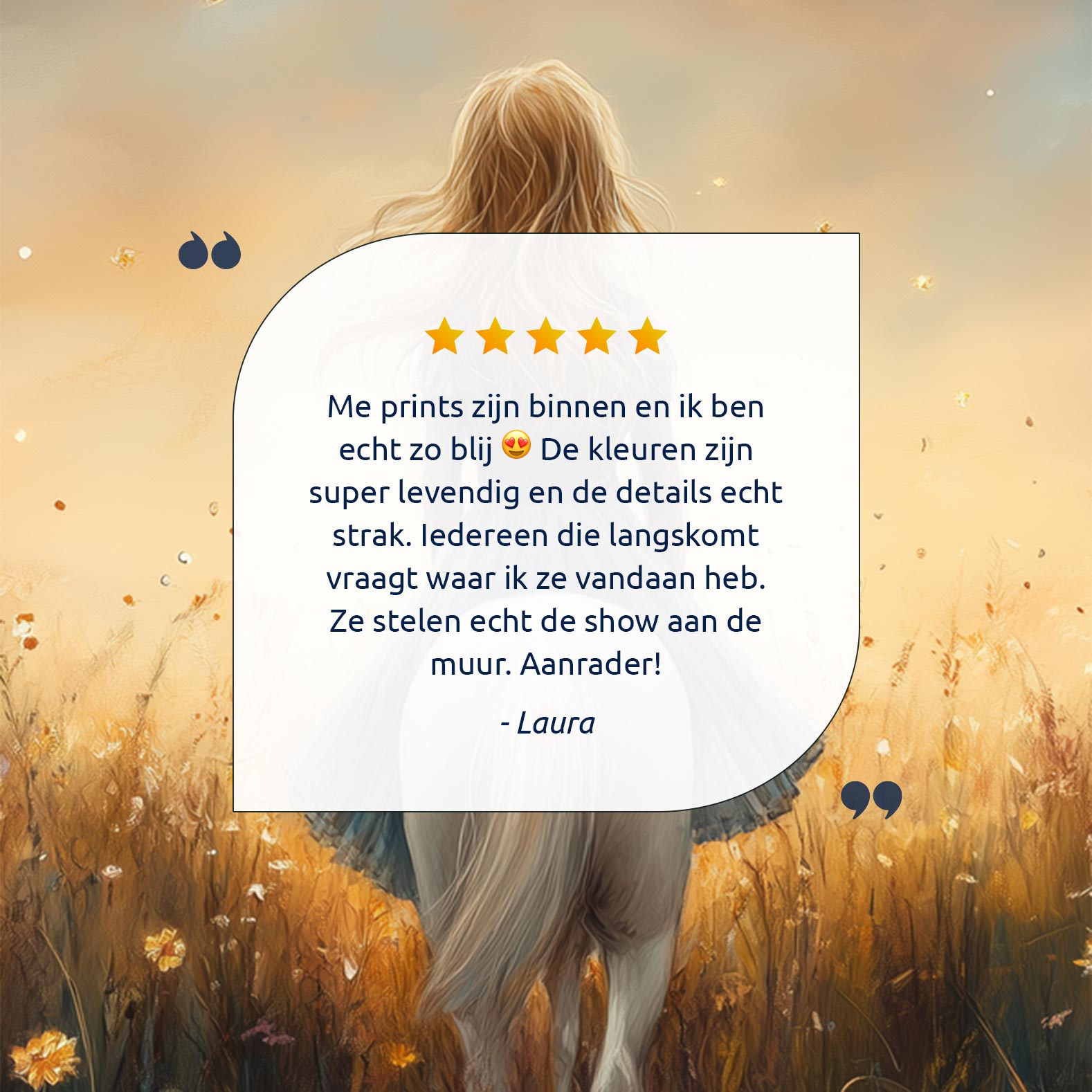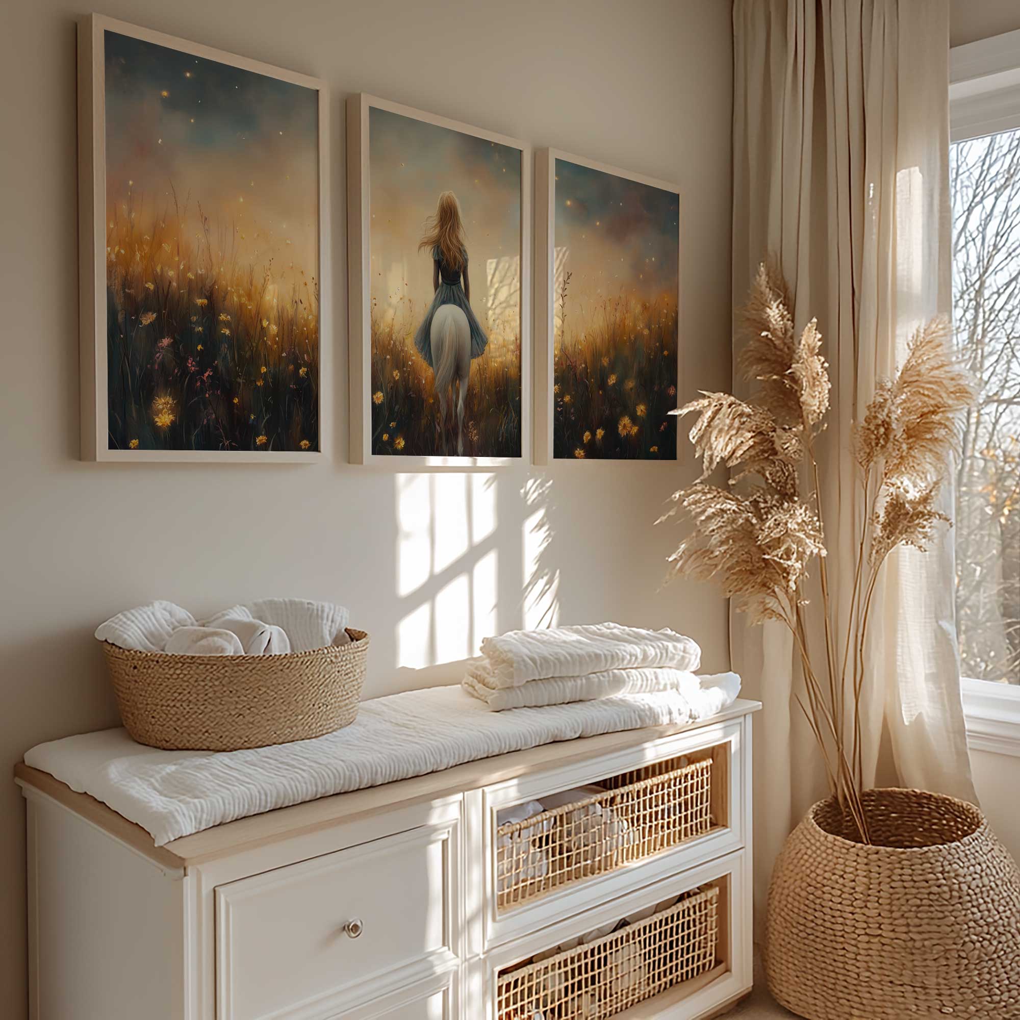 Terug naar collectie Posters Dromerig Meisje op Wit Paard tussen Bloemen