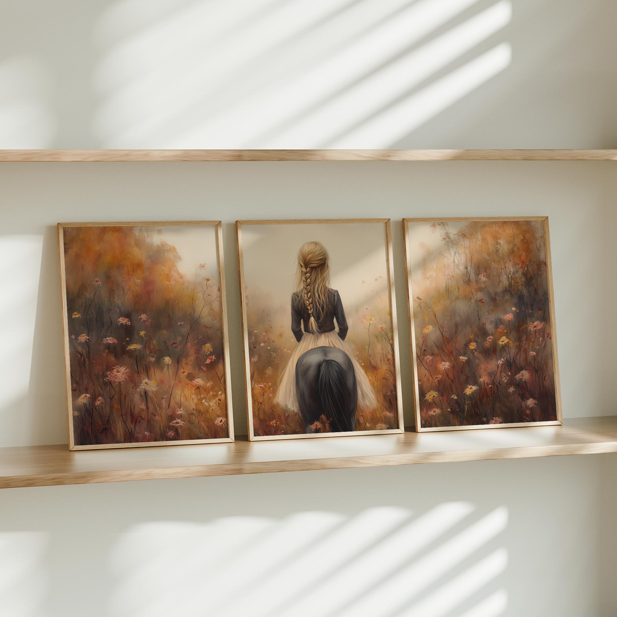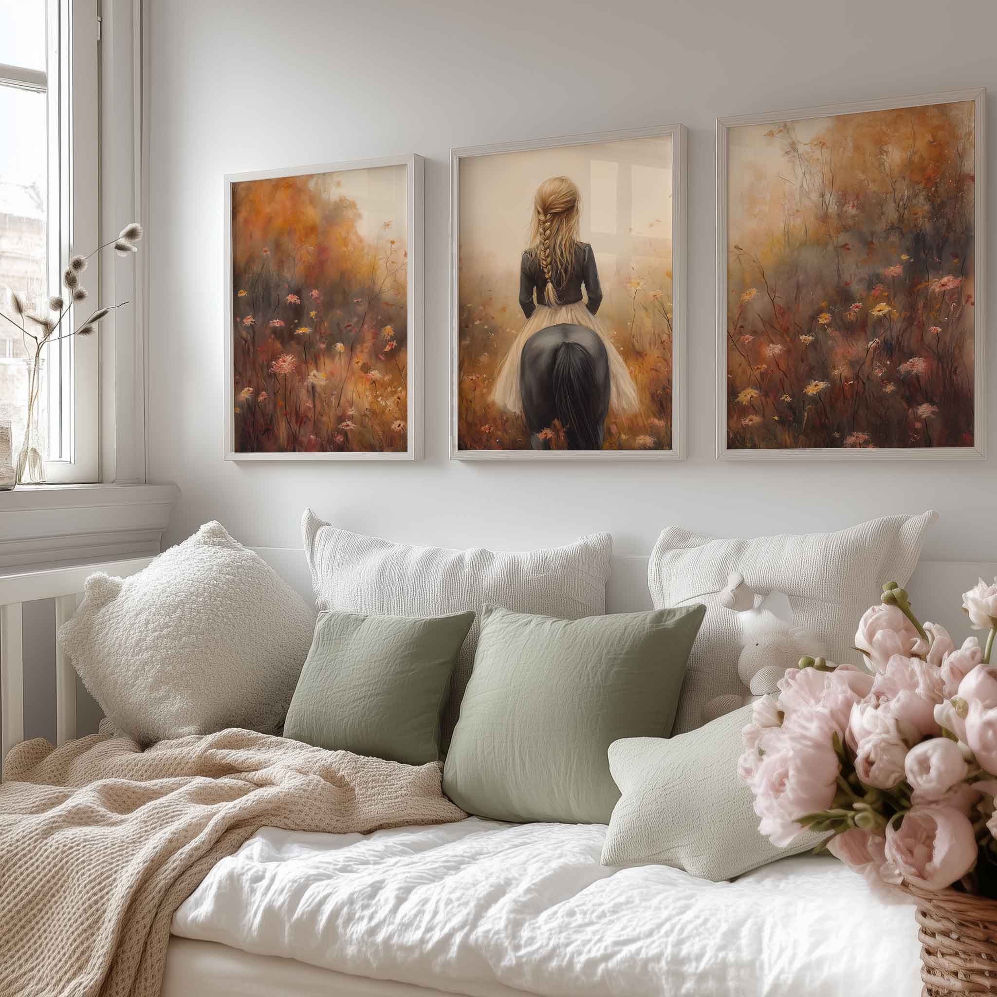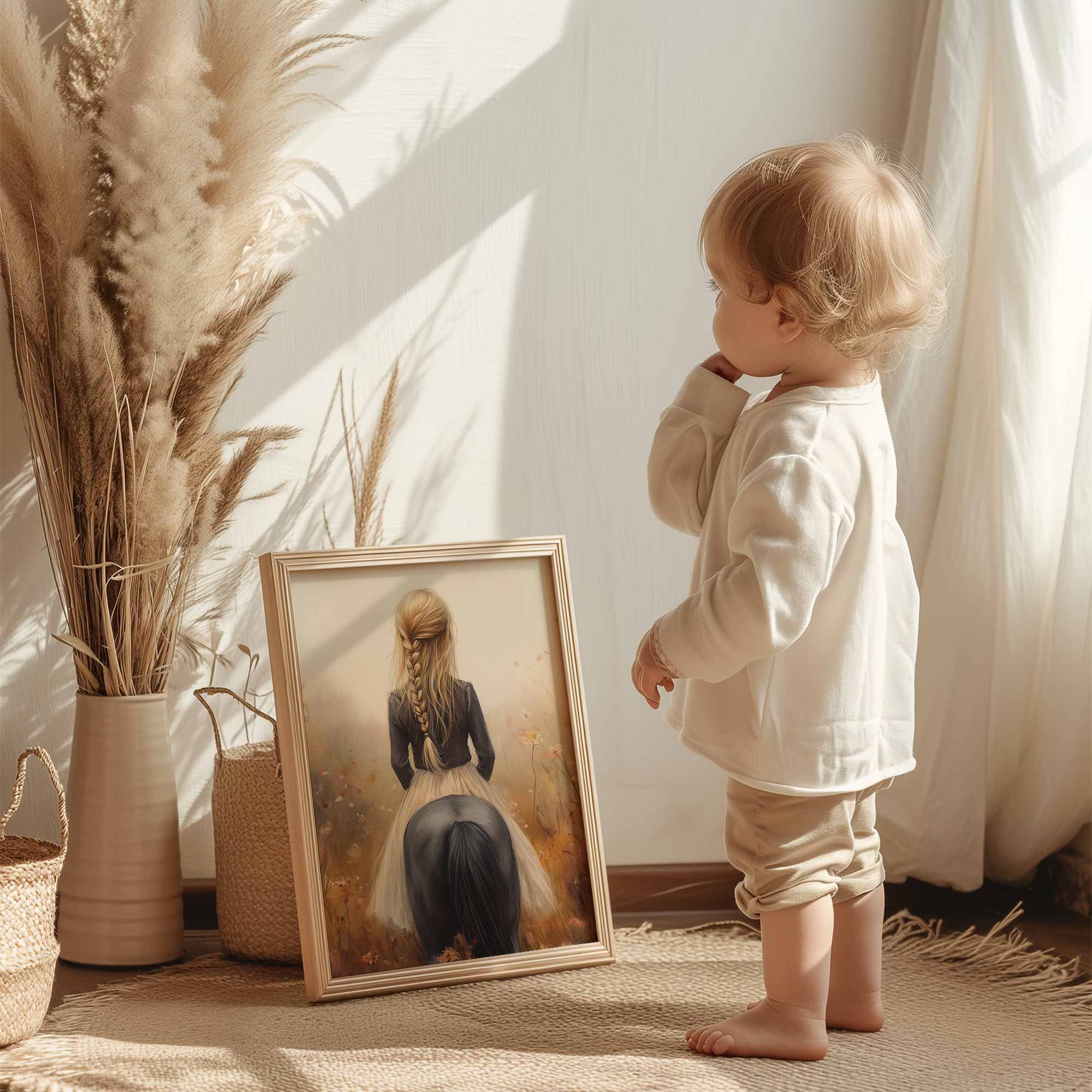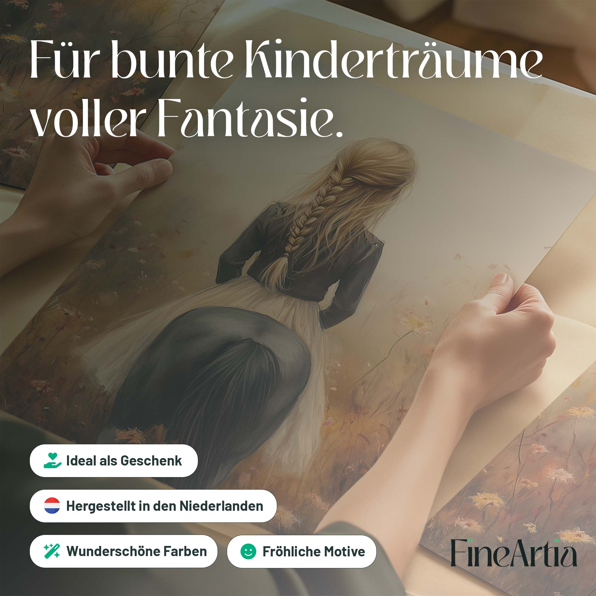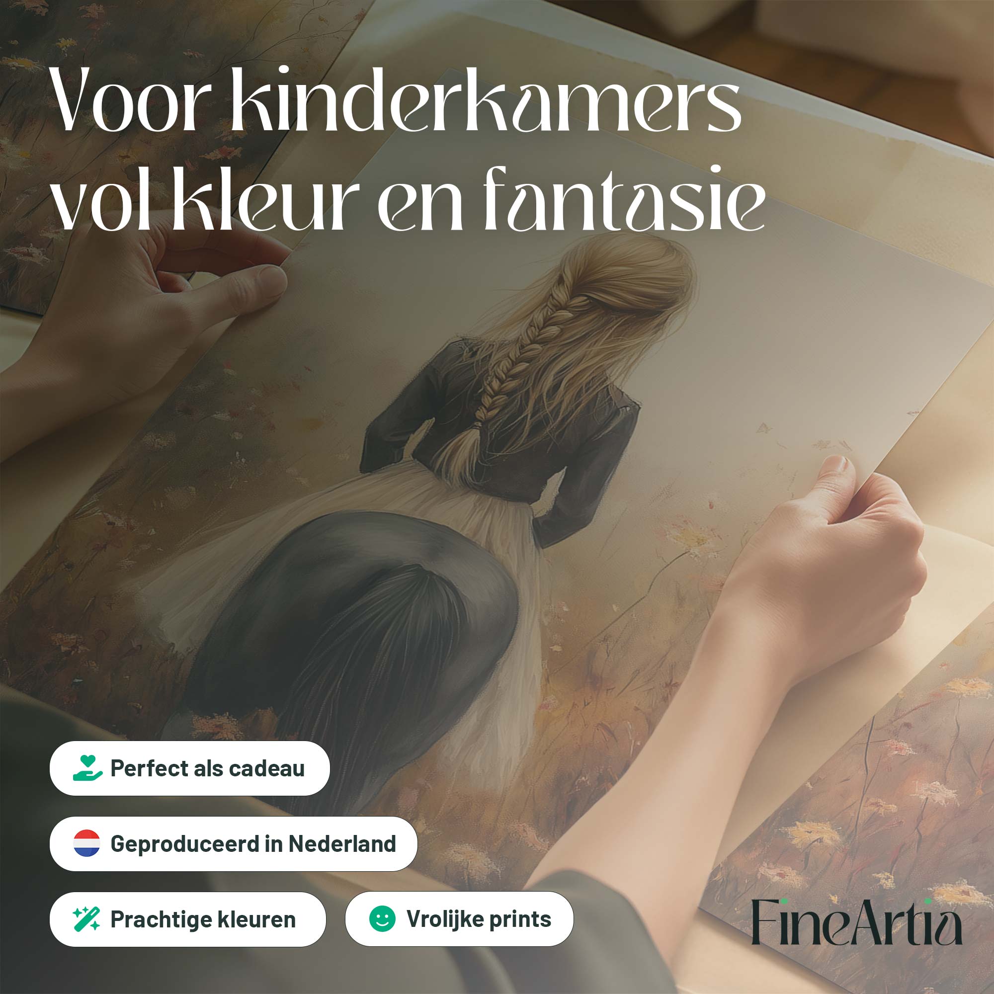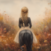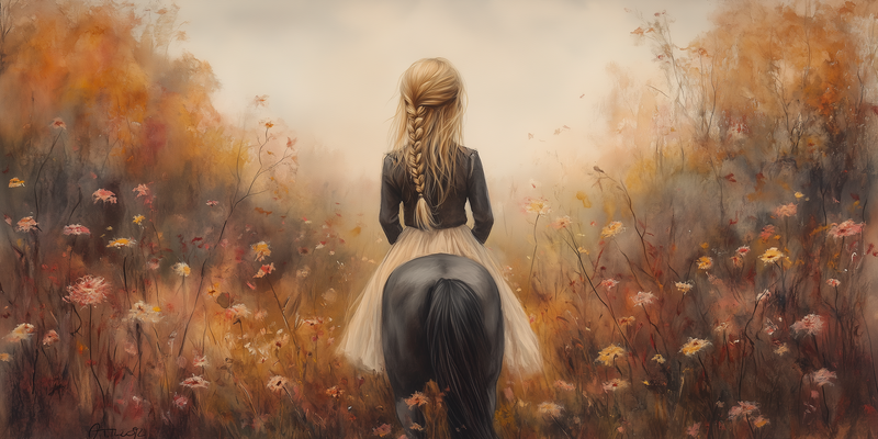 Dromerig Meisje te Paard in Bloeiend Pastel Landschap