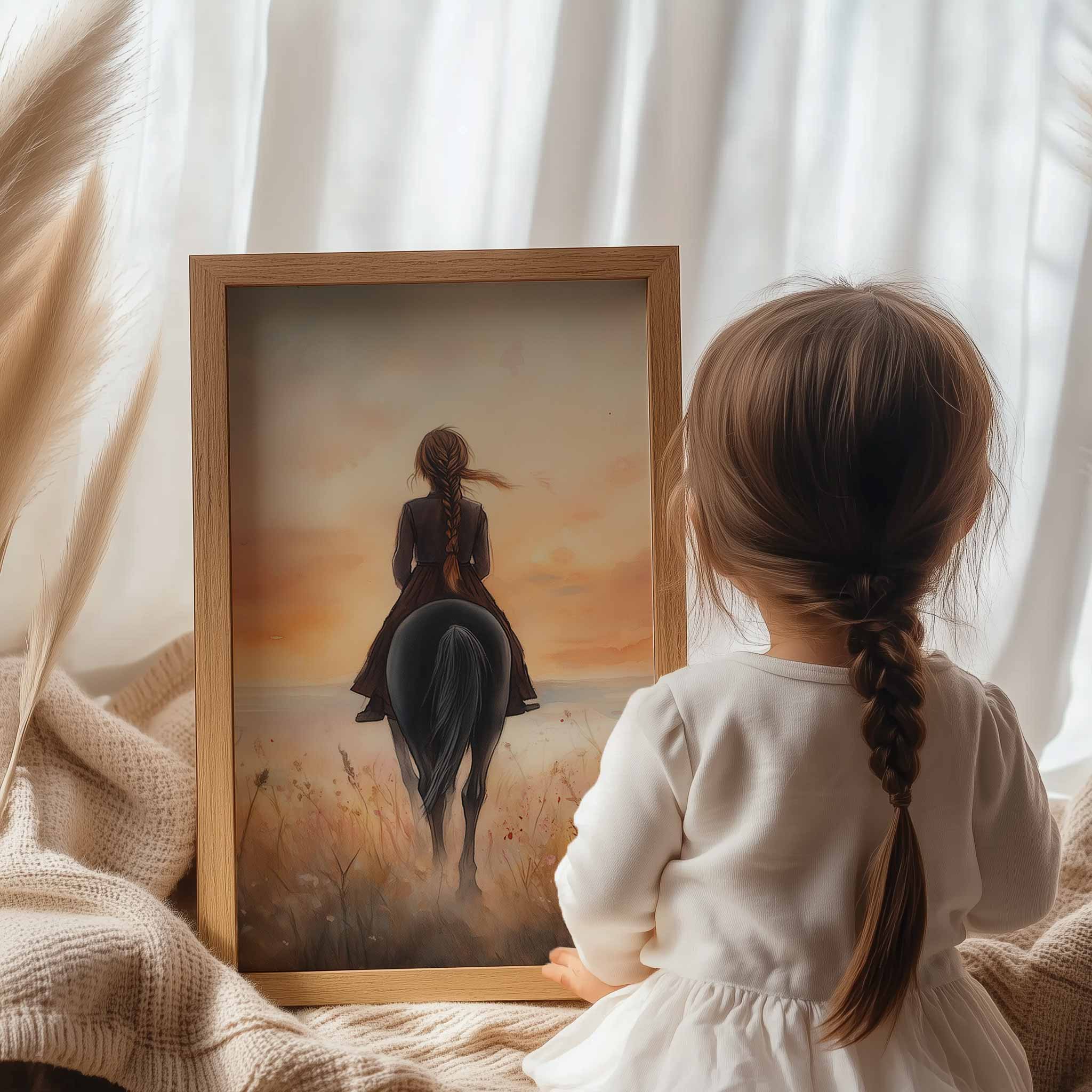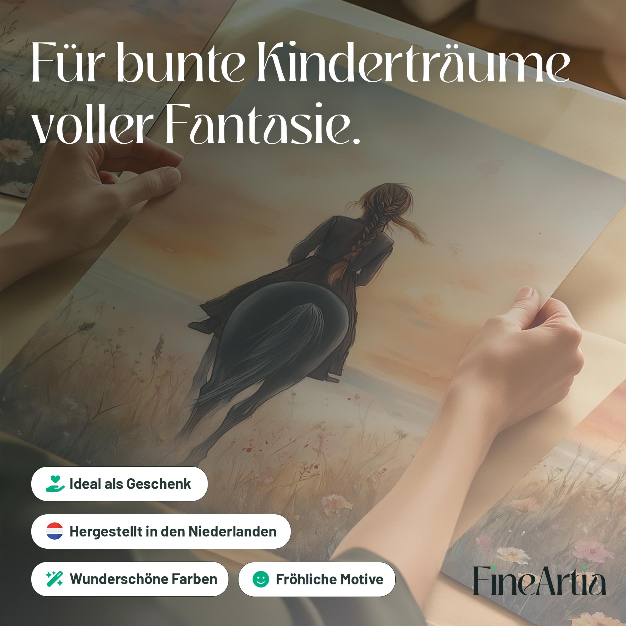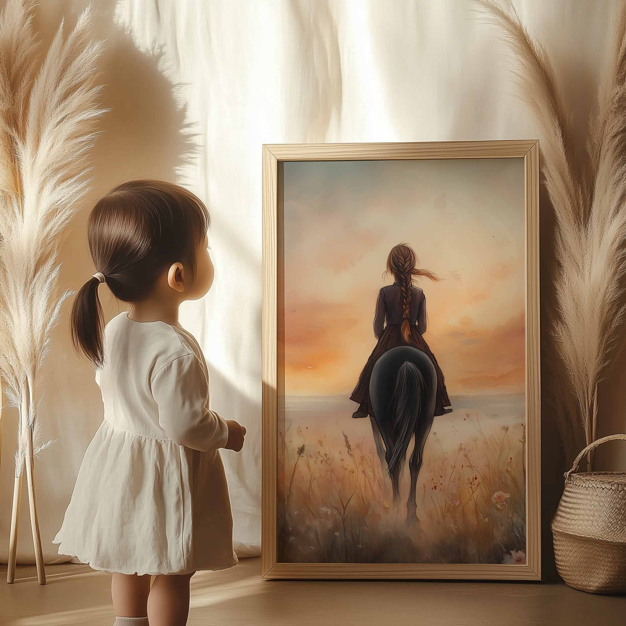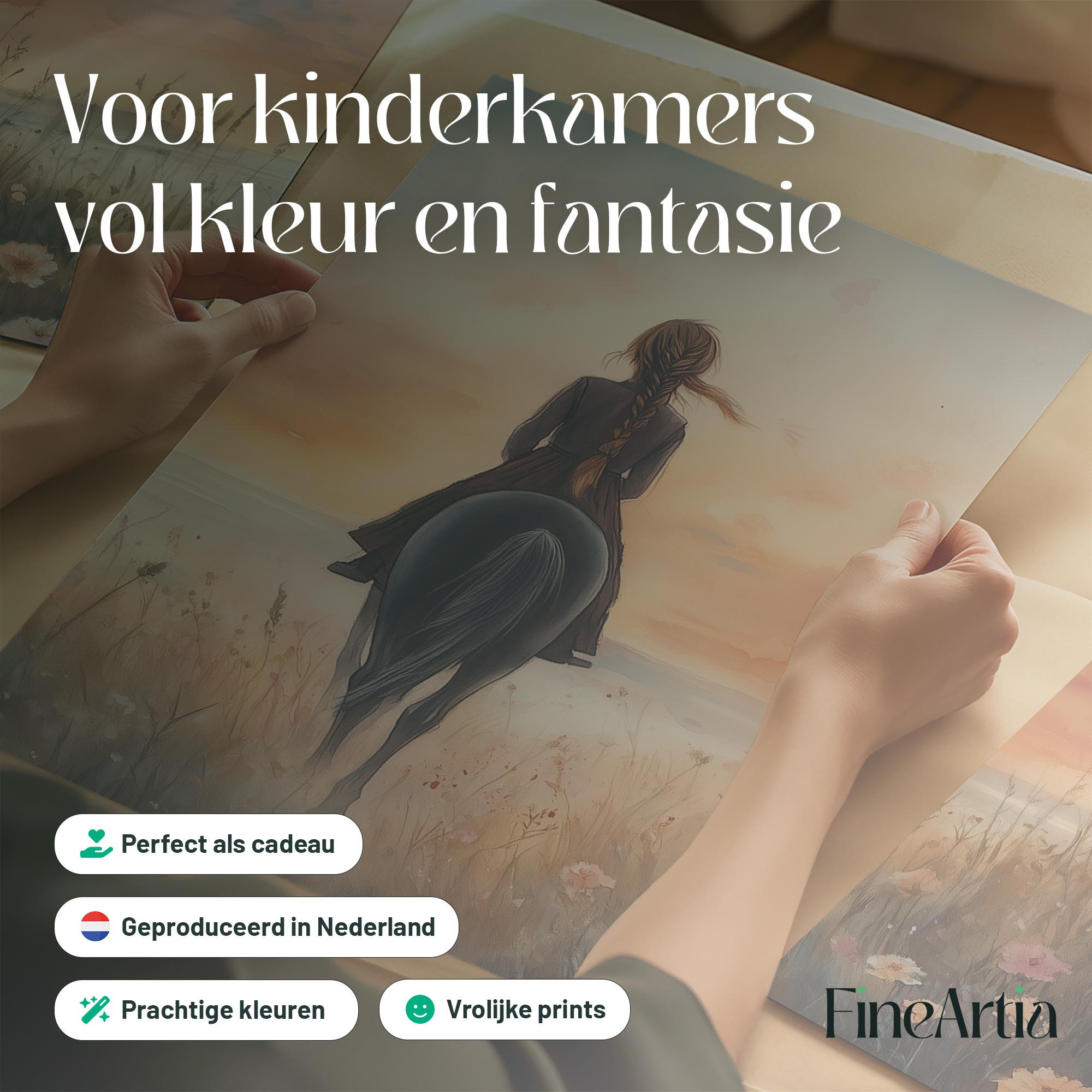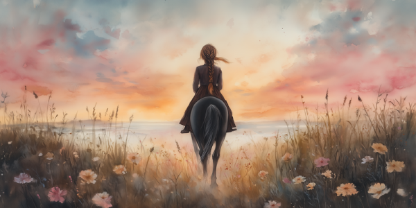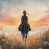 Dromerig Meisje te Paard in Bloemenveld bij Zonsondergang