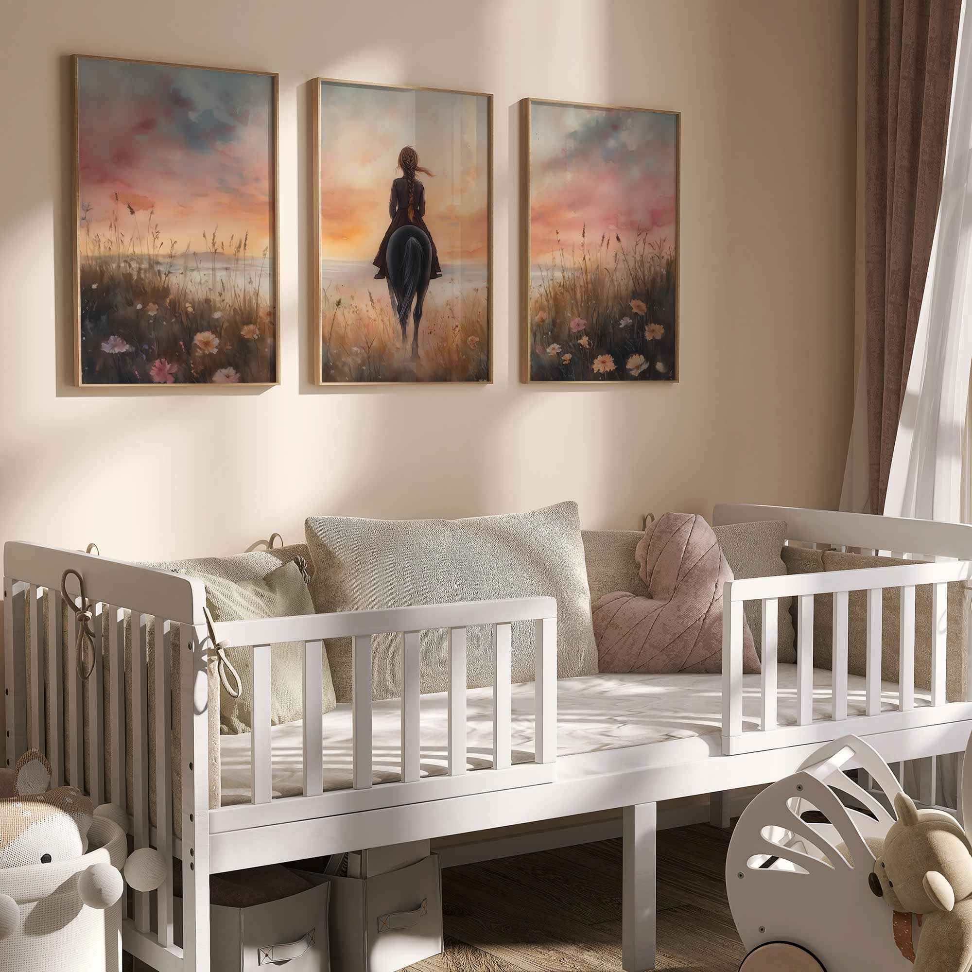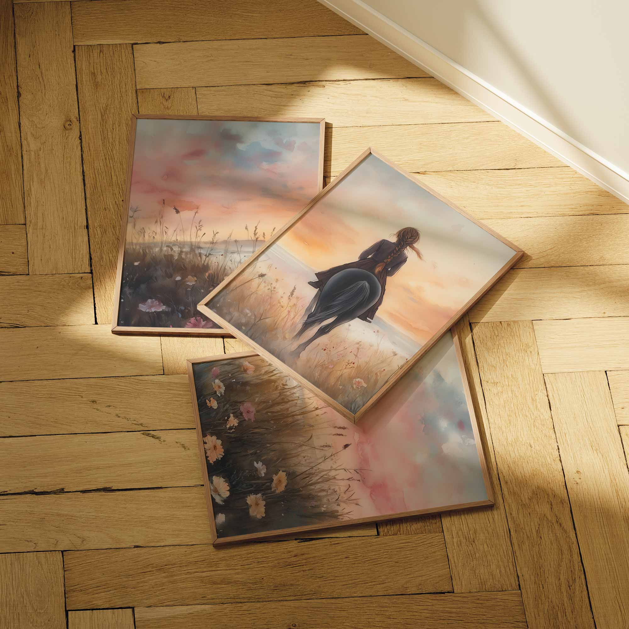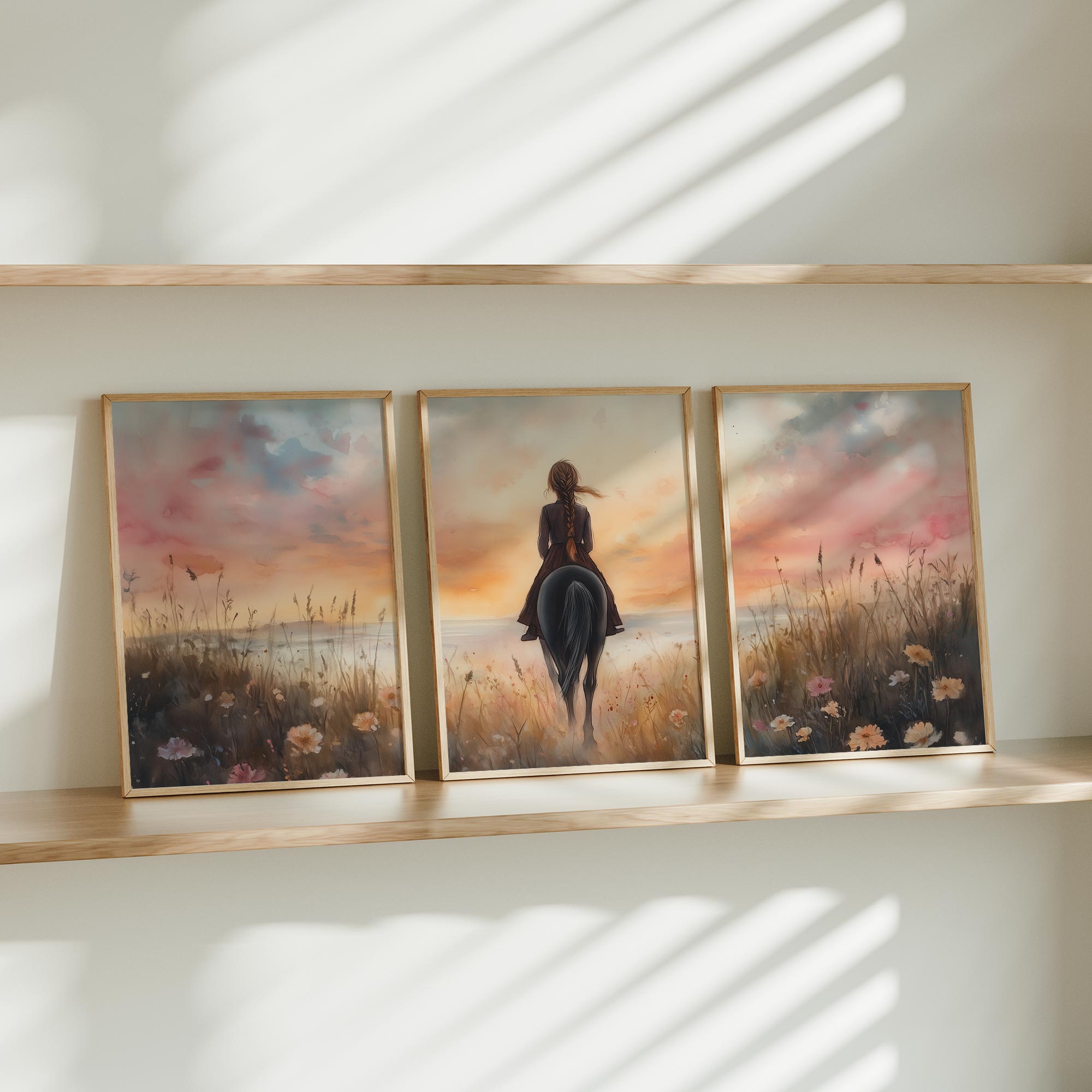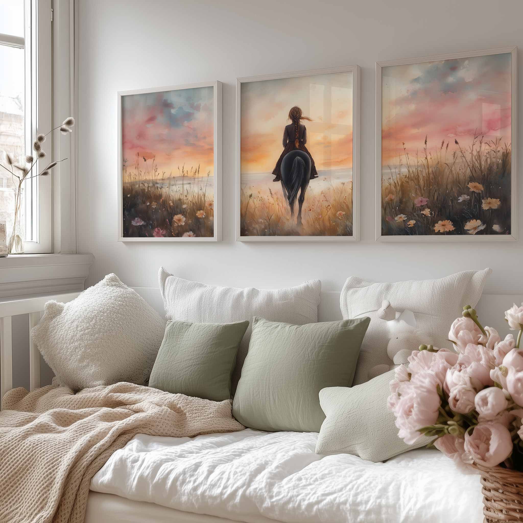 Dromerig Meisje te Paard in Bloemenveld bij Zonsondergang