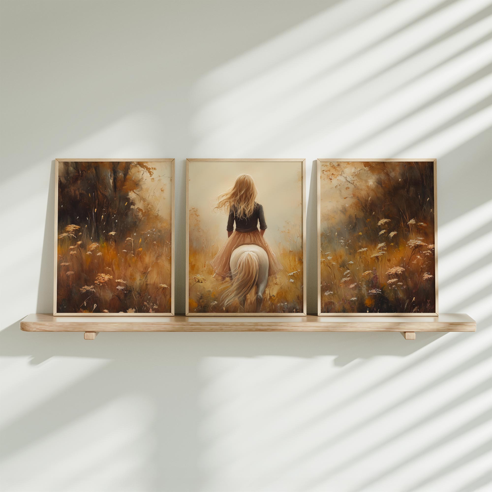 Terug naar collectie Posters Dromerig Meisje te Paard in Bloemenveld bij Zonsondergang