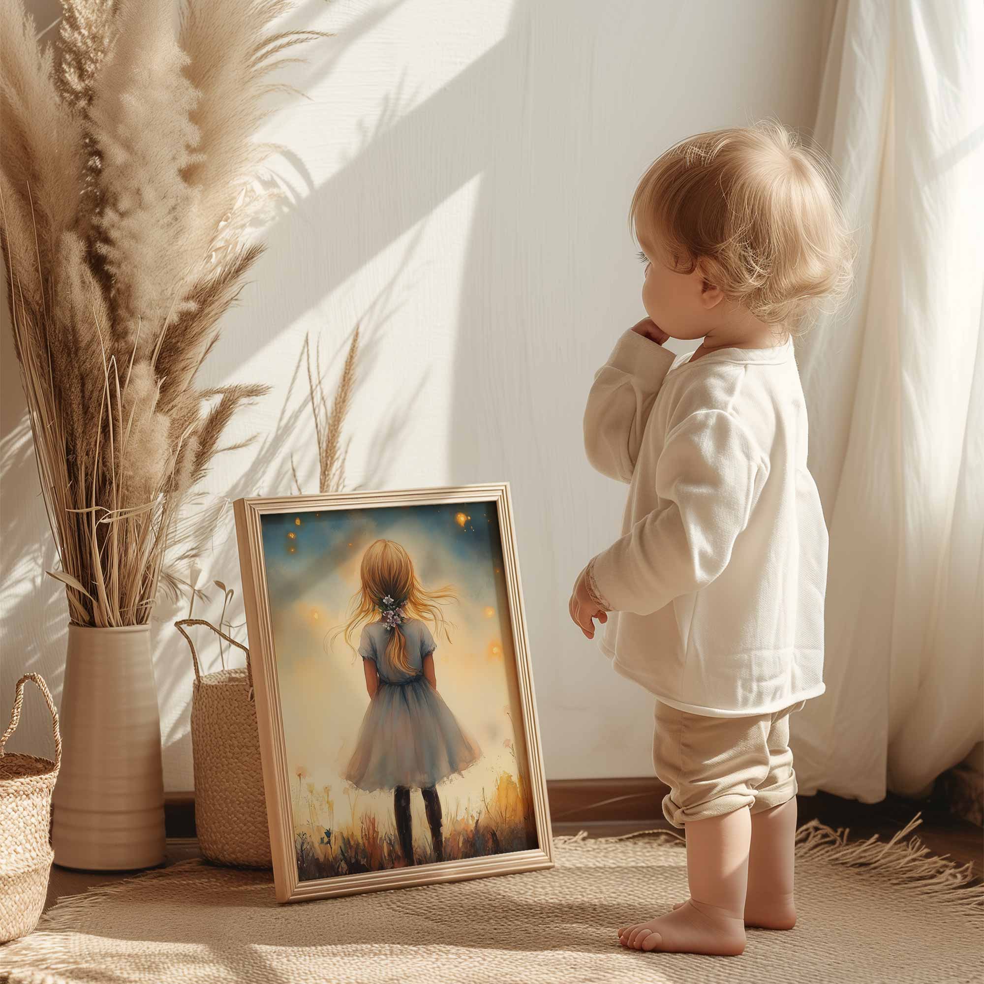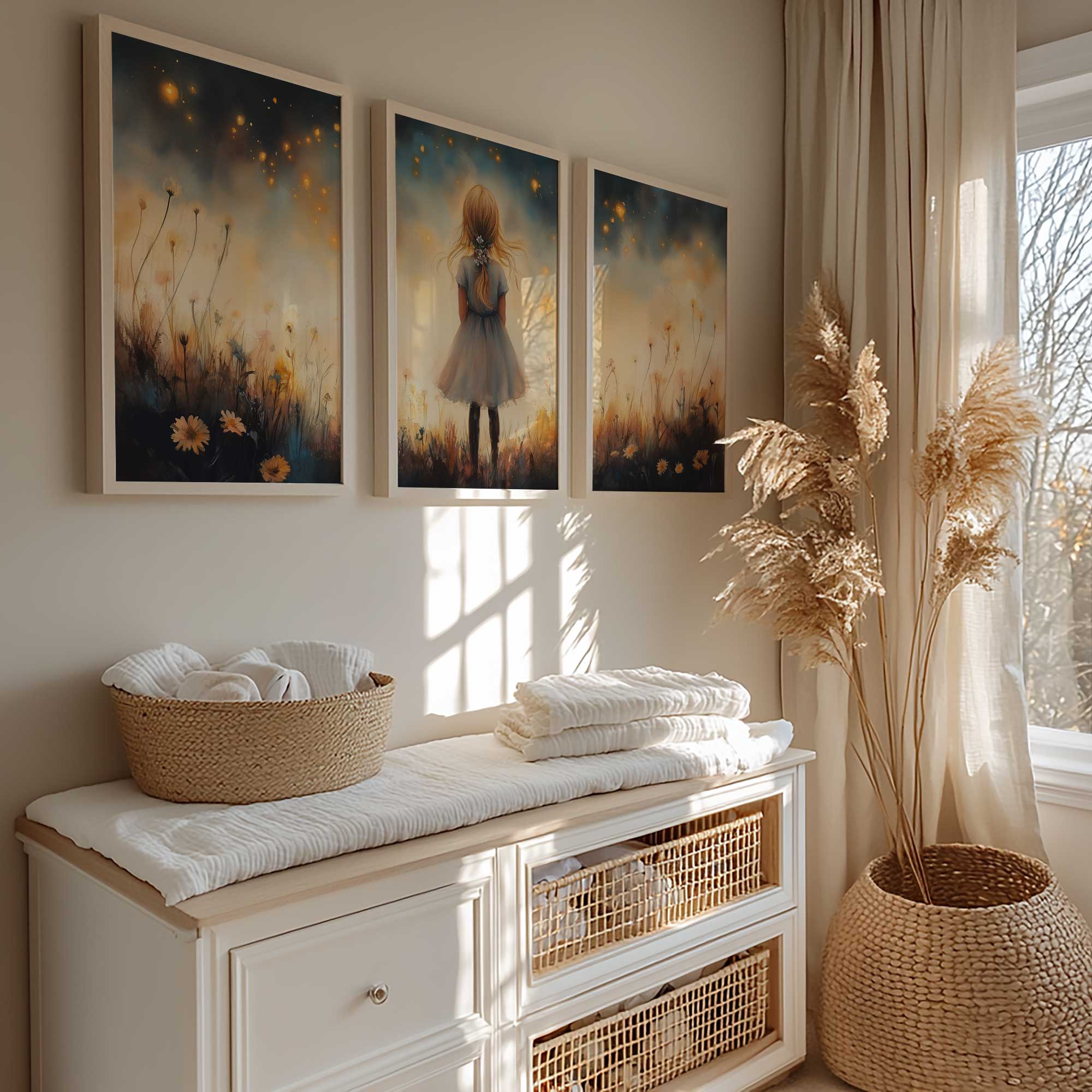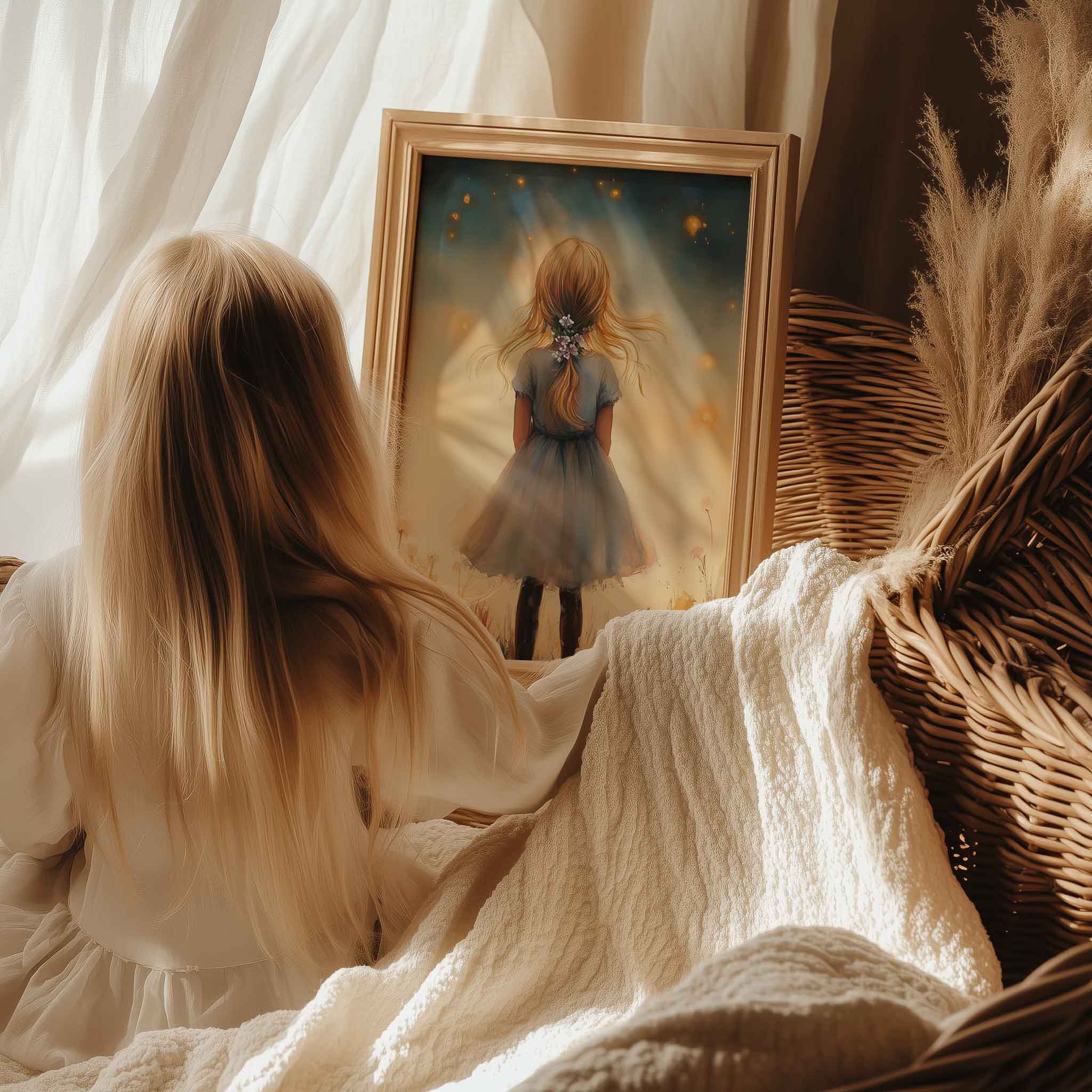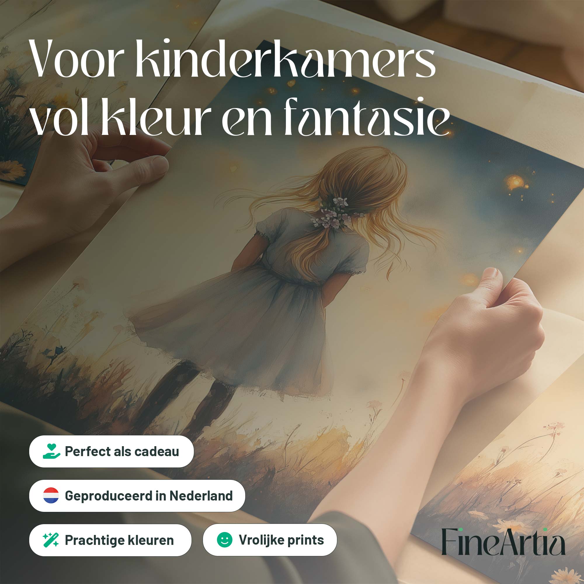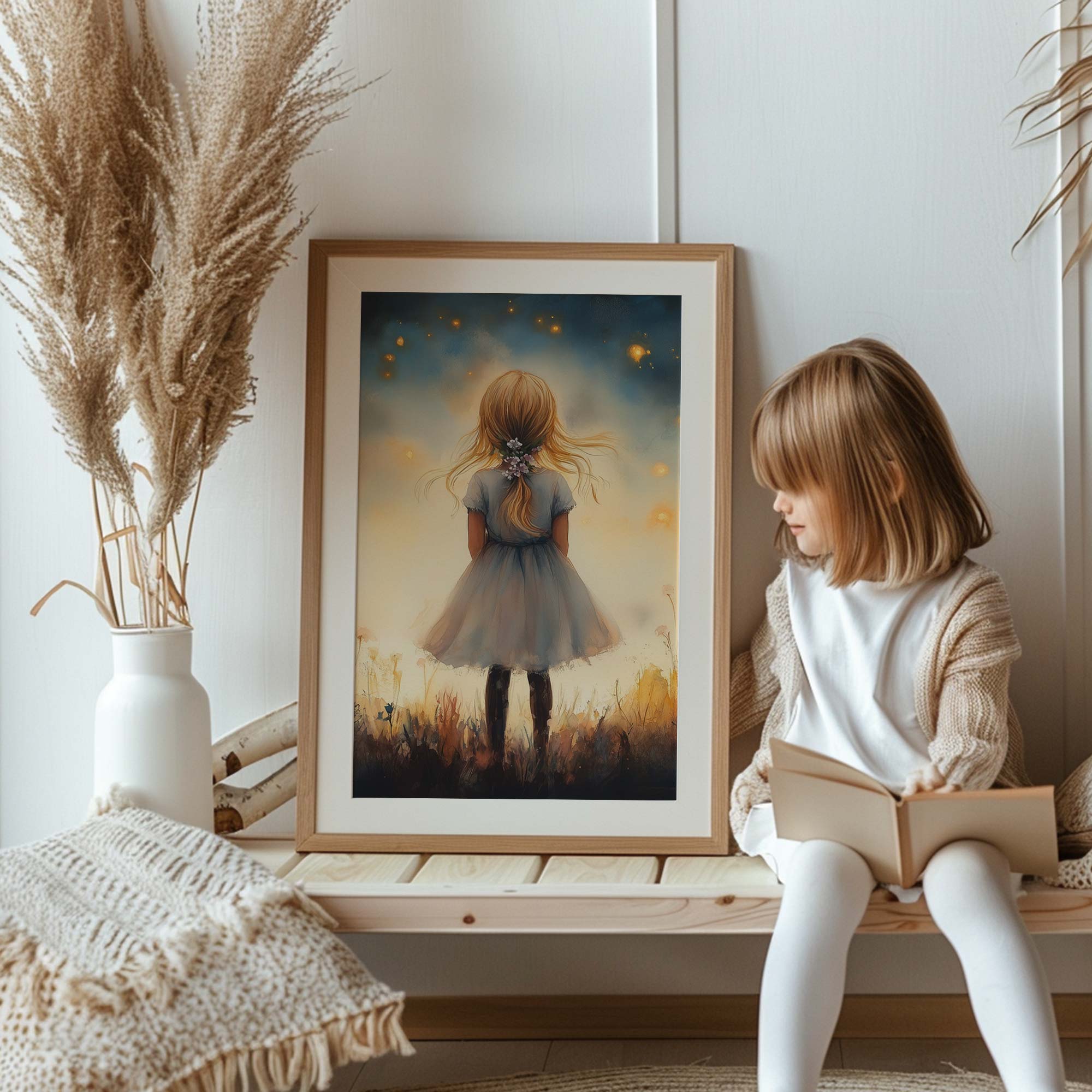Terug naar collectie Posters Dromerig Meisje tussen Bloemen en Sterrenhemel