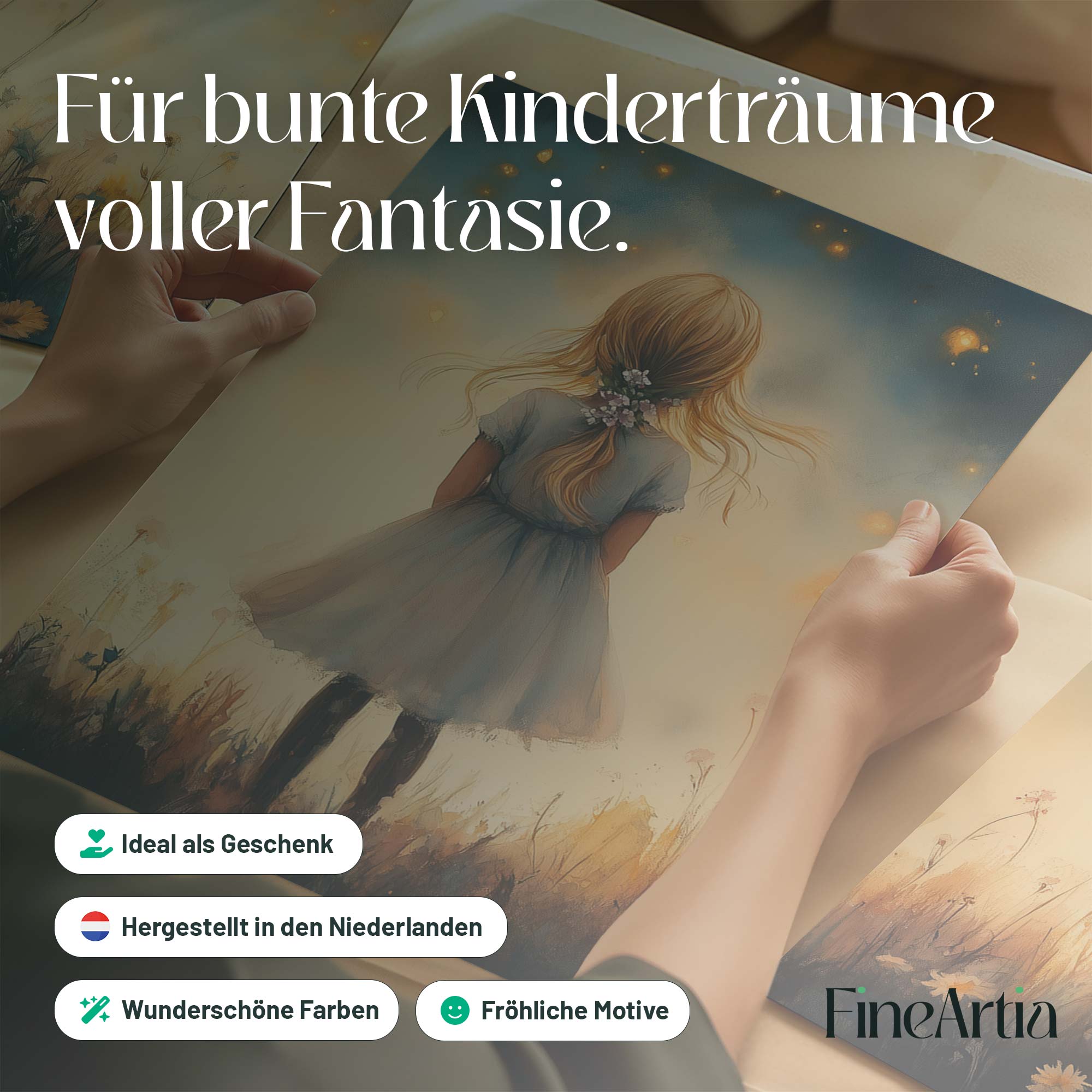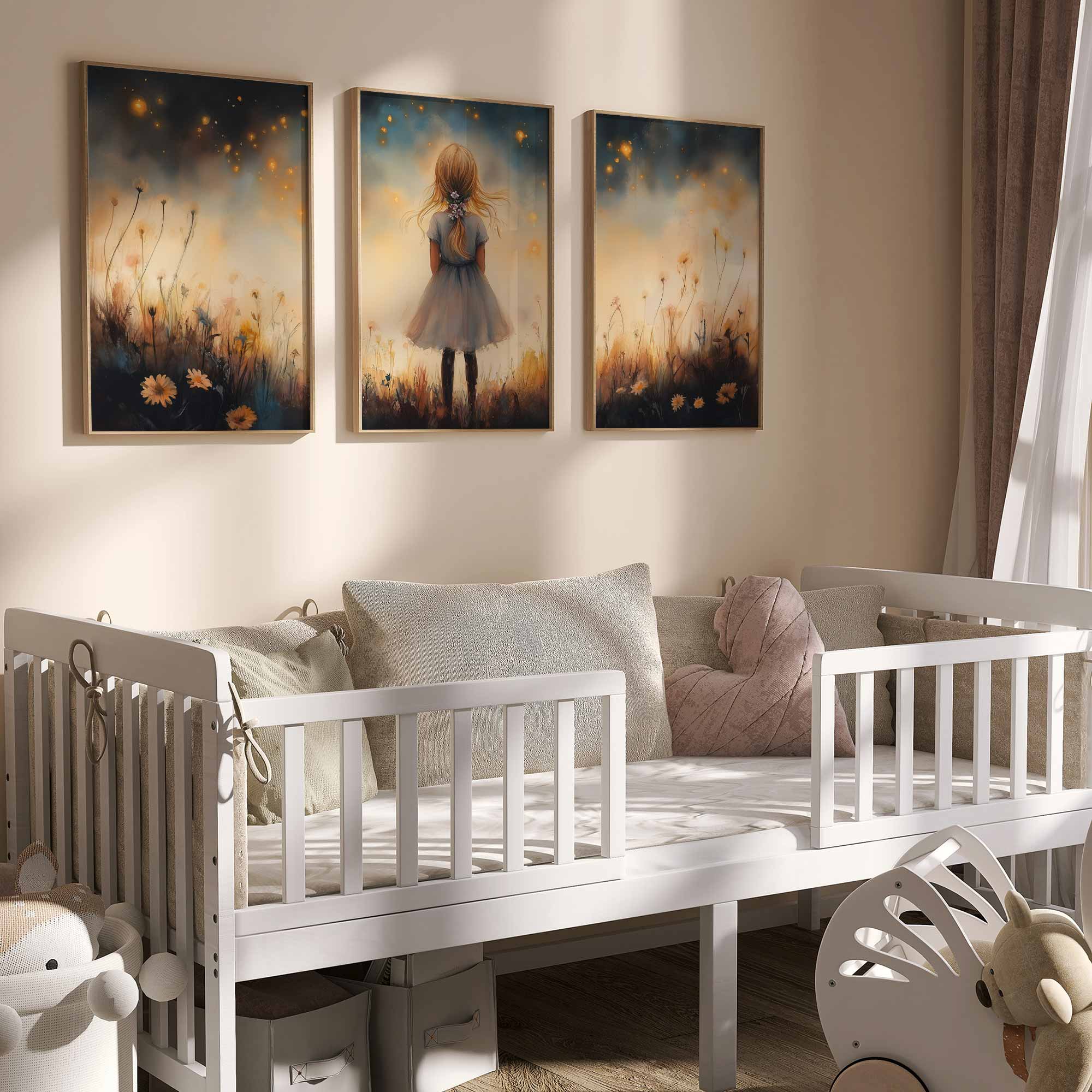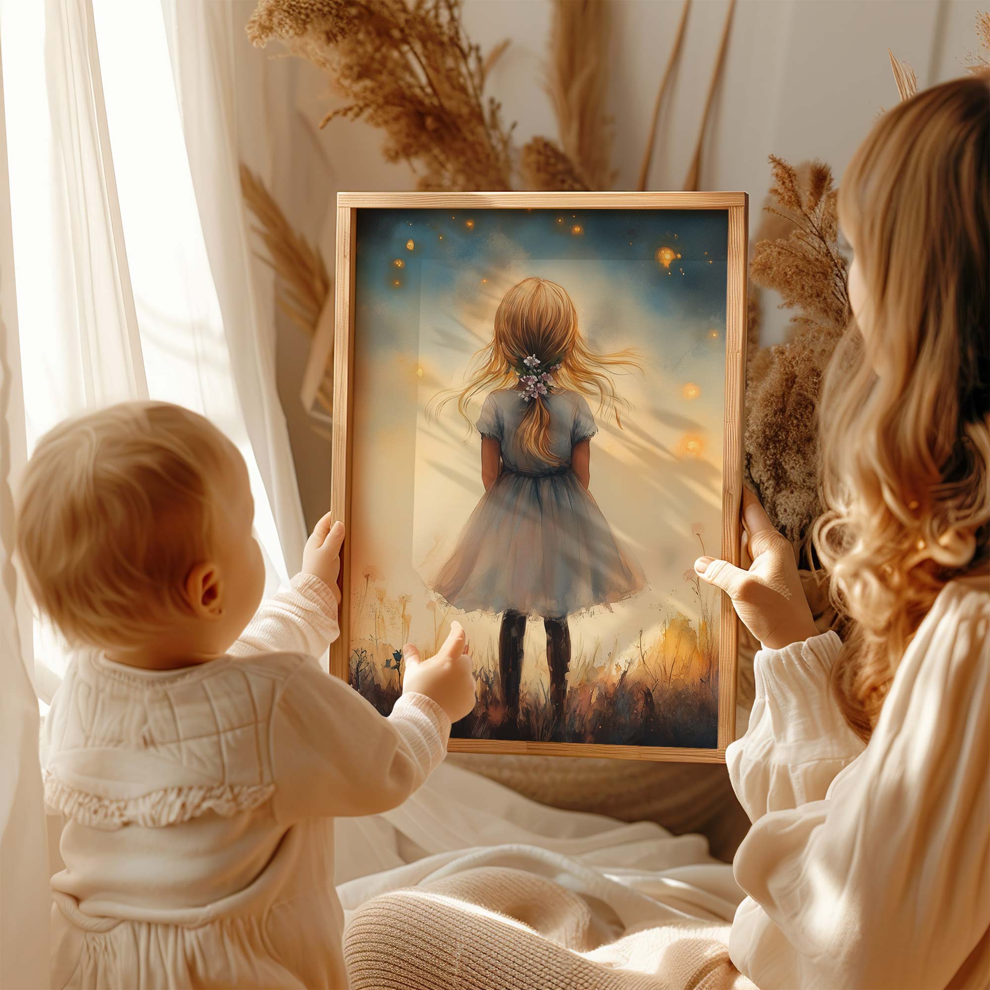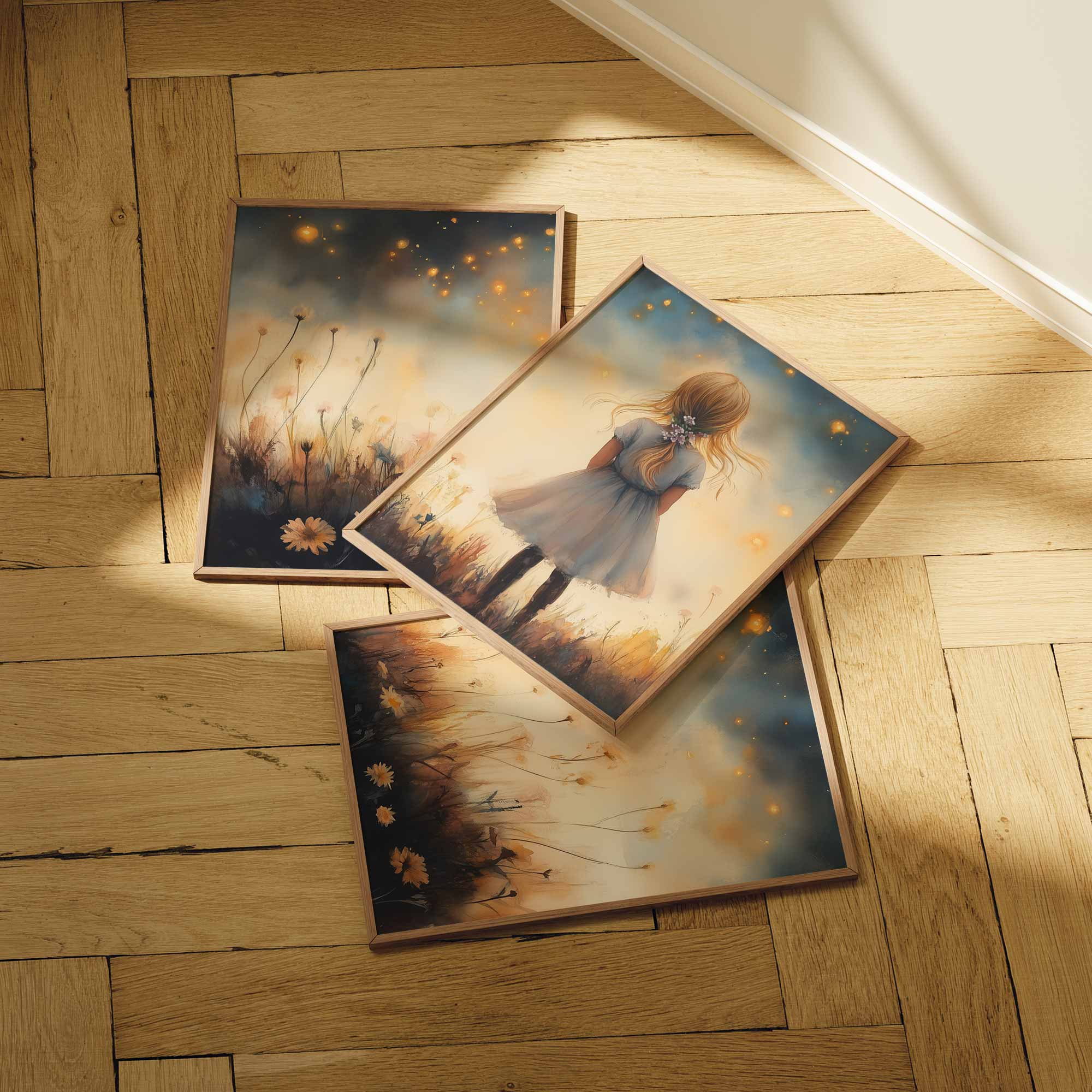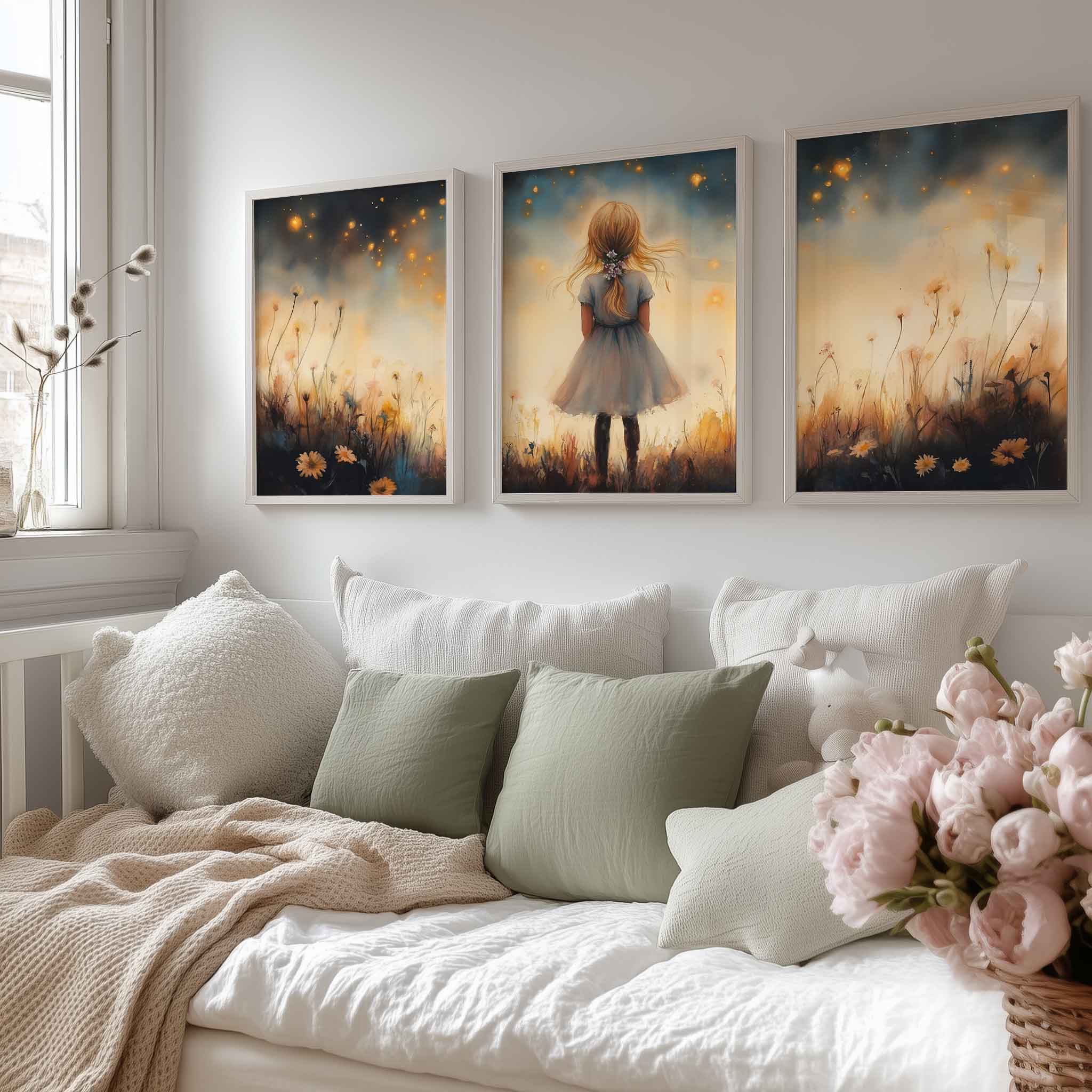 Terug naar collectie Posters Dromerig Meisje tussen Bloemen en Sterrenhemel